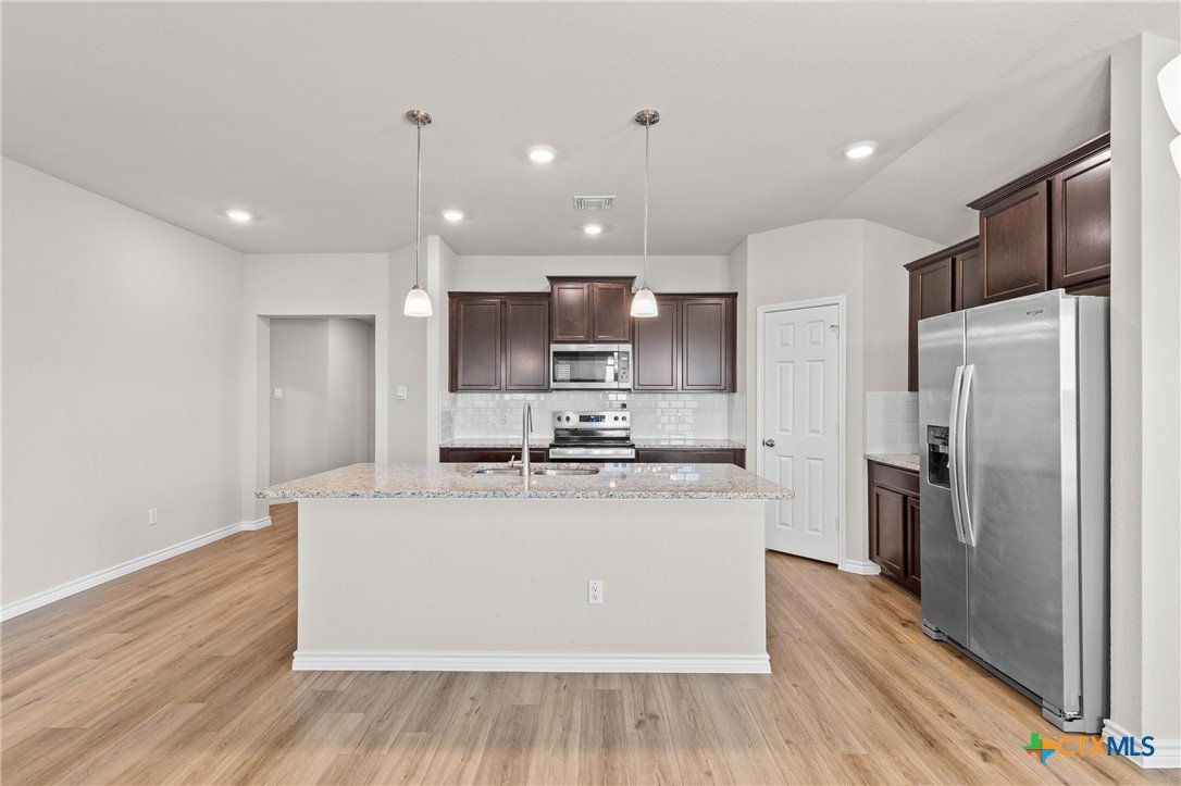 Why wait to build when you can own this DR Horton Dakota floor plan—completed in December 2024—with the coveted 3-car garage option, priced to sell at $305,000! Currently, this same plan is still being built by DR Horton ranging from $296K–$318K. Here, you get the upgraded 3-car garage and move-in ready convenience without the builder wait. This 4-bedroom, 2-bath home features an open concept layout with a granite island kitchen, stainless steel appliances, and rich cabinetry that flows seamlessly into the dining and living spaces. The split floor plan provides a private owner’s suite with dual vanity and walk-in closet. Out back, enjoy a covered patio and fully fenced yard—ready for entertaining or relaxing evenings. With its modern finishes, expanded garage, and prime location, this home delivers builder quality at a better value today!