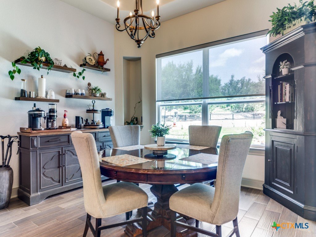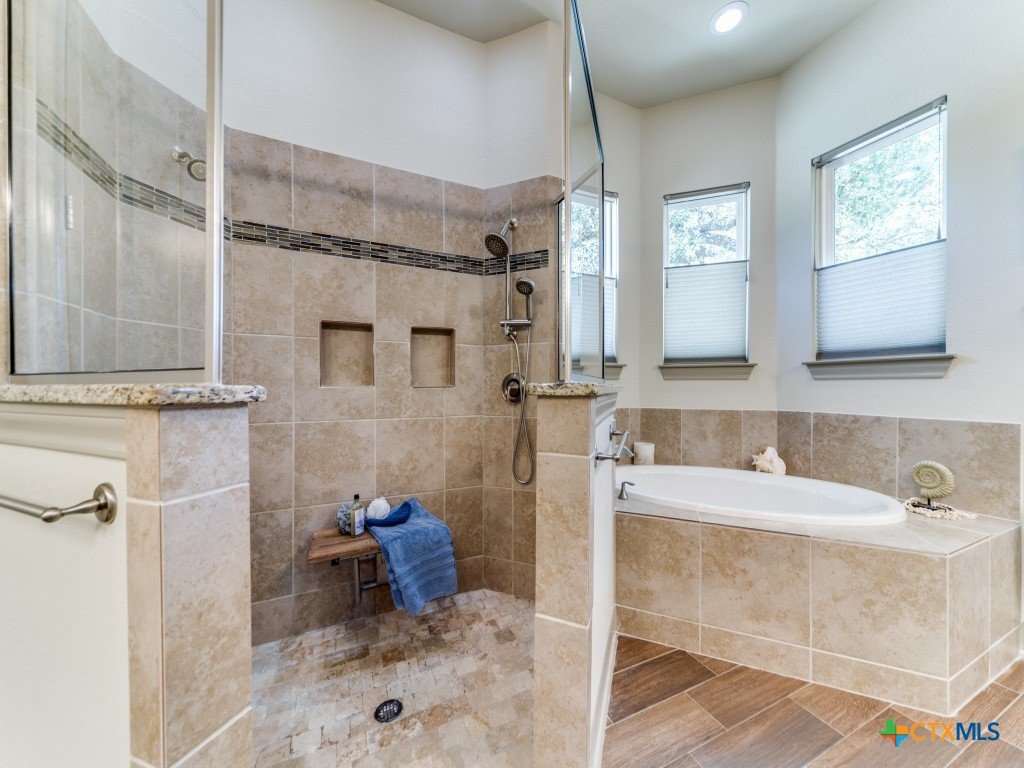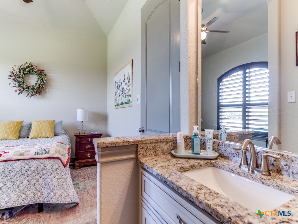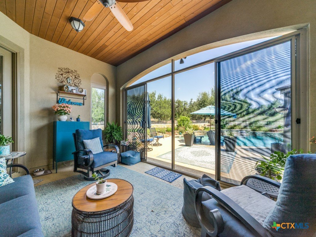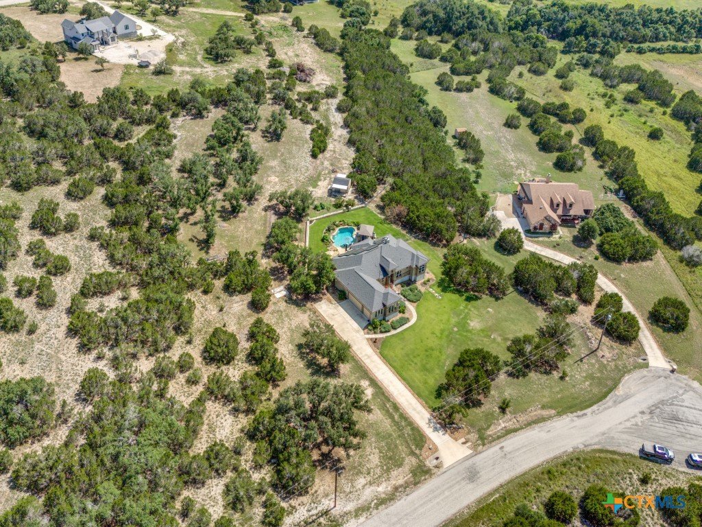 Welcome to your Hill Country retreat in the coveted Mystic Shores community. Nestled on 2.75 acres at the end of a quiet cul-de-sac, this updated 4-bedroom, 3-bath home blends privacy, views, and modern comfort. The open layout features a remodeled kitchen with custom cabinets, quartz counters, Samsung appliances (including induction cooktop), infantry blue island, pendant lighting, and a fridge that stays. The split floor plan highlights a spacious primary suite with a huge walk-in closet, dual vanities with pullouts, garden tub, dual-head shower, and new fixtures. Secondary bedrooms share a Jack & Jill bath, while the fourth doubles as a craft room with nearby full guest bath. A separate media/family room with surround sound opens to the patio. Outside, enjoy a saltwater pool (recently replaced pool equipment) with waterfalls, screened porch, pergola, stone/iron fencing, and manicured landscaping with lighting, raised beds, granite paths, and a custom garden shed. Additional perks: no carpet, 3-car garage with epoxy floors, UV air purification, water softener, solar panels with Tesla battery, 2 HVAC zones, new water heater (2024), and security system. Mystic Shores offers river access, pools, trails, sports courts, playground, RV/boat storage, and more-all within an hour of Austin or San Antonio. Experience the space, upgrades, and serenity of this Hill Country gem.