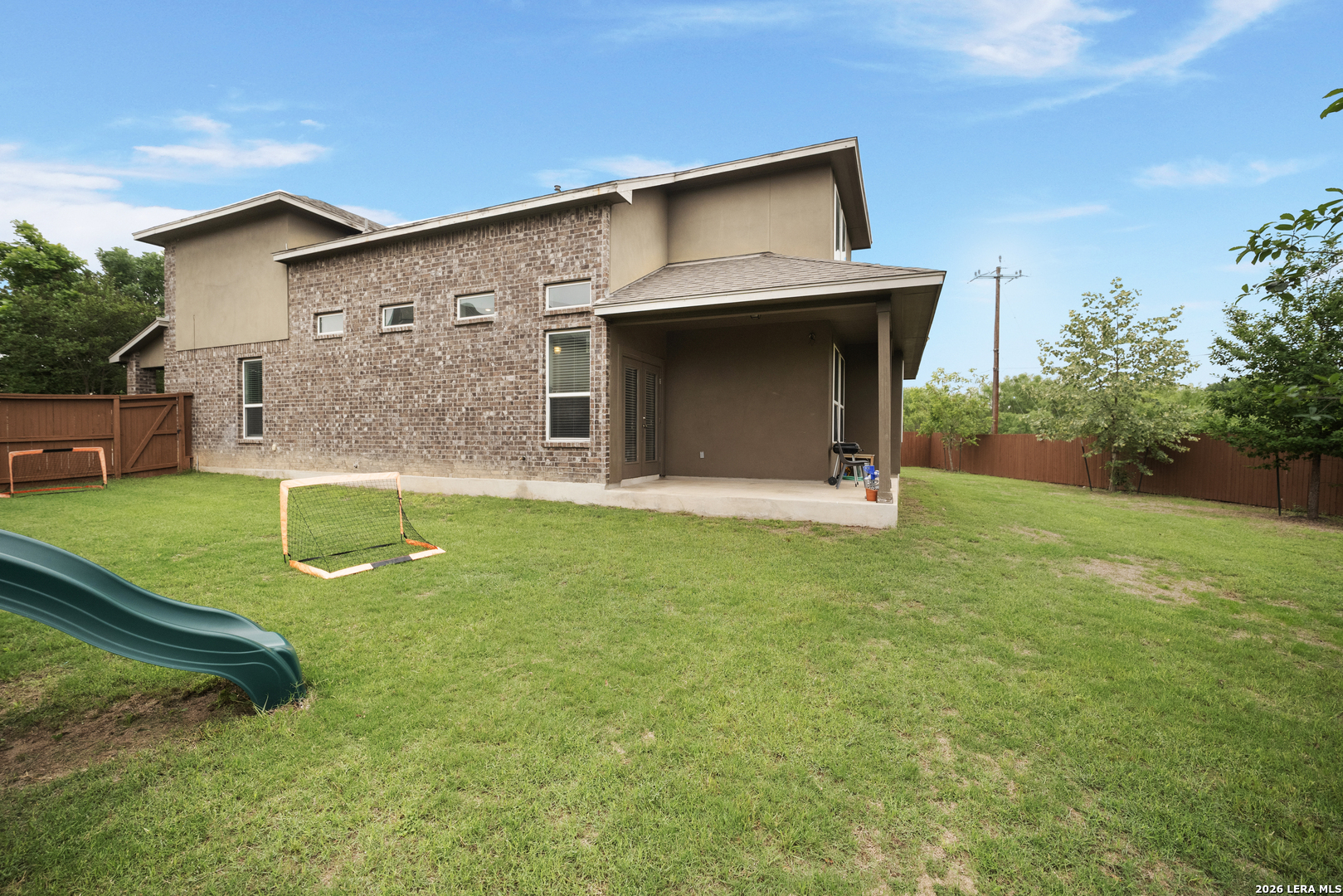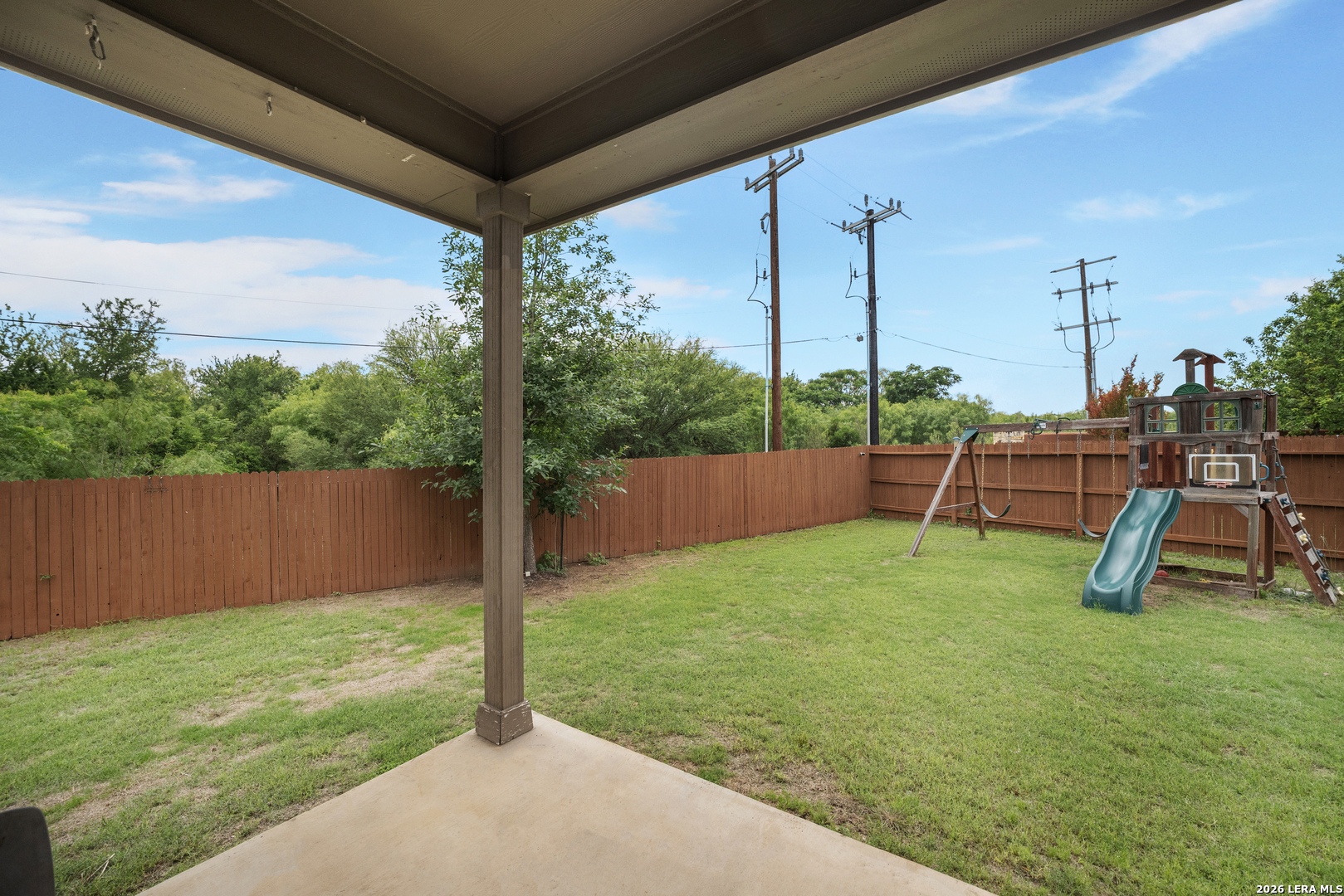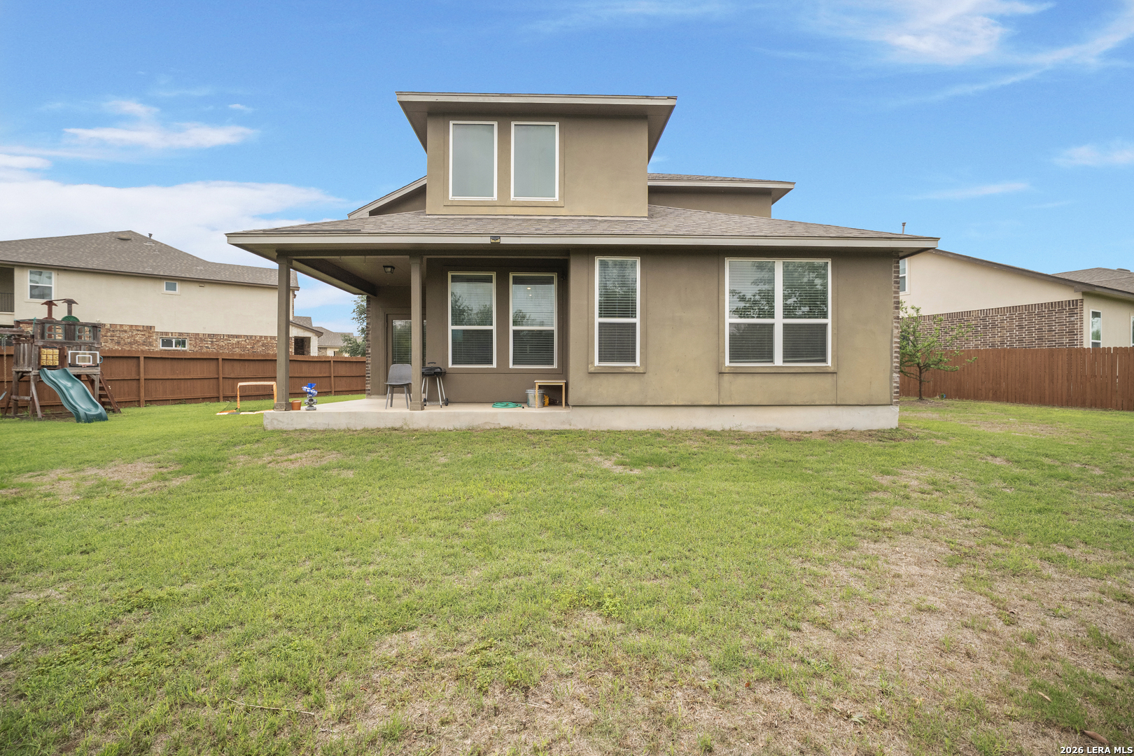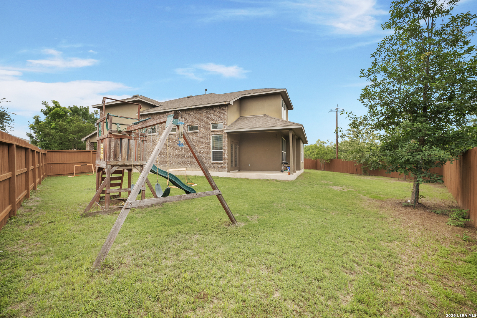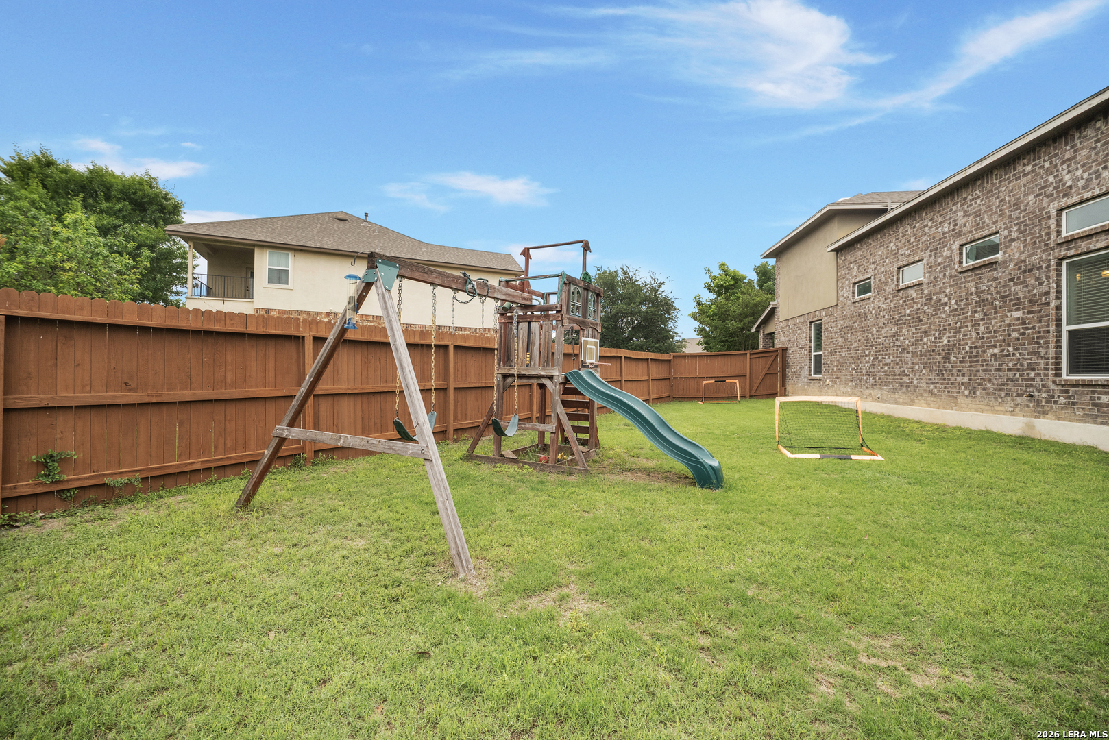 Welcome home to this pristine 4 bedroom, 2.5 bath home situated on an oversized lot backing to a GREENBELT for added privacy. This exceptionally maintained open-concept floor plan offers light-filled living spaces with abundant windows throughout. The chef's kitchen features stainless steel appliances, gas cooking, granite countertops, a walk-in pantry, and a large island ideal for cooking and entertaining. The spacious primary suite is conveniently located on the main level and includes an ensuite bath with dual vanities, walk-in shower, and separate garden tub. Upstairs offers an oversized game room/loft plus 3 additional bedrooms with ceiling fans and generous closet space. Step outside to your private backyard oasis complete with a covered patio and playset. Conveniently located within walking distance to the elementary school. This one is a must see!