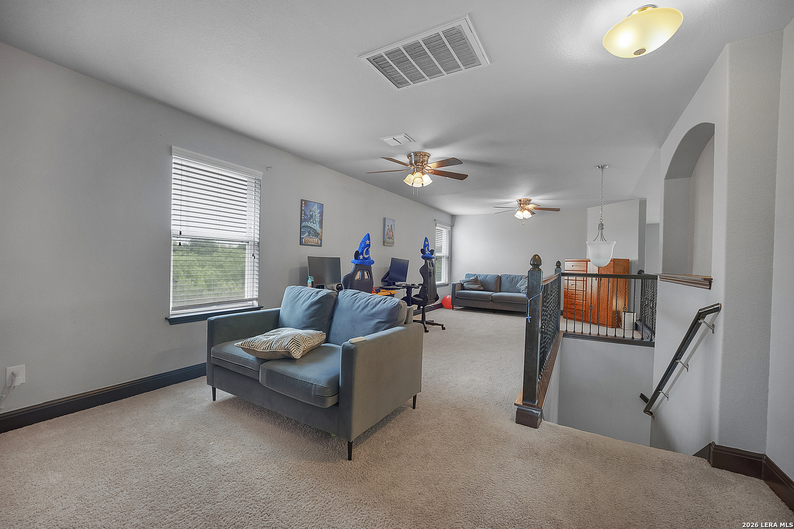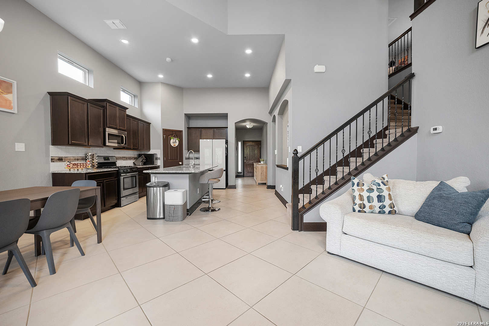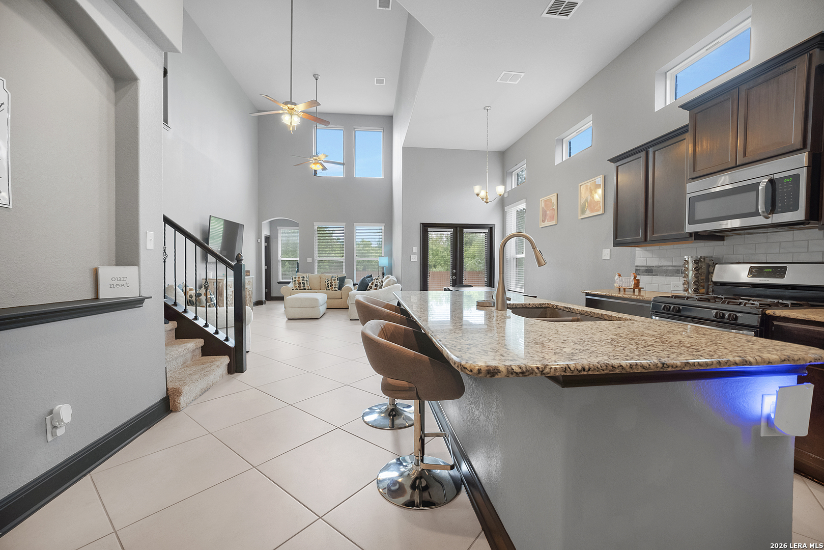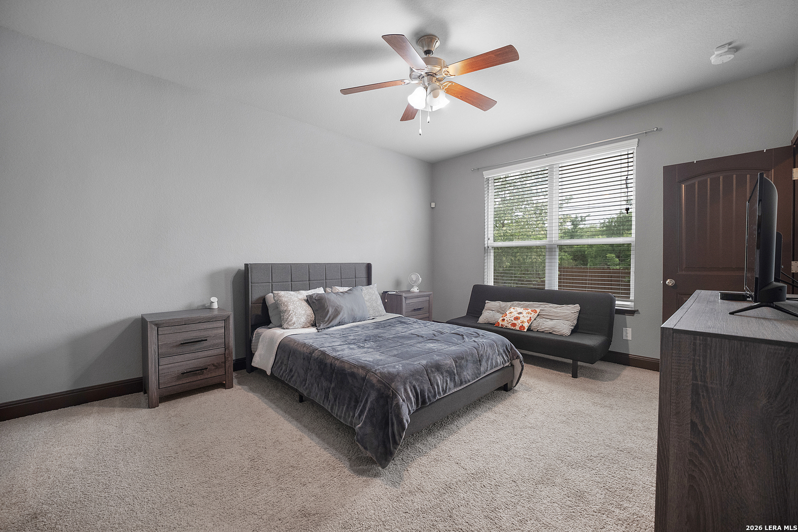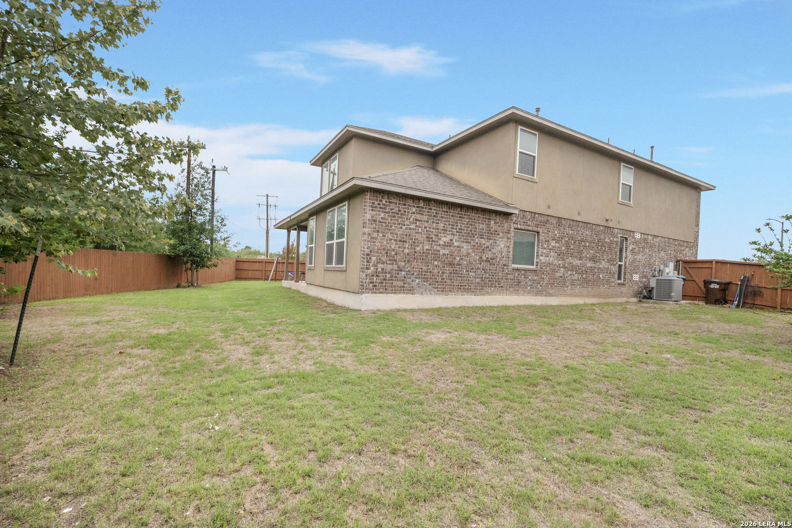 Welcome home to this pristine 4 bedroom, 2.5 bath home situated on an oversized lot backing to a GREENBELT for added privacy. This exceptionally maintained open-concept floor plan offers light-filled living spaces with abundant windows throughout. The chef's kitchen features stainless steel appliances, gas cooking, granite countertops, a walk-in pantry, and a large island ideal for cooking and entertaining. The spacious primary suite is conveniently located on the main level and includes an ensuite bath with dual vanities, walk-in shower, and separate garden tub. Upstairs offers an oversized game room/loft plus 3 additional bedrooms with ceiling fans and generous closet space. Step outside to your private backyard oasis complete with a covered patio and playset. Conveniently located within walking distance to the elementary school. This one is a must see!