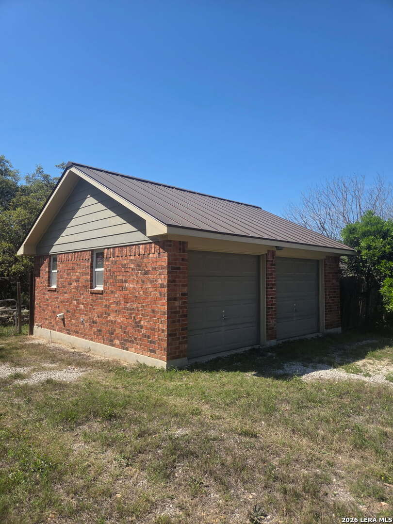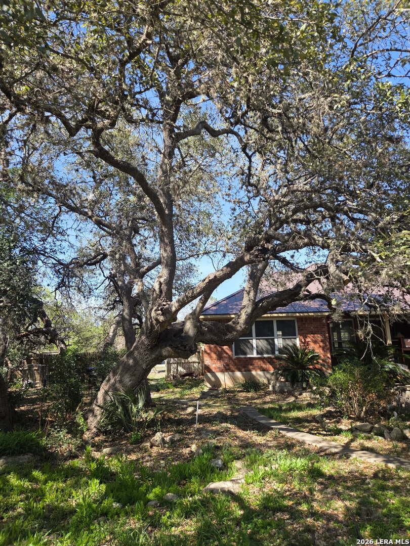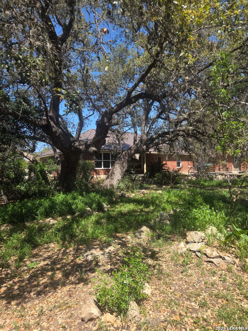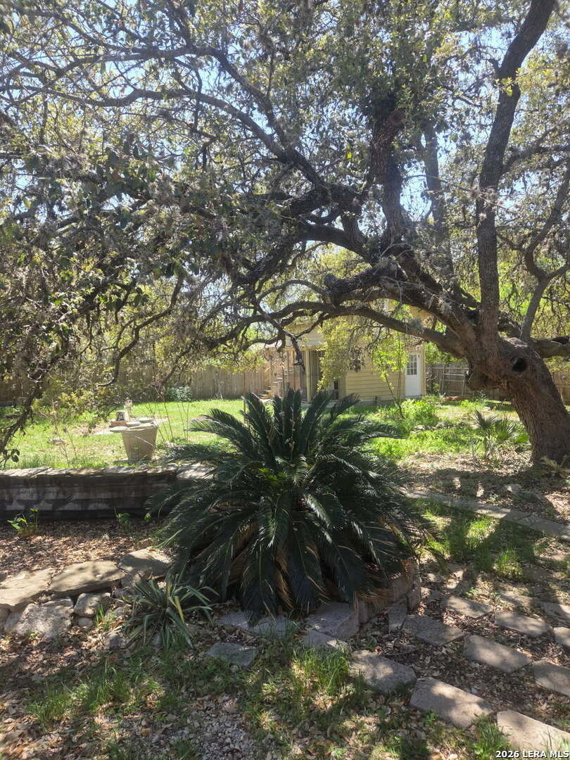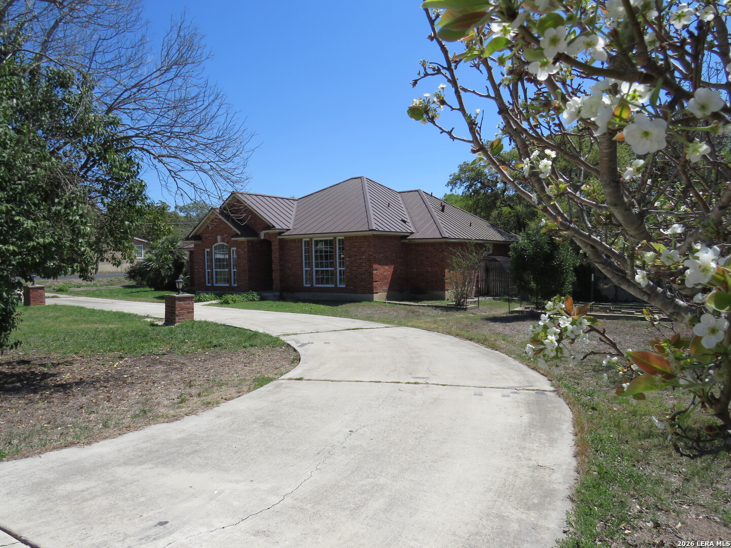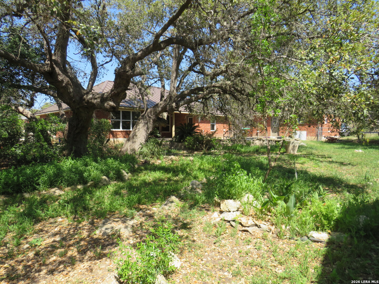 This charming and stylish single-story home is truly your own slice of paradise! This beautiful home offers an all-brick exterior with a metal roof. You'll love the open floor plan featuring high ceilings and large, light-filled windows. The spacious family room flows easily into the bright, eat-in kitchen with granite countertops, and center island, (refrigerator is negotiable). The adjoining dining room is roomy and already plumbed for a wet bar-perfect for entertaining. The primary suite offers peaceful backyard views, high ceilings, and a spa-like ensuite bath with an oversized walk-in shower, double vanity, and generous walk-in closet. The secondary bedroom also boasts an oversized walk-in closet. The large laundry room includes a utility sink and storage area (washer and dryer are negotiable). Step outside to an oversized covered patio ideal for outdoor gatherings and relaxation. This stunning .51-acre property is adorned with ancient live oaks, pear trees, and mountain laurels-and even includes a pond just waiting to be restored to its full potential. The detached two-car garage is plumbed for both a bathroom and a water heater, offering endless possibilities for conversion or expansion. Plus, the impressive two-story outbuilding with electricity features a three-run chicken coop on the lower level and an unfinished storage space above. Conveniently located near shopping, dining, and entertainment, this beautiful property is filled with potential-and is truly a must-see!