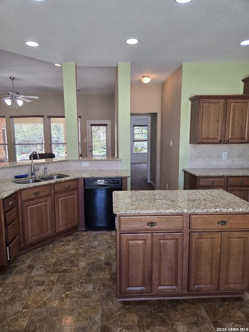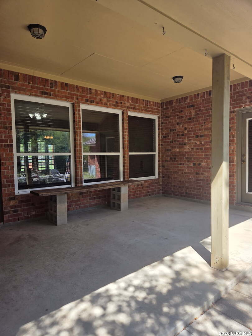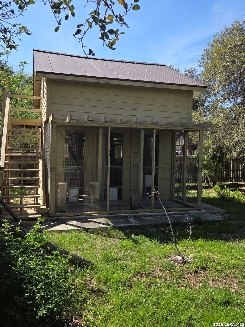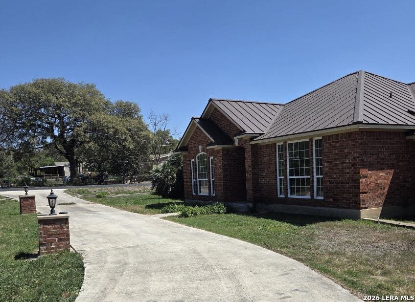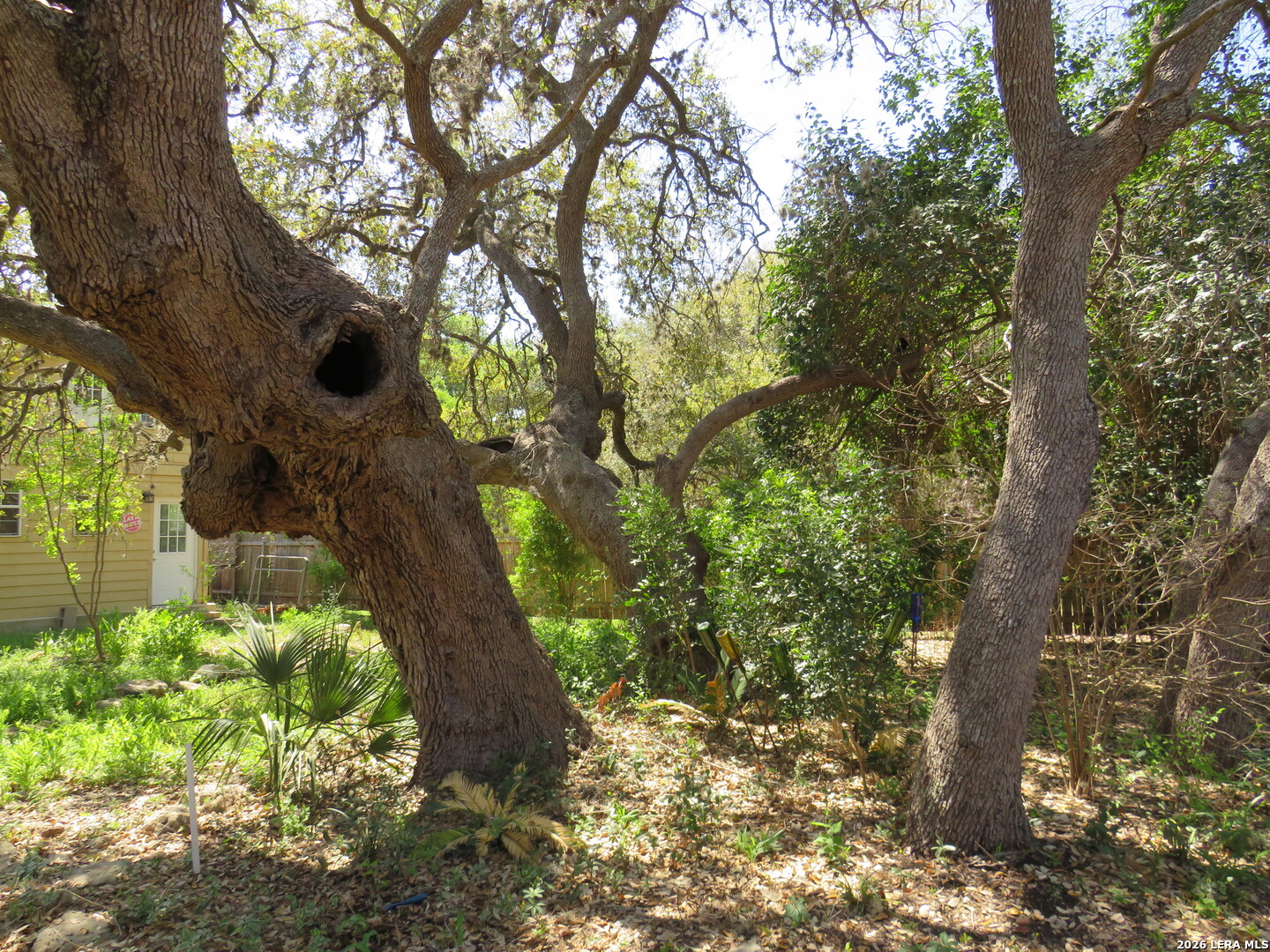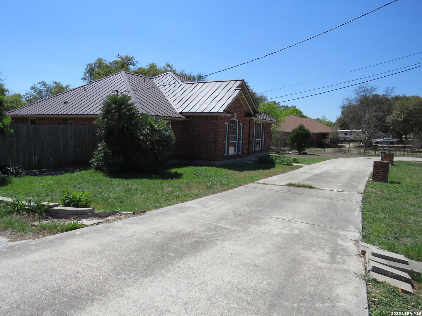 This charming and stylish single-story home is truly your own slice of paradise! This beautiful home offers an all-brick exterior with a metal roof. You'll love the open floor plan featuring high ceilings and large, light-filled windows. The spacious family room flows easily into the bright, eat-in kitchen with granite countertops, and center island, (refrigerator is negotiable). The adjoining dining room is roomy and already plumbed for a wet bar-perfect for entertaining. The primary suite offers peaceful backyard views, high ceilings, and a spa-like ensuite bath with an oversized walk-in shower, double vanity, and generous walk-in closet. The secondary bedroom also boasts an oversized walk-in closet. The large laundry room includes a utility sink and storage area (washer and dryer are negotiable). Step outside to an oversized covered patio ideal for outdoor gatherings and relaxation. This stunning .51-acre property is adorned with ancient live oaks, pear trees, and mountain laurels-and even includes a pond just waiting to be restored to its full potential. The detached two-car garage is plumbed for both a bathroom and a water heater, offering endless possibilities for conversion or expansion. Plus, the impressive two-story outbuilding with electricity features a three-run chicken coop on the lower level and an unfinished storage space above. Conveniently located near shopping, dining, and entertainment, this beautiful property is filled with potential-and is truly a must-see!