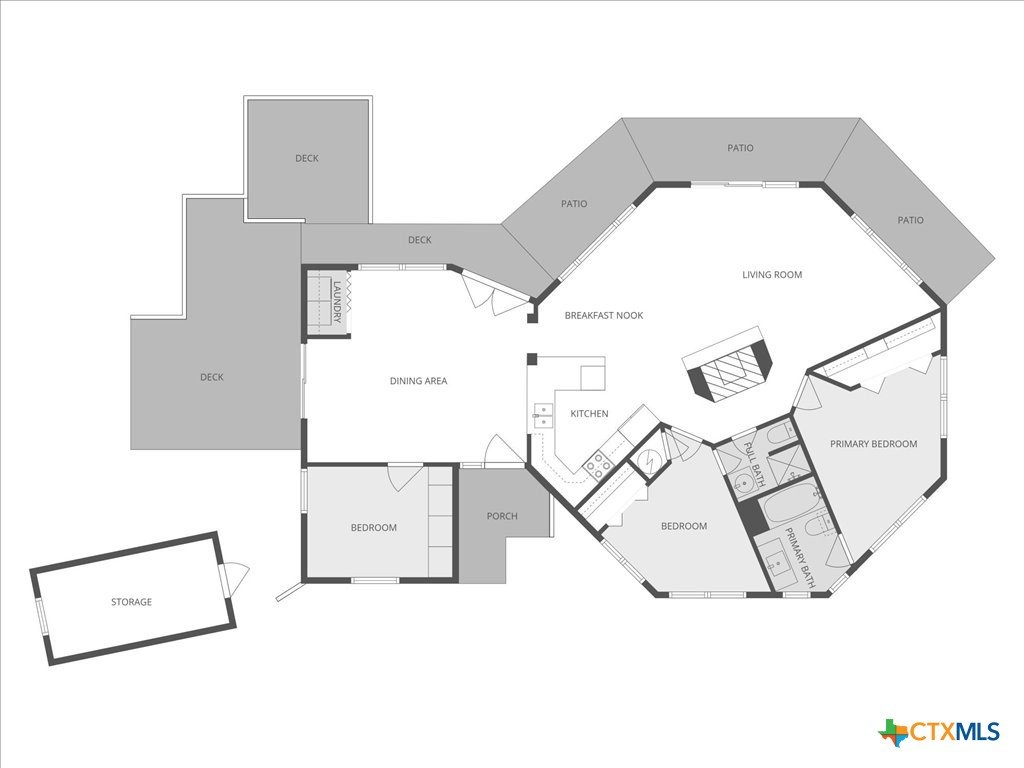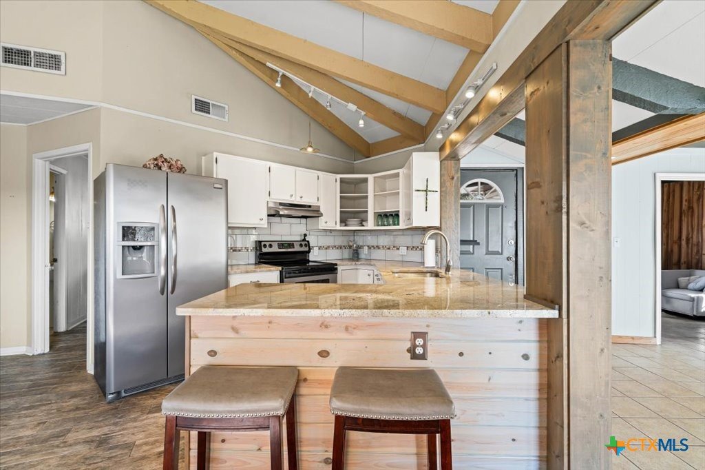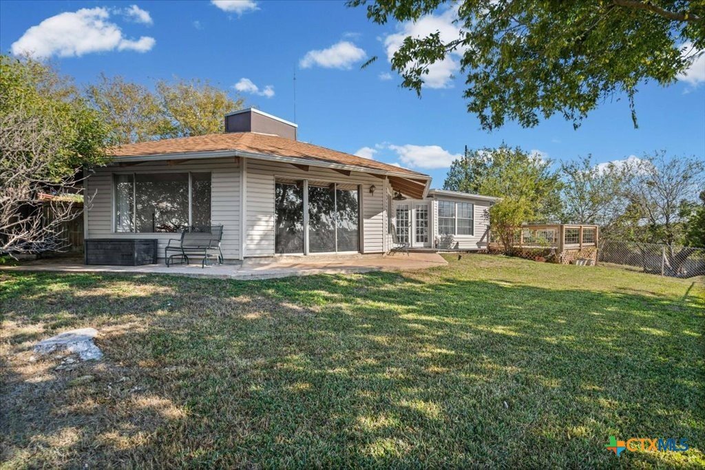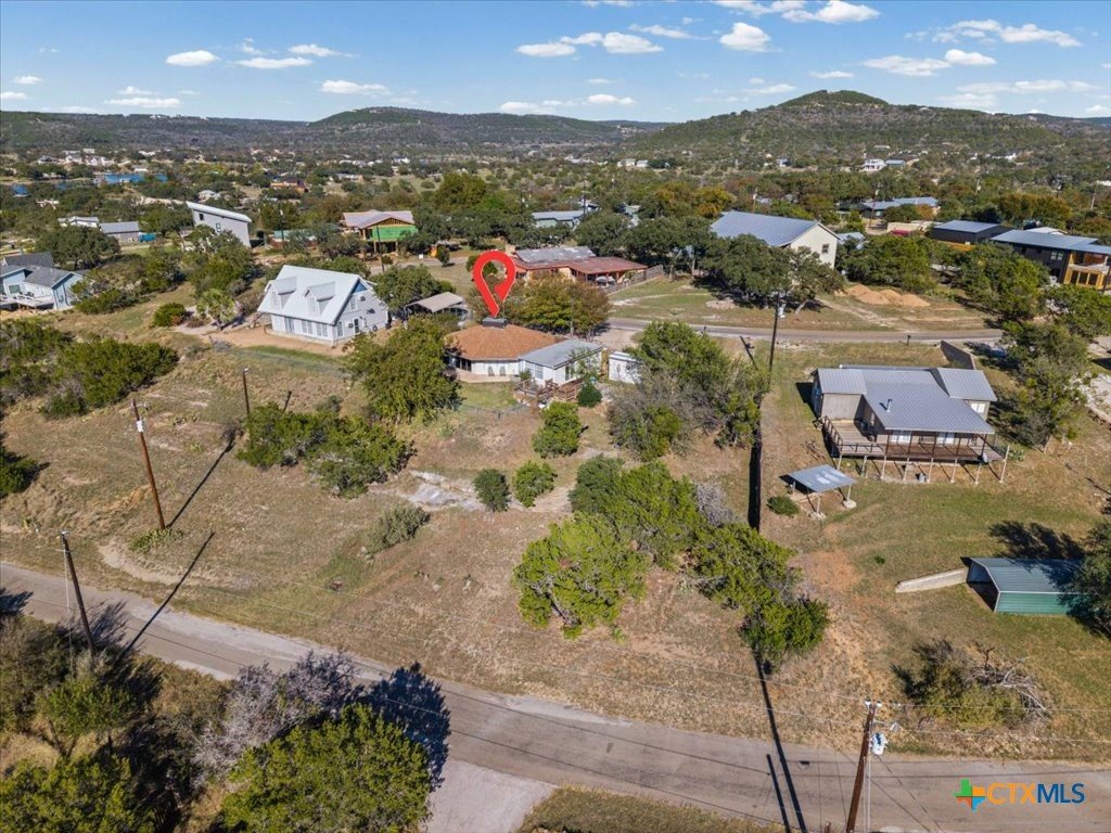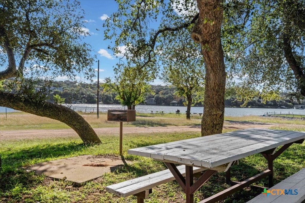 This stunning single-story home in Burnet, Texas, sits on over half an acre of serene land with breathtaking views of Lake Buchanan. The property is accentuated by several trees and features full gutters, setting the tone for a peaceful retreat. Inside, the open and airy layout boasts tile flooring, abundant natural light, and high beamed ceilings, creating a sense of spaciousness and tranquility. The living room is a cozy haven, featuring a ceiling fan, a sliding glass door leading to the outdoors, and a beautiful floor-to-ceiling stone fireplace. The bright kitchen is equipped with track lighting, a breakfast bar, granite countertops, and stainless steel appliances, making it perfect for culinary delights. A sunny dining area is nearby, with great natural light, a ceiling fan, and multiple doors leading to the outdoor space. The primary bedroom is a serene escape, with a high ceiling, ceiling fan, closet space, and an en-suite bathroom featuring a framed mirror and a deep soaking tub/shower combo. The secondary bedrooms offer comfortable quarters, with high ceilings, ceiling fans, and closet space. The backyard is a true oasis, with a wrap-around patio, a deck offering peaceful hill country views, a concrete pond, and a unique stone waterfall feature. A convenient outdoor shed adds to the functionality of the fenced backyard and provides space for all of your outdoor tools and toys. But that's not all - this property also offers lake access and a boat launch, included with the $100 annual HOA fee, which also covers access to play and picnic areas. And with lots that stretch from Cty Rd 130 to the lower loop of 130, you can enjoy unparalleled privacy with no neighbors at the back of the property. With its proximity to Lake Buchanan and all its amenities, this home offers the perfect blend of relaxation and recreation.