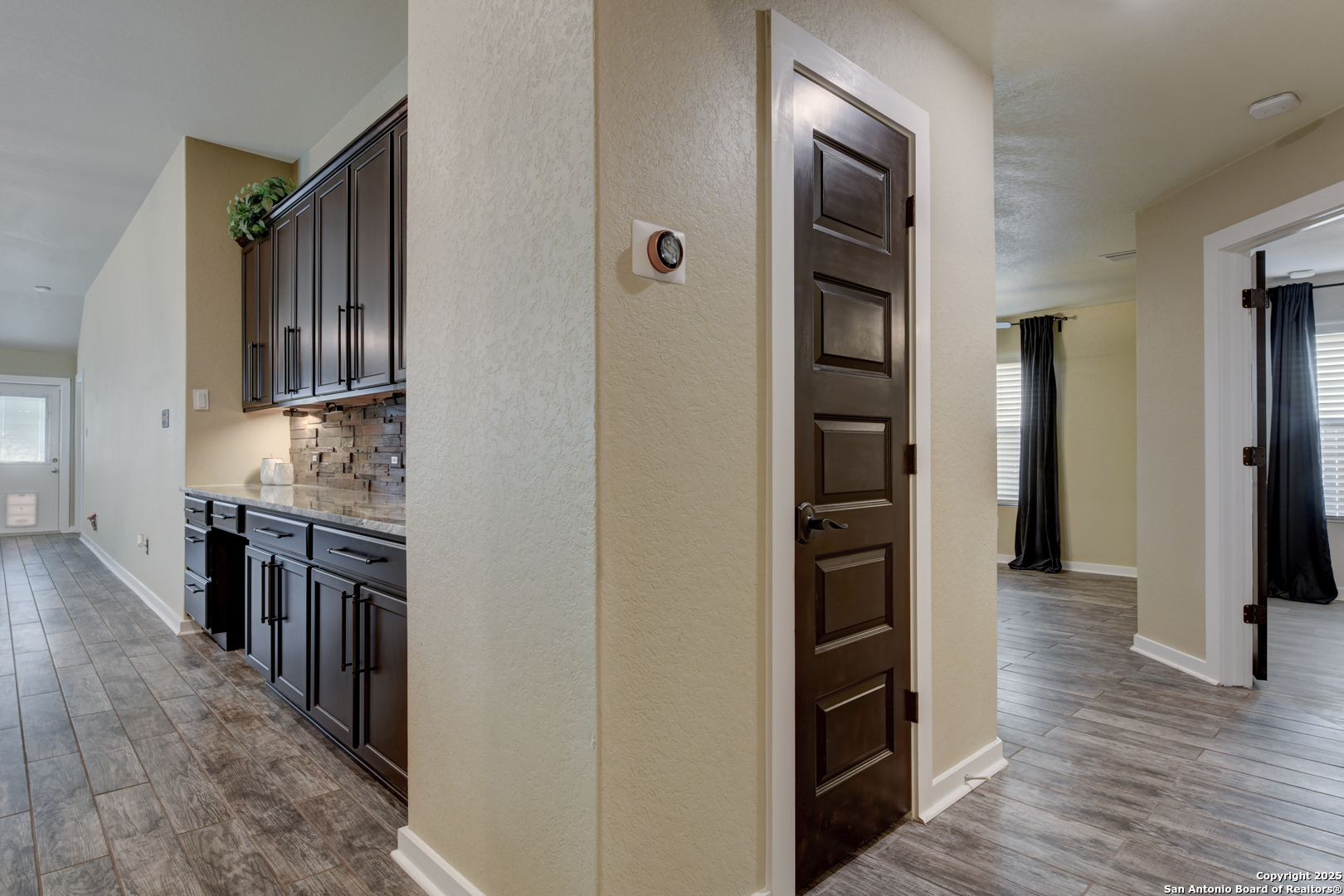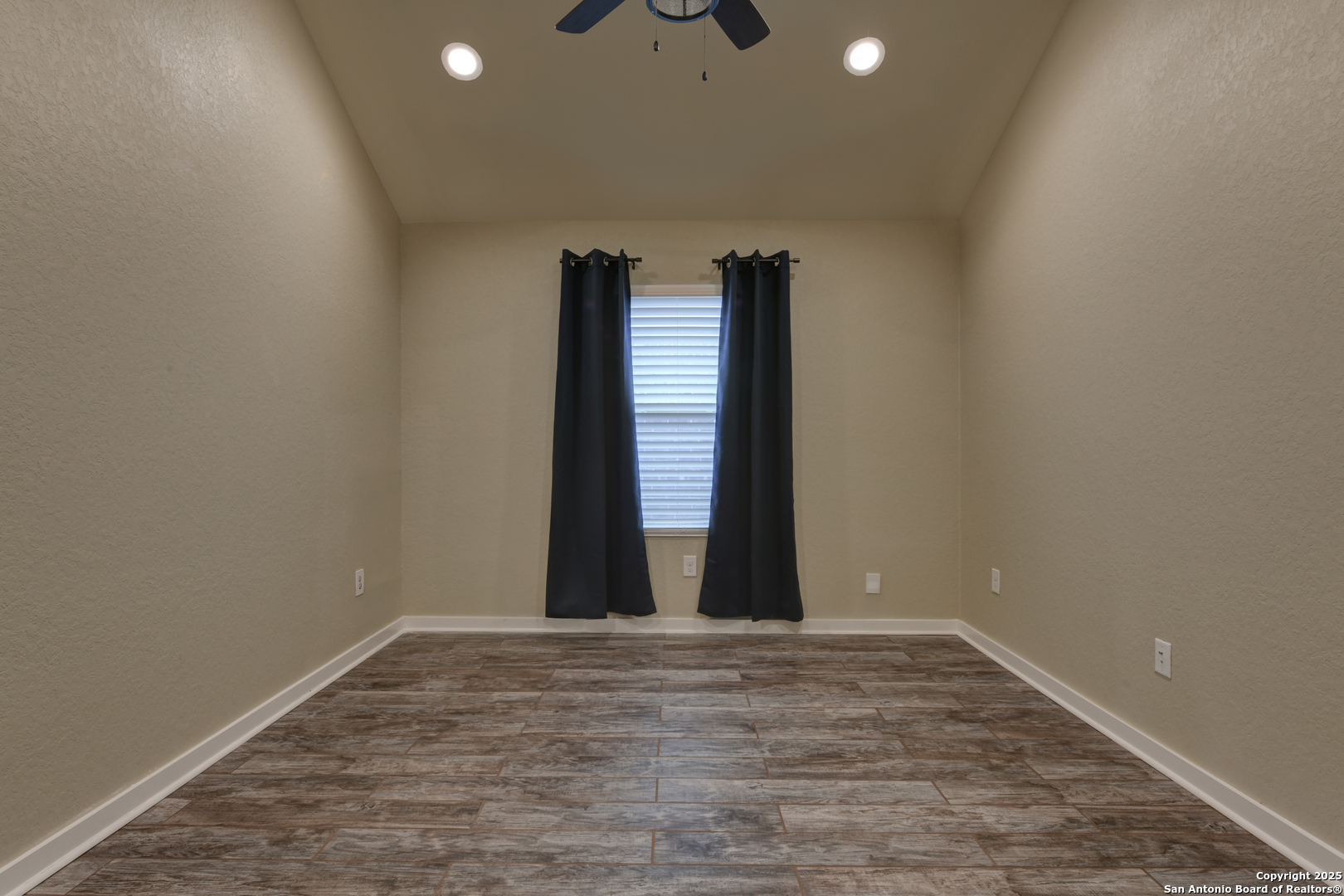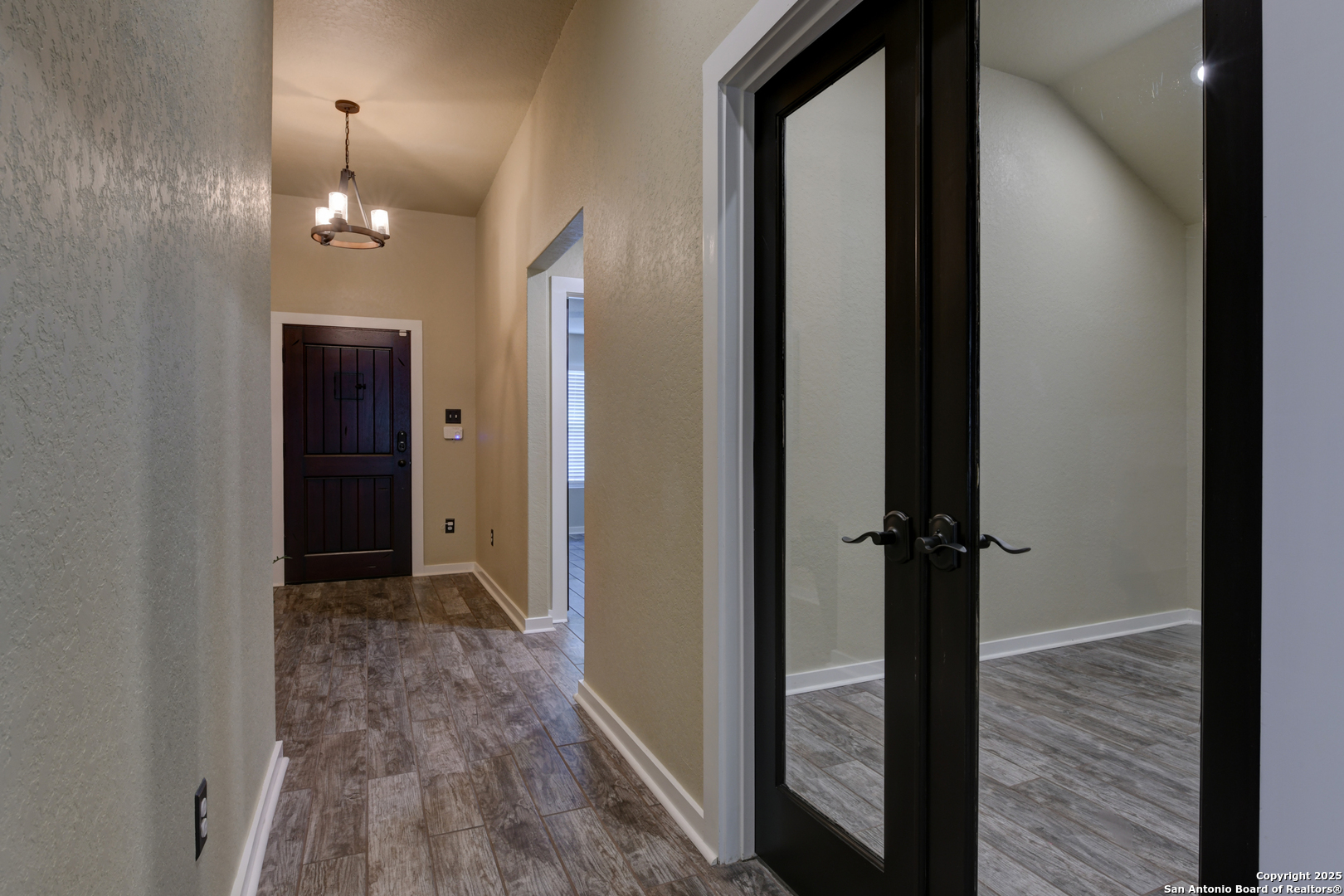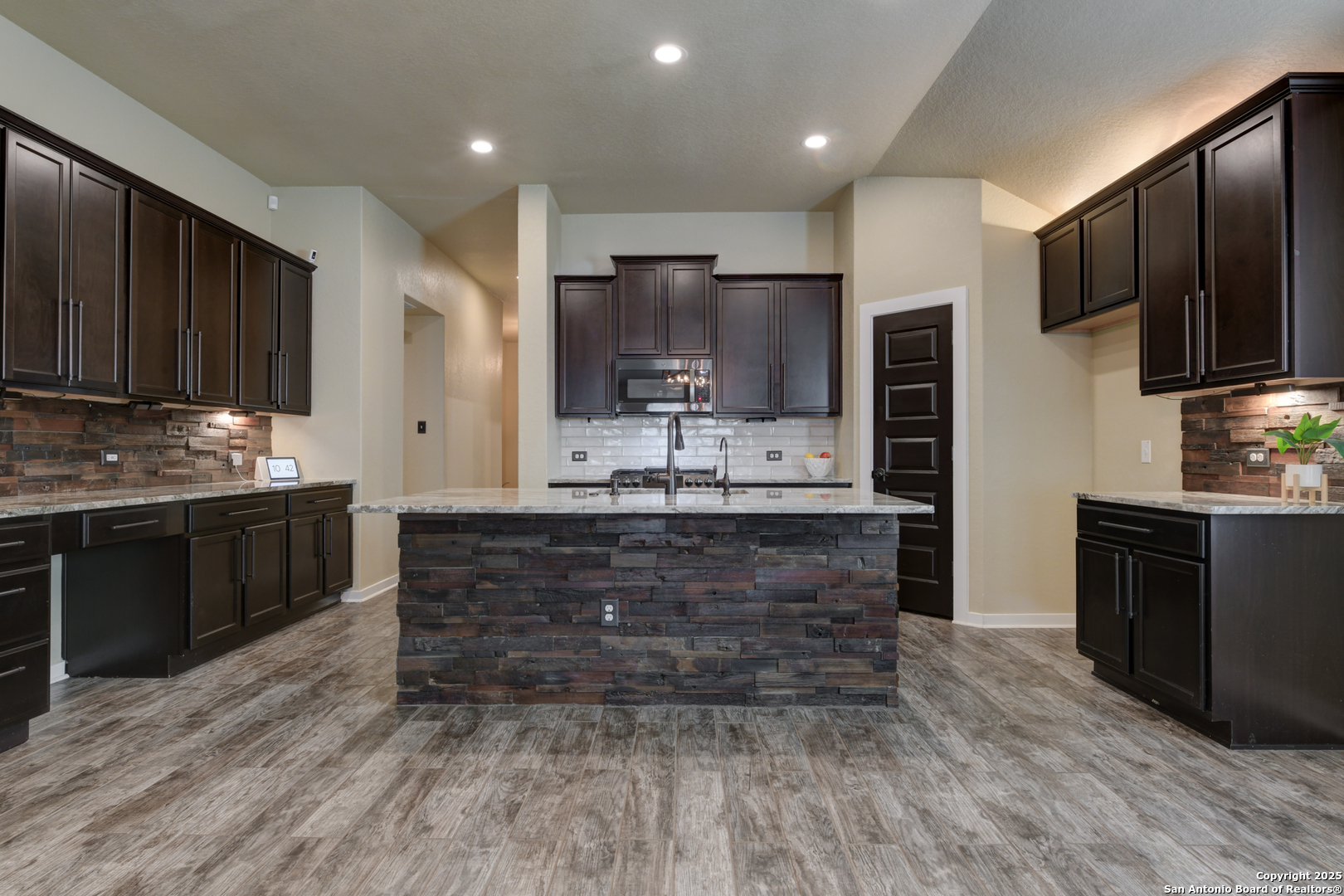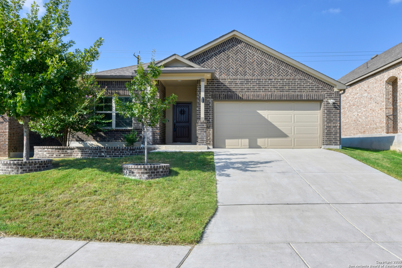 As you drive into the neighborhood, this cozy one-story property feels right at home. The yard is nicely kept, with mature trees adding a touch of nature, and the covered front entry invites you to step inside and unwind. When you open the stylish wooden front door, you're welcomed by a spacious entry hall. The warm neutral colors and wood-look tile underfoot create a relaxed vibe. Just off the entry, glass double doors lead to a private office. Morning light streams through a big window, making it a great spot to work from home. High ceilings and recessed lighting keep the space feeling open and airy. As you move further in, you'll find the heart of the home - the island kitchen. The dark cabinets stand out against the shiny granite countertops and stacked stone accents, with a full backsplash tying it all together. There's plenty of counter space for cooking, and under-cabinet lighting adds a warm glow in the evenings. The island has bar seating, extra storage, and even a built-in desk for managing household tasks or helping with homework. The pantry has been smartly remodeled for easy organization. From the kitchen, you step into a large living and dining area. The vaulted ceiling adds to the airy feel, with sunlight streaming through the windows and a glass door leading to the backyard. The wood-look tile flooring continues throughout, connecting the space as you imagine hosting friends for dinner or kids playing board games. At the back of the house, the primary suite feels like a private getaway. The wood-look tile continues underfoot, and a bold feature wall adds personality. Three windows let in soft natural light, and sliding barn doors add rustic charm as they open to the spa-like bath and large walk-in closet. The en-suite bath features marble-look tile on the floors and shower surround, with sliding glass doors leading to a spacious walk-in shower. The double vanity has sleek counters and a framed mirror that reflects the room's gentle light. Built-in cabinetry keeps essentials organized, and the walk-in closet offers plenty of shelving and hanging space. Down the hall, there's a spacious second living area that can be anything you need - a game room, media space, or playroom. The easy-care tile flooring is both practical and stylish. This area connects to a full secondary bathroom with designer touches like a black stone vessel sink, hex tile floors, and a modern tub/shower with marble-look tile and matte black fixtures. Three more bedrooms line the hall, ready for family, guests, or another home office. Sleek wood-look flooring, neutral walls, and stylish light fixtures make them move-in ready. Nearby, the laundry room is both functional and stylish, with upper cabinets for storage and a bold herringbone tile backsplash. Throughout the home, thoughtful upgrades make daily life easier - a whole-house surge protector, wire drops for TVs, a water softener, a tankless water heater, extra attic storage, a remodeled pantry, soffit lighting, and epoxy flooring in the garage. Step through the back door, and the comfort continues. The private backyard is enclosed by a wooden fence and bordered by a stone retaining wall for privacy. There's a storage shed along the fence and plenty of lawn space for kids, pets, or barbecues. All of this is just minutes from shopping and highways, making your commute easy and your weekends full of possibilities. This is more than a house - it's a place to truly live, relax, and call your own. Please be aware that some photos have been virtually staged.