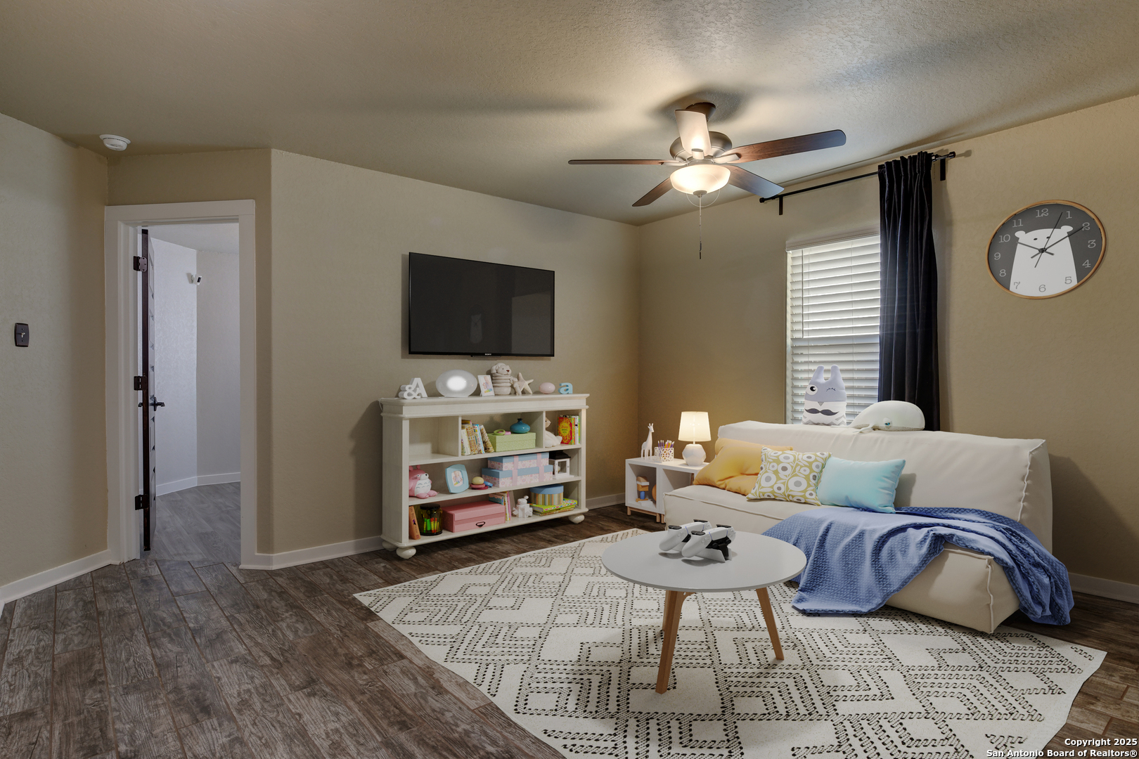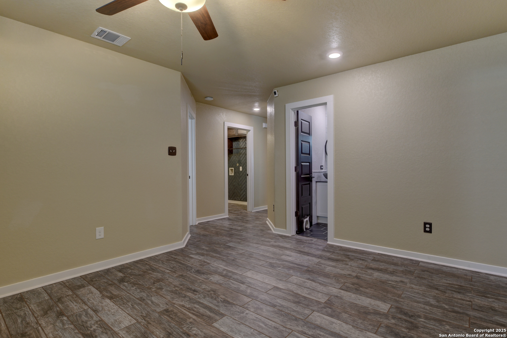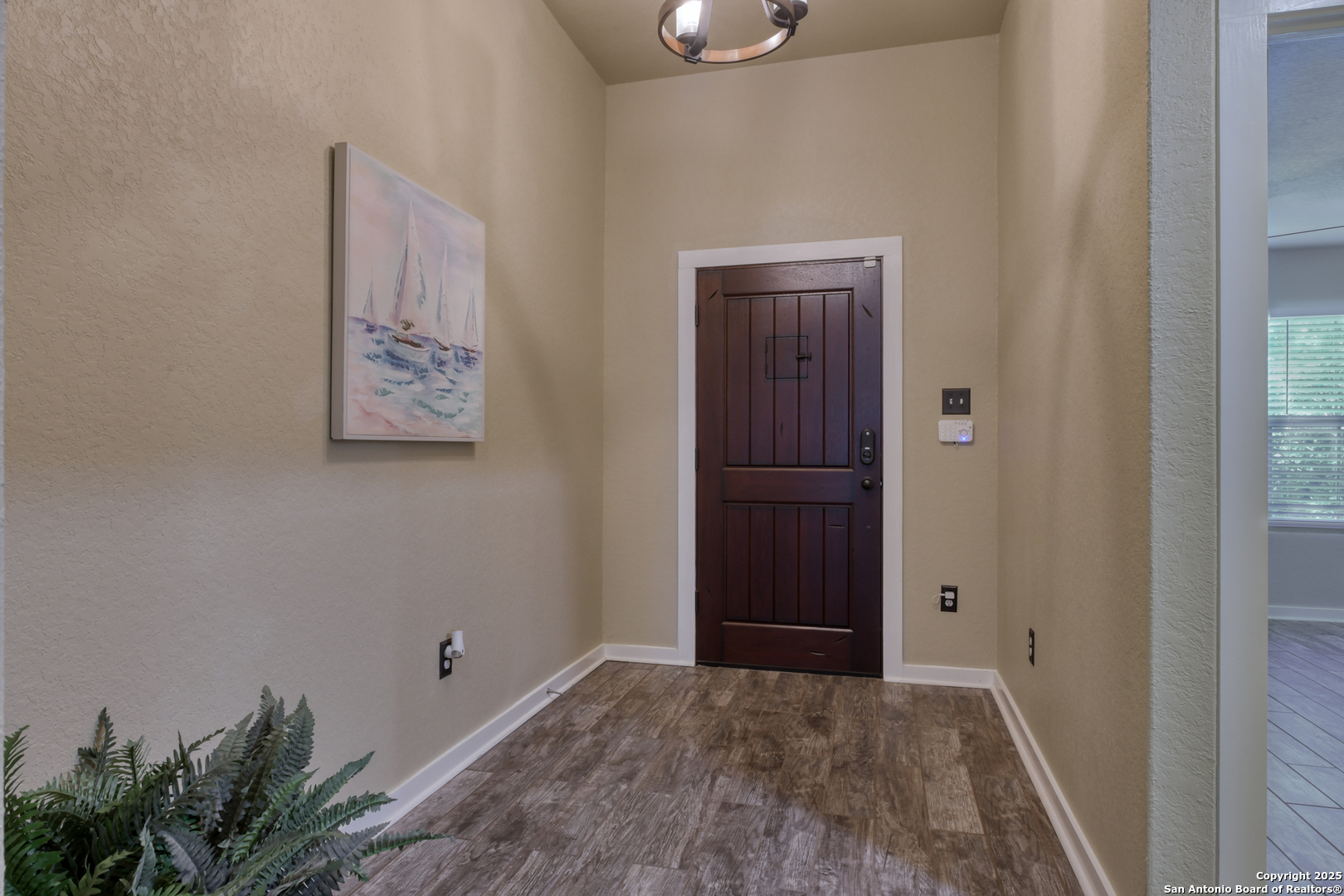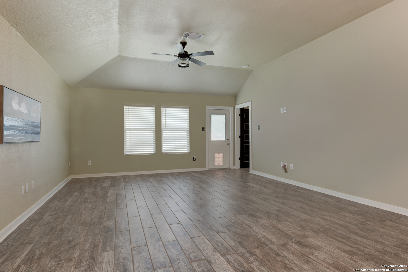 As you drive into the neighborhood, this cozy one-story property feels right at home. The yard is nicely kept, with mature trees adding a touch of nature, and the covered front entry invites you to step inside and unwind. When you open the stylish wooden front door, you're welcomed by a spacious entry hall. The warm neutral colors and wood-look tile underfoot create a relaxed vibe. Just off the entry, glass double doors lead to a private office. Morning light streams through a big window, making it a great spot to work from home. High ceilings and recessed lighting keep the space feeling open and airy. As you move further in, you'll find the heart of the home - the island kitchen. The dark cabinets stand out against the shiny granite countertops and stacked stone accents, with a full backsplash tying it all together. There's plenty of counter space for cooking, and under-cabinet lighting adds a warm glow in the evenings. The island has bar seating, extra storage, and even a built-in desk for managing household tasks or helping with homework. The pantry has been smartly remodeled for easy organization. From the kitchen, you step into a large living and dining area. The vaulted ceiling adds to the airy feel, with sunlight streaming through the windows and a glass door leading to the backyard. The wood-look tile flooring continues throughout, connecting the space as you imagine hosting friends for dinner or kids playing board games. At the back of the house, the primary suite feels like a private getaway. The wood-look tile continues underfoot, and a bold feature wall adds personality. Three windows let in soft natural light, and sliding barn doors add rustic charm as they open to the spa-like bath and large walk-in closet. The en-suite bath features marble-look tile on the floors and shower surround, with sliding glass doors leading to a spacious walk-in shower. The double vanity has sleek counters and a framed mirror that reflects the room's gentle light. Built-in cabinetry keeps essentials organized, and the walk-in closet offers plenty of shelving and hanging space. Down the hall, there's a spacious second living area that can be anything you need - a game room, media space, or playroom. The easy-care tile flooring is both practical and stylish. This area connects to a full secondary bathroom with designer touches like a black stone vessel sink, hex tile floors, and a modern tub/shower with marble-look tile and matte black fixtures. Three more bedrooms line the hall, ready for family, guests, or another home office. Sleek wood-look flooring, neutral walls, and stylish light fixtures make them move-in ready. Nearby, the laundry room is both functional and stylish, with upper cabinets for storage and a bold herringbone tile backsplash. Throughout the home, thoughtful upgrades make daily life easier - a whole-house surge protector, wire drops for TVs, a water softener, a tankless water heater, extra attic storage, a remodeled pantry, soffit lighting, and epoxy flooring in the garage. Step through the back door, and the comfort continues. The private backyard is enclosed by a wooden fence and bordered by a stone retaining wall for privacy. There's a storage shed along the fence and plenty of lawn space for kids, pets, or barbecues. All of this is just minutes from shopping and highways, making your commute easy and your weekends full of possibilities. This is more than a house - it's a place to truly live, relax, and call your own. Please be aware that some photos have been virtually staged.