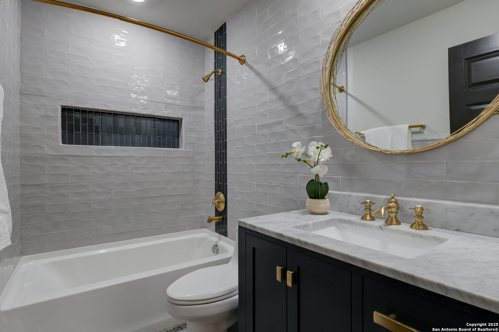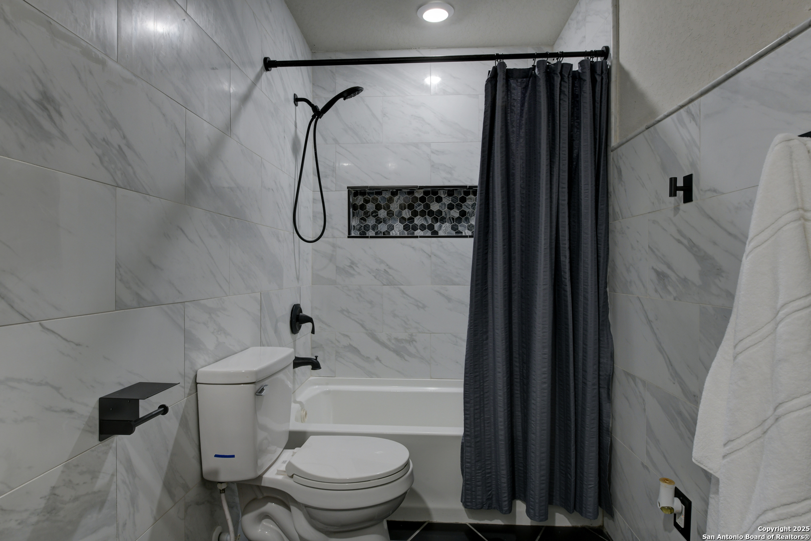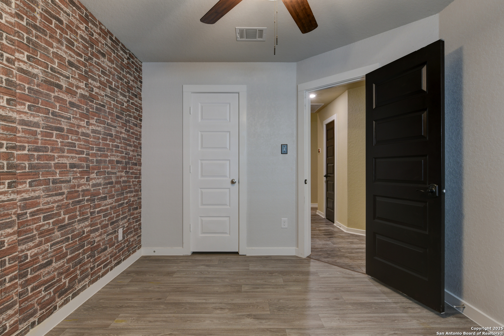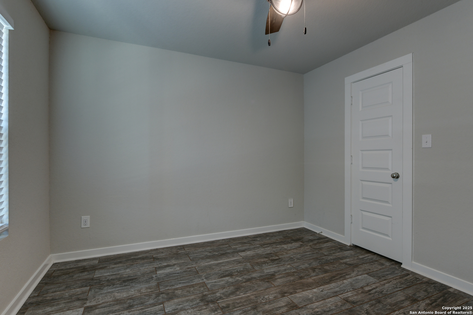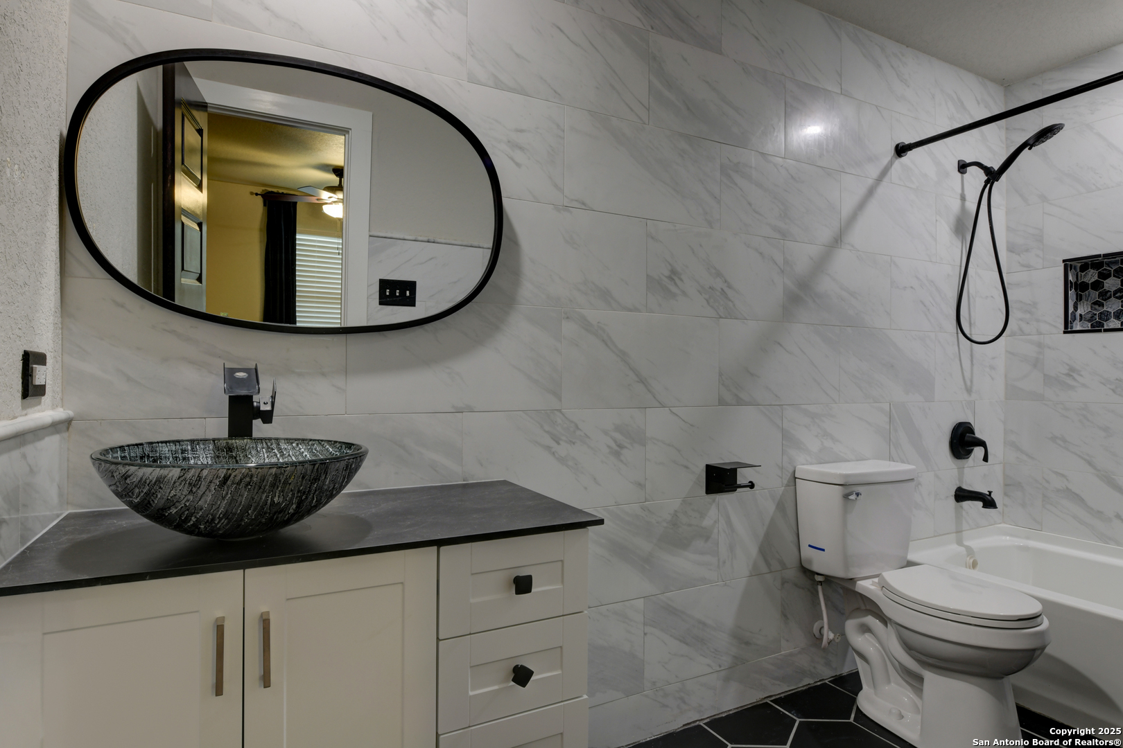 As you drive into the neighborhood, this cozy one-story property feels right at home. The yard is nicely kept, with mature trees adding a touch of nature, and the covered front entry invites you to step inside and unwind. When you open the stylish wooden front door, you're welcomed by a spacious entry hall. The warm neutral colors and wood-look tile underfoot create a relaxed vibe. Just off the entry, glass double doors lead to a private office. Morning light streams through a big window, making it a great spot to work from home. High ceilings and recessed lighting keep the space feeling open and airy. As you move further in, you'll find the heart of the home - the island kitchen. The dark cabinets stand out against the shiny granite countertops and stacked stone accents, with a full backsplash tying it all together. There's plenty of counter space for cooking, and under-cabinet lighting adds a warm glow in the evenings. The island has bar seating, extra storage, and even a built-in desk for managing household tasks or helping with homework. The pantry has been smartly remodeled for easy organization. From the kitchen, you step into a large living and dining area. The vaulted ceiling adds to the airy feel, with sunlight streaming through the windows and a glass door leading to the backyard. The wood-look tile flooring continues throughout, connecting the space as you imagine hosting friends for dinner or kids playing board games. At the back of the house, the primary suite feels like a private getaway. The wood-look tile continues underfoot, and a bold feature wall adds personality. Three windows let in soft natural light, and sliding barn doors add rustic charm as they open to the spa-like bath and large walk-in closet. The en-suite bath features marble-look tile on the floors and shower surround, with sliding glass doors leading to a spacious walk-in shower. The double vanity has sleek counters and a framed mirror that reflects the room's gentle light. Built-in cabinetry keeps essentials organized, and the walk-in closet offers plenty of shelving and hanging space. Down the hall, there's a spacious second living area that can be anything you need - a game room, media space, or playroom. The easy-care tile flooring is both practical and stylish. This area connects to a full secondary bathroom with designer touches like a black stone vessel sink, hex tile floors, and a modern tub/shower with marble-look tile and matte black fixtures. Three more bedrooms line the hall, ready for family, guests, or another home office. Sleek wood-look flooring, neutral walls, and stylish light fixtures make them move-in ready. Nearby, the laundry room is both functional and stylish, with upper cabinets for storage and a bold herringbone tile backsplash. Throughout the home, thoughtful upgrades make daily life easier - a whole-house surge protector, wire drops for TVs, a water softener, a tankless water heater, extra attic storage, a remodeled pantry, soffit lighting, and epoxy flooring in the garage. Step through the back door, and the comfort continues. The private backyard is enclosed by a wooden fence and bordered by a stone retaining wall for privacy. There's a storage shed along the fence and plenty of lawn space for kids, pets, or barbecues. All of this is just minutes from shopping and highways, making your commute easy and your weekends full of possibilities. This is more than a house - it's a place to truly live, relax, and call your own. Please be aware that some photos have been virtually staged.