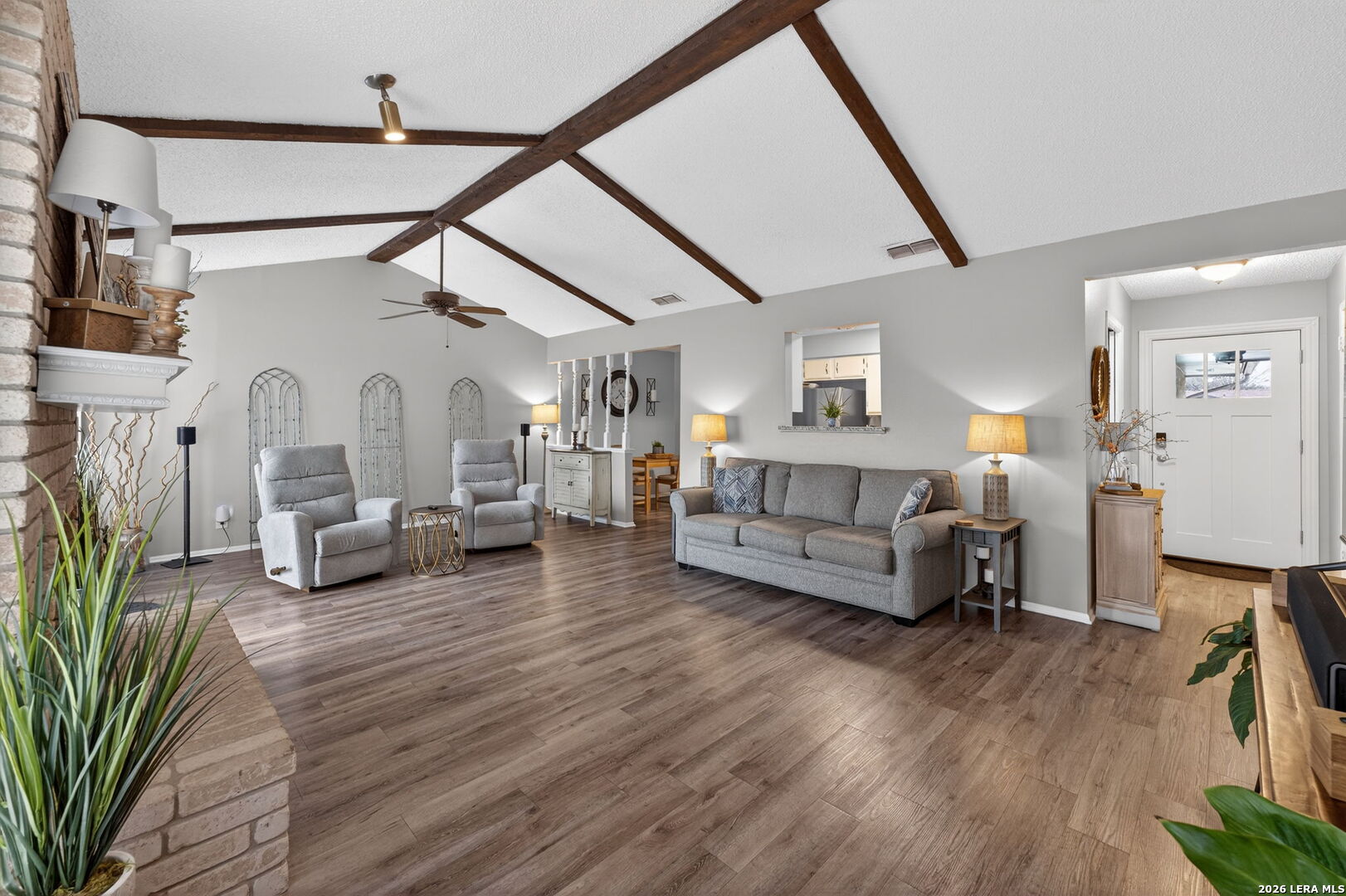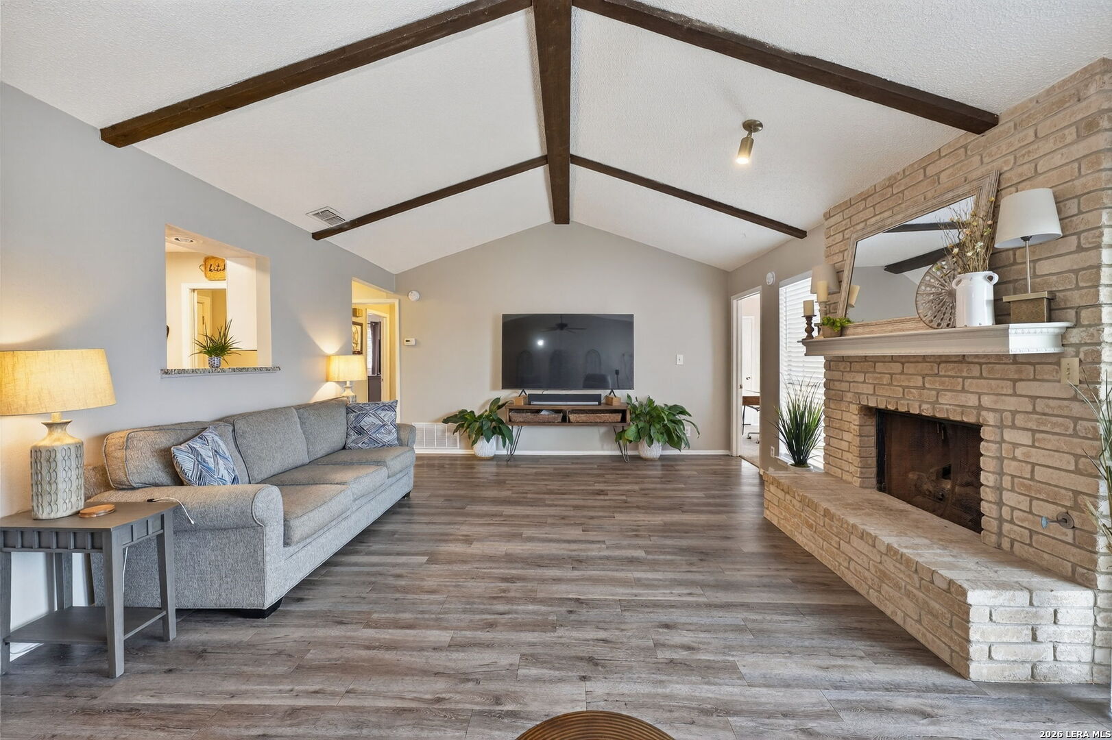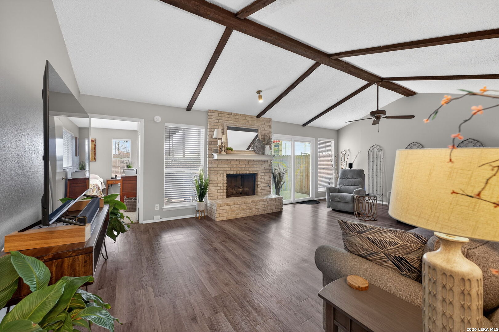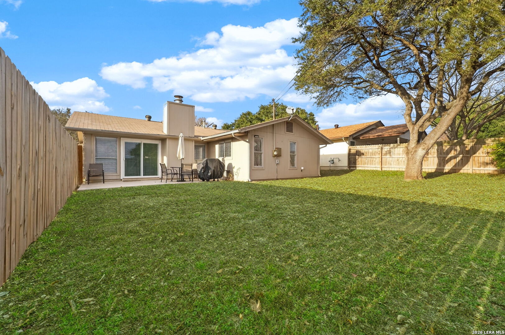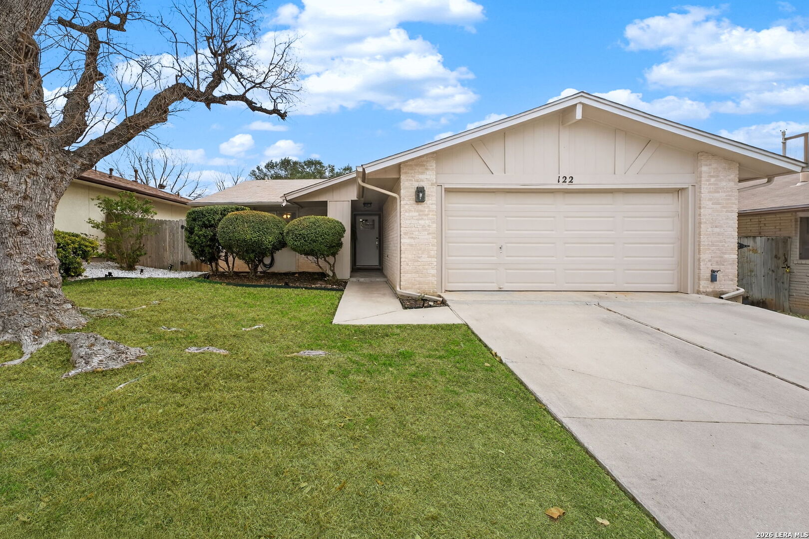 Welcome to 122 Bolerio Dr, a move-in ready 3-bedroom, 2-bath home offering 1,355 sq ft of comfortable living space with a 2-car garage, perfectly located in the heart of Universal City. Enjoy the covered front porch with decorative tile, an inviting spot for morning coffee or evening relaxation. Stepping through the recently upgraded front door you'll feel right at home with tasteful updates like luxury vinyl plank flooring through the main living areas and granite countertops throughout. The living room has high vaulted ceilings with wood beams and a cozy fireplace that create a grand, welcoming feel. Carpet is limited to the bedrooms only for added comfort, and the recently replaced rear door plus all appliances included make this home truly turnkey. With no HOA and no rear neighbors, you'll appreciate the added freedom and privacy, along with a super convenient location less than 3 miles from Randolph AFB and minutes from Loop 1604, I-35, I-10, The Forum, H-E-B, and Walmart-this is a smart buy you don't want to miss.