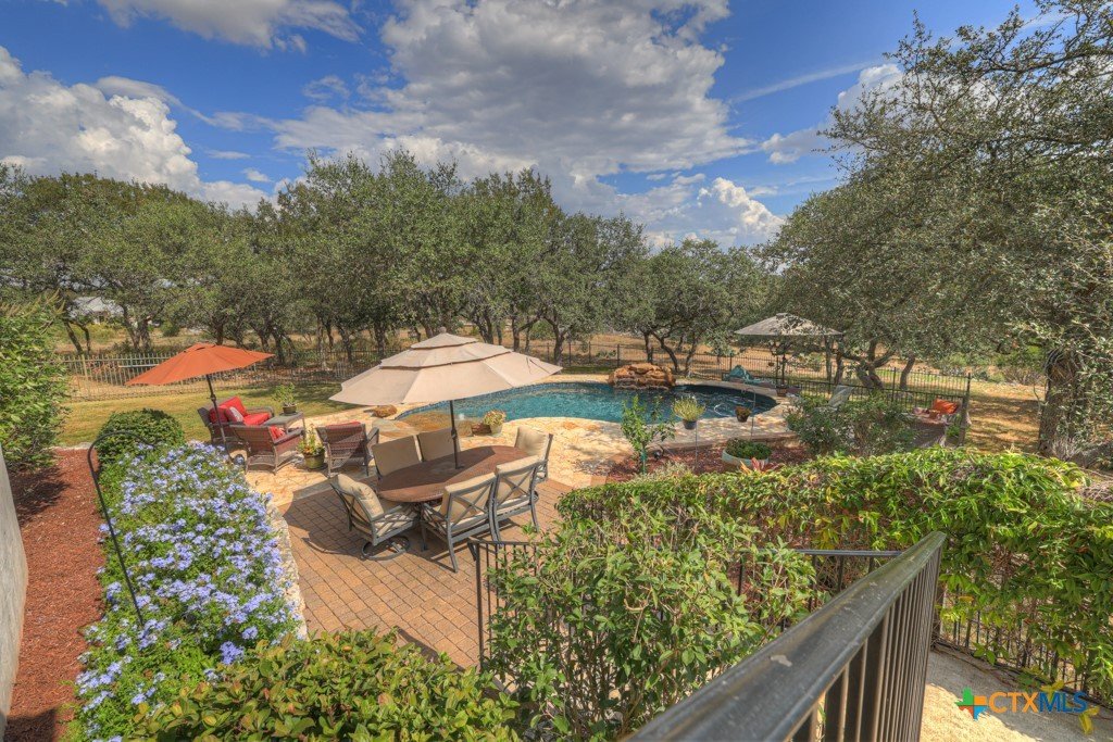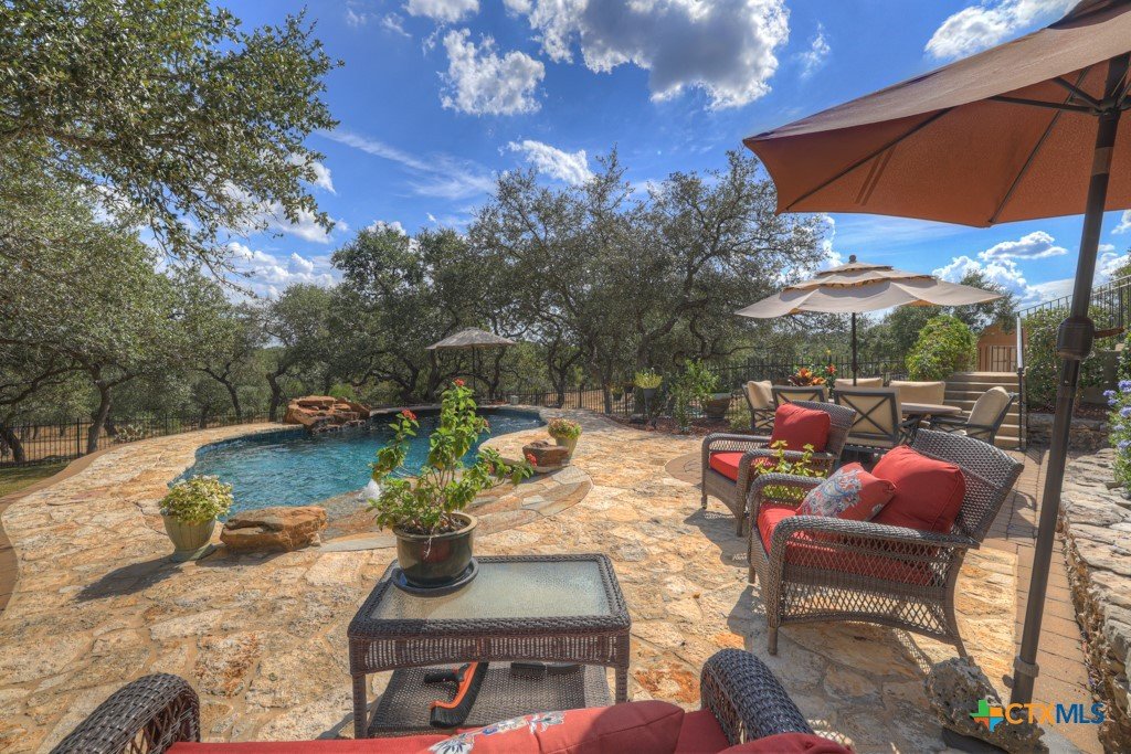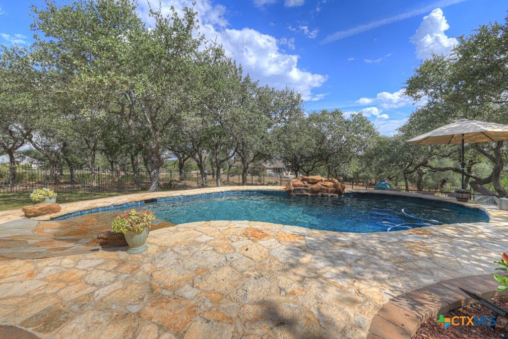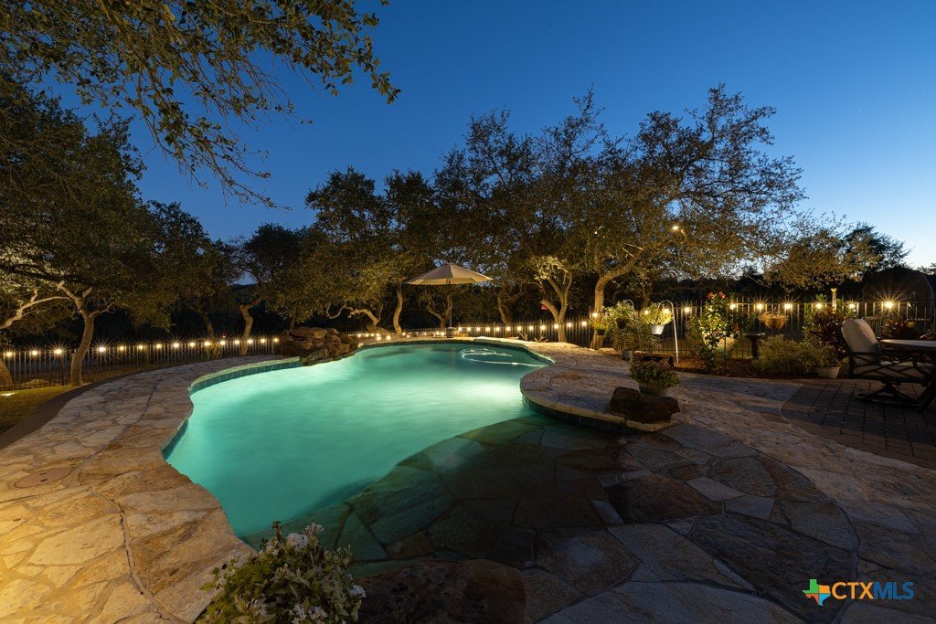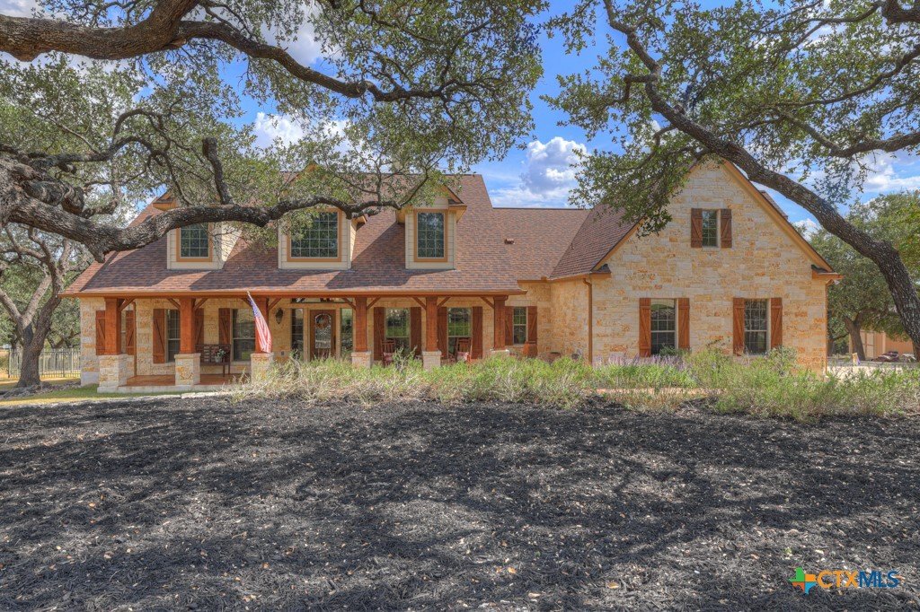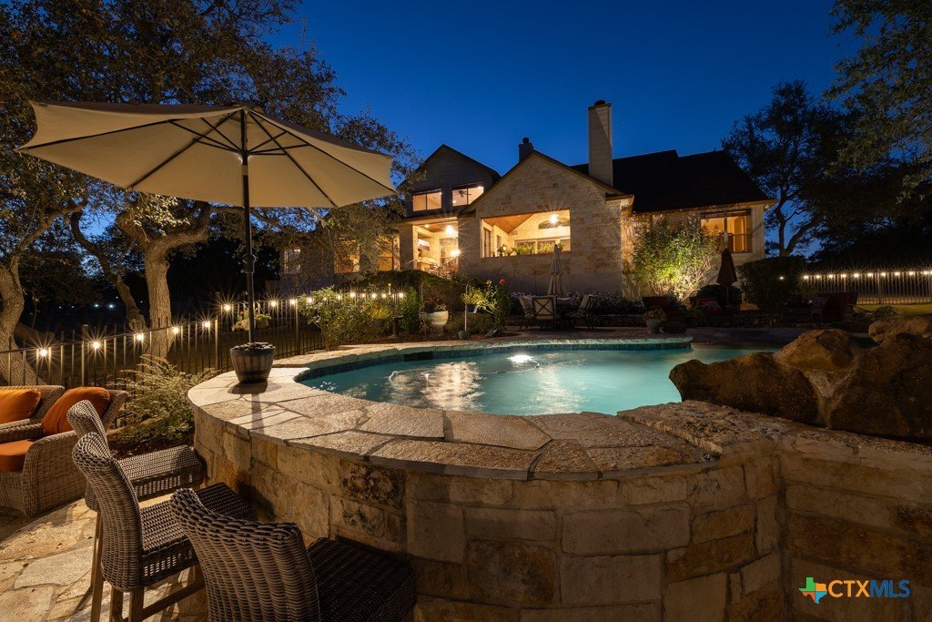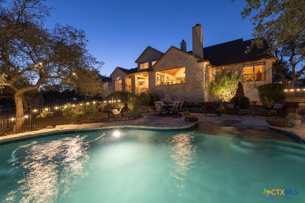 A TRUE HILL COUNTRY RETREAT WITH POOL on 2 BEAUTIFULLY LANDSCAPED ACRES Nestled among majestic oak trees, this stunning home captures the essence of Hill Country living-peaceful, private, and picturesque. From the moment you step inside, the open floor plan welcomes you with warmth and style. Thoughtfully designed for both comfort and function, the home features 4 spacious bedrooms plus a study, two dining areas, a versatile game room/man cave, 3.5 bathrooms, and a 3-car garage. The kitchen is a chef's delight with granite countertops, center island with a prep sink, a gas cooktop, double ovens, custom cabinetry, and two pantries-including one accented with charming barn doors. The only rooms upstairs are the large 4th bedroom, full bath, and the game room/man cave, offering privacy and flexibility for guests or hobbies. Step outside to your own private paradise. A spacious screened-in patio with a cozy fireplace overlooks the sparkling pool area which is enclosed by elegant iron fencing that keeps wildlife out while preserving the scenic Hill Country views. An outdoor kitchen makes entertaining and enjoying the outdoors fun and convenient. As day turns to night, the extensive landscape lighting showcases the home's beauty and creates an enchanting ambiance that highlights the architecture and natural surroundings. This home is more than a place to live-it's a lifestyle of comfort, elegance, and connection to nature. River Chase is known for it's incredible amenities: 33-acre park with clubhouse, pools, walking trails, tennis & pickleball courts, fitness center, playground, Veteran's park and fishing pond, PLUS a 58-acre park with private Guadalupe River access, pavilion, basketball court, bird viewing station, and miles of first class hiking trails - all for just $300 per year.