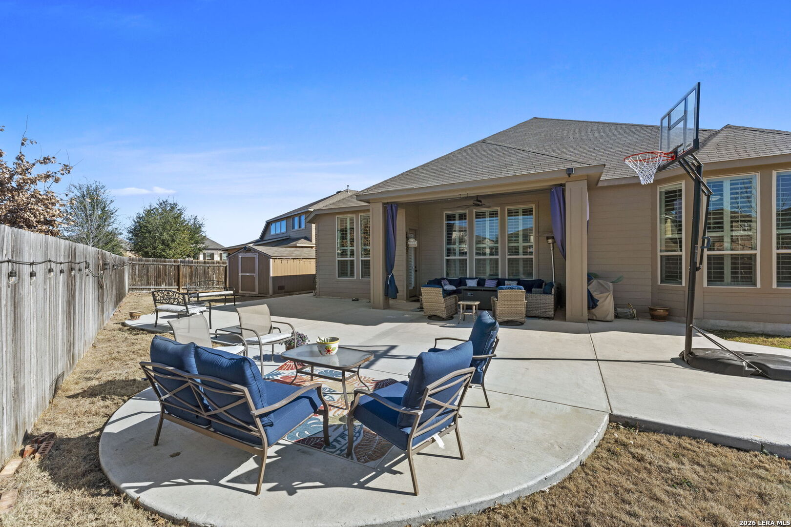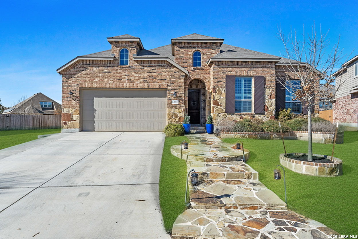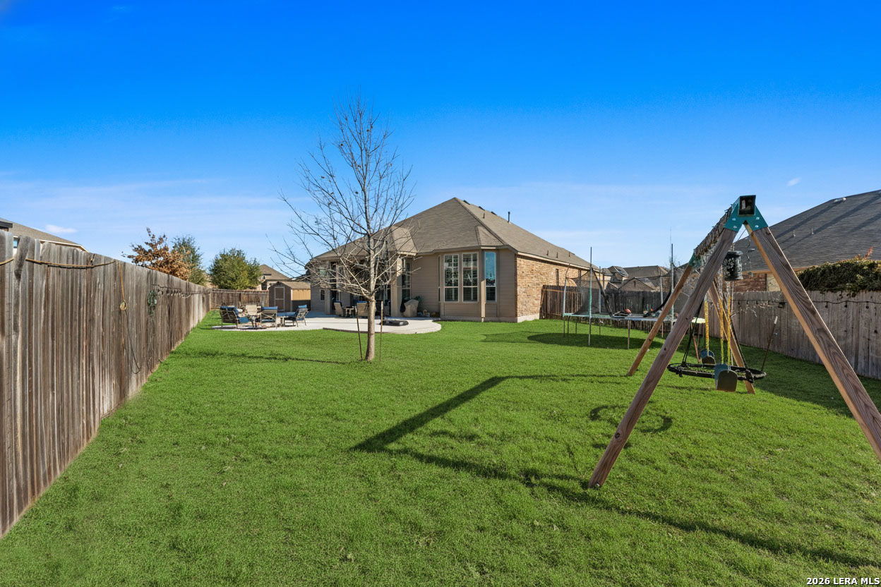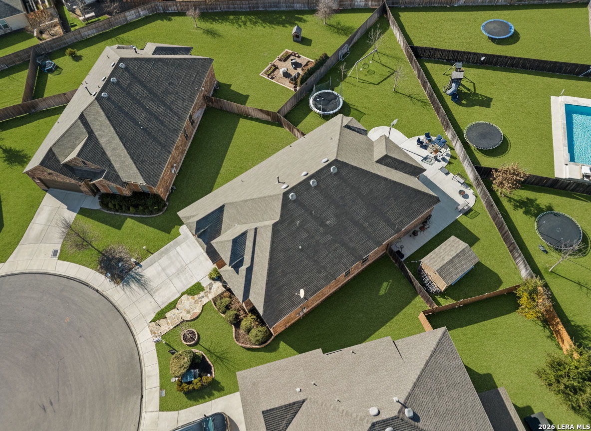 Welcome to this beautifully maintained Highland Home in the sought-after Davis Ranch community. Situated on a spacious quarter-acre cul-de-sac lot, this floor plan offers an ideal blend of comfort and functionality with four bedrooms, three full bathrooms, a private study, an additional flex space, and a dedicated media room. The main living areas feature elegant tile flooring, while plush carpet adds warmth to the bedrooms and media space. Thoughtfully selected upgrades are found throughout the home, including custom window shutters, eight-foot interior doors, oil-rubbed bronze fixtures, and ceiling fans in every room. The primary suite is a true retreat, highlighted by a bay window and an expansive walk-in closet. Outdoor living is enhanced by an extended covered patio and a storage shed, perfect for added convenience. Residents enjoy access to a nearby HOA pool and park, just a short walk away. This home is ideally positioned near JBSA military bases, major highways, and a variety of shopping and dining options, this location offers both ease and accessibility. Schedule your showing today and experience everything this exceptional property has to offer!