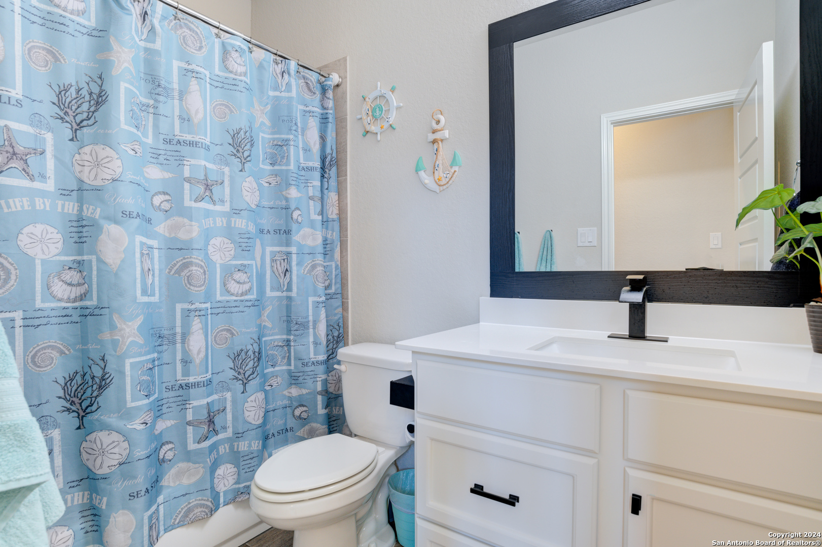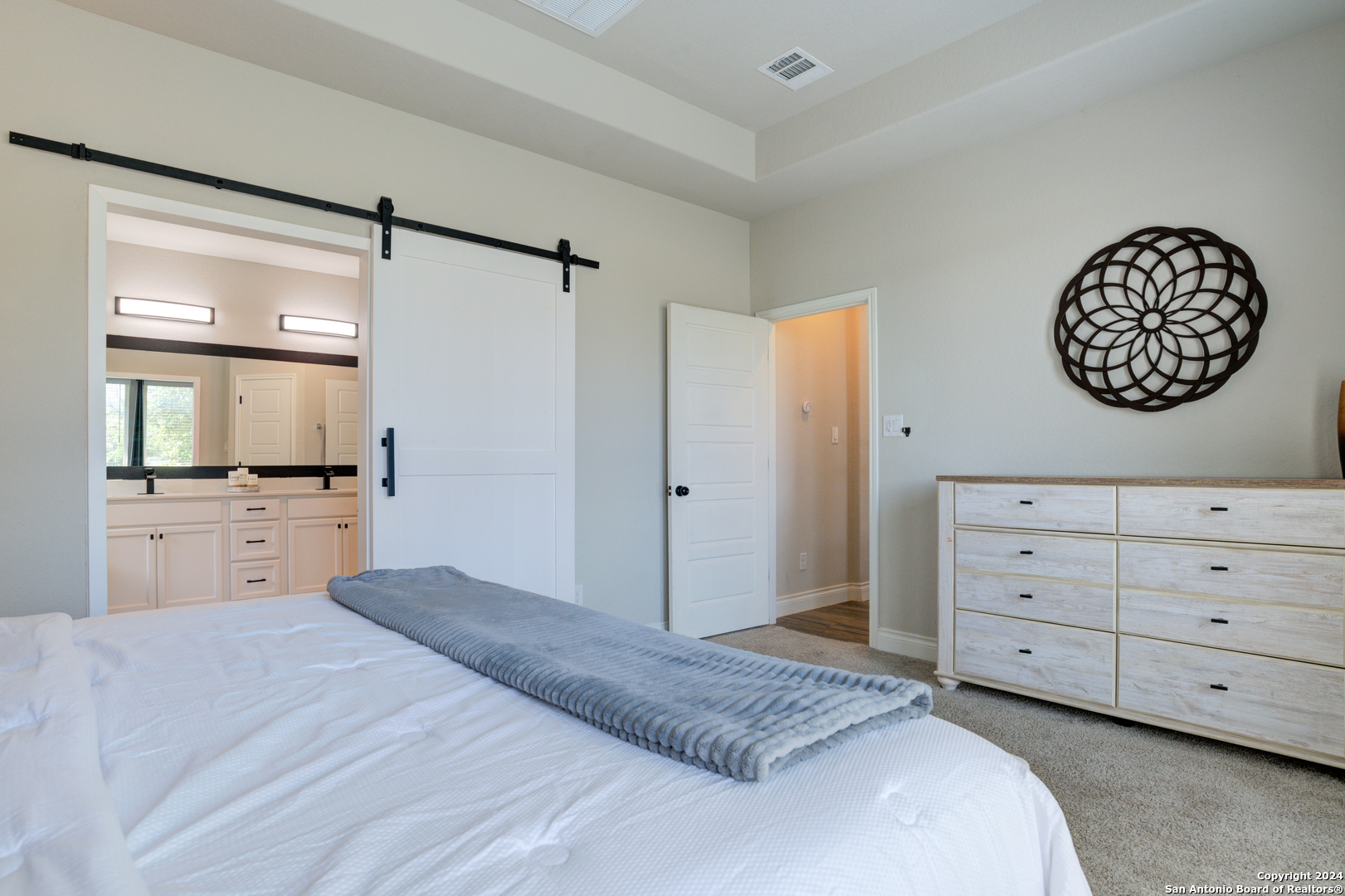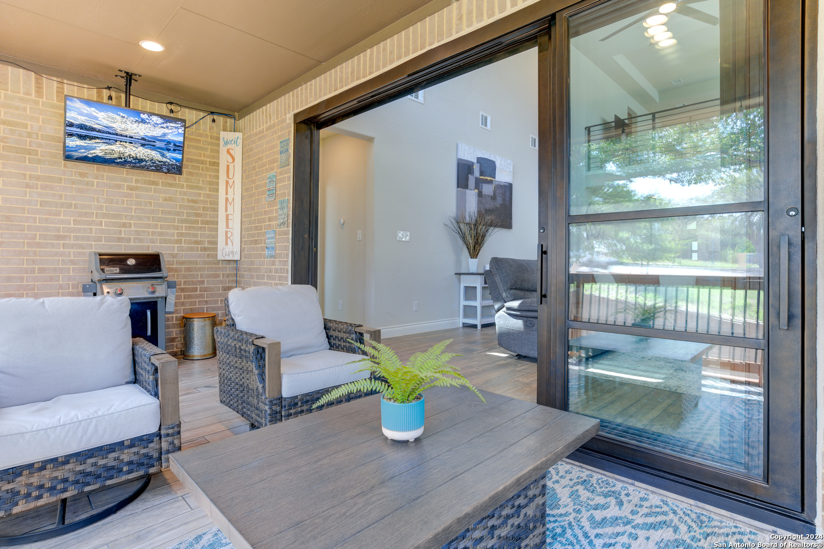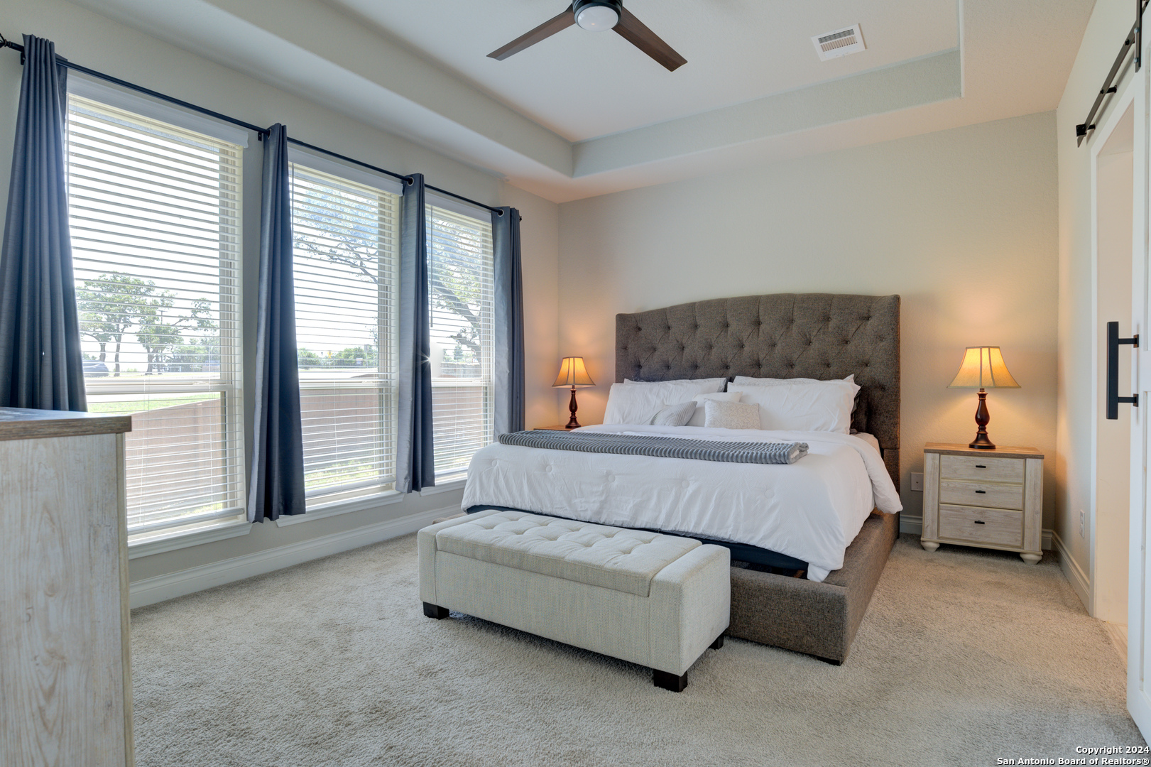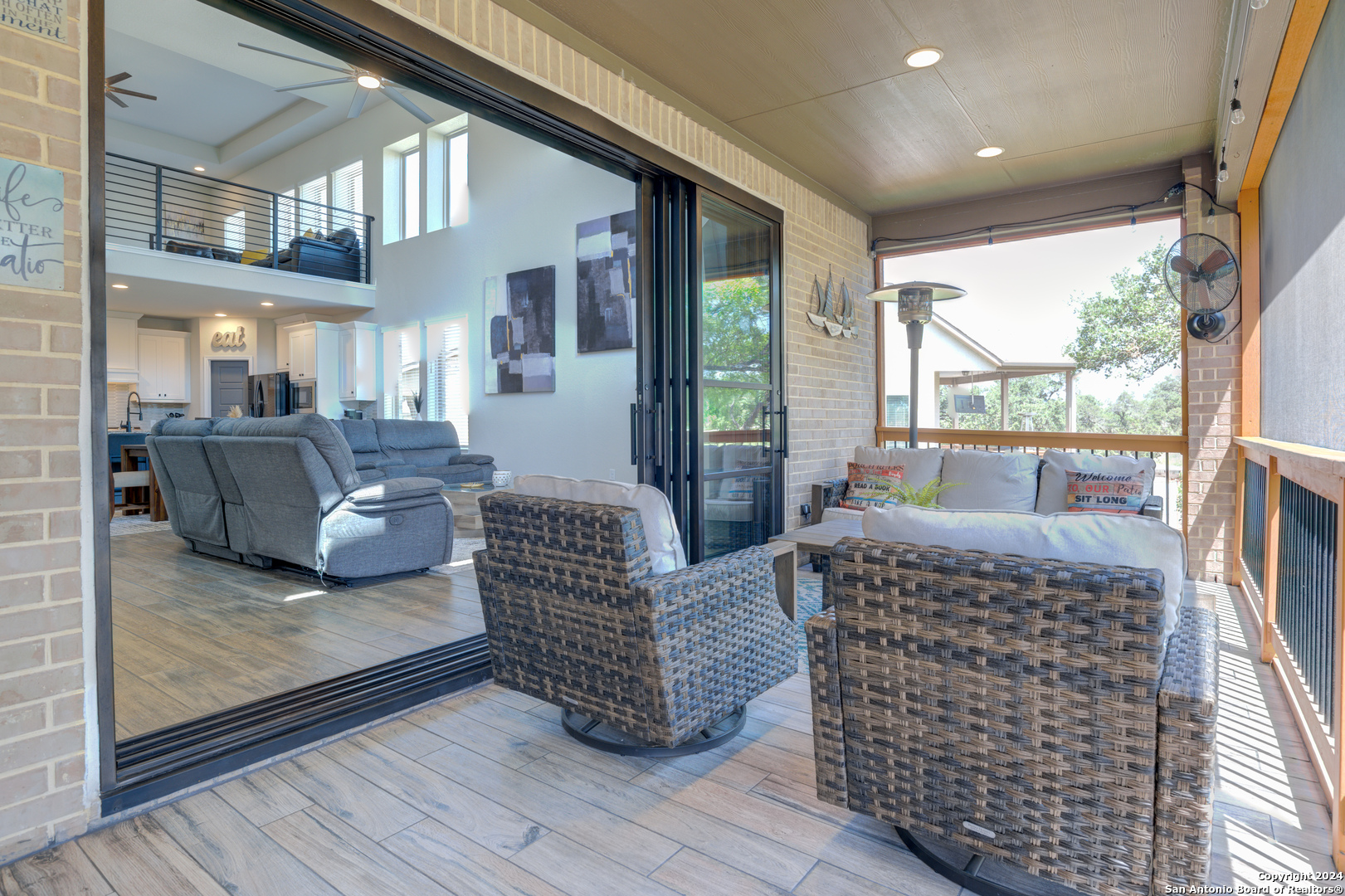 Welcome to a meticulously maintained 4-bedroom, 3 bathroom home in the desirable Kinder Ranch community. Currently owned by a military family, this home reflects pride and discipline with regular upkeep and care. Enjoy an inviting living space with high ceilings, a modern kitchen with stainless steel appliances, and an expansive master suite with a walk-in closet and spa-like bathroom. The private backyard with a covered patio with an eye popping iron door is perfect for outdoor activities. Kinder Ranch offers amenities like a community pool, playground, and walking trails. Conveniently located near major highways, this home provides easy access to military bases, shopping, dining, and top-rated Comal ISD schools. Experience the best of San Antonio living. Schedule a showing today!