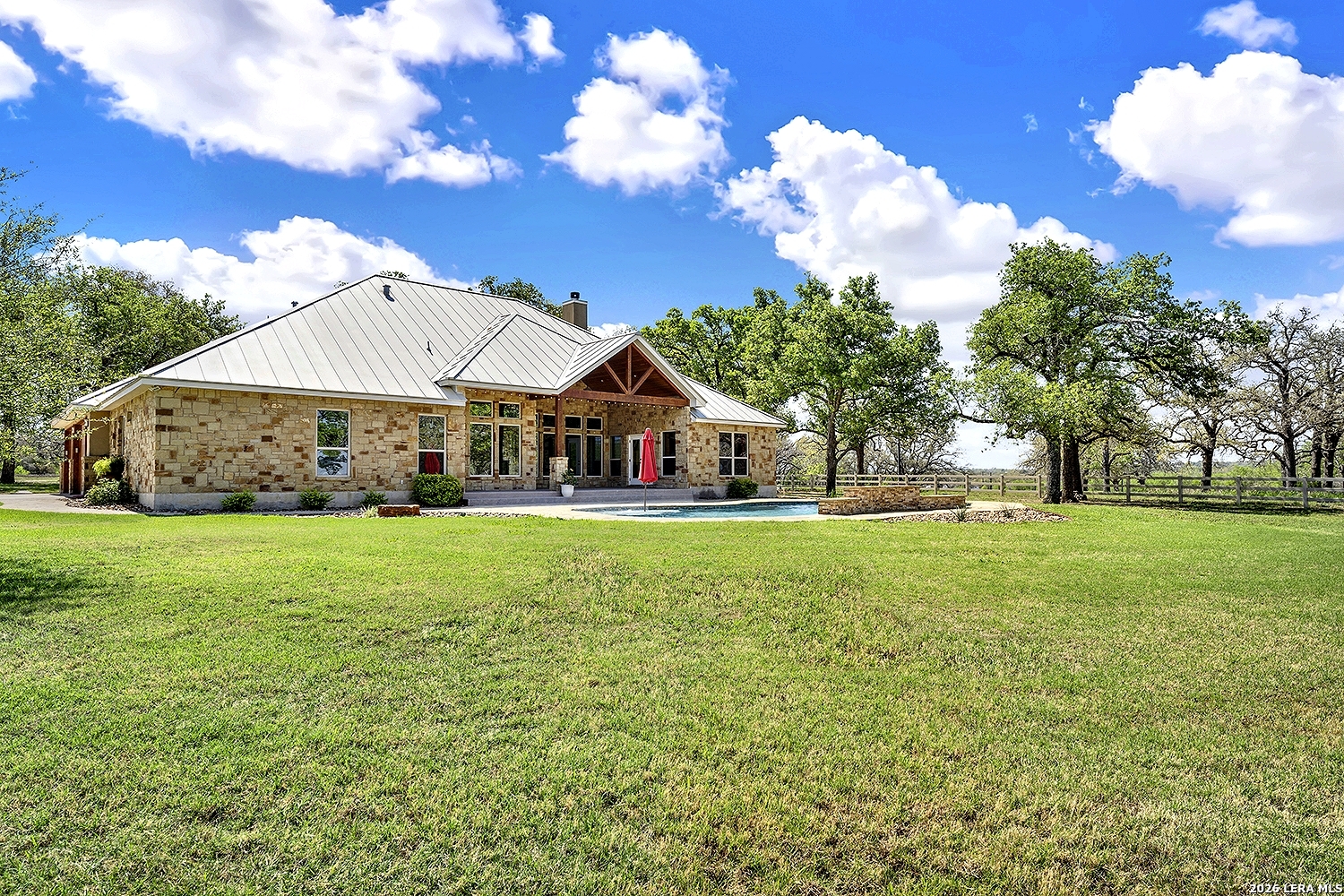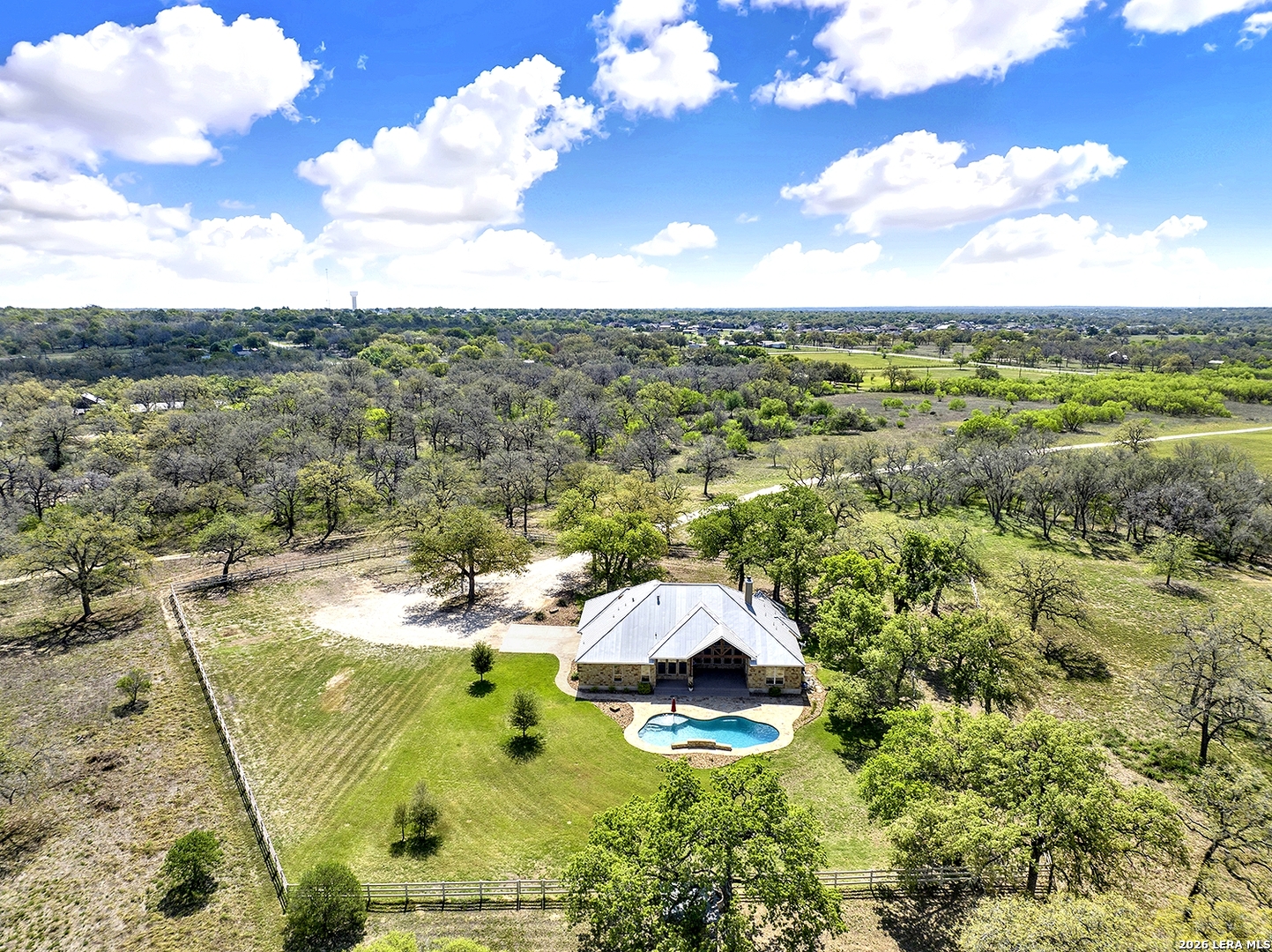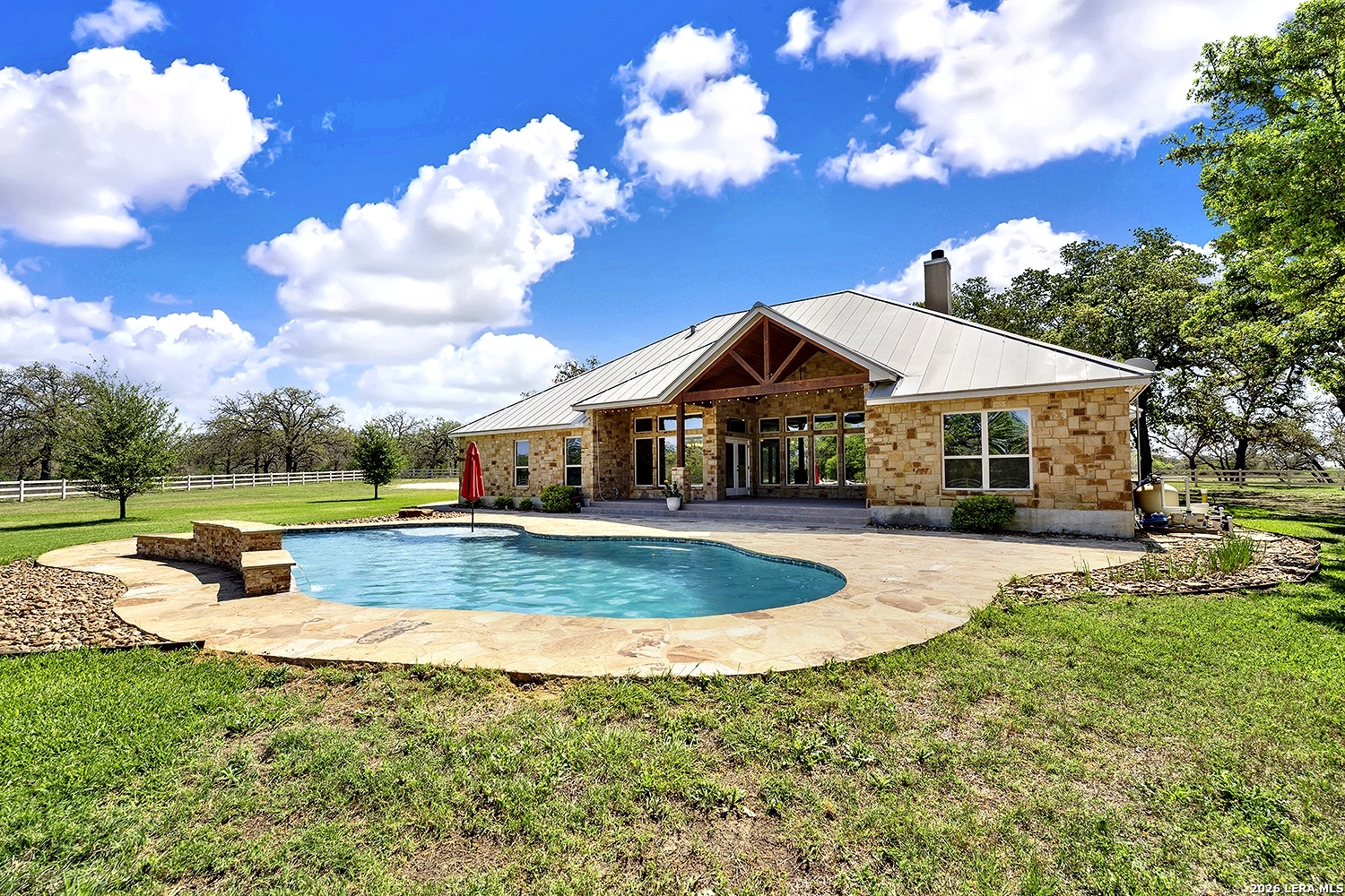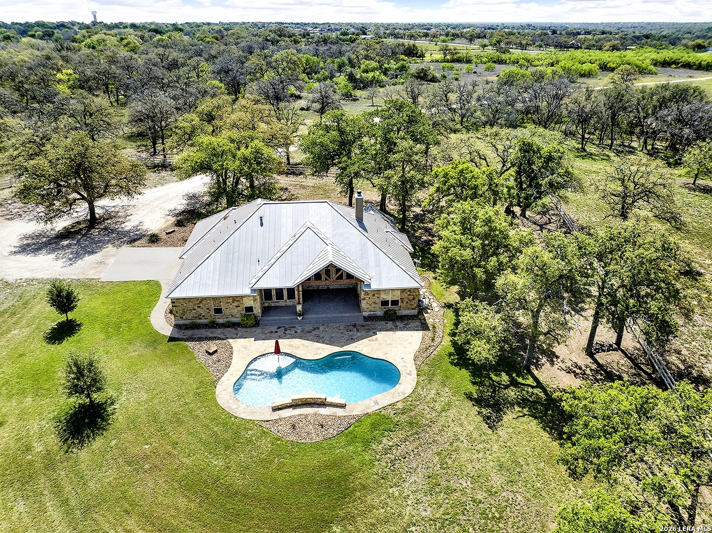Great opportunity to own your own piece of Texas country with this gorgeous ranchette just outside the San Antonio Area. The picturesque property features 25 acres studded in mature trees with a gorgeous Ranch style rock and stucco home with a metal roof and modern finish out. Beautiful Open Floor Plan featuring 5 bedrooms, 3 full bathrooms, additional Office and separate Game Room (5th BR) with wet bar area and on-suite bathroom. Tile and Engineered Hardwood floors throughout and a Grand Rock Fireplace from ceiling to floor. Open living plan, with a chef's kitchen with premium appliances and a large granite bar for ample seating. Large windows in the main living area over look the large covered patio that leads you to the inground pool surrounded by flagstone and a water fall feature. Sprinkler system yard and mature trees to keep a canopy of shade in the vinyl fenced in yard. Ample parking space and gravel area for parking and circle drive, 2 car garage (will fit 2 dually trucks), Stock Tank located in the back of property and maintains an Ag Exemption due to the lush coastal grass up front for hay production. Wooded back acres are a wildlife paradise. This property has so much to offer and beautiful secluded setting all while being conveniently located to the La Vernia community as well as 25 MI commute to downtown SA. Located less than 5 miles outside Loop 1604.