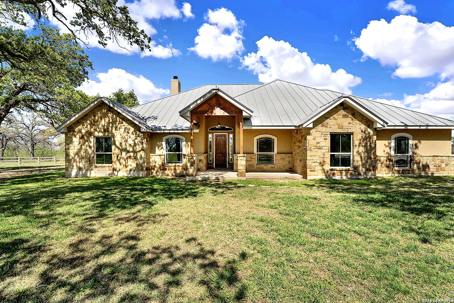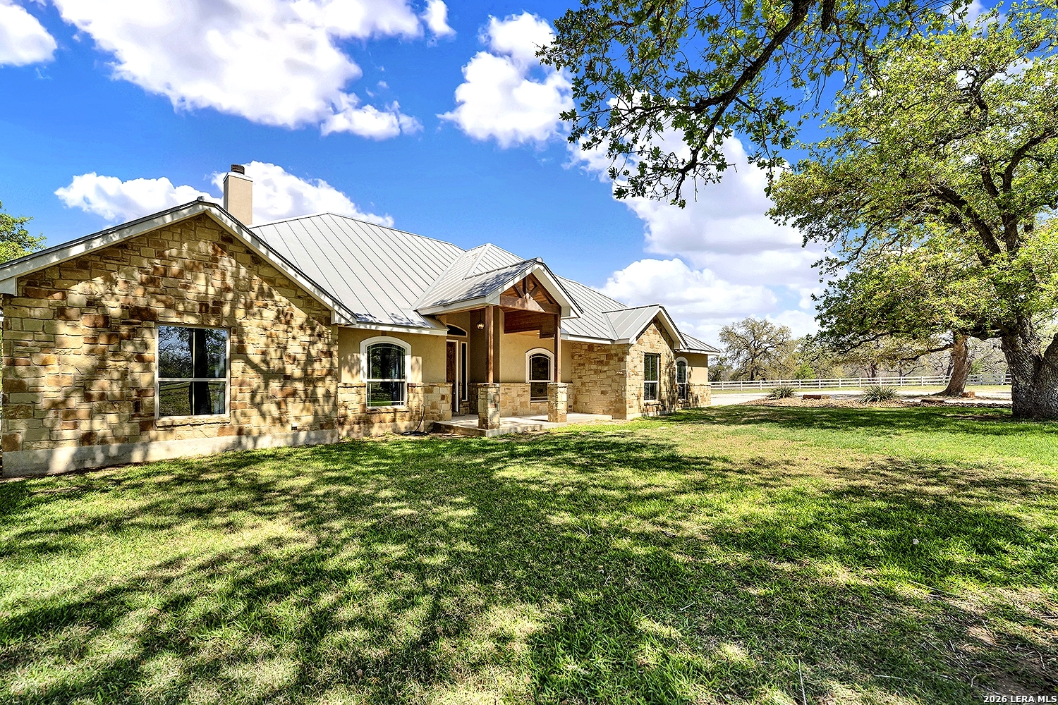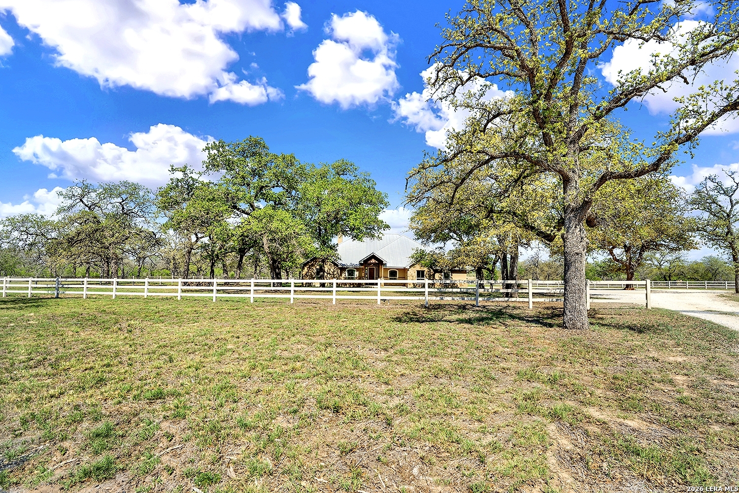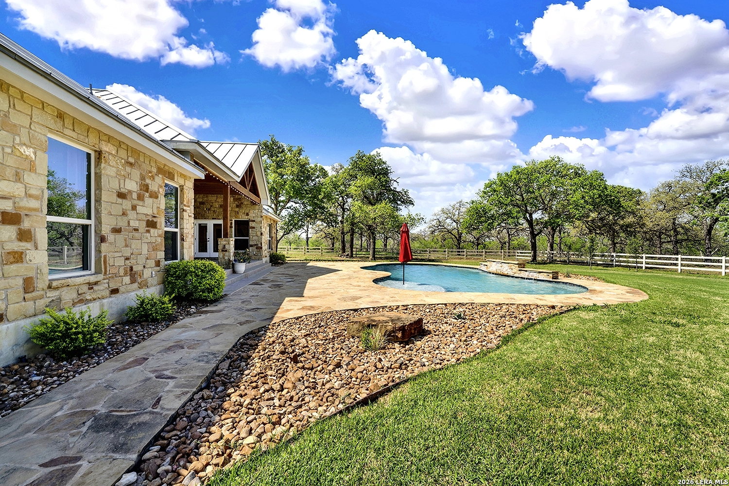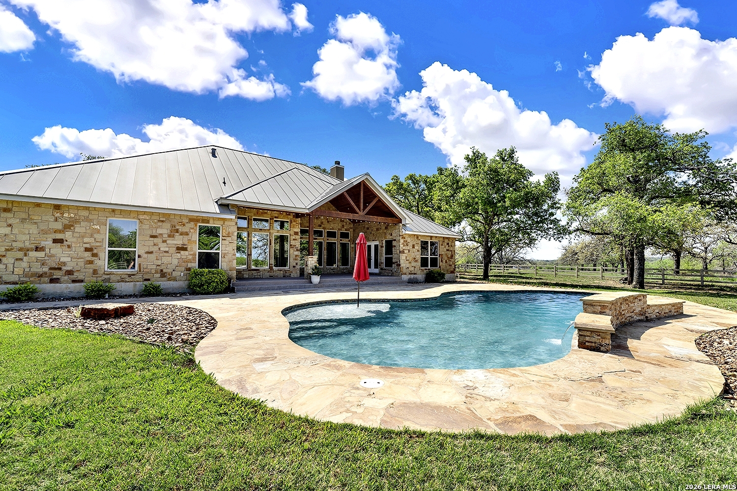 Great opportunity to own your own piece of Texas country with this gorgeous ranchette just outside the San Antonio Area. The picturesque property features 25 acres studded in mature trees with a gorgeous Ranch style rock and stucco home with a metal roof and modern finish out. Beautiful Open Floor Plan featuring 5 bedrooms, 3 full bathrooms, additional Office and separate Game Room (5th BR) with wet bar area and on-suite bathroom. Tile and Engineered Hardwood floors throughout and a Grand Rock Fireplace from ceiling to floor. Open living plan, with a chef's kitchen with premium appliances and a large granite bar for ample seating. Large windows in the main living area over look the large covered patio that leads you to the inground pool surrounded by flagstone and a water fall feature. Sprinkler system yard and mature trees to keep a canopy of shade in the vinyl fenced in yard. Ample parking space and gravel area for parking and circle drive, 2 car garage (will fit 2 dually trucks), Stock Tank located in the back of property and maintains an Ag Exemption due to the lush coastal grass up front for hay production. Wooded back acres are a wildlife paradise. This property has so much to offer and beautiful secluded setting all while being conveniently located to the La Vernia community as well as 25 MI commute to downtown SA. Located less than 5 miles outside Loop 1604.