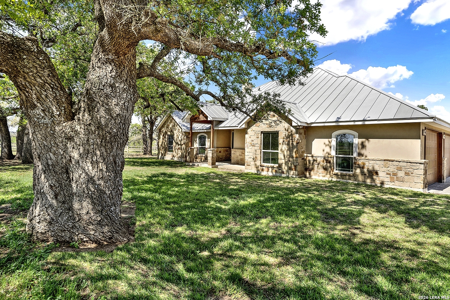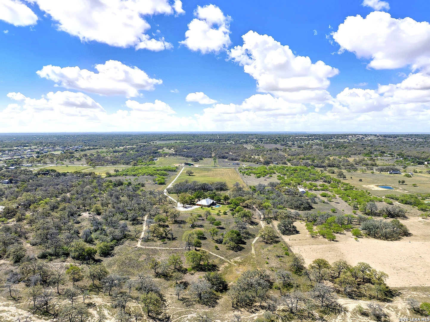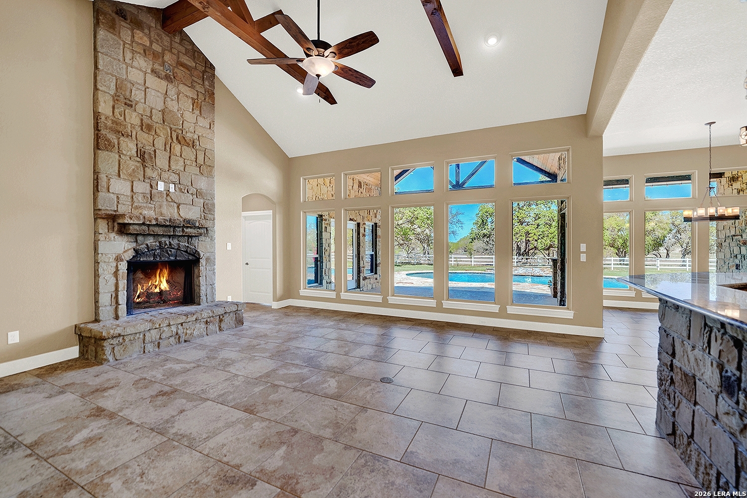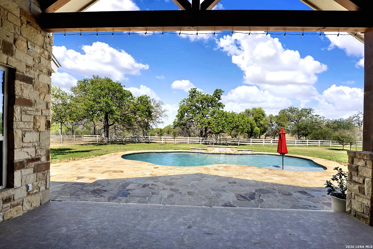 Great opportunity to own your own piece of Texas country with this gorgeous ranchette just outside the San Antonio Area. The picturesque property features 25 acres studded in mature trees with a gorgeous Ranch style rock and stucco home with a metal roof and modern finish out. Beautiful Open Floor Plan featuring 5 bedrooms, 3 full bathrooms, additional Office and separate Game Room (5th BR) with wet bar area and on-suite bathroom. Tile and Engineered Hardwood floors throughout and a Grand Rock Fireplace from ceiling to floor. Open living plan, with a chef's kitchen with premium appliances and a large granite bar for ample seating. Large windows in the main living area over look the large covered patio that leads you to the inground pool surrounded by flagstone and a water fall feature. Sprinkler system yard and mature trees to keep a canopy of shade in the vinyl fenced in yard. Ample parking space and gravel area for parking and circle drive, 2 car garage (will fit 2 dually trucks), Stock Tank located in the back of property and maintains an Ag Exemption due to the lush coastal grass up front for hay production. Wooded back acres are a wildlife paradise. This property has so much to offer and beautiful secluded setting all while being conveniently located to the La Vernia community as well as 25 MI commute to downtown SA. Located less than 5 miles outside Loop 1604.