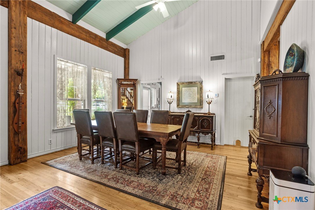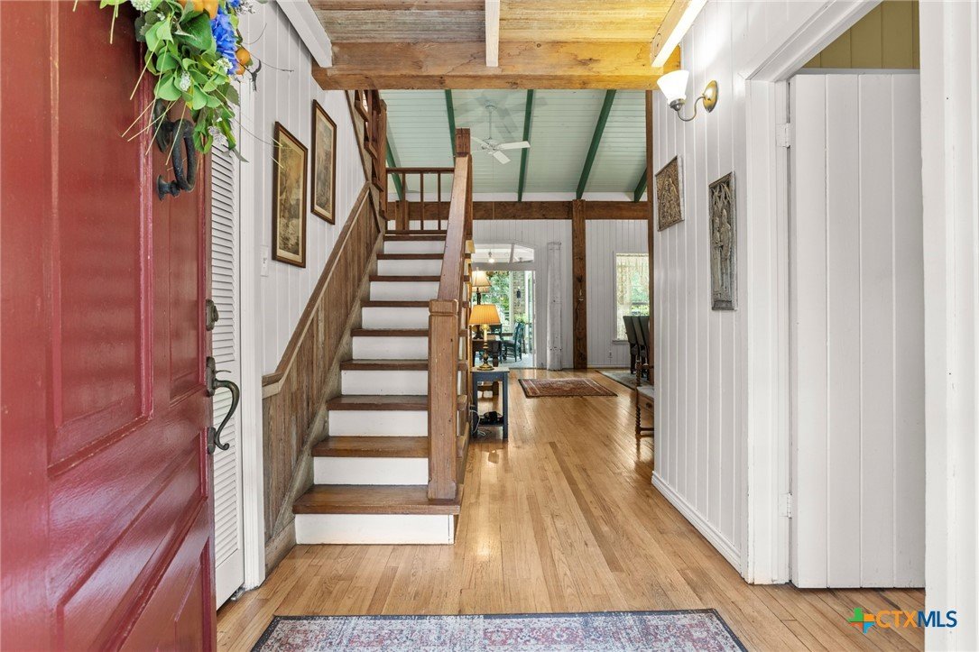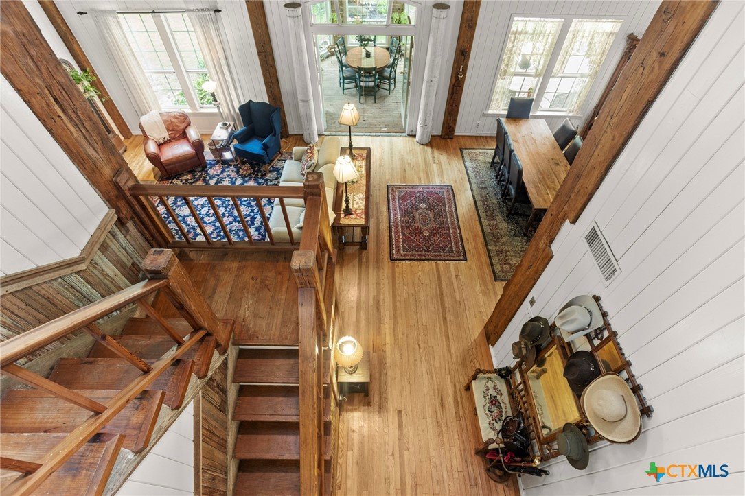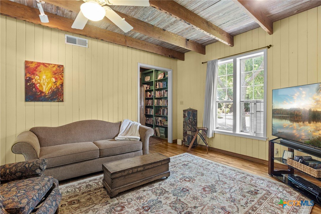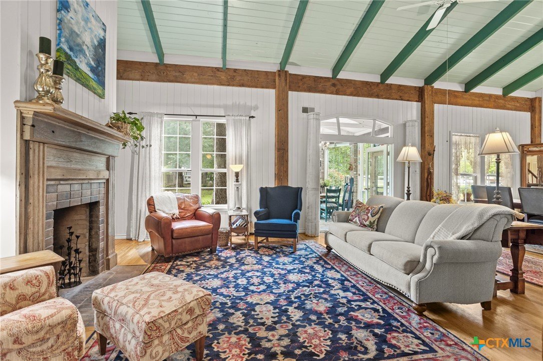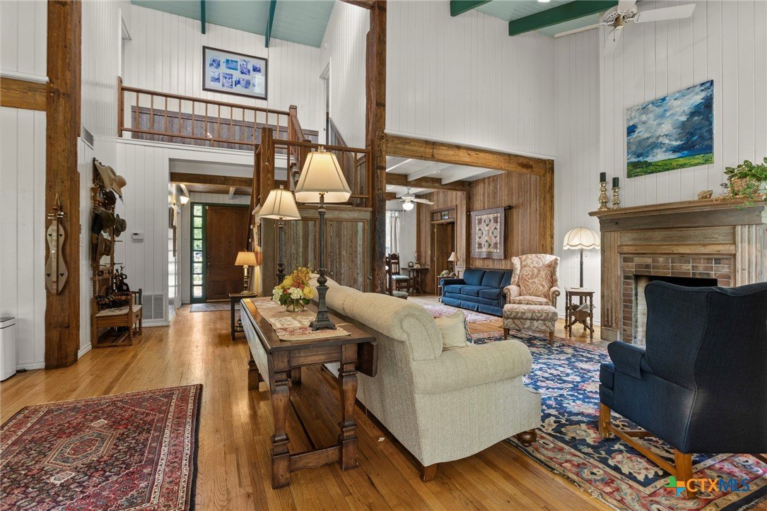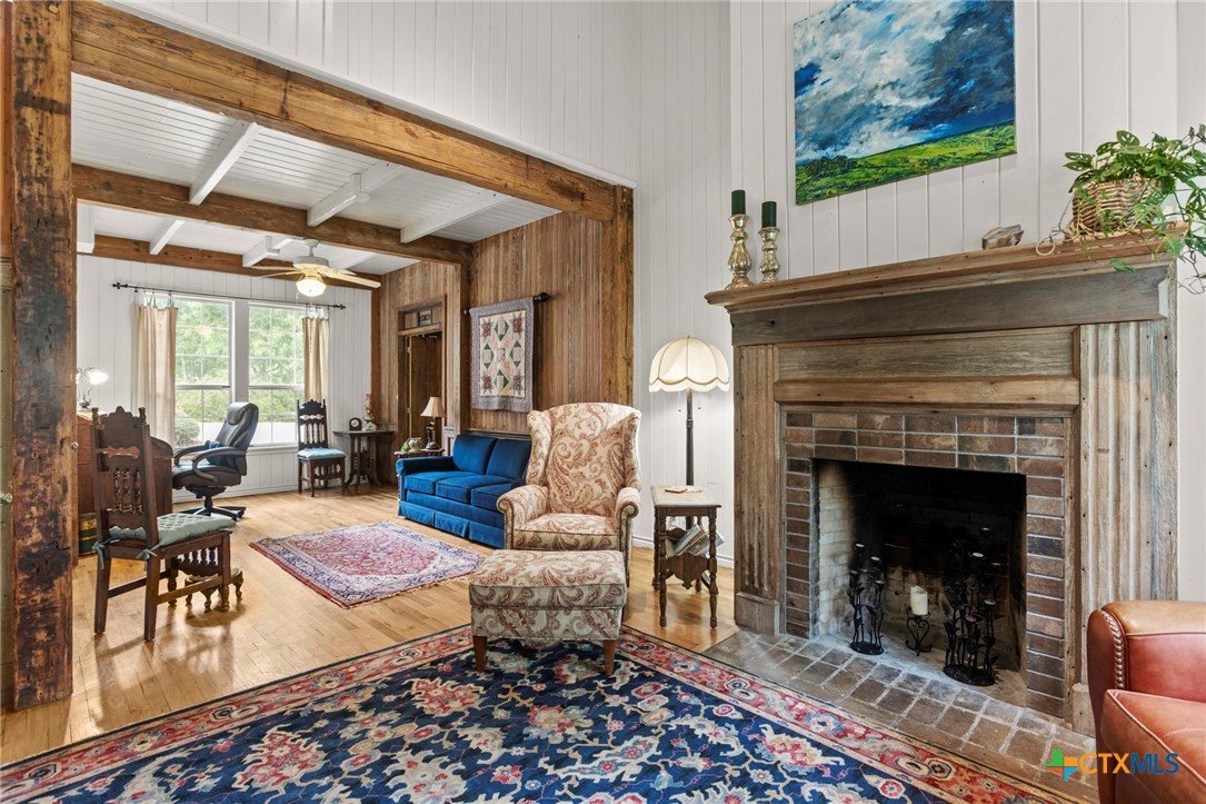 Tucked within a serene, tree-lined cul-de-sac, this timeless New England-style home is a work of art—crafted with care, rooted in heritage, and wrapped in quiet elegance, built by the renowned architect, Darwin Britt for his family home. Just a short stroll from the heart of historic downtown Salado, you’ll find yourself moments from a 27-hole Robert Trent Jones golf course, destination dining, boutique shops, local breweries, art galleries, and the beauty of Pace Park and Salado Creek. Originally constructed in 1982, the home has grown with grace—expanded thoughtfully to include two luxurious primary suites that reflect the original post-and-beam architecture. Huge reclaimed longleaf pine beams, once part of 1920’s railroad trestles, stretch across the ceilings, joined by traditional wooden pegs, grounding the home in Texas history and craftsmanship. Step through the front entry door from Texas' oldest continuously operating college and into the warmth and texture of rustic wood floors and walls, repurposed from a 19th-century gymnasium. The open living and dining rooms embrace a sculptural central staircase and anchored by a stately Count Rumford fireplace, blending beauty with utility. One wing offers a secondary suite with fireplace, clawfoot tub, and French doors that open to the backyard. Across the home, the secluded primary suite invites you down a window-lined gallery, revealing a private retreat with soaking tub, dual vanities, two walk-in closets, and a spacious shower. Upstairs, two charming bedrooms share a Jack and Jill bath and a quiet sitting nook—ideal for guests, or creative space. This is a home for those who appreciate the poetry of place. A place where history lives in the grain of wood, where design whispers rather than shouts, and where mornings can begin with a walk to the café and evenings with nearby live music. Use as a full-time haven or weekend escape. This Texas home is built above the flood plain, with no flood insurance requirement.