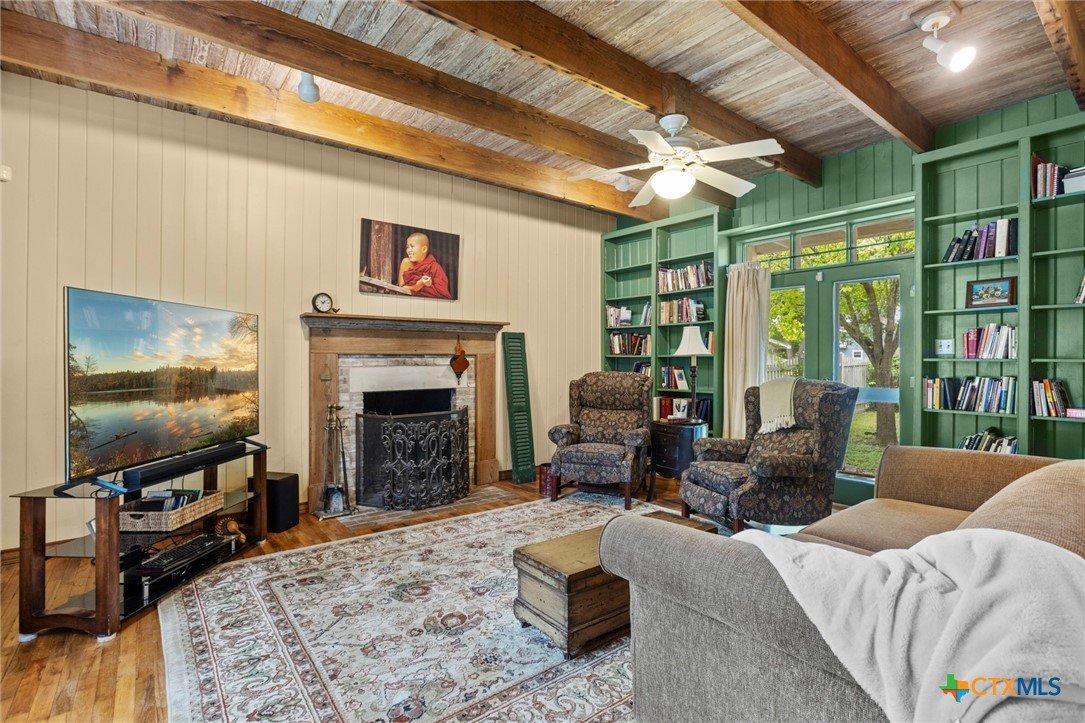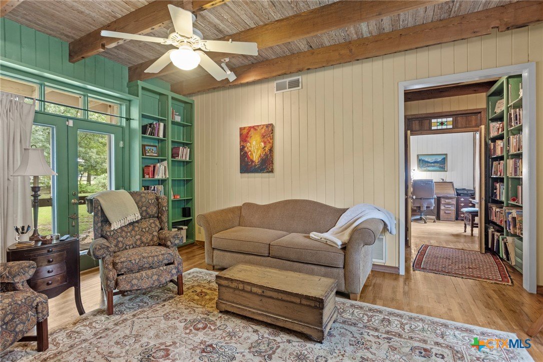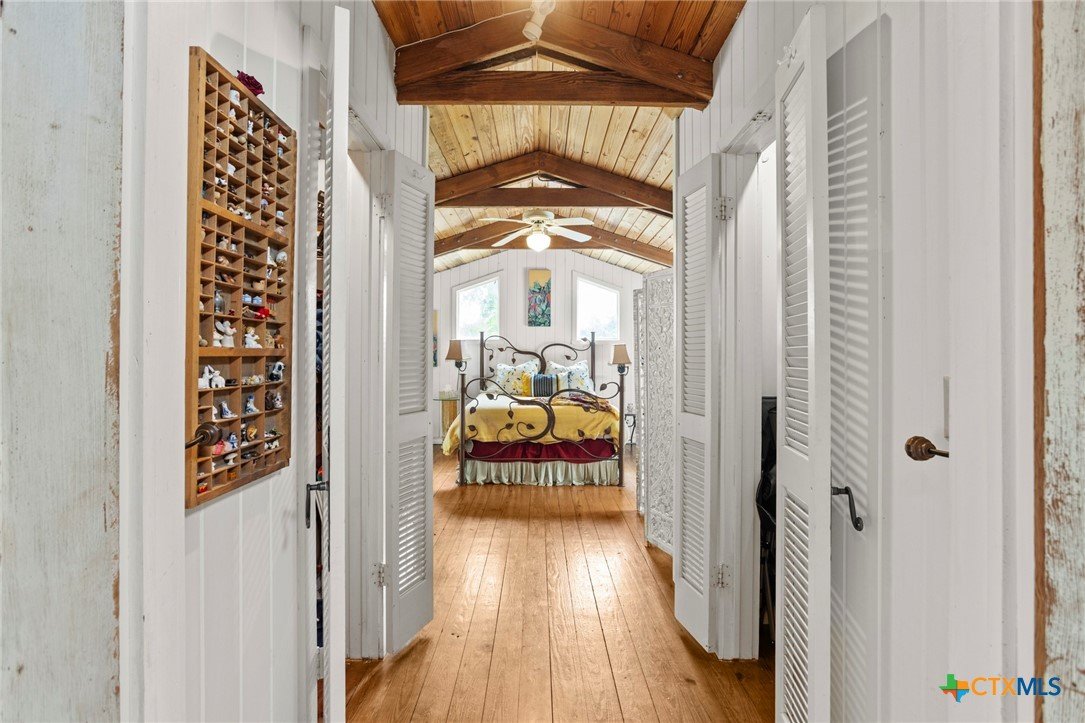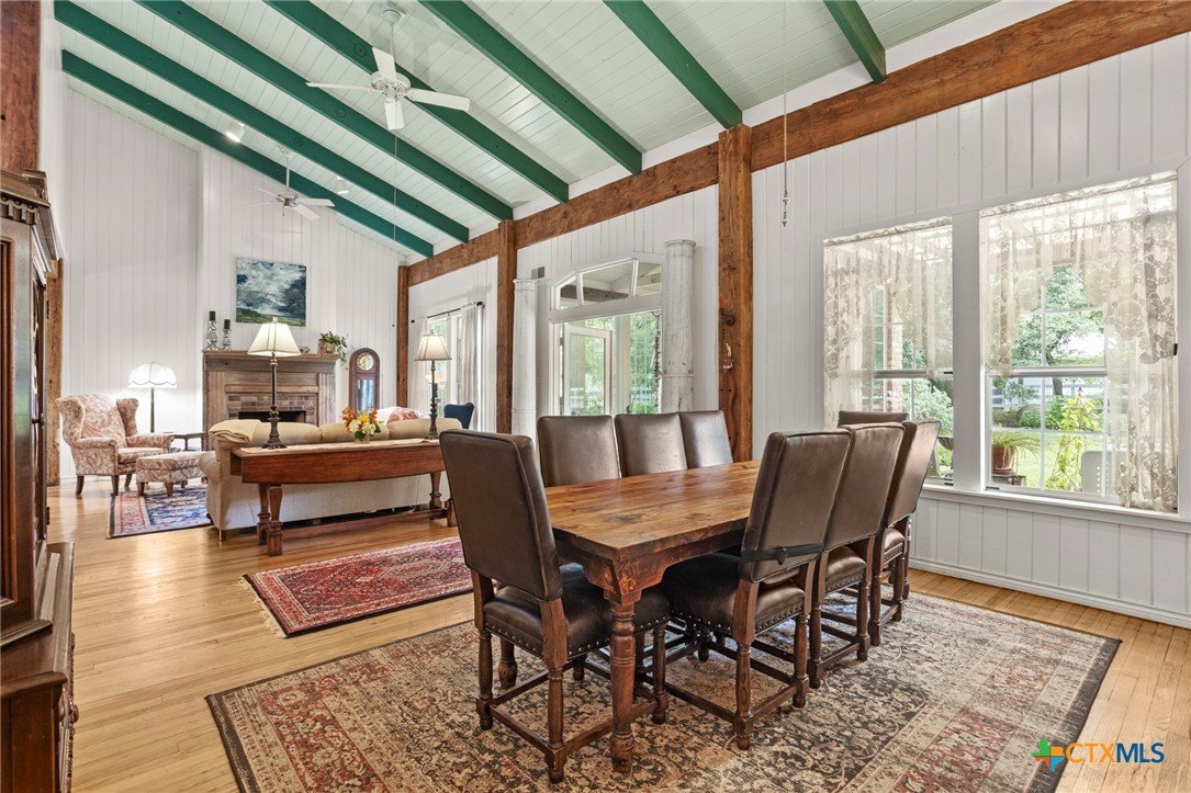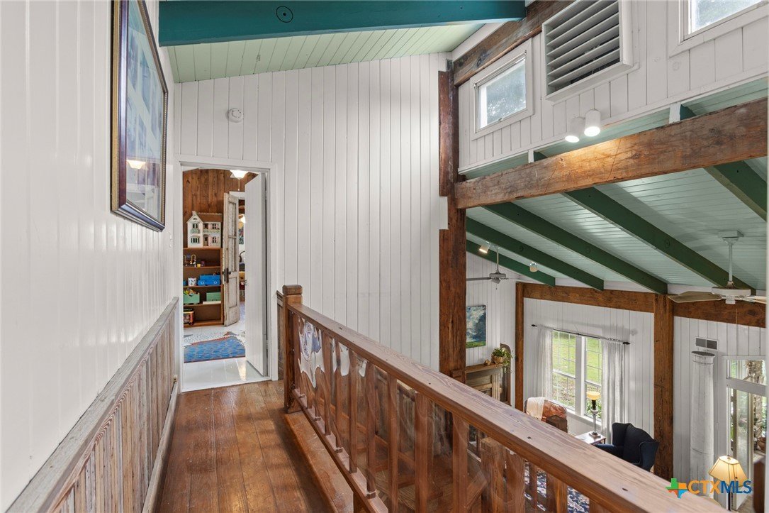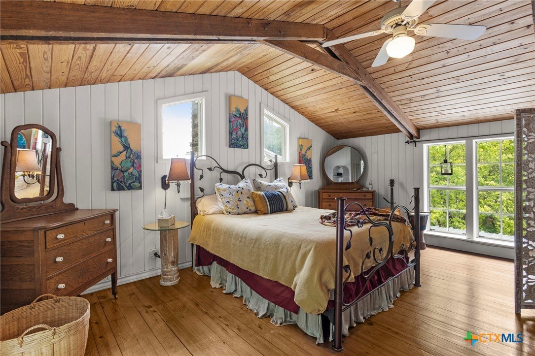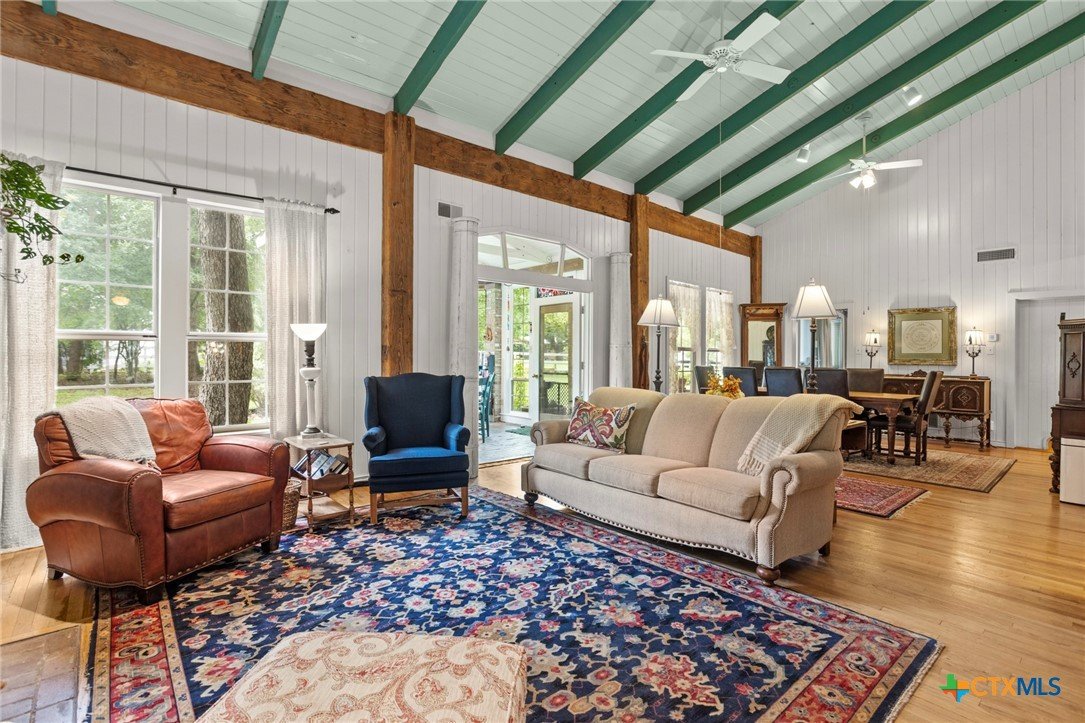 Tucked within a serene, tree-lined cul-de-sac, this timeless New England-style home is a work of art—crafted with care, rooted in heritage, and wrapped in quiet elegance, built by the renowned architect, Darwin Britt for his family home. Just a short stroll from the heart of historic downtown Salado, you’ll find yourself moments from a 27-hole Robert Trent Jones golf course, destination dining, boutique shops, local breweries, art galleries, and the beauty of Pace Park and Salado Creek. Originally constructed in 1982, the home has grown with grace—expanded thoughtfully to include two luxurious primary suites that reflect the original post-and-beam architecture. Huge reclaimed longleaf pine beams, once part of 1920’s railroad trestles, stretch across the ceilings, joined by traditional wooden pegs, grounding the home in Texas history and craftsmanship. Step through the front entry door from Texas' oldest continuously operating college and into the warmth and texture of rustic wood floors and walls, repurposed from a 19th-century gymnasium. The open living and dining rooms embrace a sculptural central staircase and anchored by a stately Count Rumford fireplace, blending beauty with utility. One wing offers a secondary suite with fireplace, clawfoot tub, and French doors that open to the backyard. Across the home, the secluded primary suite invites you down a window-lined gallery, revealing a private retreat with soaking tub, dual vanities, two walk-in closets, and a spacious shower. Upstairs, two charming bedrooms share a Jack and Jill bath and a quiet sitting nook—ideal for guests, or creative space. This is a home for those who appreciate the poetry of place. A place where history lives in the grain of wood, where design whispers rather than shouts, and where mornings can begin with a walk to the café and evenings with nearby live music. Use as a full-time haven or weekend escape. This Texas home is built above the flood plain, with no flood insurance requirement.