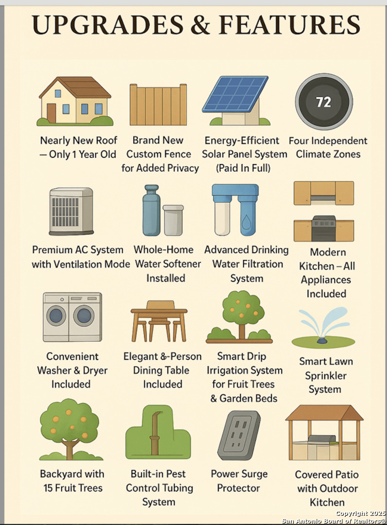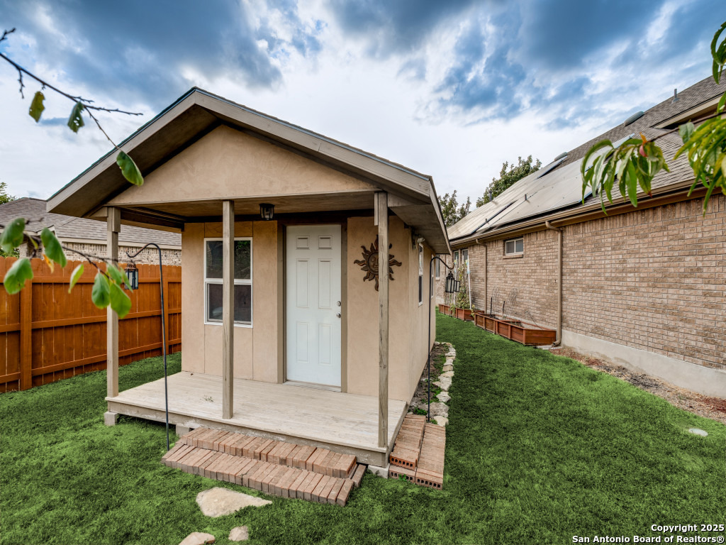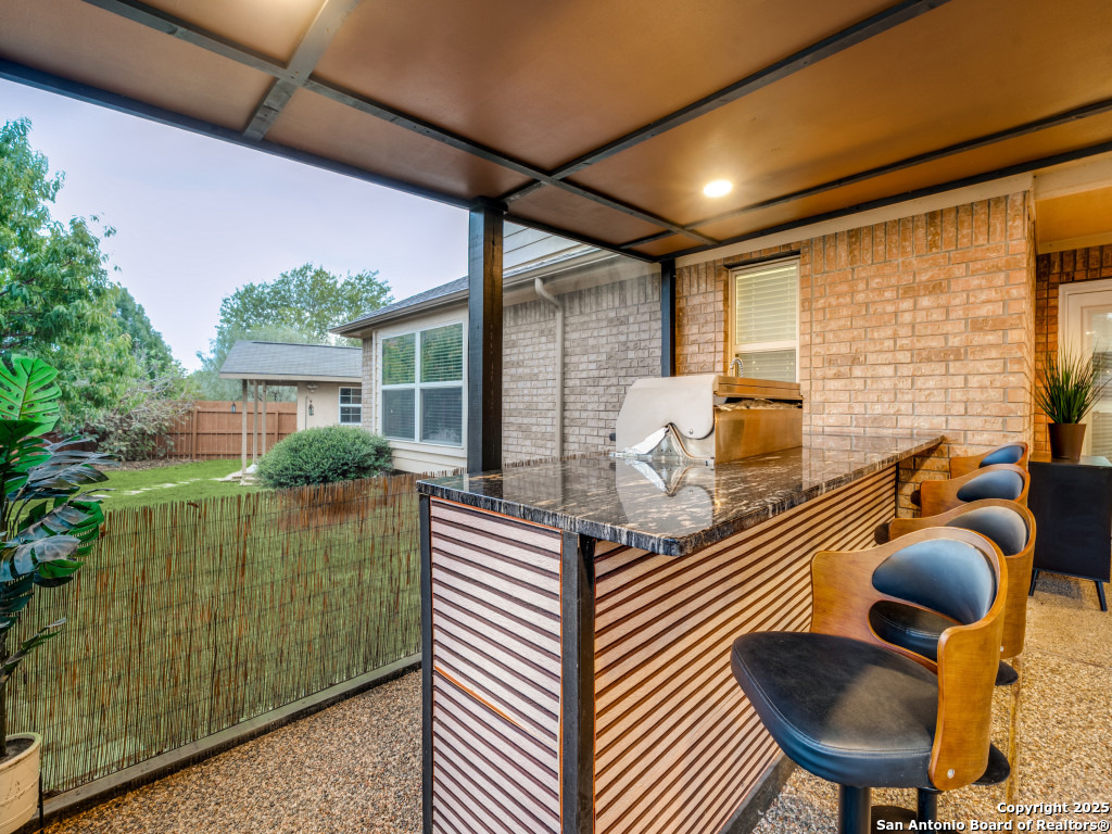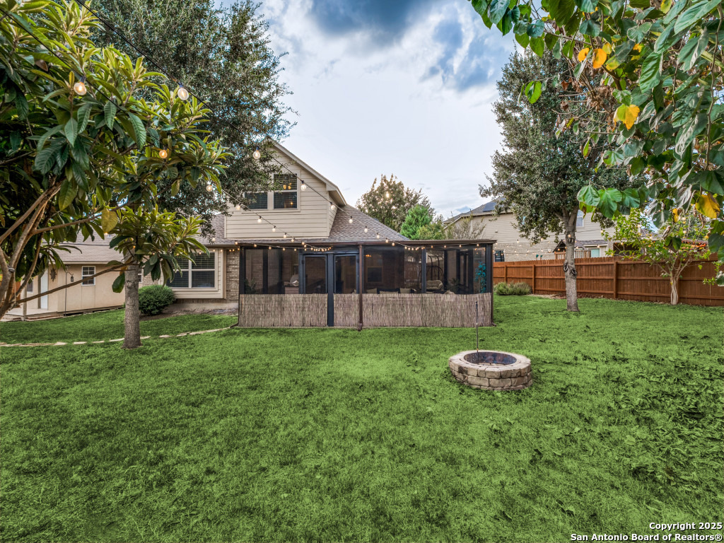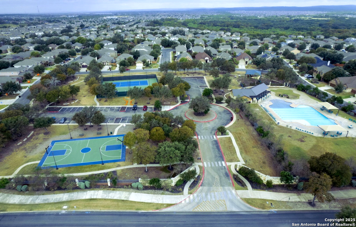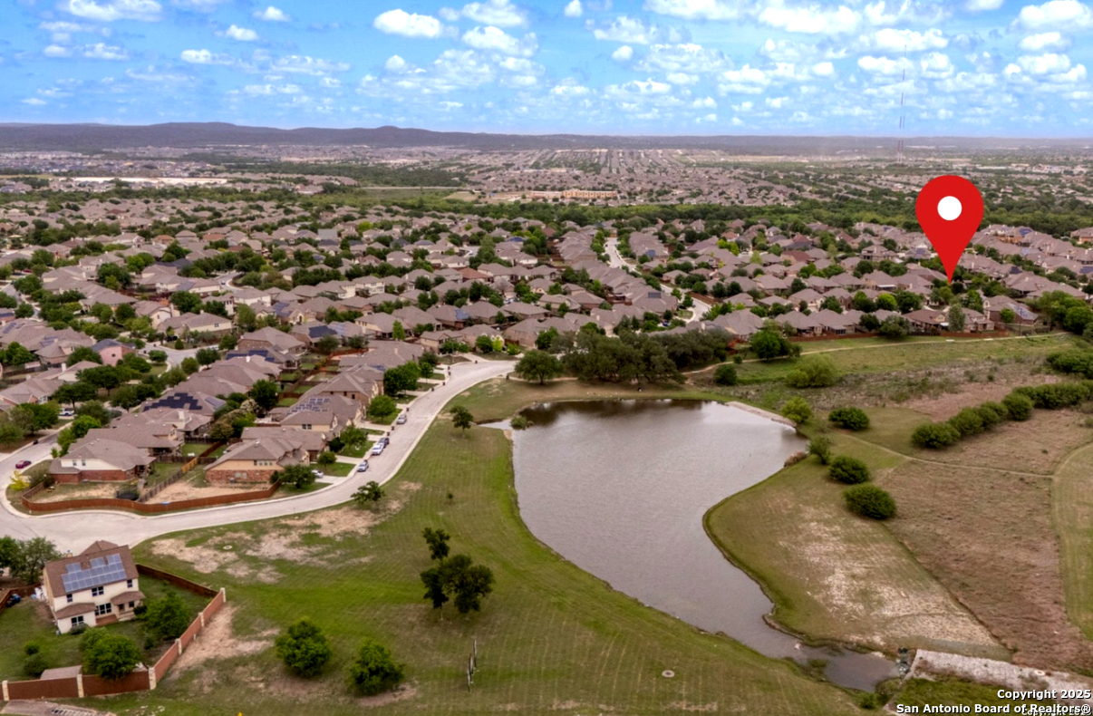 Welcome home to this charming brick residence nestled in the desirable Stillwater Ranch community of San Antonio. Designed for comfort and modern living, this beautifully maintained single-story offers a spacious open floor plan filled with natural light, high ceilings, elegant arched entryways, and stylish stone tile flooring throughout. The inviting island kitchen is perfect for both everyday living and entertaining, featuring granite countertops, 42-inch cabinetry, gas cooking, and seamless access to both covered and open-air patios - ideal for dining al fresco or relaxing outdoors. Unwind in the private owner's suite complete with a large, spa-like shower, while two additional bedrooms and a dedicated home office provide space and flexibility for today's lifestyle. An upstairs bonus room with half bath adds even more versatility - perfect for a media room, game room, or guest retreat. Step outside to enjoy an expansive backyard featuring a cozy fire pit and a spacious storage shed, ideal for a workshop, hobby space, or personalized "She Shed"/"Man Cave." This home also offers energy-efficient ** SOLAR Panels and smart home upgrades, providing comfort, convenience, and long-term savings. Experience the best of Stillwater Ranch - where community amenities, top-rated schools, and easy access to shopping, dining, and major highways come together for exceptional San Antonio living.
