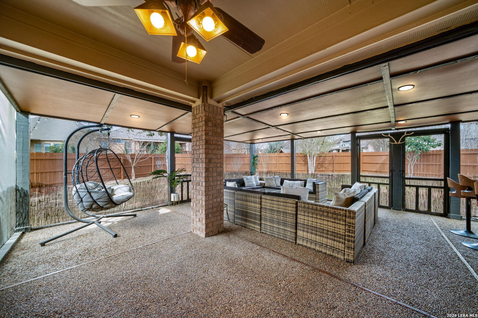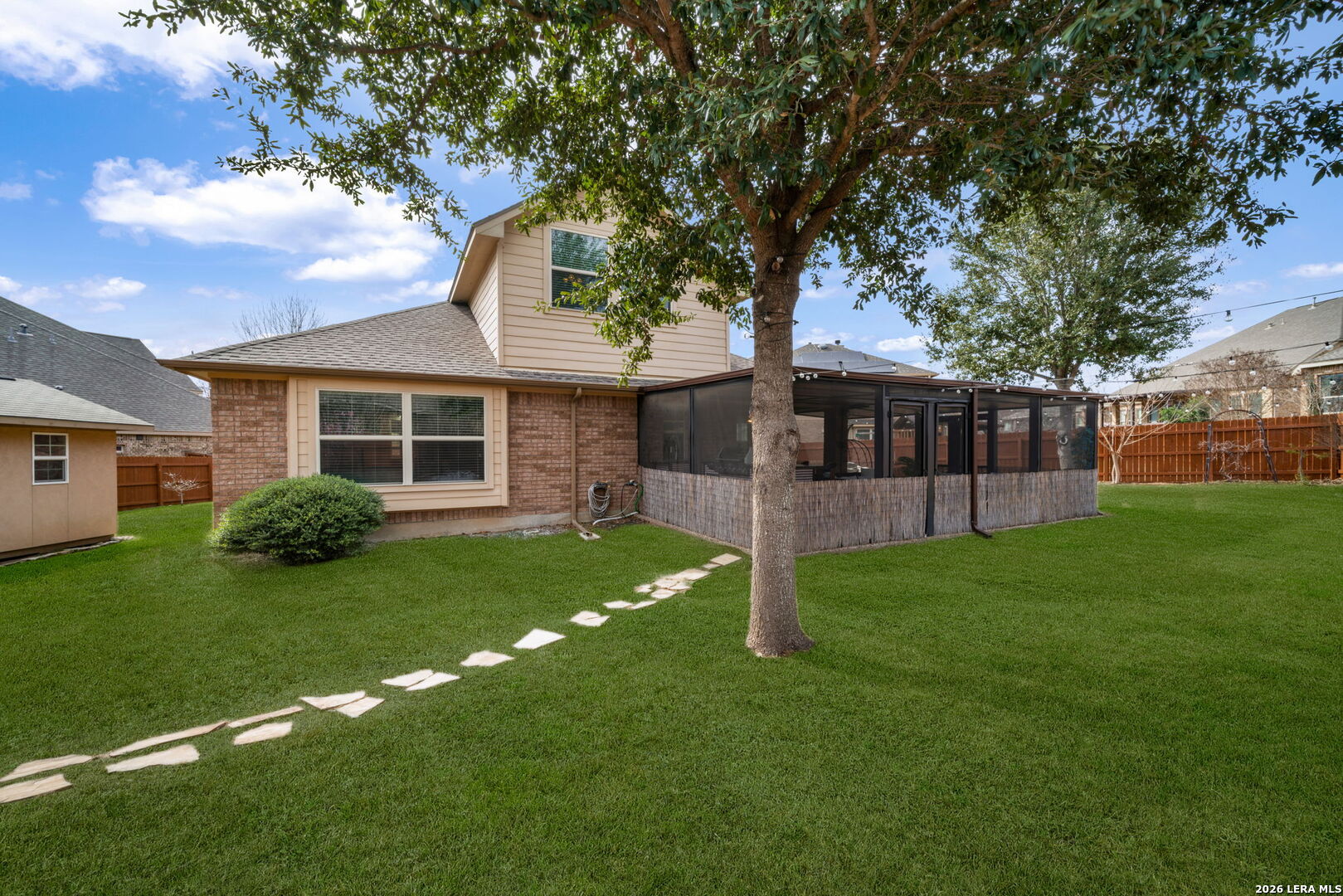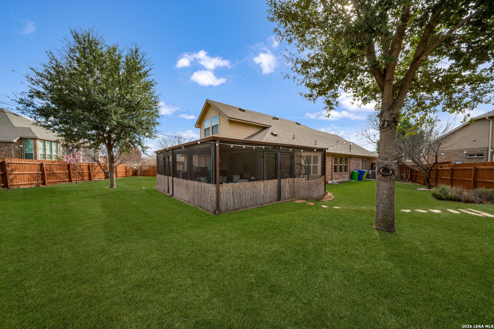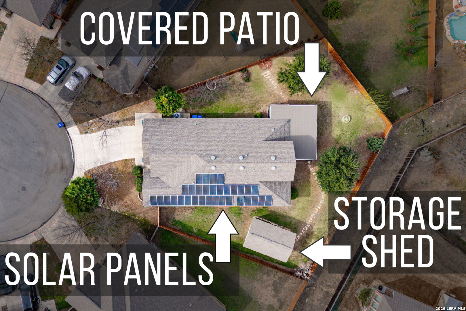 Energy savings and exceptional outdoor living set this extensively upgraded one-and-a-half-story home apart, situated on a premium .25-acre cul-de-sac lot offering a massive backyard and a huge fully screened and covered patio designed for year-round enjoyment. The outdoor living space is an entertainer's dream, complete with a built-in bar, granite countertops, sink, grill, and mini-fridge, plus mature trees and a fire pit creating a private retreat. Solar panels provide impressively low electric bills, complemented by a 4-zone AC system for precise temperature control, Nest thermostats, smart garage opener, smart sprinkler system, LED lighting, water softener, reverse osmosis, and in-wall pest control. Inside, all bedrooms, office, and main living areas are located on the first level, with a spacious bonus room and half bath upstairs. The open floor plan features high ceilings, abundant natural light, stone tile and luxury vinyl flooring, and a spacious island kitchen with granite countertops, 42" cabinetry, gas cooking, and generous storage. INCLUDES: REFRIGERATOR, WASHER & DRYER. The private owner's suite offers a window seat, dual vanities, large shower, and two walk-in closets. A 12x20 stucco workshop with electric adds valuable flex space for hobbies or storage. Located just feet from the neighborhood pond and miles of walking trails, this home blends efficiency, functionality, and lifestyle in one standout package.