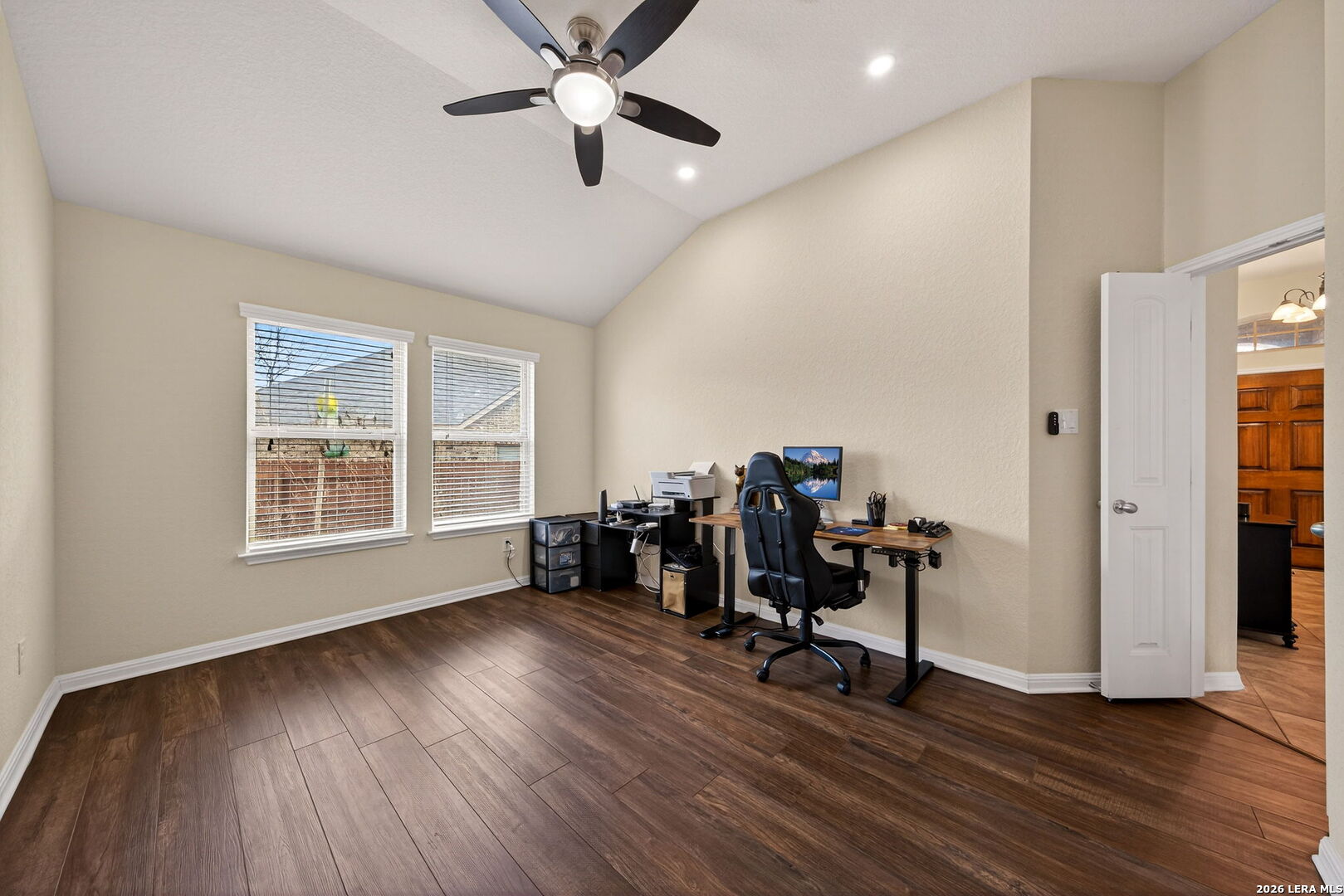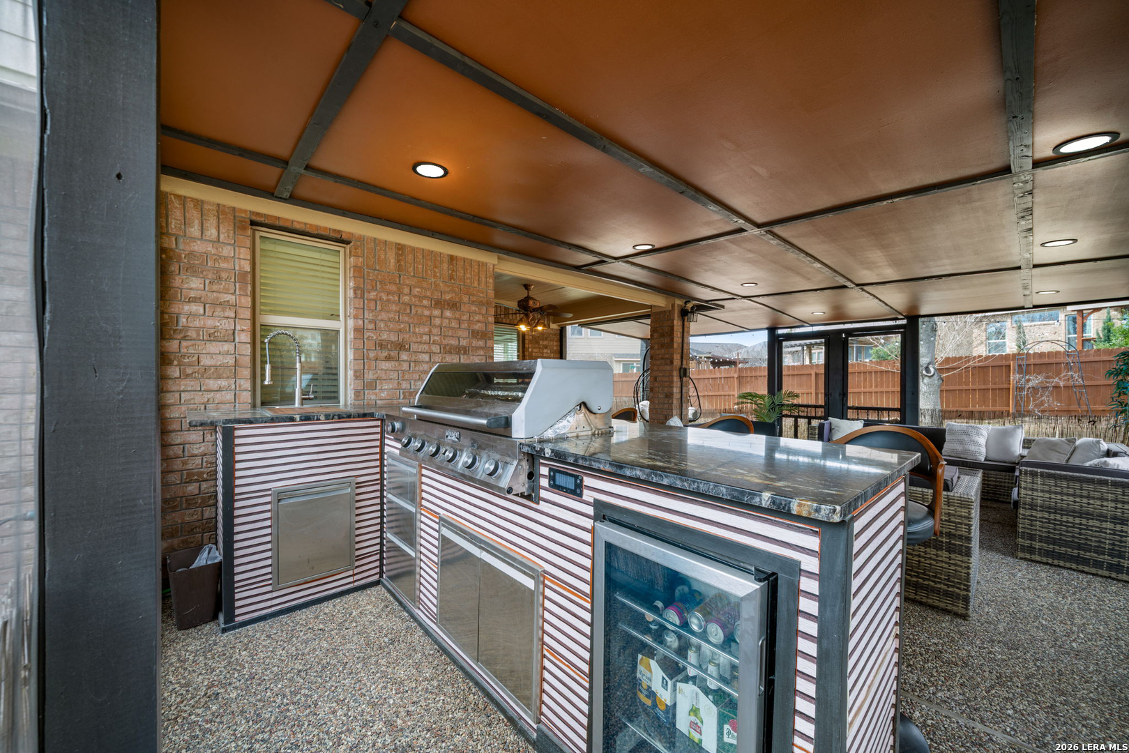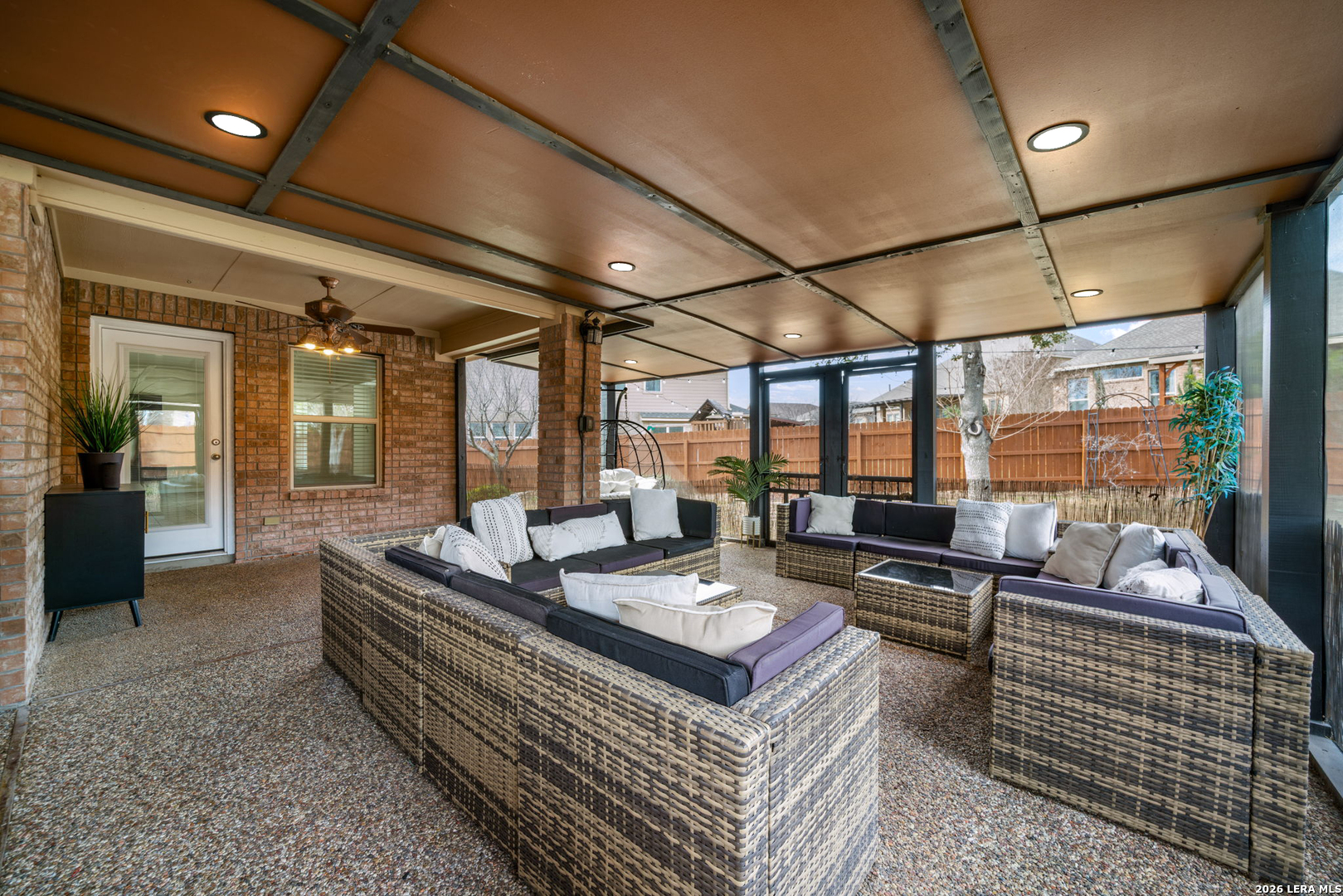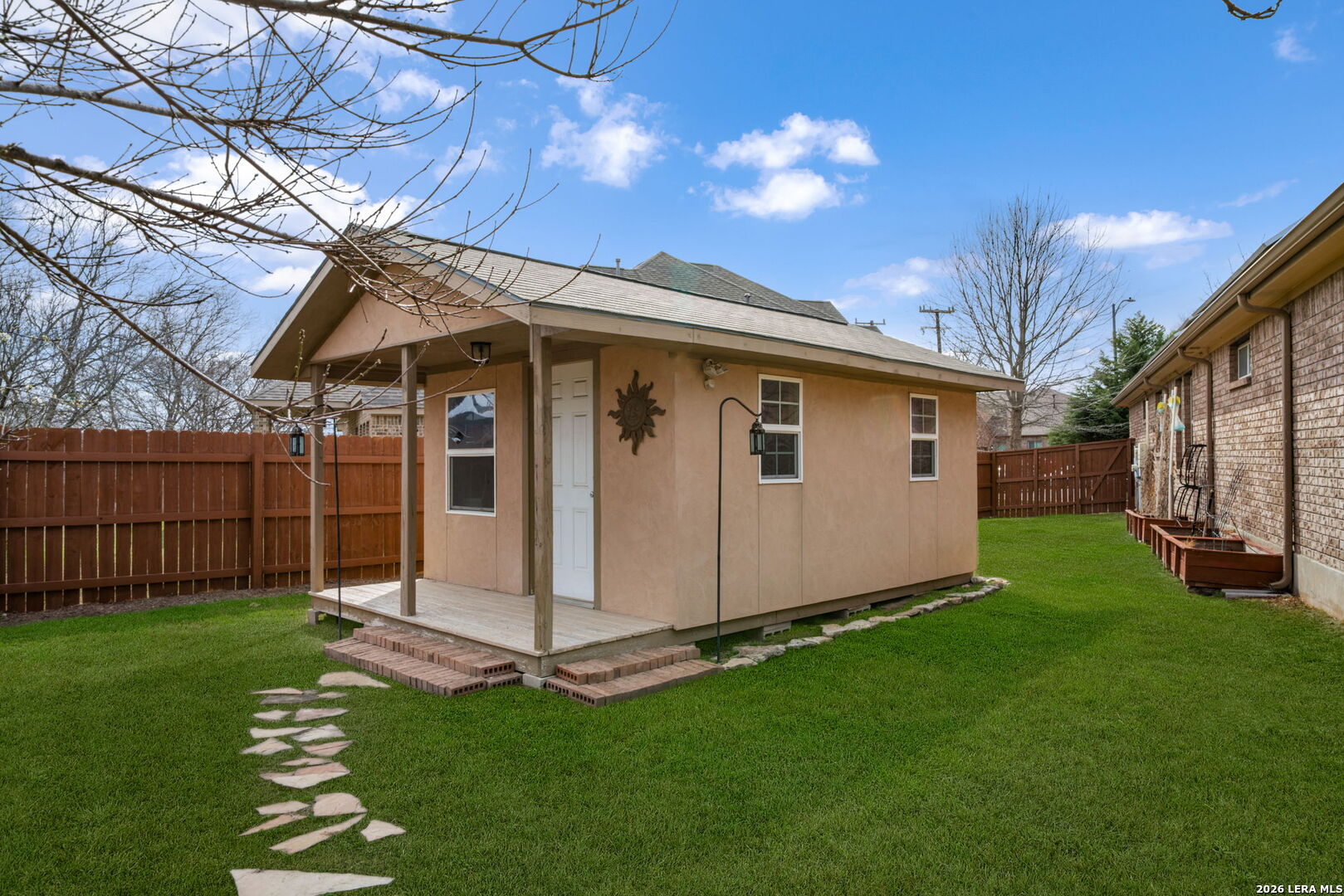 Energy savings and exceptional outdoor living set this extensively upgraded one-and-a-half-story home apart, situated on a premium .25-acre cul-de-sac lot offering a massive backyard and a huge fully screened and covered patio designed for year-round enjoyment. The outdoor living space is an entertainer's dream, complete with a built-in bar, granite countertops, sink, grill, and mini-fridge, plus mature trees and a fire pit creating a private retreat. Solar panels provide impressively low electric bills, complemented by a 4-zone AC system for precise temperature control, Nest thermostats, smart garage opener, smart sprinkler system, LED lighting, water softener, reverse osmosis, and in-wall pest control. Inside, all bedrooms, office, and main living areas are located on the first level, with a spacious bonus room and half bath upstairs. The open floor plan features high ceilings, abundant natural light, stone tile and luxury vinyl flooring, and a spacious island kitchen with granite countertops, 42" cabinetry, gas cooking, and generous storage. INCLUDES: REFRIGERATOR, WASHER & DRYER. The private owner's suite offers a window seat, dual vanities, large shower, and two walk-in closets. A 12x20 stucco workshop with electric adds valuable flex space for hobbies or storage. Located just feet from the neighborhood pond and miles of walking trails, this home blends efficiency, functionality, and lifestyle in one standout package.