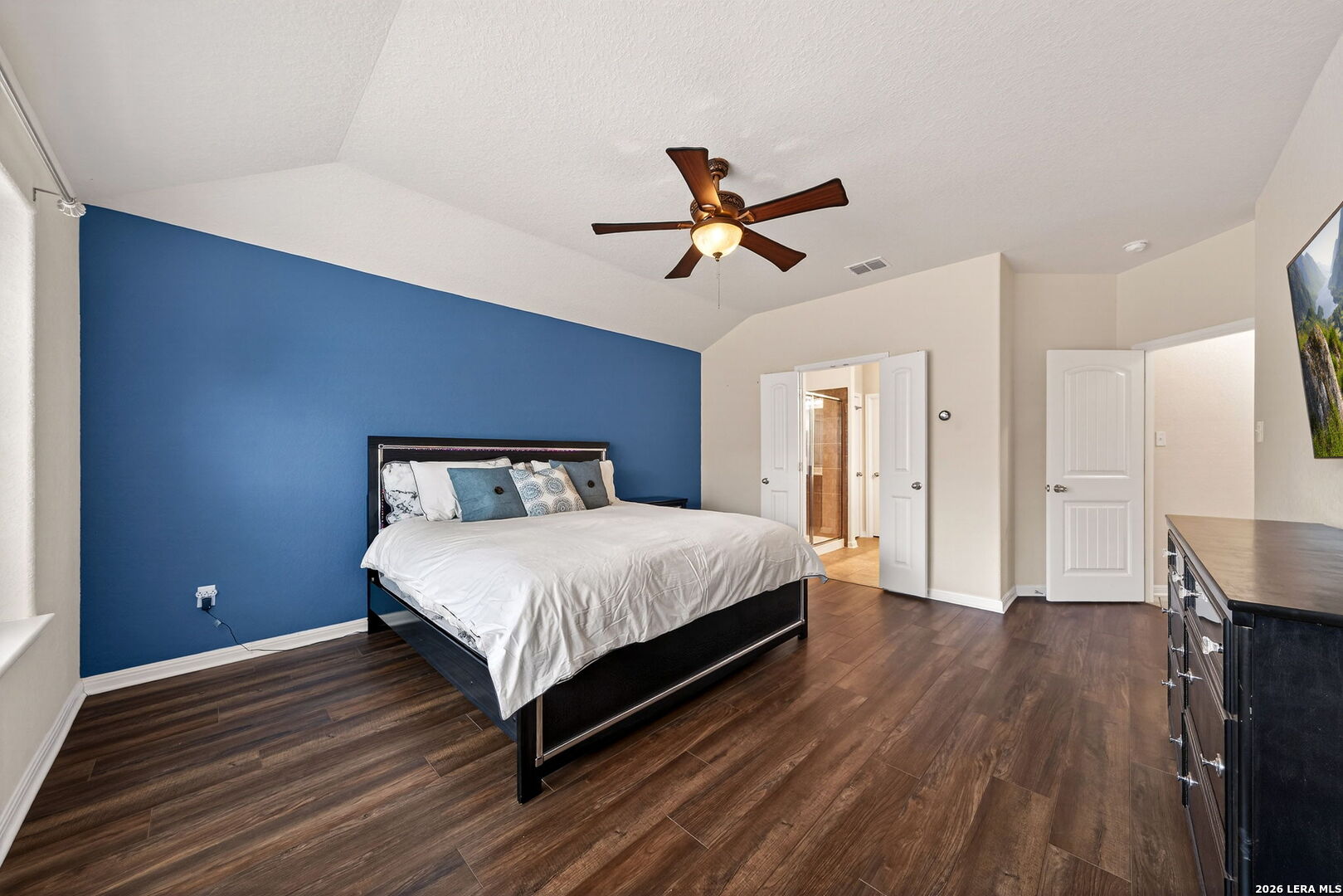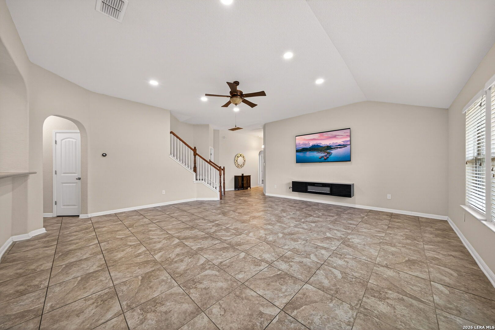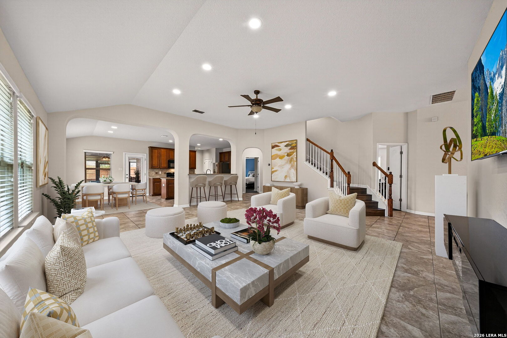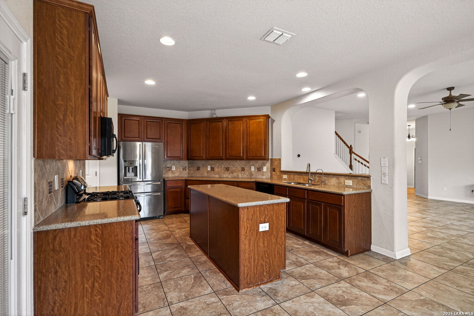 Energy savings and exceptional outdoor living set this extensively upgraded one-and-a-half-story home apart, situated on a premium .25-acre cul-de-sac lot offering a massive backyard and a huge fully screened and covered patio designed for year-round enjoyment. The outdoor living space is an entertainer's dream, complete with a built-in bar, granite countertops, sink, grill, and mini-fridge, plus mature trees and a fire pit creating a private retreat. Solar panels provide impressively low electric bills, complemented by a 4-zone AC system for precise temperature control, Nest thermostats, smart garage opener, smart sprinkler system, LED lighting, water softener, reverse osmosis, and in-wall pest control. Inside, all bedrooms, office, and main living areas are located on the first level, with a spacious bonus room and half bath upstairs. The open floor plan features high ceilings, abundant natural light, stone tile and luxury vinyl flooring, and a spacious island kitchen with granite countertops, 42" cabinetry, gas cooking, and generous storage. INCLUDES: REFRIGERATOR, WASHER & DRYER. The private owner's suite offers a window seat, dual vanities, large shower, and two walk-in closets. A 12x20 stucco workshop with electric adds valuable flex space for hobbies or storage. Located just feet from the neighborhood pond and miles of walking trails, this home blends efficiency, functionality, and lifestyle in one standout package.