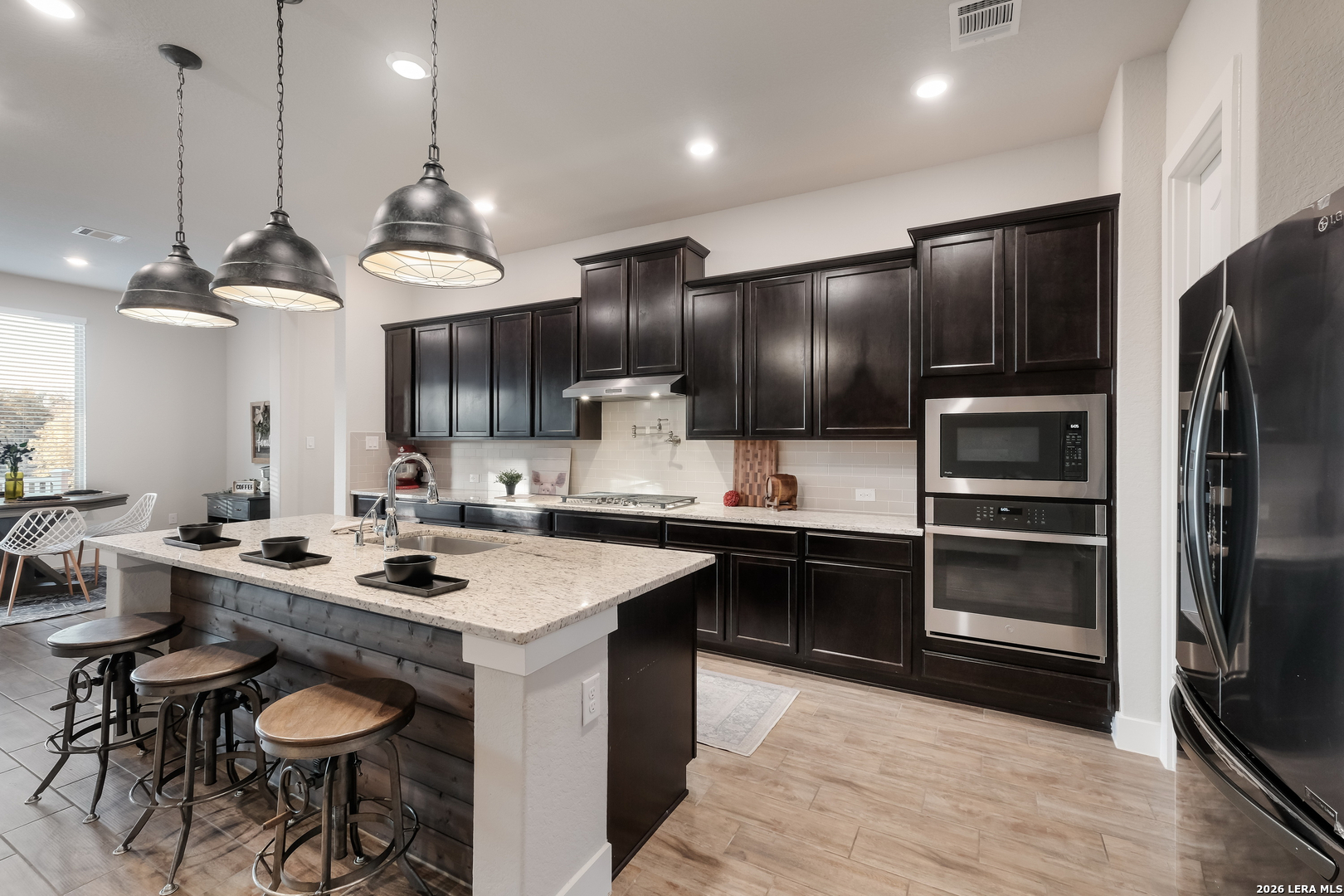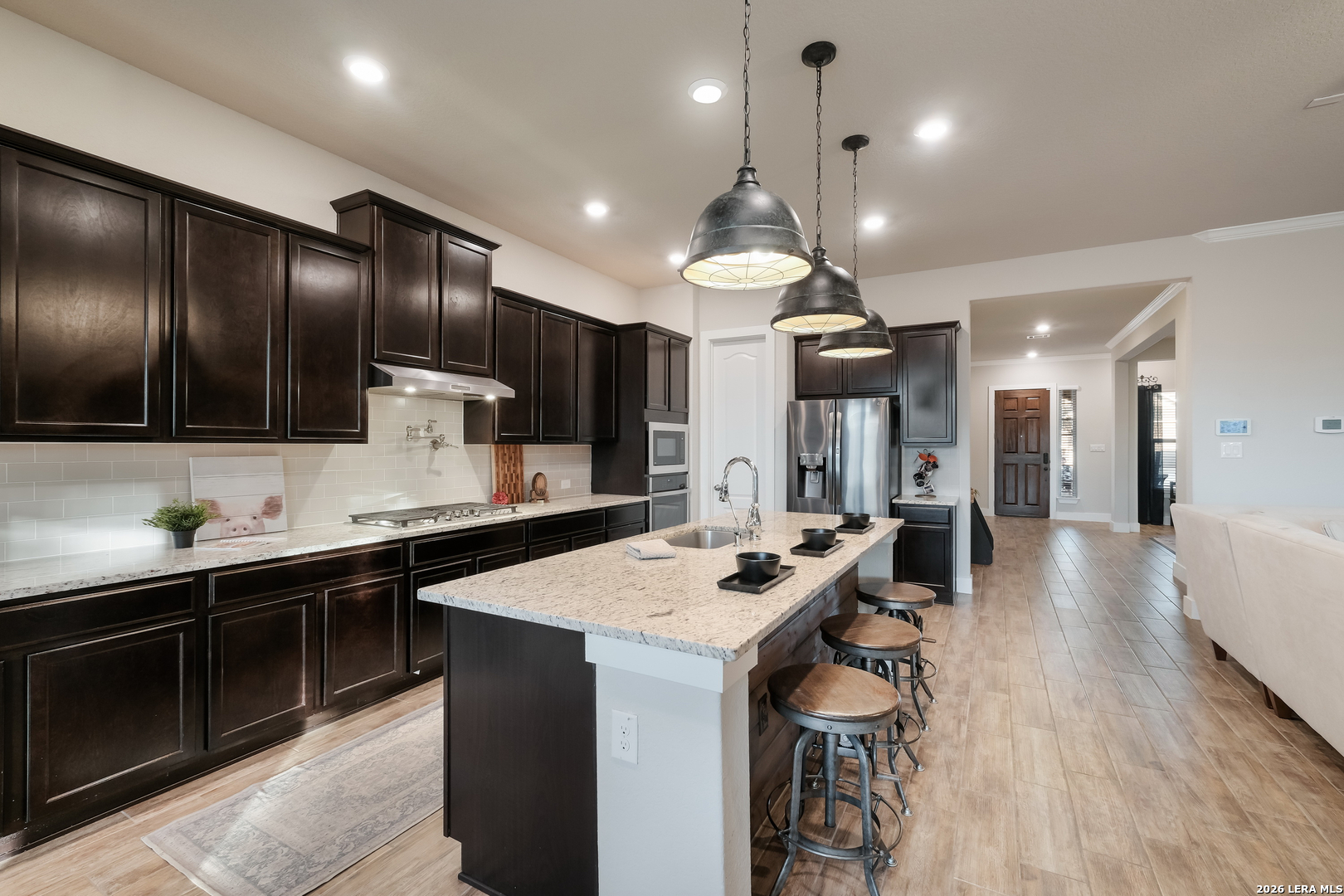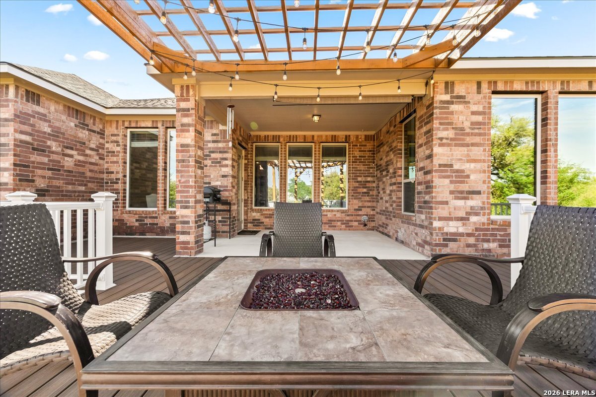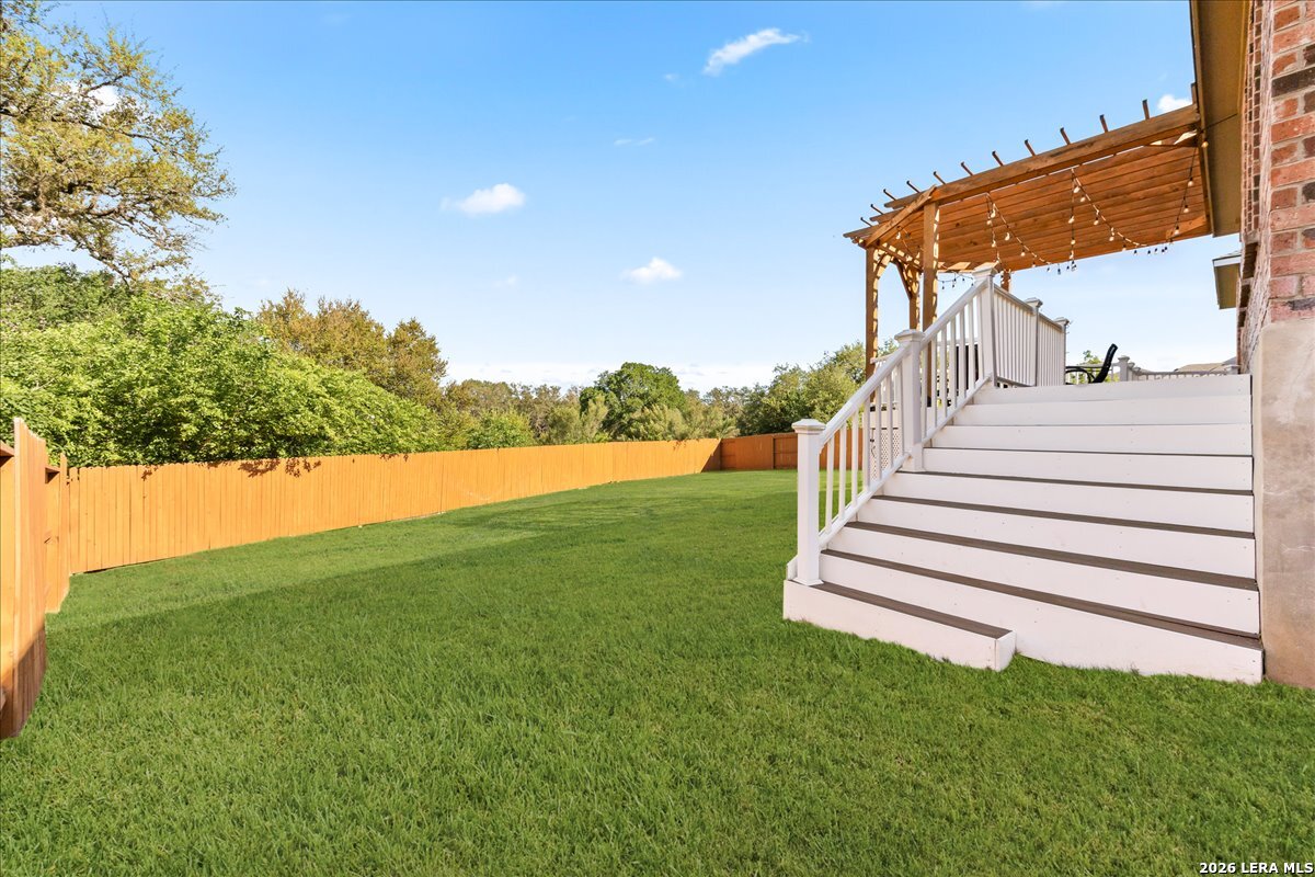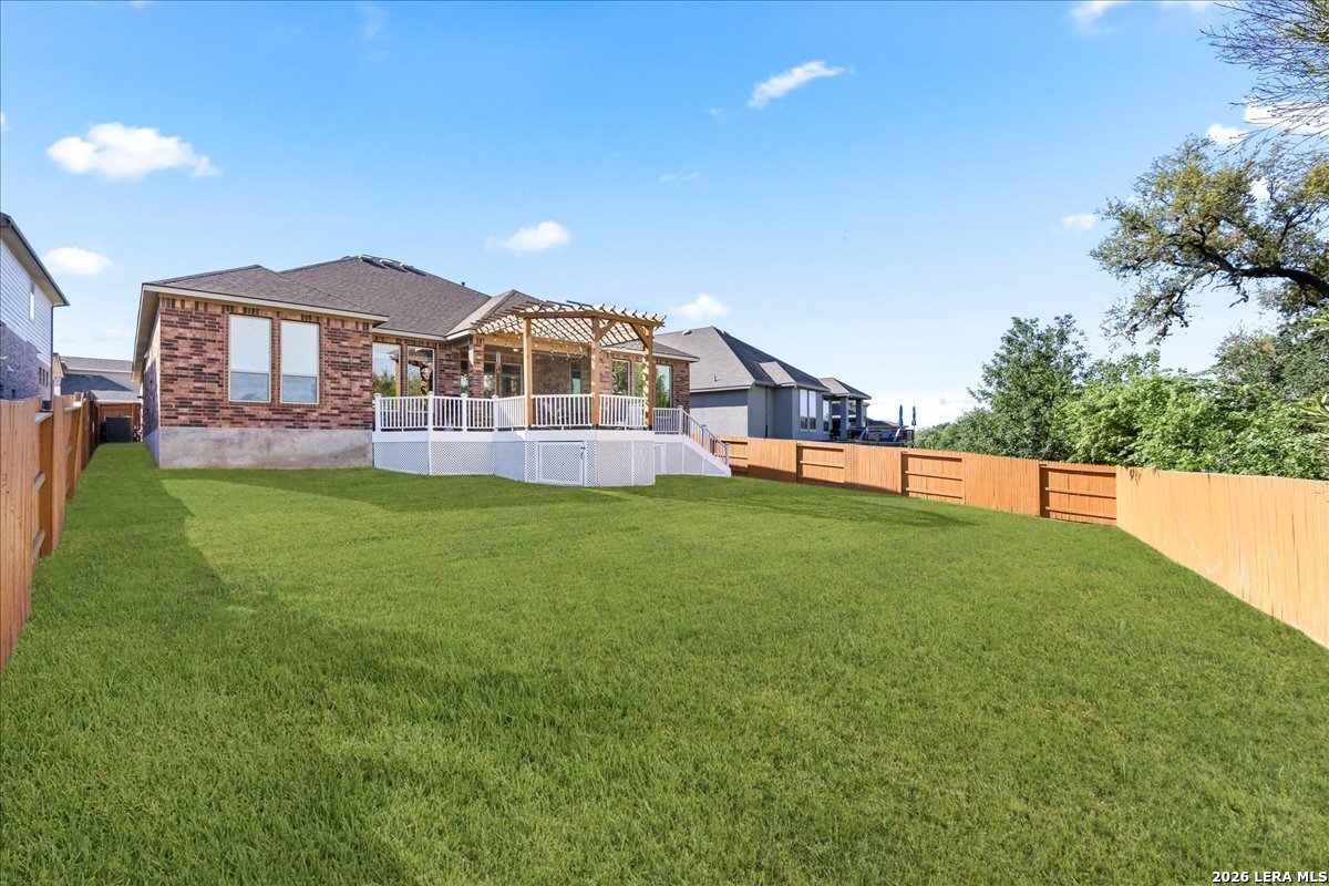 Step into the home of your dreams-a better-than-new, move-in-ready gem perfectly situated on a rare 70' greenbelt lot with NO CITY TAXES! Designed for both everyday living and unforgettable entertaining, this stunning one-story MI Homes Edinburgh floor plan offers an open-concept layout, soaring high ceilings, and abundant natural light throughout. At the heart of the home, the chef's kitchen impresses with an oversized granite island, bar seating, stainless steel appliances, gas cooking, pot filler, subway tile backsplash, and expansive counter space-ideal for hosting and gathering. The versatile open dining area easily doubles as a second living space for added flexibility. Enjoy seamless indoor-outdoor living with an expansive TREX deck (with storage below), covered patio, pergola, and a large, flat backyard backing to a peaceful greenbelt-perfect for entertaining, relaxing, or creating your own private oasis. Retreat to the luxurious primary suite, featuring a spa-like bathroom with dual vanities, quartz countertops, an oversized seamless glass shower, and a spacious walk-in closet. A private front office with glass French doors makes working from home effortless, while the guest suite with ensuite bath offers comfort and privacy. Additional flex space provides endless possibilities, including a home gym, media room, hobby area, or second office. This home is loaded with upgrades, including no carpet throughout, energy-saving 3M window film, surround sound wiring, a water softener, and a tankless water heater. The upgraded landscaping and masonry enhance curb appeal, while overhead garage storage racks add convenience and peace of mind. Why wait for new construction when you can own this practically new, upgraded home on a premium lot-at a fraction of the price? Schedule your showing today-this one won't last!