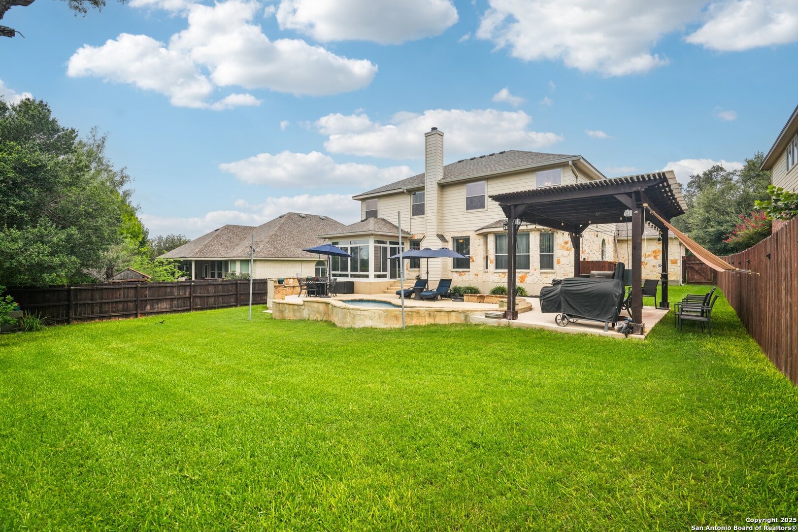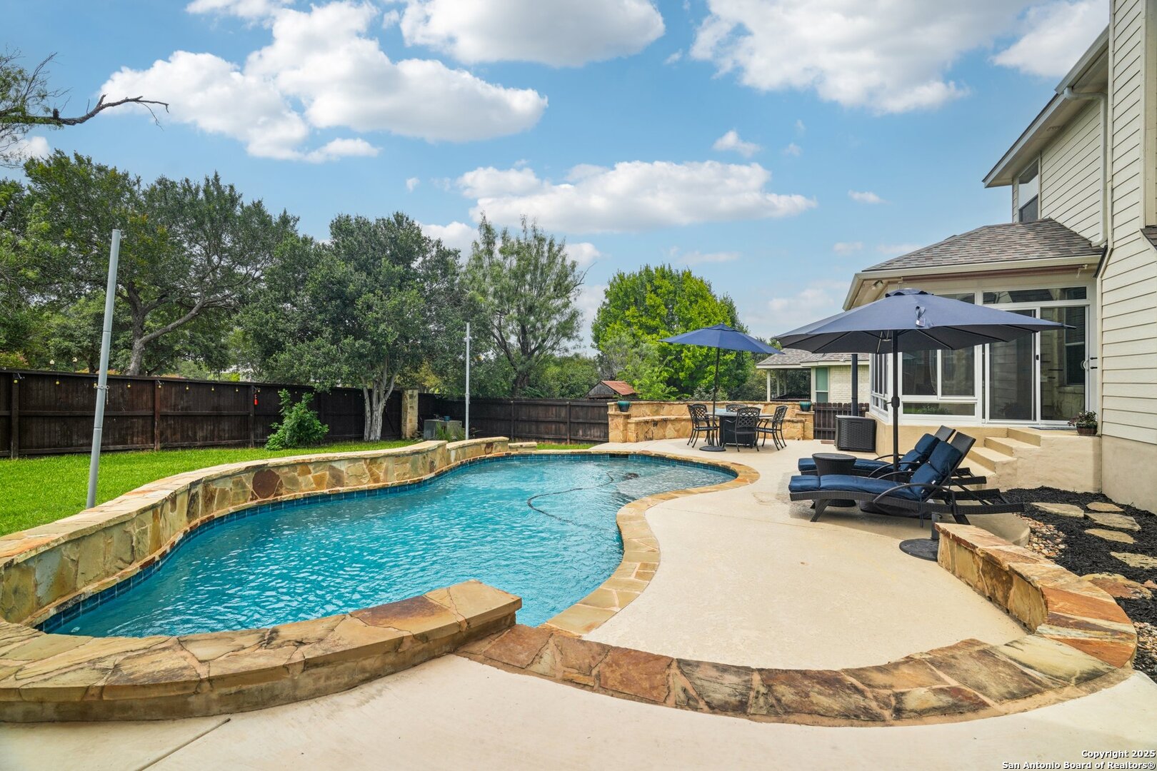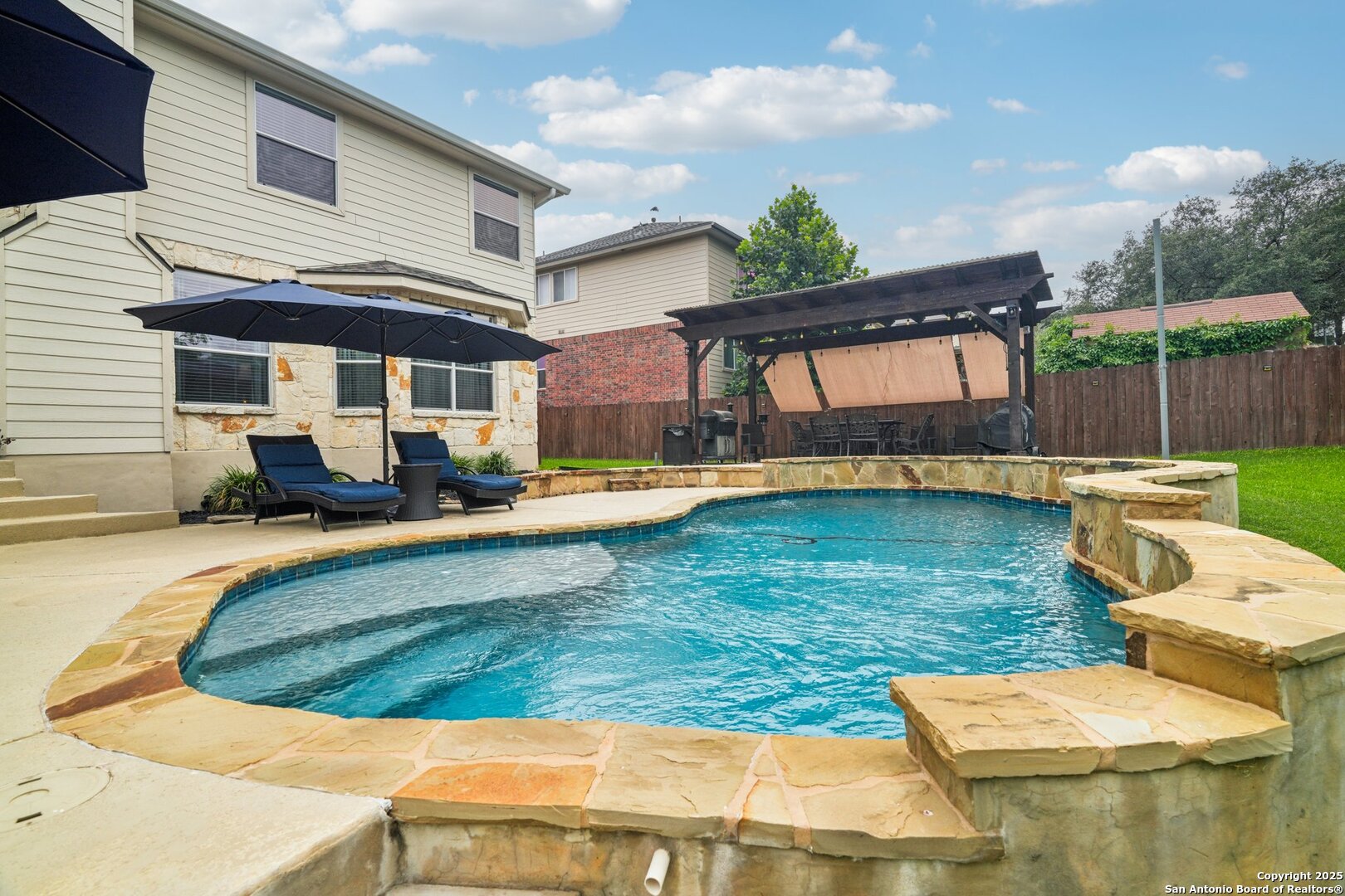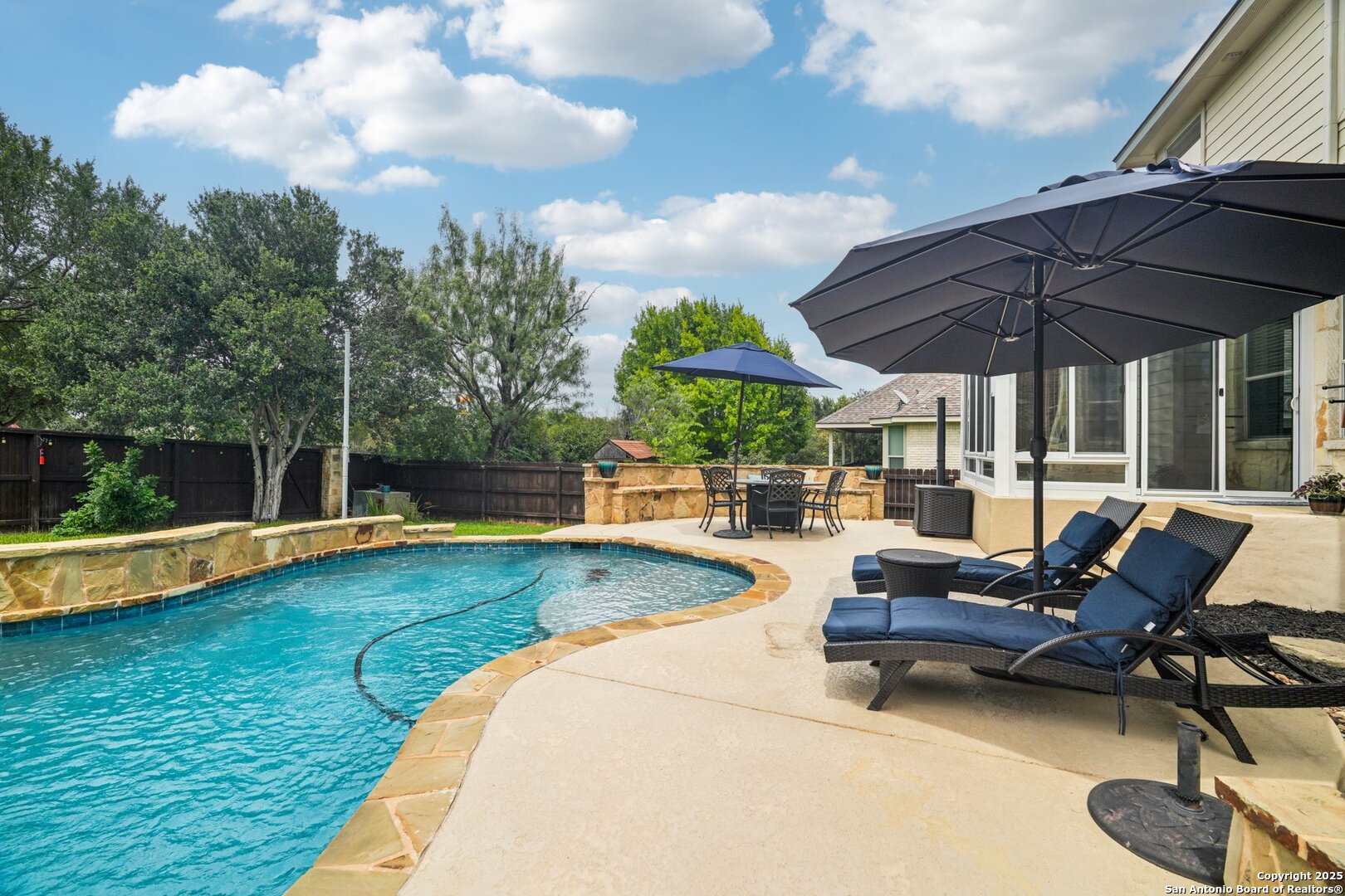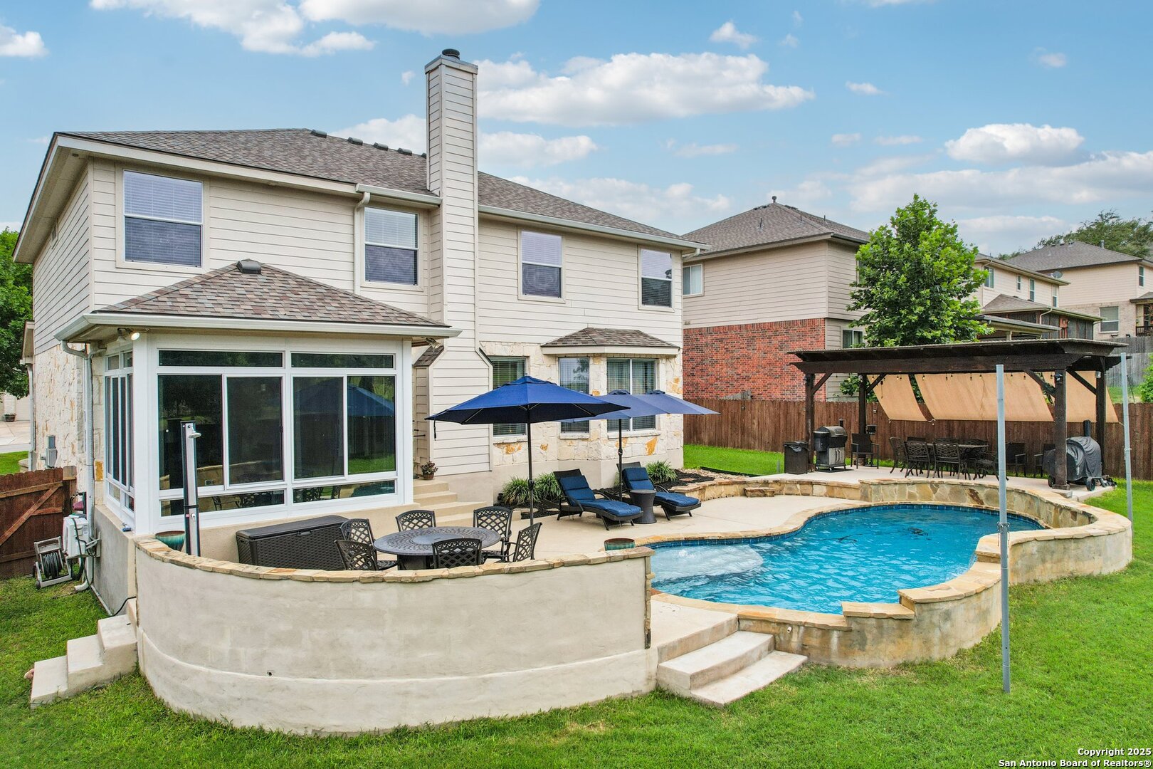 Beautifully appointed 4-bedroom, 4-bathroom residence located in the Alamo Ranch community, complete with a sparkling in-ground pool with tranquil waterfall feature. The expansive layout includes two generous living areas, a formal dining room, and a dedicated study ideal for remote work or quiet retreat. The gourmet kitchen features granite countertops, a gas cooktop, built-in oven and microwave, stainless steel appliances, and a reverse osmosis system. The downstairs primary suite offers a peaceful escape with large windows, a spacious walk-in closet, and a luxurious en-suite bath with dual vanities, a garden tub, and a walk-in shower. Upstairs, all secondary bedrooms provide ample space and include a Jack-and-Jill layout for added convenience. A four-seasons room adds year-round versatility for hobbies or a second office. Outside, enjoy your private oasis with a 22x14 pergola, curved flagstone bench, extended decking, and lush landscaping surrounding the pool-perfect for entertaining or quiet evenings. Additional upgrades include a central vacuum system, 2021 roof with radiant barrier decking, water softener, and a 3-car garage. Residents also enjoy access to the nearby community amenity center with a pool, clubhouse, sports court, and playground.