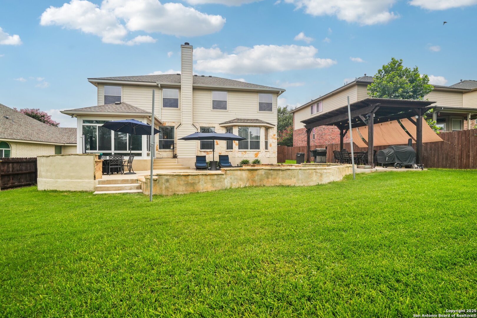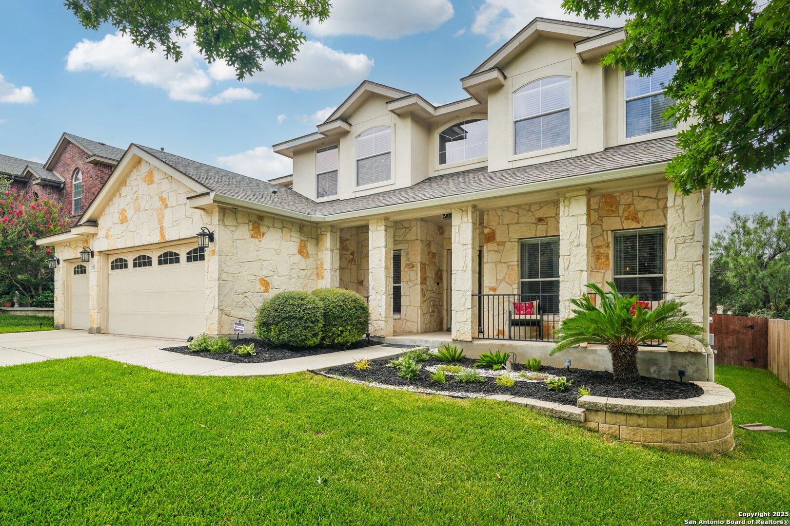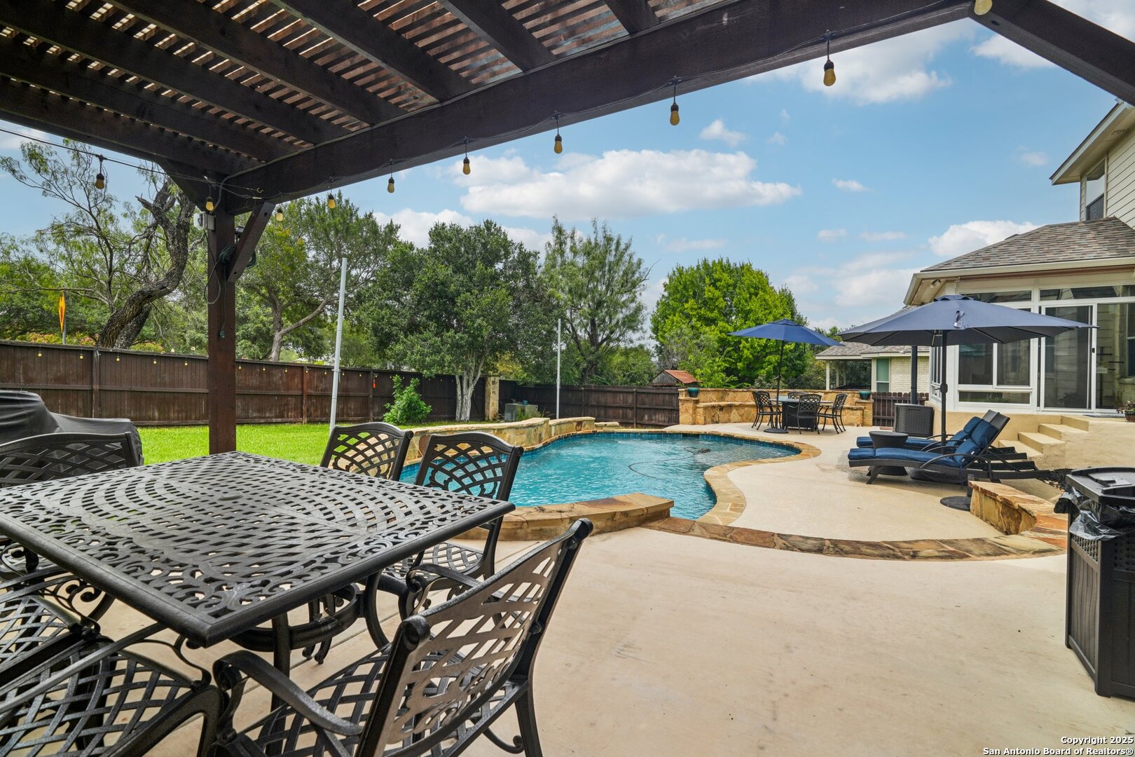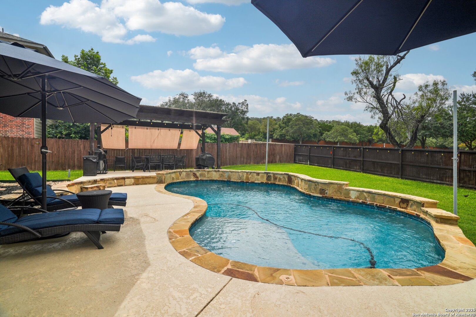 Beautifully appointed 4-bedroom, 4-bathroom residence located in the Alamo Ranch community, complete with a sparkling in-ground pool with tranquil waterfall feature. The expansive layout includes two generous living areas, a formal dining room, and a dedicated study ideal for remote work or quiet retreat. The gourmet kitchen features granite countertops, a gas cooktop, built-in oven and microwave, stainless steel appliances, and a reverse osmosis system. The downstairs primary suite offers a peaceful escape with large windows, a spacious walk-in closet, and a luxurious en-suite bath with dual vanities, a garden tub, and a walk-in shower. Upstairs, all secondary bedrooms provide ample space and include a Jack-and-Jill layout for added convenience. A four-seasons room adds year-round versatility for hobbies or a second office. Outside, enjoy your private oasis with a 22x14 pergola, curved flagstone bench, extended decking, and lush landscaping surrounding the pool-perfect for entertaining or quiet evenings. Additional upgrades include a central vacuum system, 2021 roof with radiant barrier decking, water softener, and a 3-car garage. Residents also enjoy access to the nearby community amenity center with a pool, clubhouse, sports court, and playground.