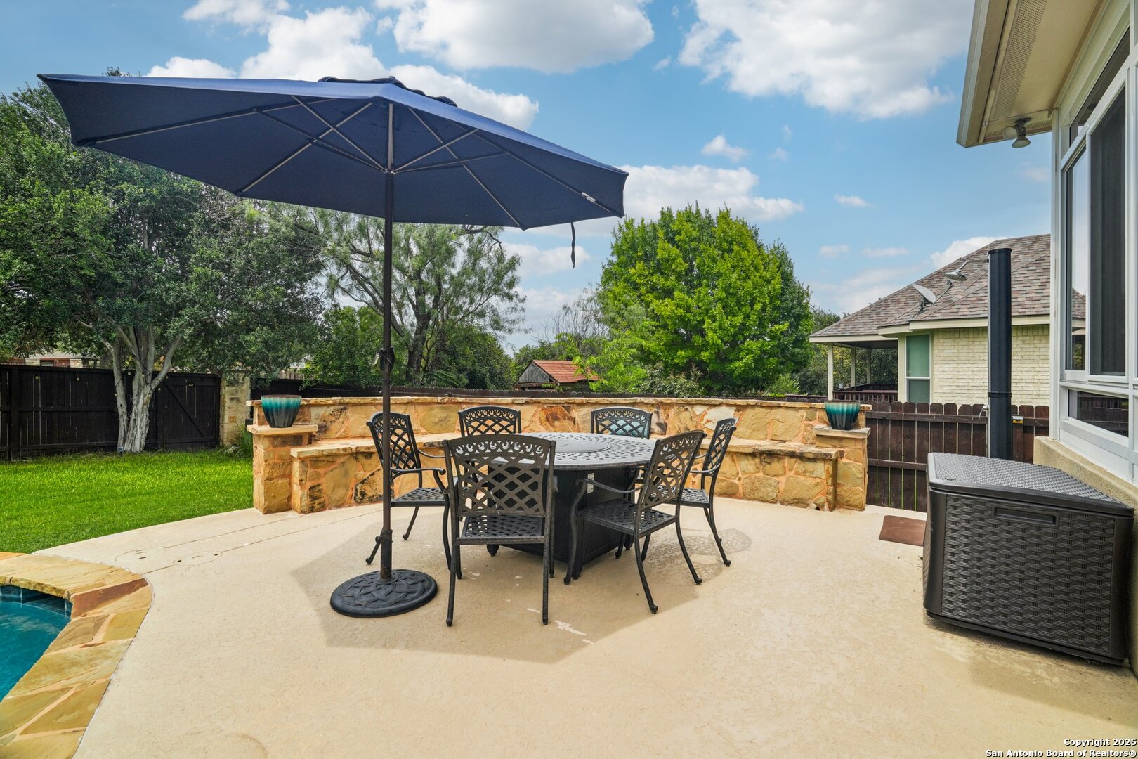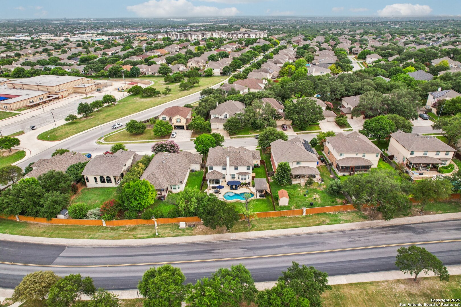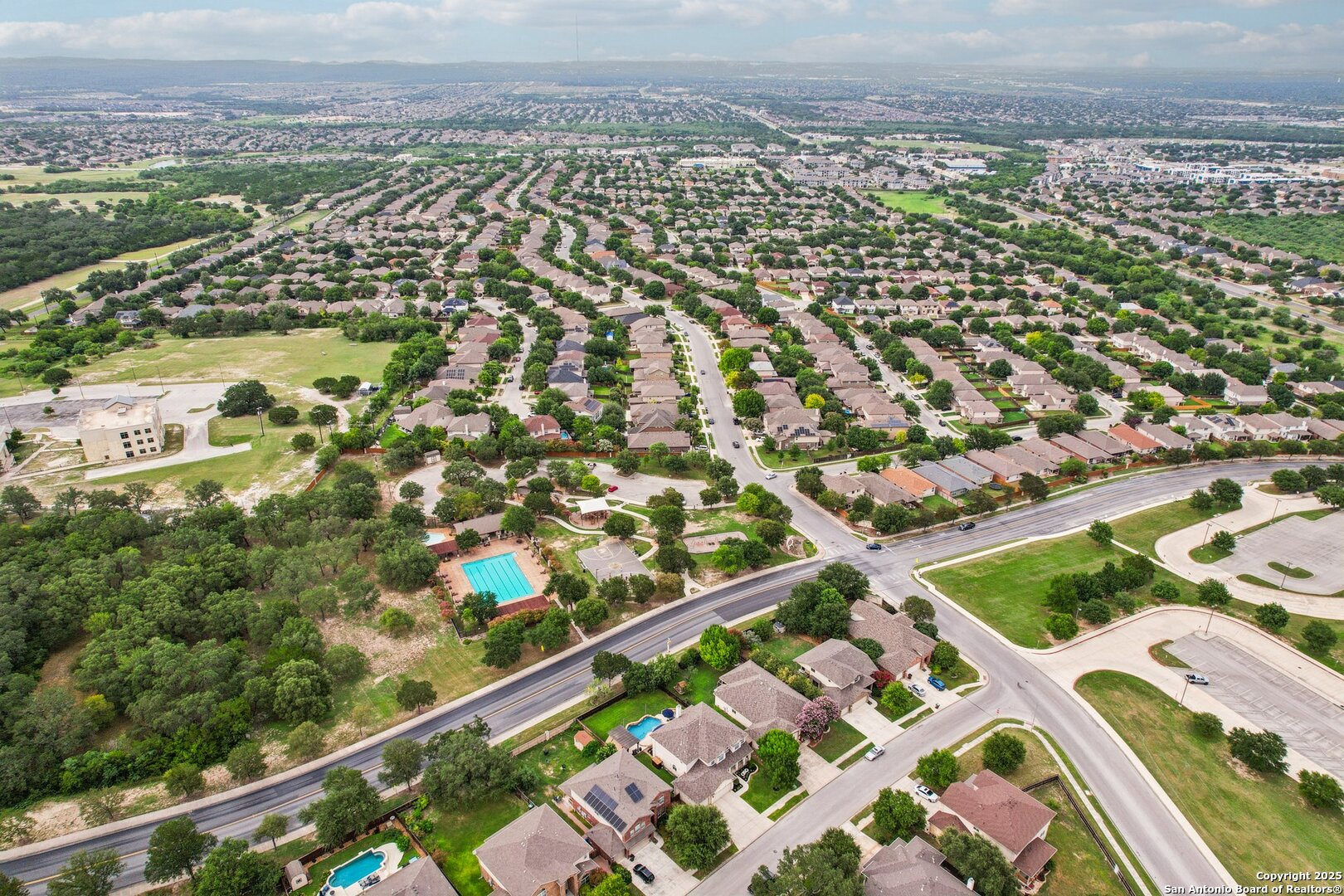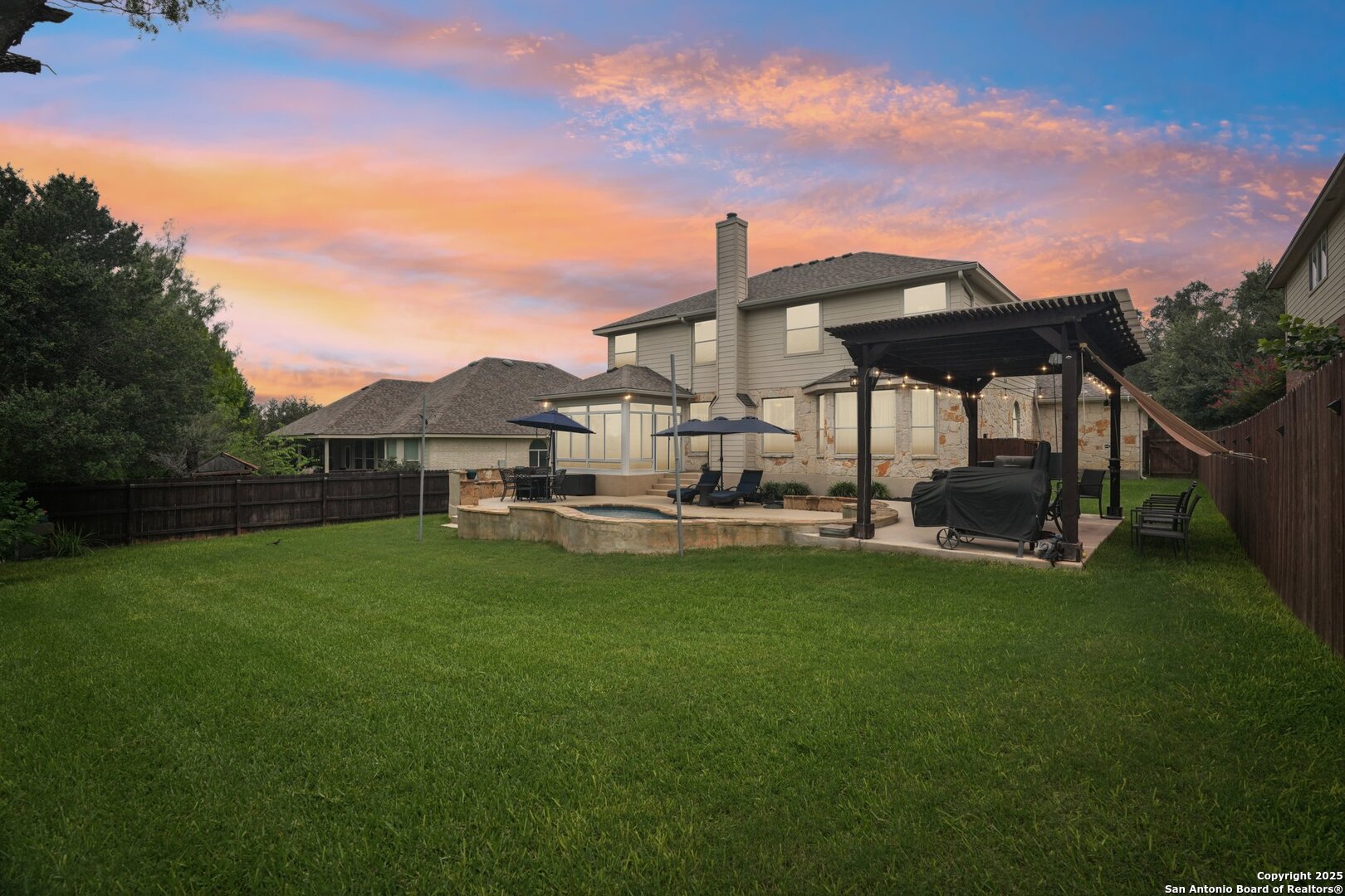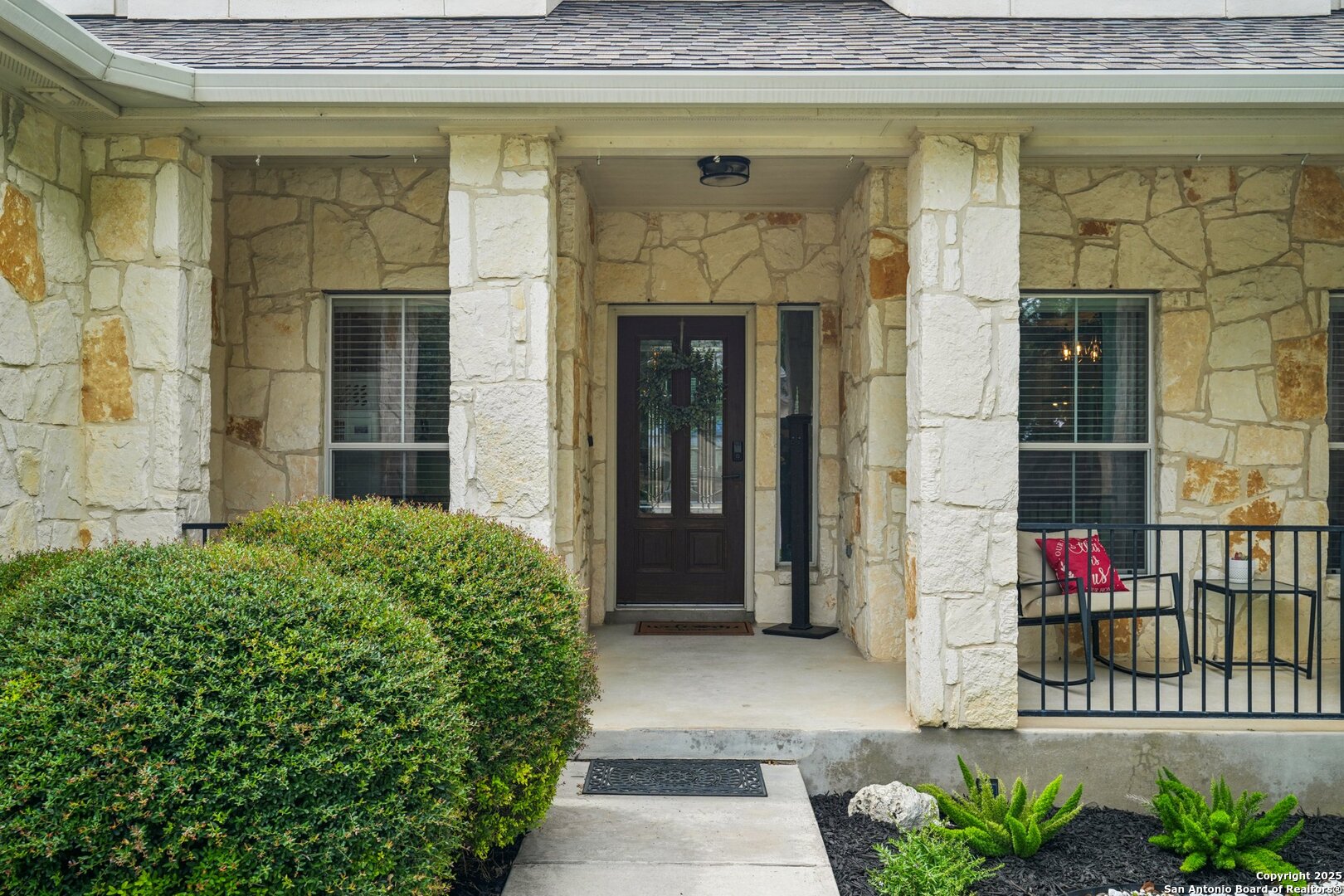 Beautifully appointed 4-bedroom, 4-bathroom residence located in the Alamo Ranch community, complete with a sparkling in-ground pool with tranquil waterfall feature. The expansive layout includes two generous living areas, a formal dining room, and a dedicated study ideal for remote work or quiet retreat. The gourmet kitchen features granite countertops, a gas cooktop, built-in oven and microwave, stainless steel appliances, and a reverse osmosis system. The downstairs primary suite offers a peaceful escape with large windows, a spacious walk-in closet, and a luxurious en-suite bath with dual vanities, a garden tub, and a walk-in shower. Upstairs, all secondary bedrooms provide ample space and include a Jack-and-Jill layout for added convenience. A four-seasons room adds year-round versatility for hobbies or a second office. Outside, enjoy your private oasis with a 22x14 pergola, curved flagstone bench, extended decking, and lush landscaping surrounding the pool-perfect for entertaining or quiet evenings. Additional upgrades include a central vacuum system, 2021 roof with radiant barrier decking, water softener, and a 3-car garage. Residents also enjoy access to the nearby community amenity center with a pool, clubhouse, sports court, and playground.