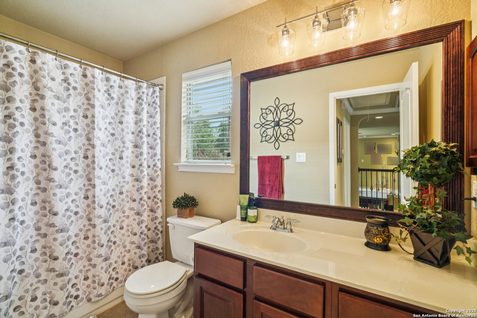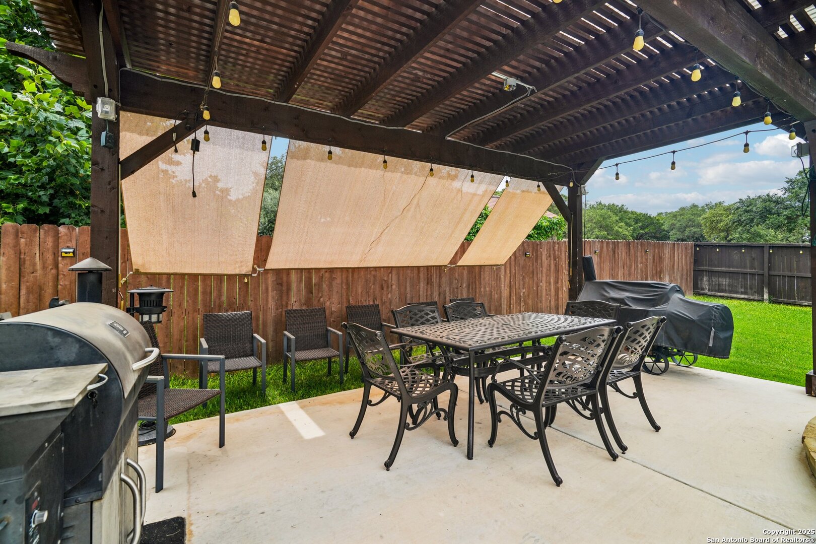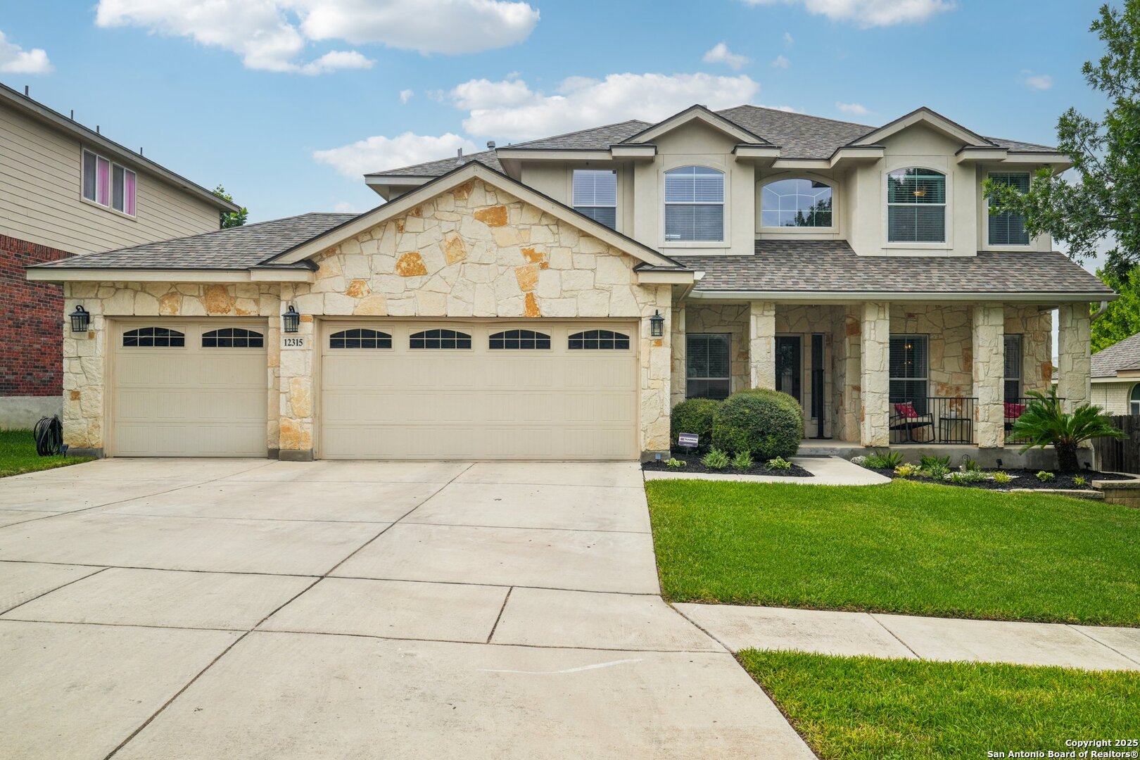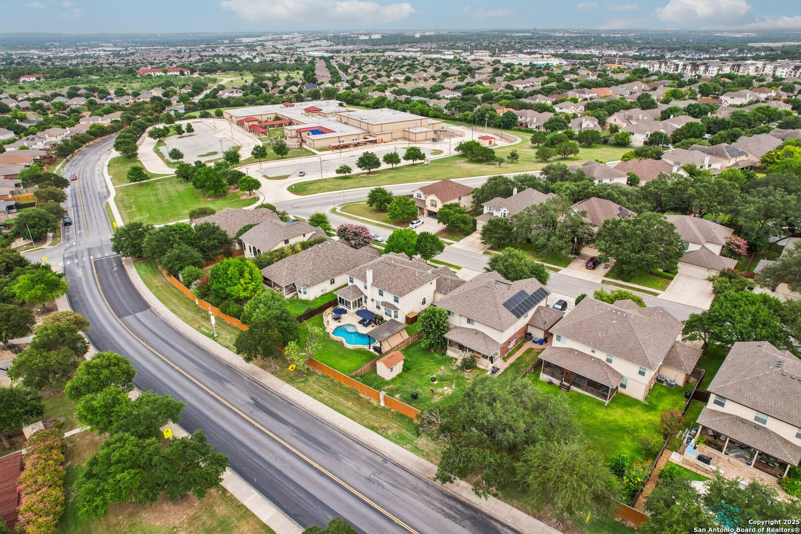 Beautifully appointed 4-bedroom, 4-bathroom residence located in the Alamo Ranch community, complete with a sparkling in-ground pool with tranquil waterfall feature. The expansive layout includes two generous living areas, a formal dining room, and a dedicated study ideal for remote work or quiet retreat. The gourmet kitchen features granite countertops, a gas cooktop, built-in oven and microwave, stainless steel appliances, and a reverse osmosis system. The downstairs primary suite offers a peaceful escape with large windows, a spacious walk-in closet, and a luxurious en-suite bath with dual vanities, a garden tub, and a walk-in shower. Upstairs, all secondary bedrooms provide ample space and include a Jack-and-Jill layout for added convenience. A four-seasons room adds year-round versatility for hobbies or a second office. Outside, enjoy your private oasis with a 22x14 pergola, curved flagstone bench, extended decking, and lush landscaping surrounding the pool-perfect for entertaining or quiet evenings. Additional upgrades include a central vacuum system, 2021 roof with radiant barrier decking, water softener, and a 3-car garage. Residents also enjoy access to the nearby community amenity center with a pool, clubhouse, sports court, and playground.