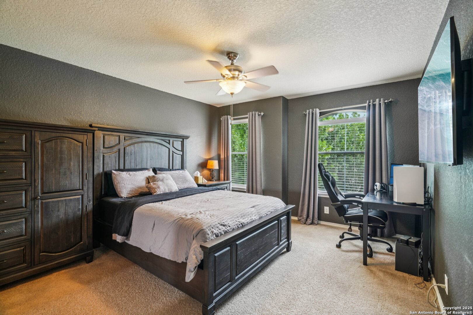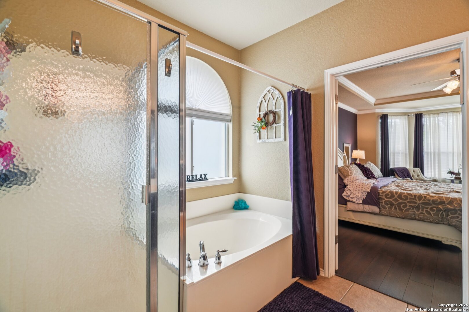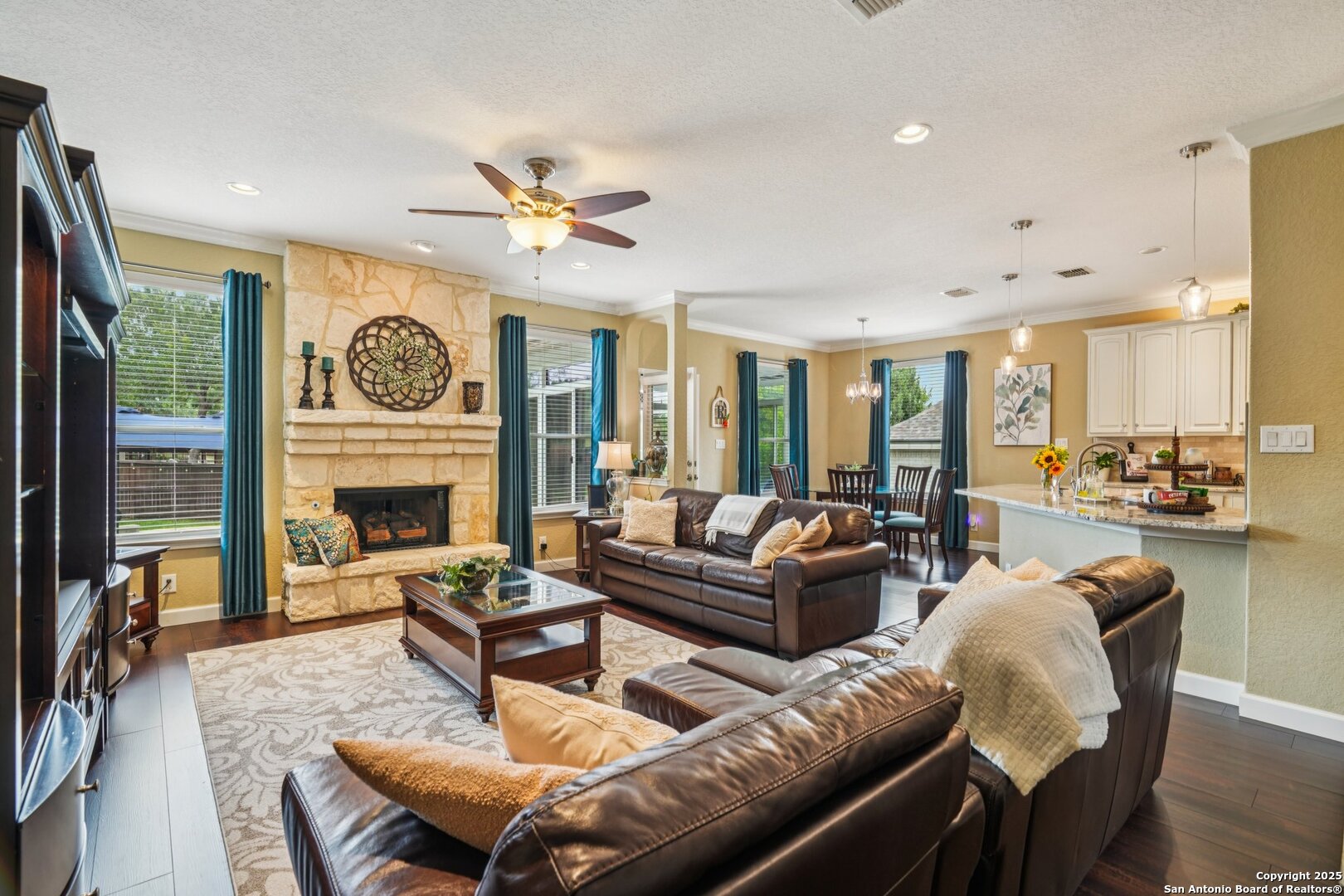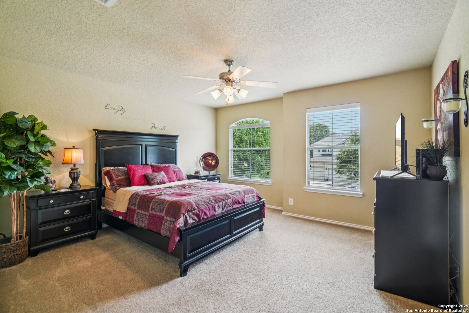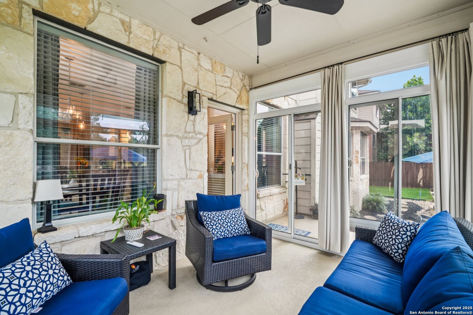 Beautifully appointed 4-bedroom, 4-bathroom residence located in the Alamo Ranch community, complete with a sparkling in-ground pool with tranquil waterfall feature. The expansive layout includes two generous living areas, a formal dining room, and a dedicated study ideal for remote work or quiet retreat. The gourmet kitchen features granite countertops, a gas cooktop, built-in oven and microwave, stainless steel appliances, and a reverse osmosis system. The downstairs primary suite offers a peaceful escape with large windows, a spacious walk-in closet, and a luxurious en-suite bath with dual vanities, a garden tub, and a walk-in shower. Upstairs, all secondary bedrooms provide ample space and include a Jack-and-Jill layout for added convenience. A four-seasons room adds year-round versatility for hobbies or a second office. Outside, enjoy your private oasis with a 22x14 pergola, curved flagstone bench, extended decking, and lush landscaping surrounding the pool-perfect for entertaining or quiet evenings. Additional upgrades include a central vacuum system, 2021 roof with radiant barrier decking, water softener, and a 3-car garage. Residents also enjoy access to the nearby community amenity center with a pool, clubhouse, sports court, and playground.