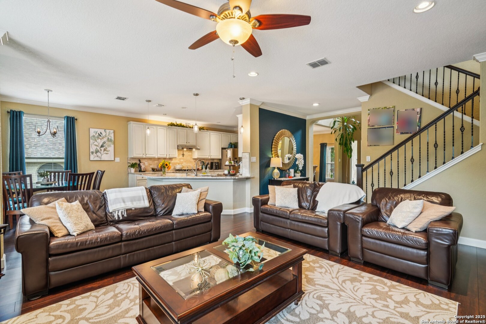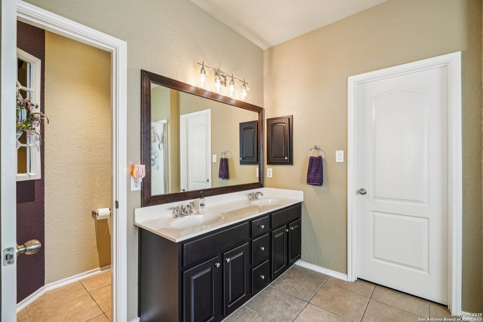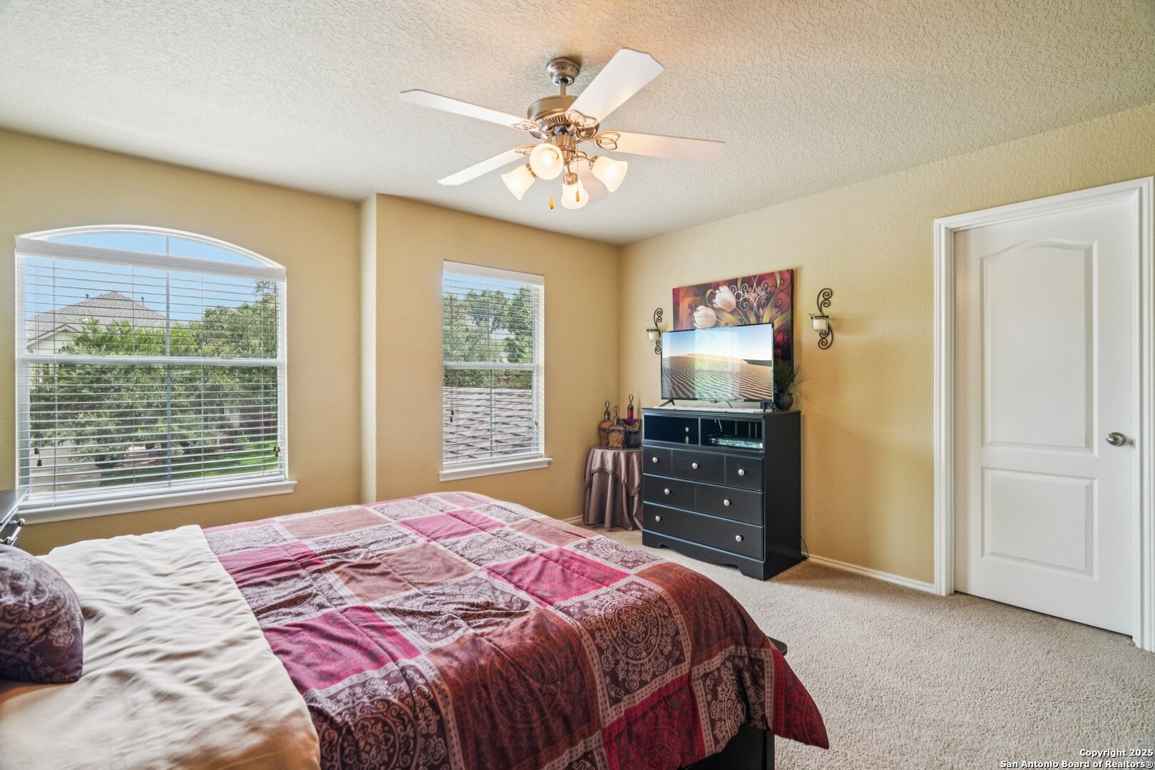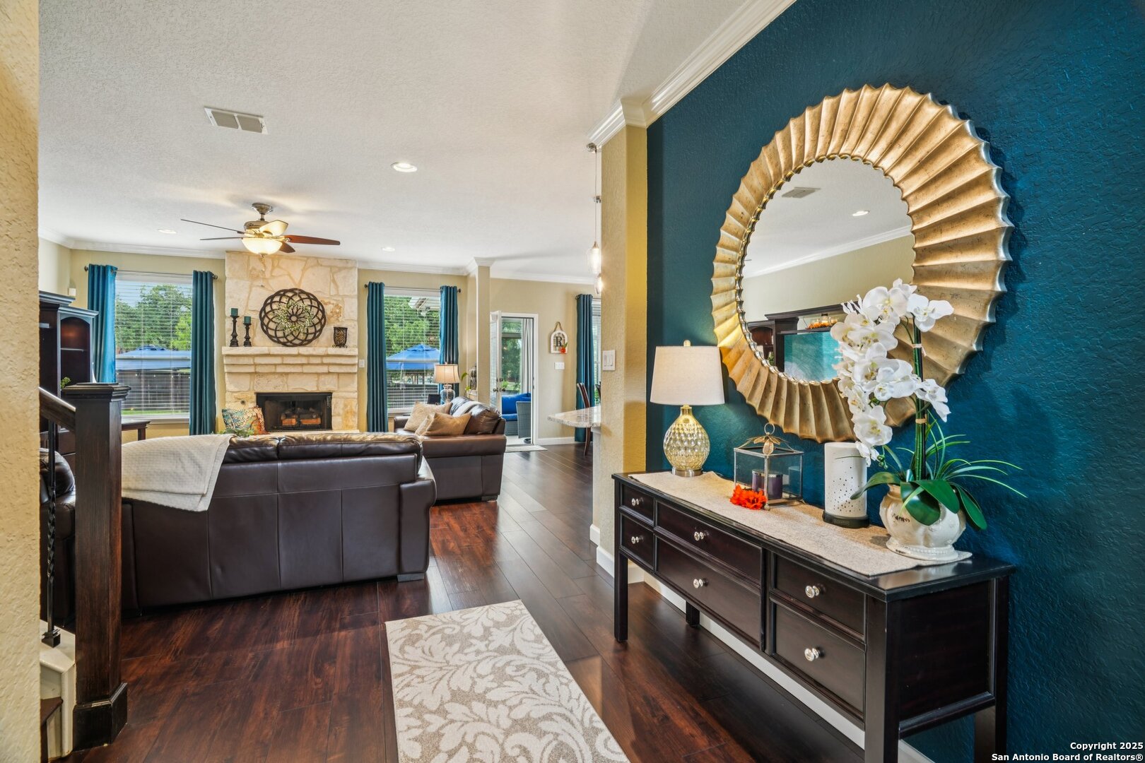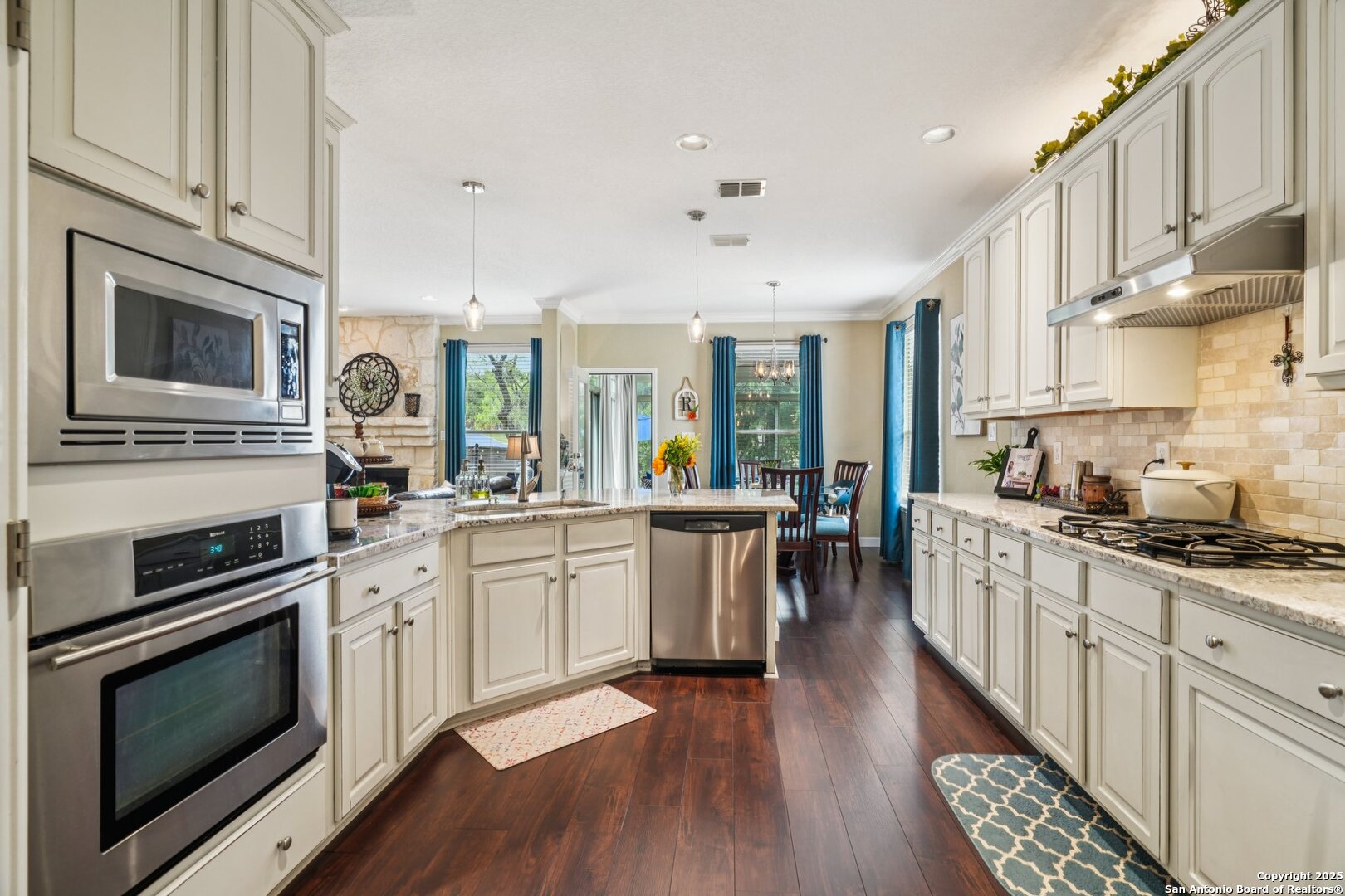 Beautifully appointed 4-bedroom, 4-bathroom residence located in the Alamo Ranch community, complete with a sparkling in-ground pool with tranquil waterfall feature. The expansive layout includes two generous living areas, a formal dining room, and a dedicated study ideal for remote work or quiet retreat. The gourmet kitchen features granite countertops, a gas cooktop, built-in oven and microwave, stainless steel appliances, and a reverse osmosis system. The downstairs primary suite offers a peaceful escape with large windows, a spacious walk-in closet, and a luxurious en-suite bath with dual vanities, a garden tub, and a walk-in shower. Upstairs, all secondary bedrooms provide ample space and include a Jack-and-Jill layout for added convenience. A four-seasons room adds year-round versatility for hobbies or a second office. Outside, enjoy your private oasis with a 22x14 pergola, curved flagstone bench, extended decking, and lush landscaping surrounding the pool-perfect for entertaining or quiet evenings. Additional upgrades include a central vacuum system, 2021 roof with radiant barrier decking, water softener, and a 3-car garage. Residents also enjoy access to the nearby community amenity center with a pool, clubhouse, sports court, and playground.