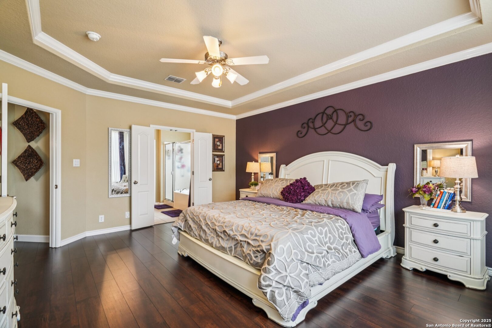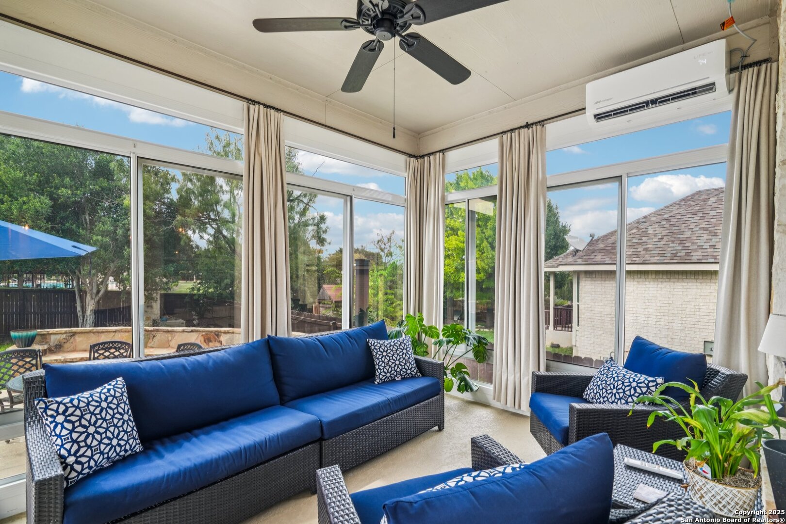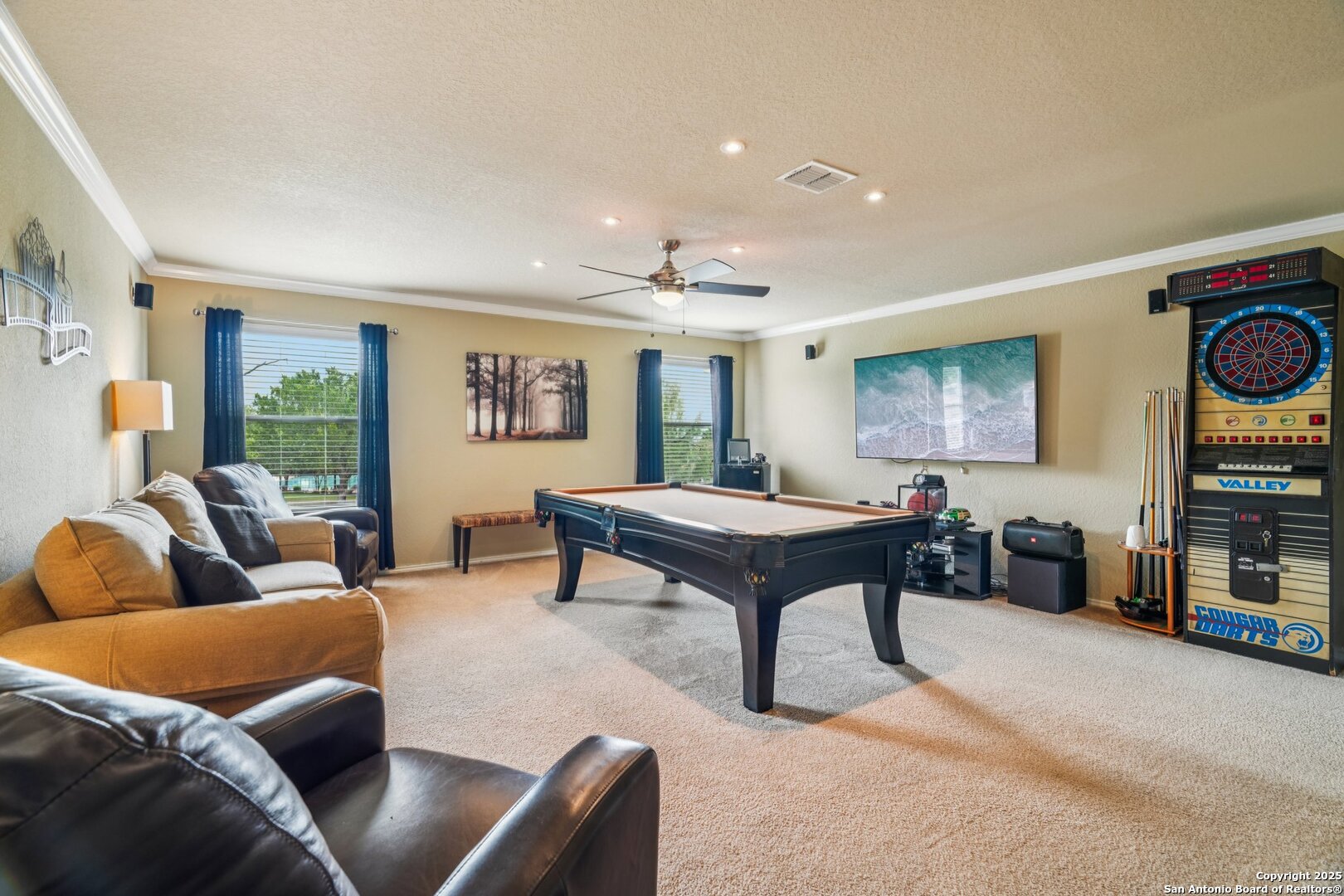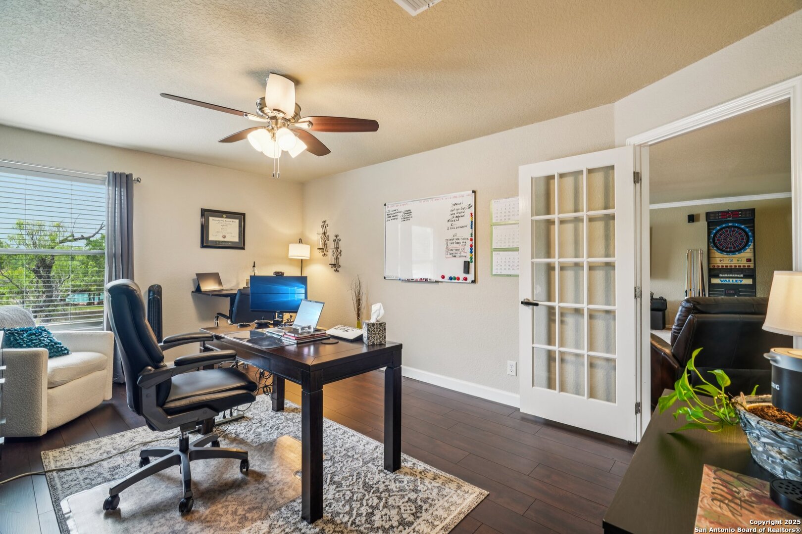 Beautifully appointed 4-bedroom, 4-bathroom residence located in the Alamo Ranch community, complete with a sparkling in-ground pool with tranquil waterfall feature. The expansive layout includes two generous living areas, a formal dining room, and a dedicated study ideal for remote work or quiet retreat. The gourmet kitchen features granite countertops, a gas cooktop, built-in oven and microwave, stainless steel appliances, and a reverse osmosis system. The downstairs primary suite offers a peaceful escape with large windows, a spacious walk-in closet, and a luxurious en-suite bath with dual vanities, a garden tub, and a walk-in shower. Upstairs, all secondary bedrooms provide ample space and include a Jack-and-Jill layout for added convenience. A four-seasons room adds year-round versatility for hobbies or a second office. Outside, enjoy your private oasis with a 22x14 pergola, curved flagstone bench, extended decking, and lush landscaping surrounding the pool-perfect for entertaining or quiet evenings. Additional upgrades include a central vacuum system, 2021 roof with radiant barrier decking, water softener, and a 3-car garage. Residents also enjoy access to the nearby community amenity center with a pool, clubhouse, sports court, and playground.