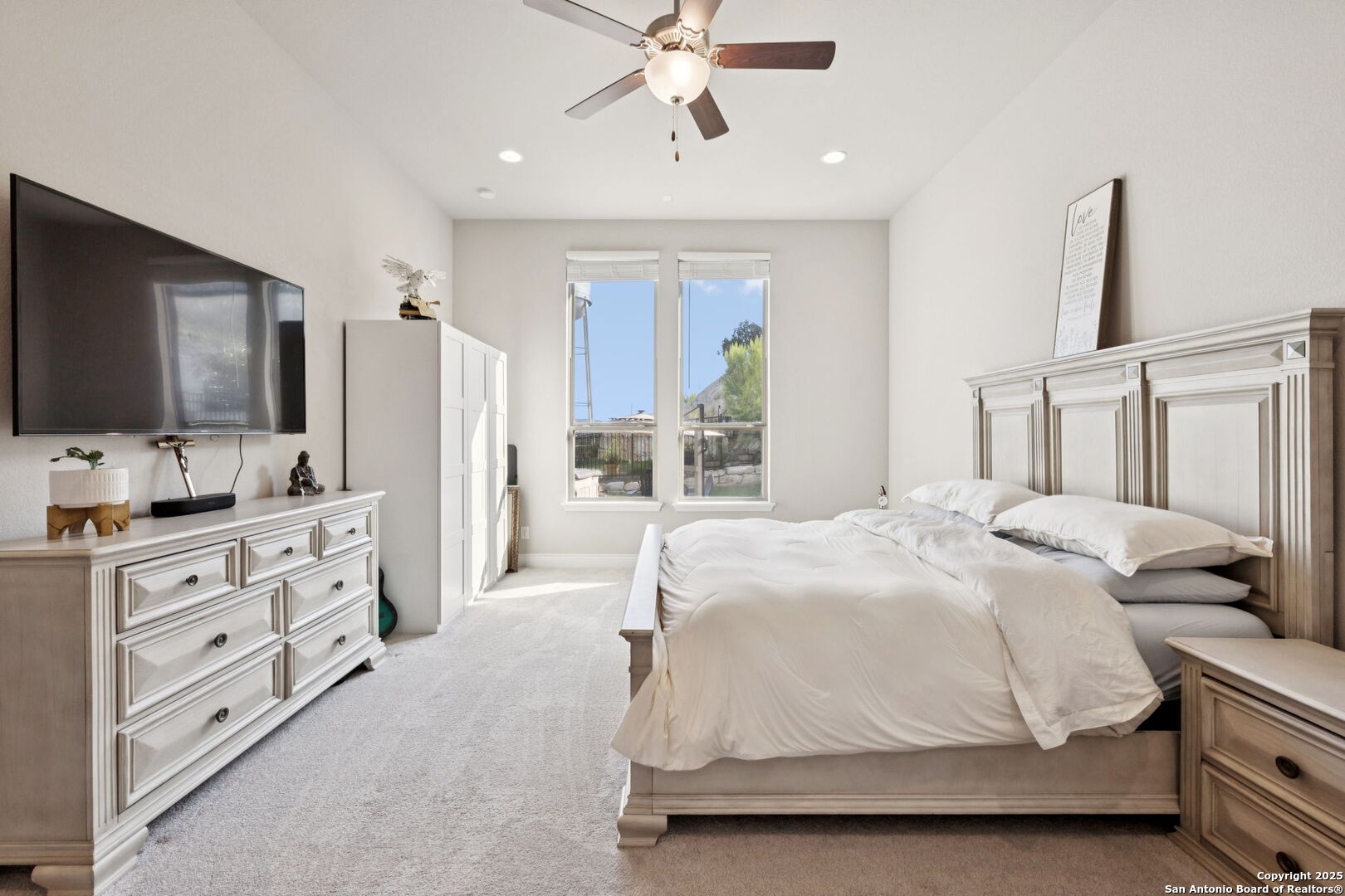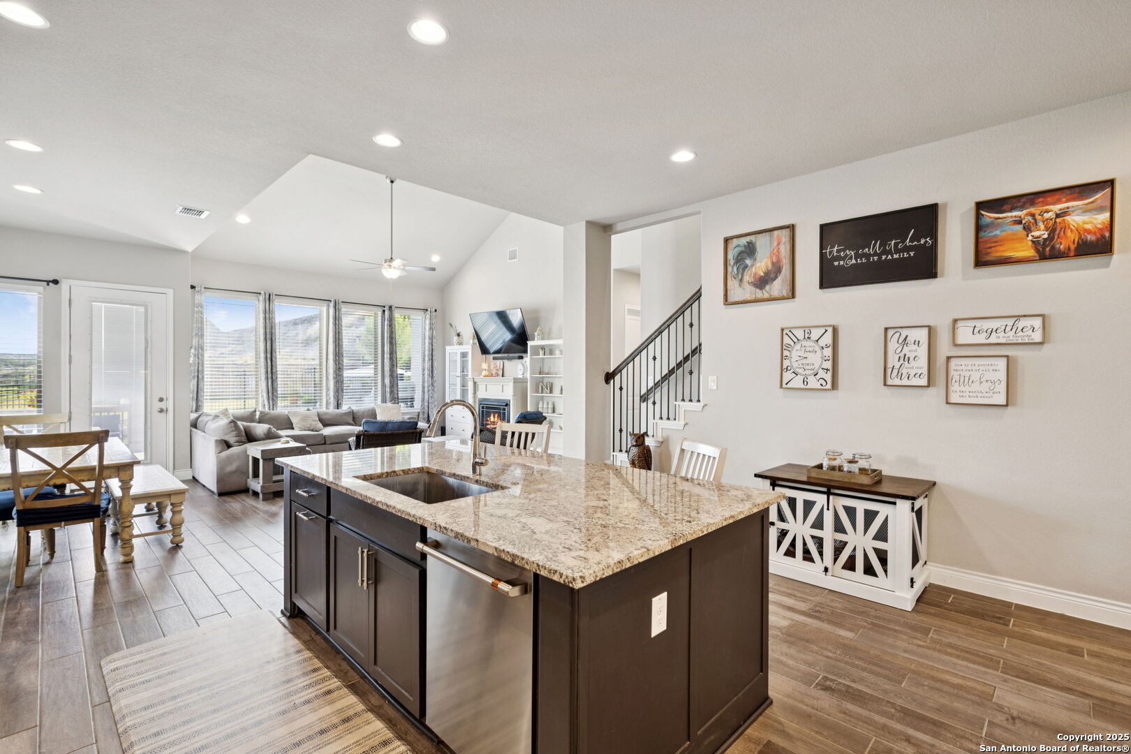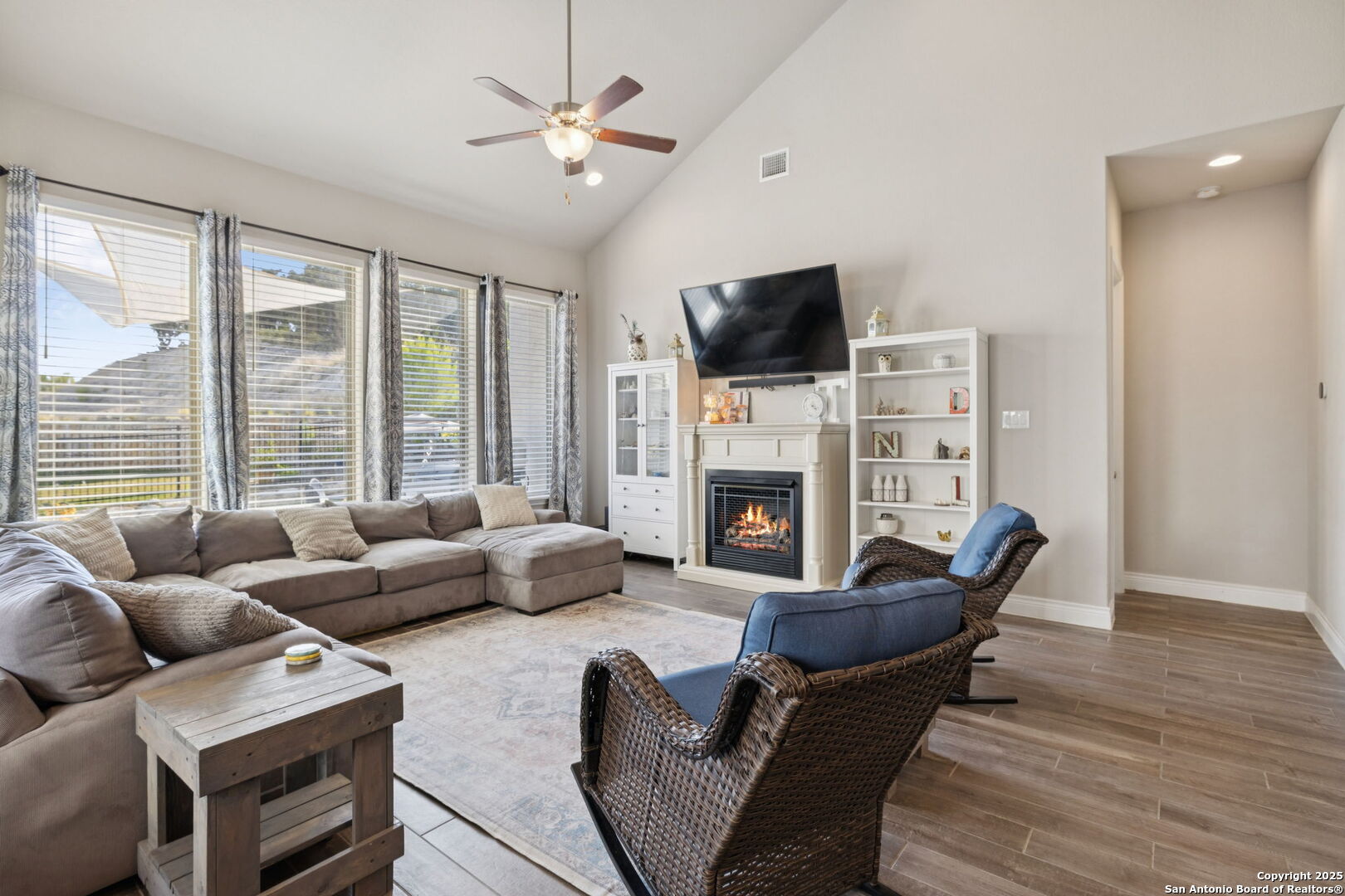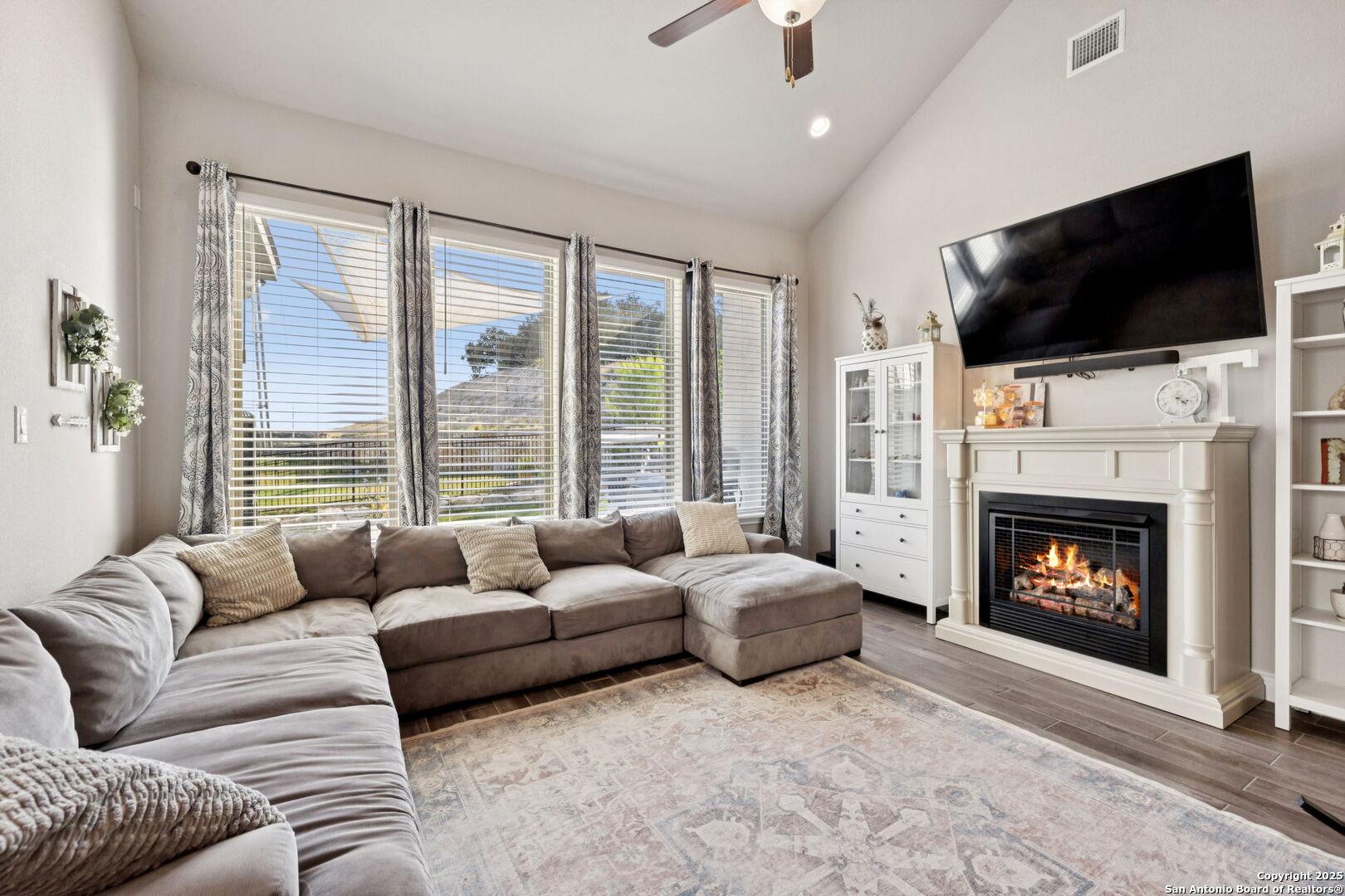 OPEN HOUSE: Saturday, November 15th 12p-3p. Exquisite Move-In Ready Home in the Prestigious Esperanza Community of Boerne. Step into elevated Hill Country living with this stunning 4-bedroom, 3-bathroom residence, perfectly crafted for those with discerning taste. Nestled within the award-winning, master-planned community of Esperanza, this meticulously maintained home exudes elegance and comfort, showcasing model home-quality finishes throughout. From the moment you enter, you're welcomed by an open-concept floorplan featuring wood-look tile flooring in the entry, formal dining, and expansive family room. Soaring ceilings enhance the sense of space and grandeur in the main living areas, primary suite, and covered back patio, while oversized windows flood the home with natural light, creating an airy and inviting ambiance. The gourmet kitchen is a chef's dream-equipped with a gas cooktop, stainless steel appliances, tall custom cabinetry, extended countertops, and a generous pantry-perfect for both everyday living and entertaining in style. Retreat to the luxurious primary suite, a private haven bathed in light, offering serene views and spa-inspired comfort. Additional premium features include a tankless water heater, water softener, extended covered patio with a built-in firepit, ideal for relaxing or hosting under the Texas sky. As a resident of Esperanza, you'll enjoy world-class amenities including a resort-style clubhouse, pool, lazy river, splash pad, state-of-the-art fitness center, miles of scenic trails, dog park, sand volleyball and pickleball courts, and a vibrant calendar of community events. Families will also appreciate the on-site elementary school, just a short walk away. This home is a rare opportunity to experience luxury, lifestyle, and location-a must-see masterpiece ready to welcome you home.