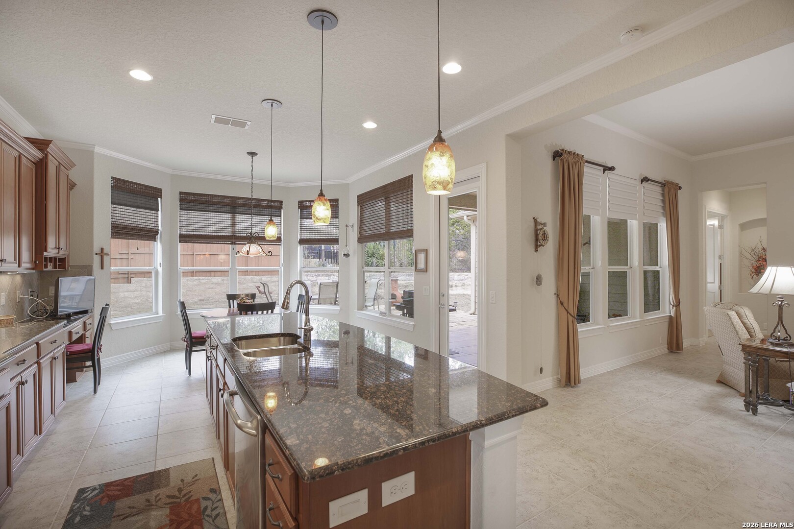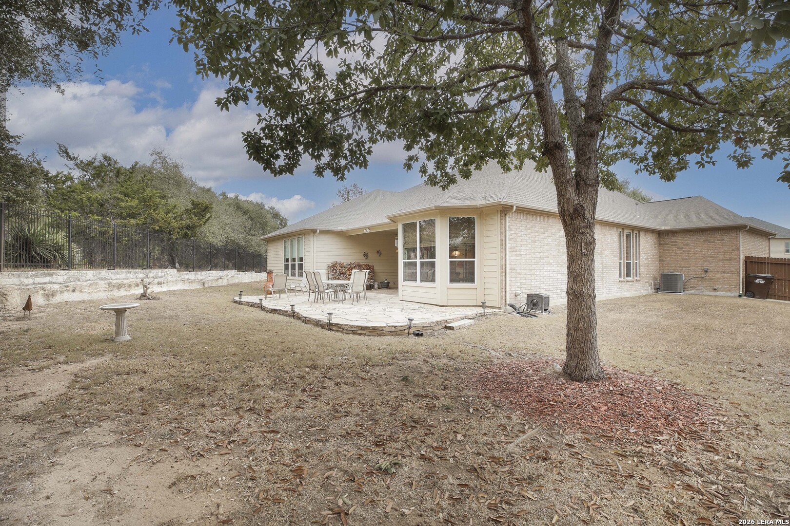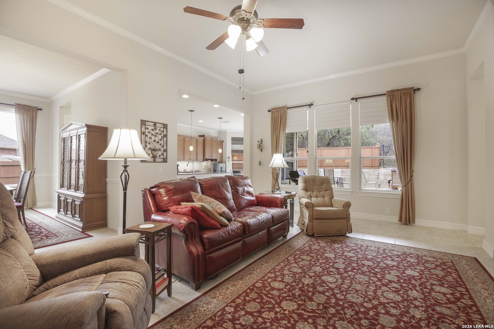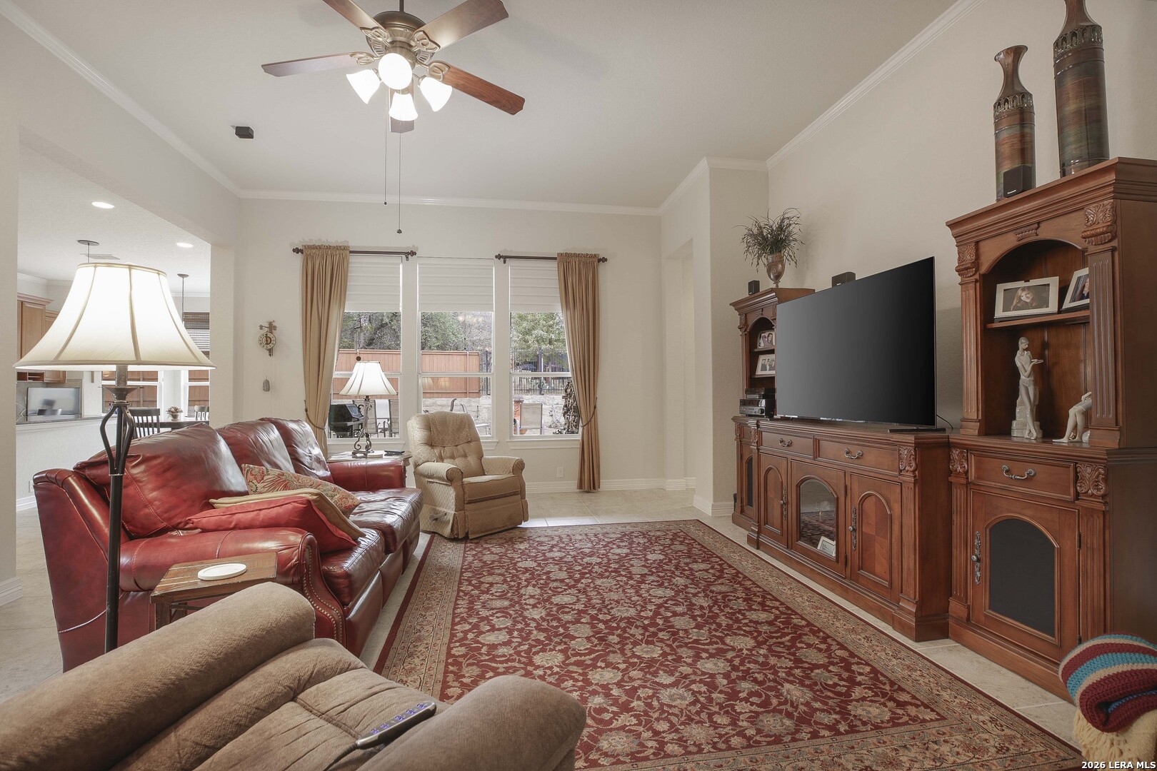 Step through the front door and immediately sense the thoughtful design and pride of ownership throughout this impeccably maintained one-owner home in the gated Enclave at Alamo Ranch. From the moment you enter, refined details elevate the living spaces, creating a warm yet polished atmosphere that feels both welcoming and intentional. The spacious living room is wired for surround sound, making it the perfect setting for movie nights, game days, or simply relaxing at home. At the heart of the home, the eat-in kitchen impresses with extensive cabinetry and drawers, offering exceptional storage as well as under cabinet lighting, while seamlessly connecting to two dining areas-ideal for hosting holidays, celebrations, or casual gatherings alike. Every space flows with ease, designed to be both beautiful and functional. Inside, oversized bedrooms provide comfortable, private retreats, while a dedicated office adds flexibility for work or study. The three-car garage offers incredible versatility-perfect for extra storage, hobbies, or workshop space in addition to parking. Step outside and discover a backyard retreat that truly sets this home apart. The generous covered patio with extended outdoor living space invites you to entertain, unwind, or enjoy morning coffee while overlooking a lush, beautifully maintained yard complete with a fig tree and storage shed. Both the front and backyard are thoughtfully landscaped and equipped with sprinkler systems, ensuring year-round curb appeal with ease. Located near parks, greenbelts, and everyday conveniences including H-E-B, Target, and Home Depot, this home delivers style, space, and lifestyle in one exceptional package.