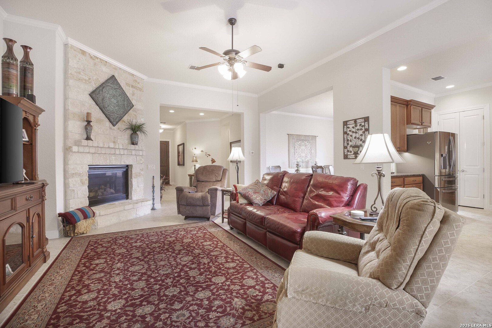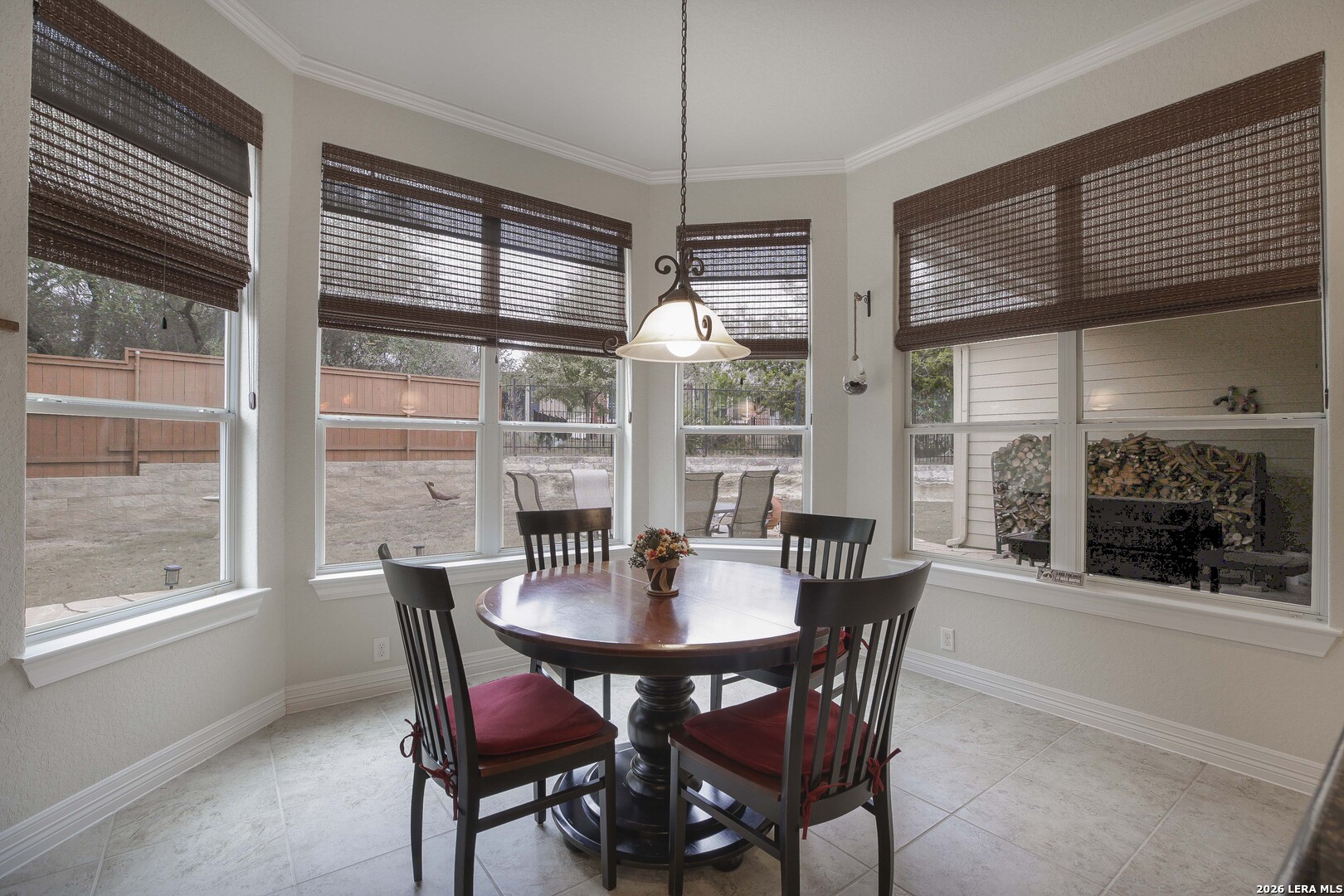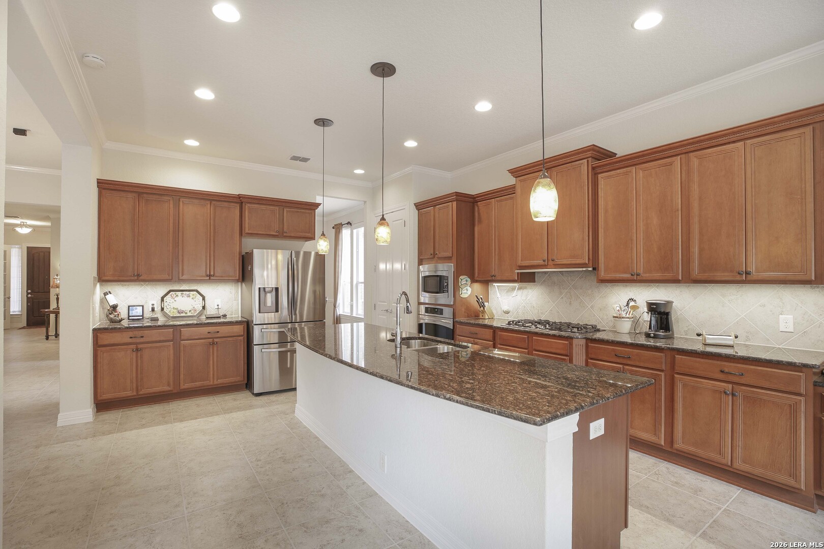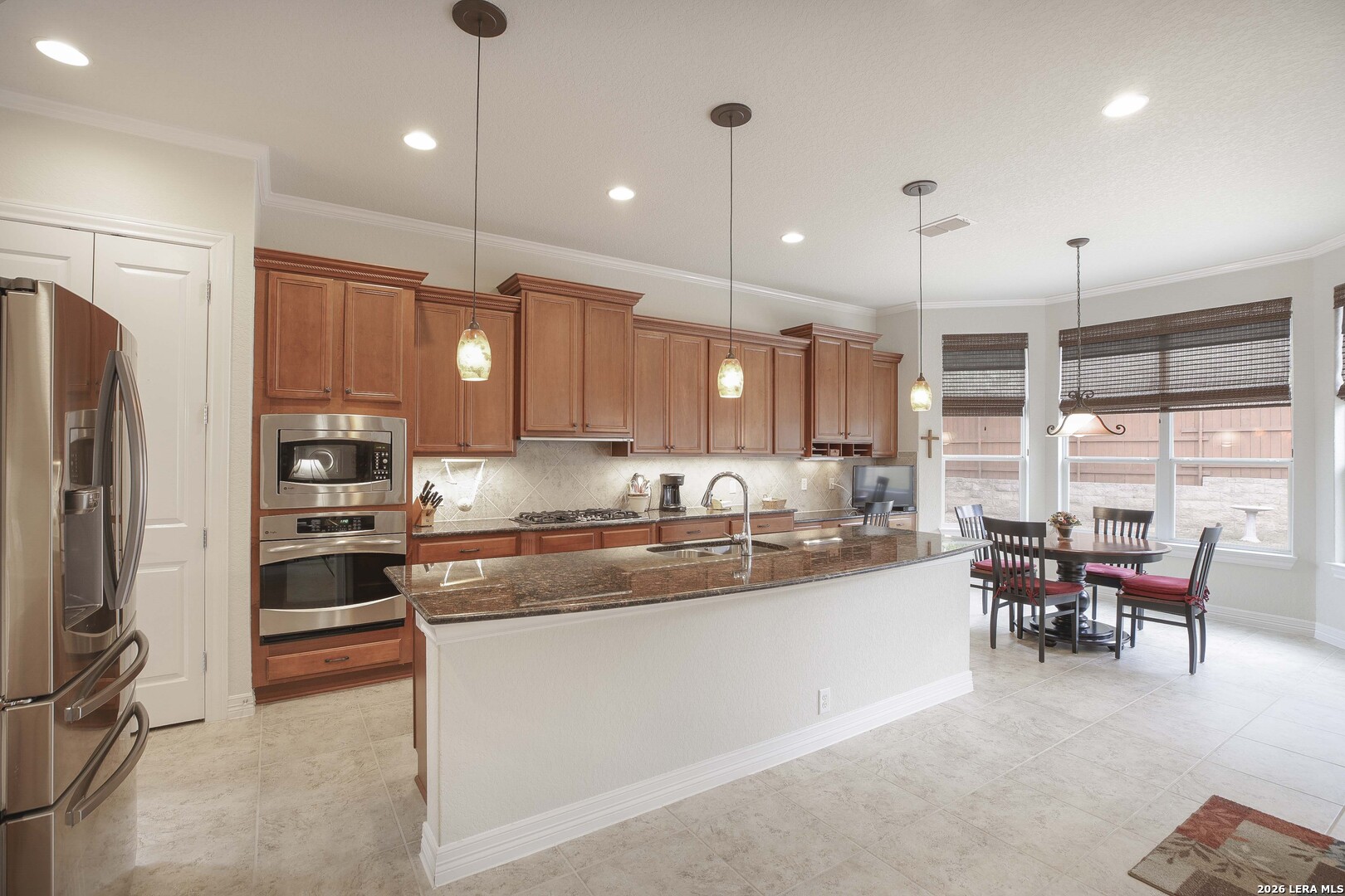 Step through the front door and immediately sense the thoughtful design and pride of ownership throughout this impeccably maintained one-owner home in the gated Enclave at Alamo Ranch. From the moment you enter, refined details elevate the living spaces, creating a warm yet polished atmosphere that feels both welcoming and intentional. The spacious living room is wired for surround sound, making it the perfect setting for movie nights, game days, or simply relaxing at home. At the heart of the home, the eat-in kitchen impresses with extensive cabinetry and drawers, offering exceptional storage as well as under cabinet lighting, while seamlessly connecting to two dining areas-ideal for hosting holidays, celebrations, or casual gatherings alike. Every space flows with ease, designed to be both beautiful and functional. Inside, oversized bedrooms provide comfortable, private retreats, while a dedicated office adds flexibility for work or study. The three-car garage offers incredible versatility-perfect for extra storage, hobbies, or workshop space in addition to parking. Step outside and discover a backyard retreat that truly sets this home apart. The generous covered patio with extended outdoor living space invites you to entertain, unwind, or enjoy morning coffee while overlooking a lush, beautifully maintained yard complete with a fig tree and storage shed. Both the front and backyard are thoughtfully landscaped and equipped with sprinkler systems, ensuring year-round curb appeal with ease. Located near parks, greenbelts, and everyday conveniences including H-E-B, Target, and Home Depot, this home delivers style, space, and lifestyle in one exceptional package.