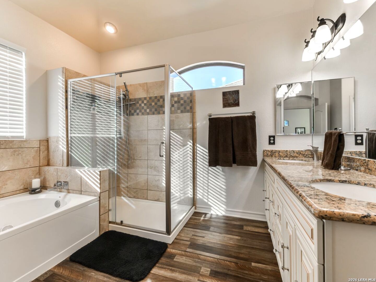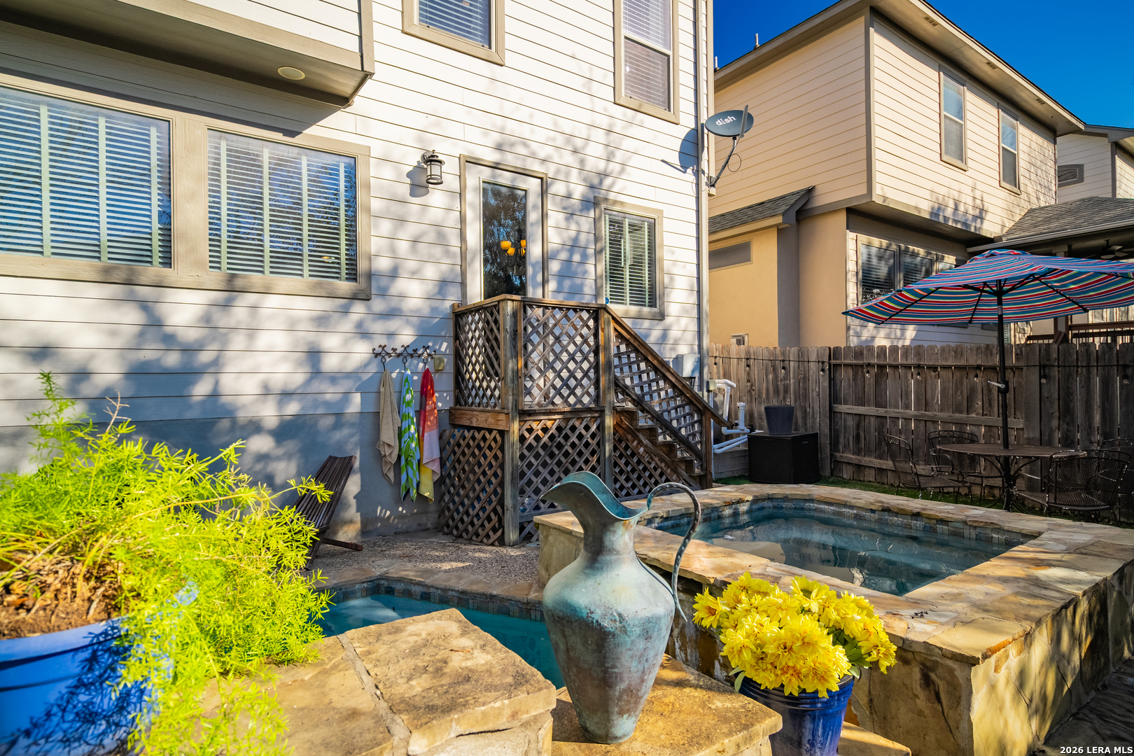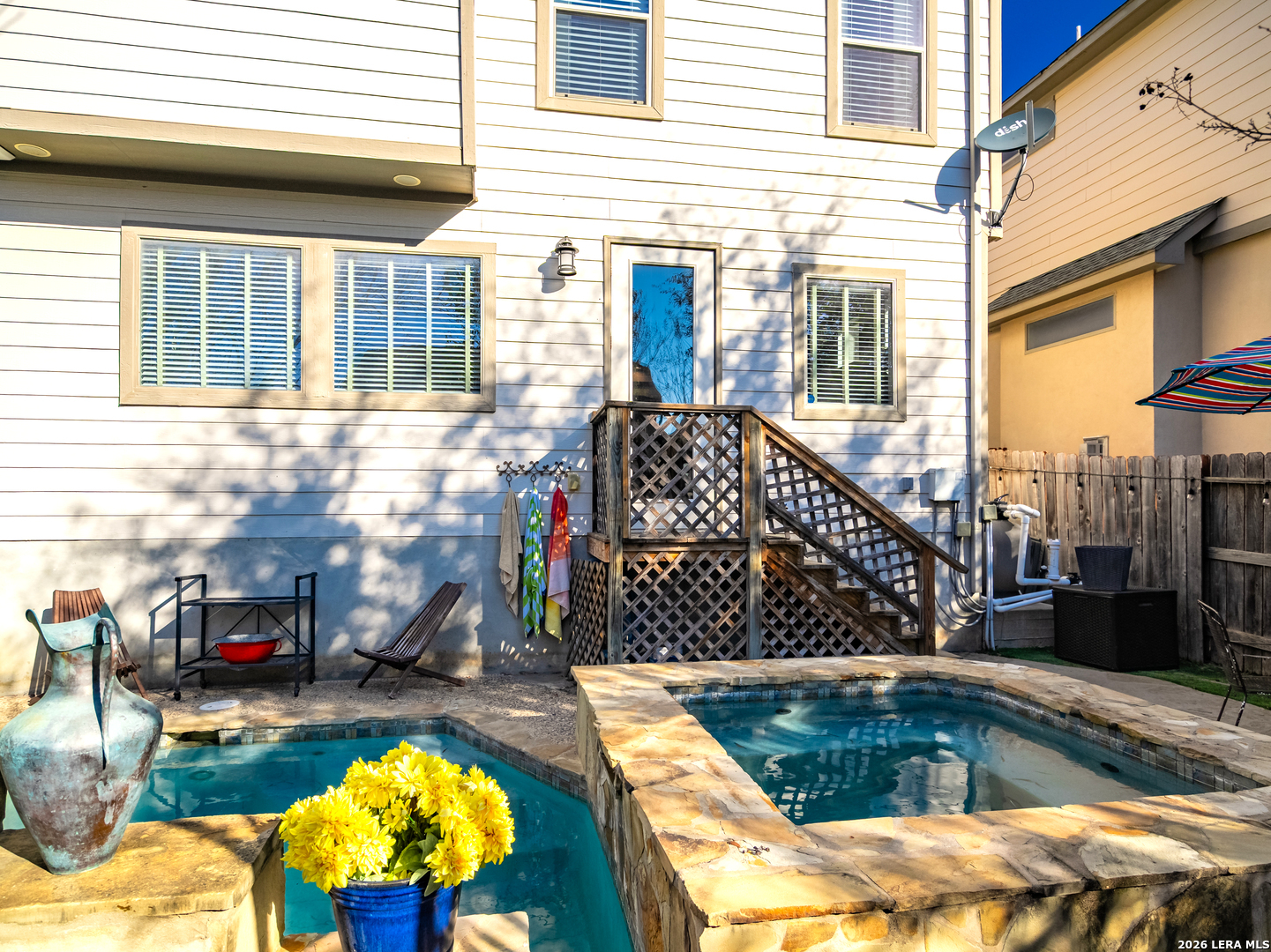 Spring time is here! Come relax outside in an "in-ground" hot tub and swimming pool. This backyard oasis sets this house from all others. This house was the model home initially for the subdivision. House features an advanced plumbing system. Kitchen features nice granite countertops, stainless steel appliances, and glass backsplash. This 3 bedroom house has no carpet. The primary bedroom features a nice garden tub, granite counter tops and a spacious walk in closet. This subdivision has a private entrance to Stone Oak Park on Andrews Garden with trail and playground. Amazing dog play park too. New roof and new dishwasher installed in 2024. New garbage disposal in 2025. This is a great valued home.