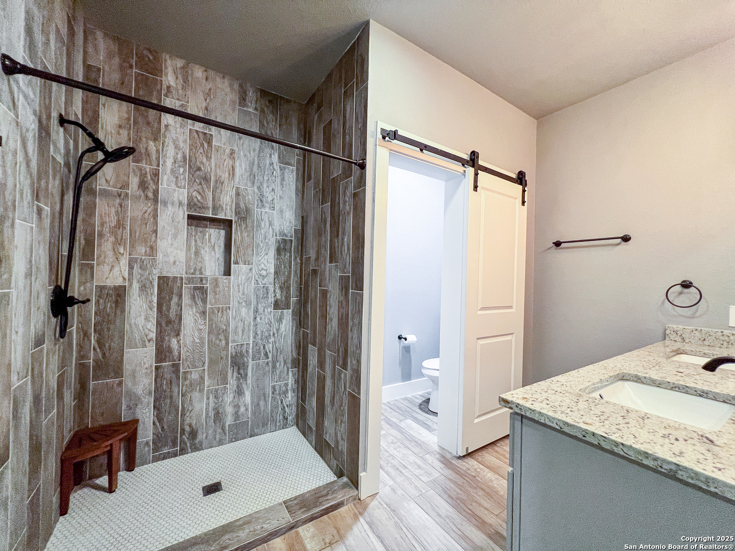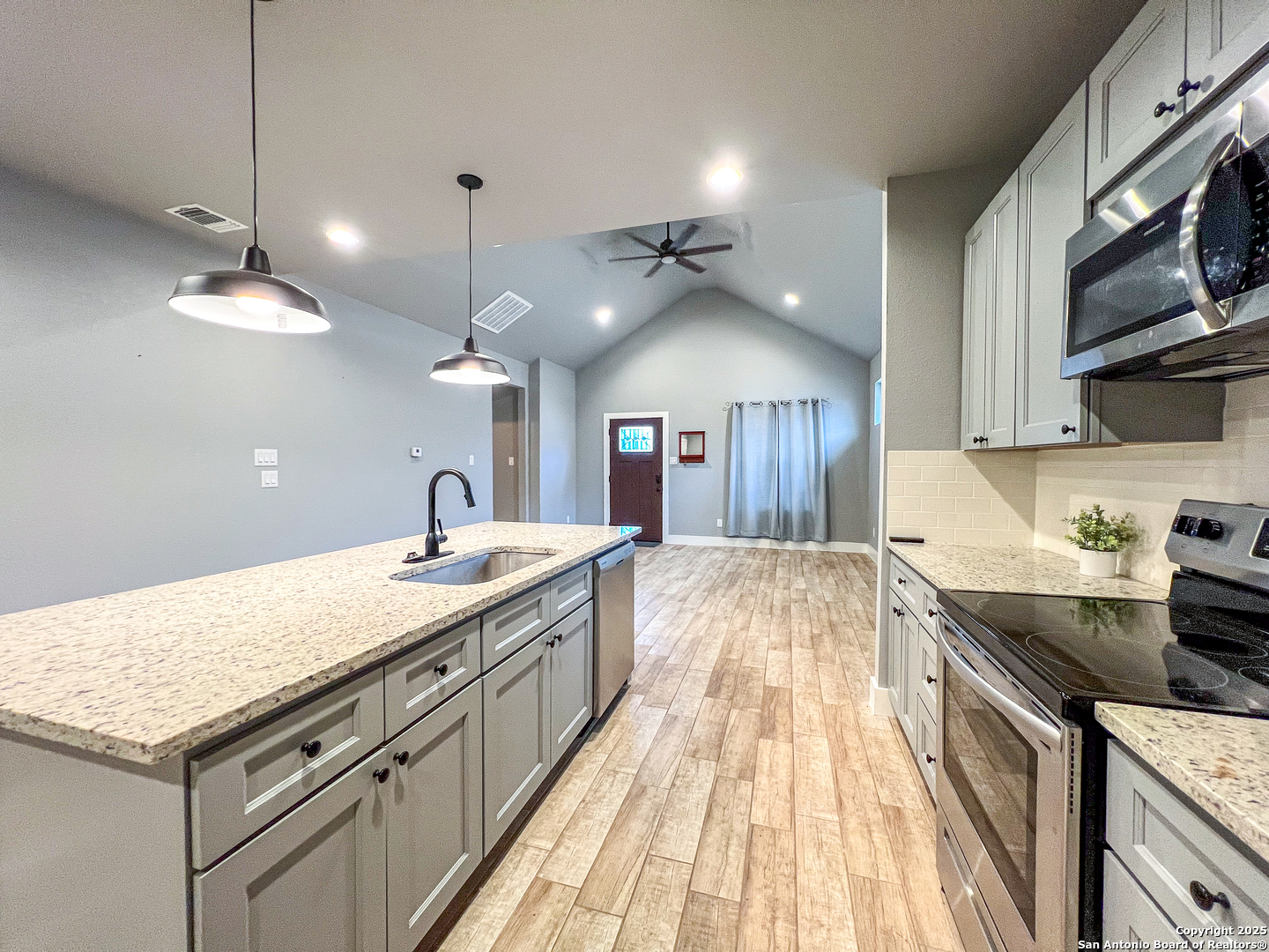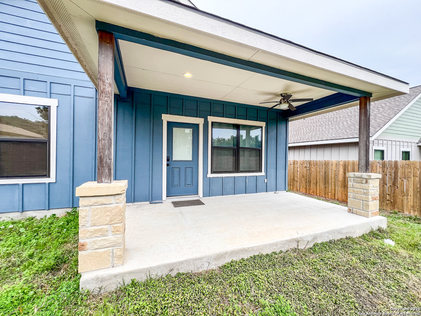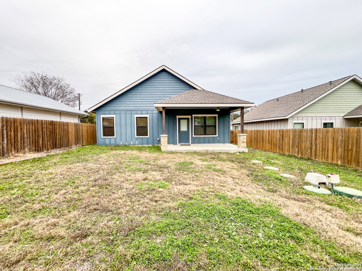 This 3-bedroom farm-style home has a spacious and inviting living space with a blend of modern amenities and charming features. The open and flowing floor plan offers a seamless layout for comfortable living, perfect for both everyday living and entertaining. The granite kitchen with a tiled back-splash and Energy Star stainless steel appliances provides a stylish and functional space for cooking and gathering. The separate dining area and eat-in breakfast counter offer versatile options for meals and dining. The split floor plan ensures privacy and convenience for occupants and guests. The choice of easy-care and durable wood-look tiled flooring throughout the living space and wet areas combines practicality with a stylish aesthetic, while carpeted bedrooms offer comfort and warmth. The master suite stands out with an exceptionally large closet and a bathroom featuring an oversized walk-in shower, adding a touch of luxury to the home. Features such as low E windows, radiant barrier, recessed lighting, high ceilings, and a programmable thermostat add additional functionality, energy efficiency, and modern appeal to the home. The covered front porch and back patio provide inviting outdoor spaces for relaxation and outdoor living, further enhancing the charm and livability of the property. This farm-style home offers a perfect combination of modern comforts and classic charm, providing a welcoming and well-appointed space for a relaxed and enjoyable lifestyle.
