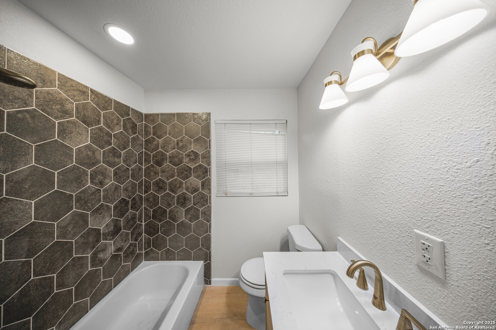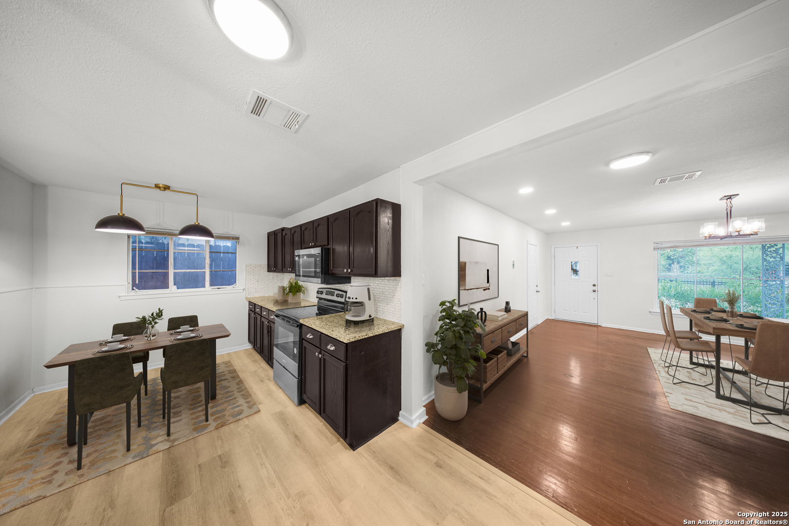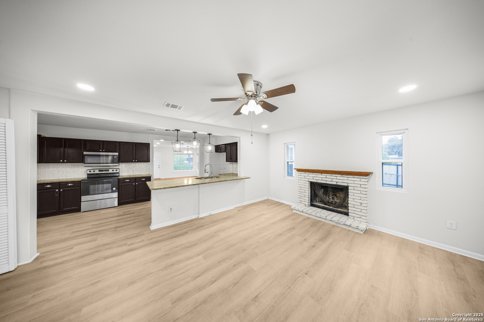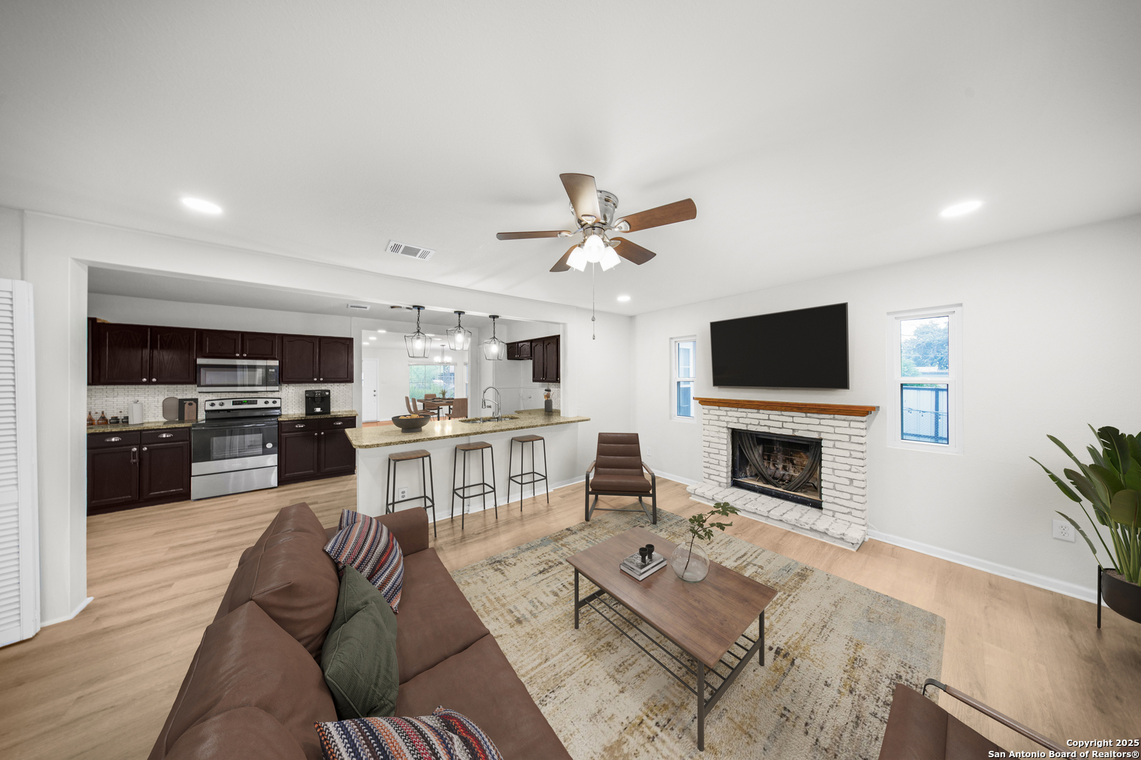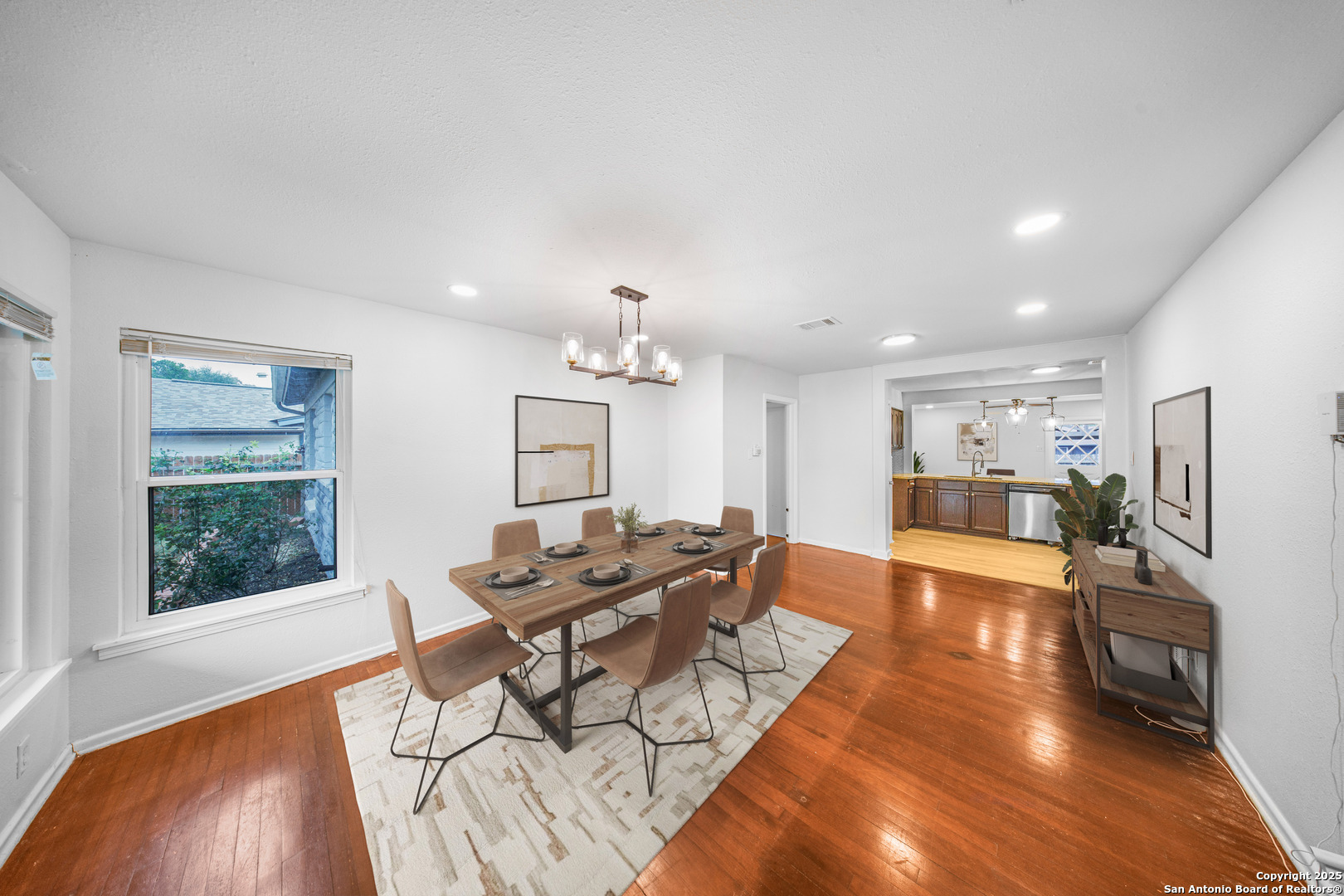 This charming single-story home at 126 Cresham Dr in San Antonio, TX 78218 offers welcoming curb appeal with iron fencing for added style and security, mature trees, decorative stonework, upgraded double-pane front-facing windows, and a single-car garage. As you step inside, the dining room unfolds beautifully, featuring a chandelier with timeless elegance, original hardwood flooring, and recessed LED lighting-creating an inviting, upscale atmosphere for everyday dining. Continue into the spacious dine-in kitchen, showcasing granite countertops, a breakfast bar, patterned backsplash, stainless steel appliances, and an open layout ideal for modern living. Adjacent to the kitchen are three comfortable bedrooms, all offering neutral-tone wood flooring and abundant natural light. The home features two upgraded bathrooms, including one with a stylish vessel sink and glass-enclosed shower, and another with a beautifully hexagon-tiled tub surround and champagne-toned fixtures. The large living room serves as the heart of the home, complete with luxury vinyl flooring, recessed lighting, and a wood-burning fireplace, perfect for relaxation and gatherings. A generous laundry room provides convenience and added storage. High-speed Google Fiber up to 1G, a Nest thermostat, and 5.27 kW solar panels enhance energy efficiency and reduce utility costs. Step into the backyard to enjoy a shaded area under a mature tree and a decorative metal-covered patio, ideal for outdoor entertaining. This move-in-ready property blends comfort, efficiency, and modern upgrades throughout. Additional details: roof approx. 8 years old; natural gas HVAC approx. 4 years old; natural gas water heater; 312 sq ft garage with side entry access door and automatic opener. Conveniently located near Fort Sam Houston, Randolph AFB, Loop 410, and I-35, offering excellent access across Northeast San Antonio.