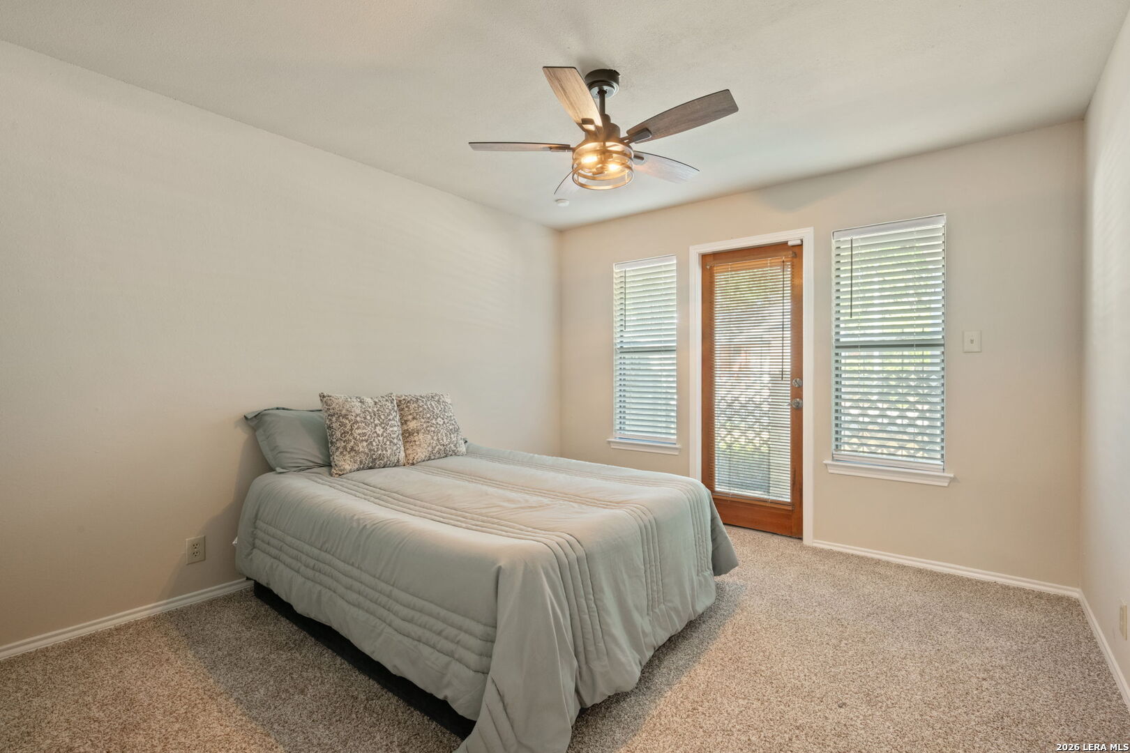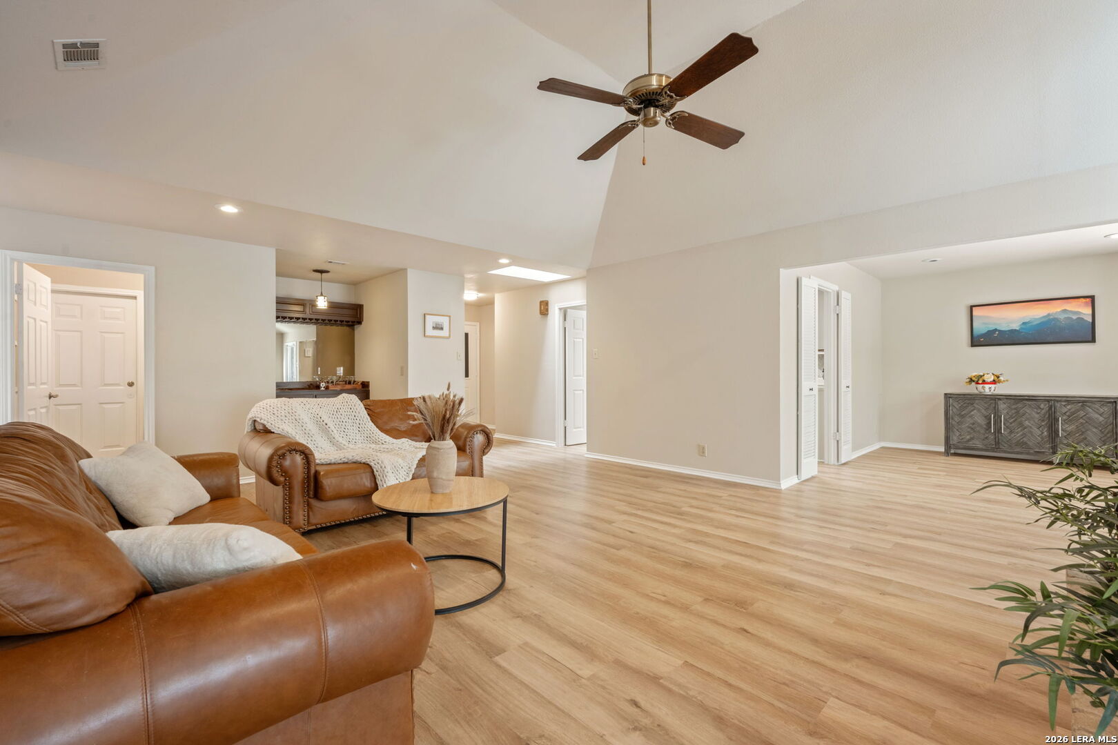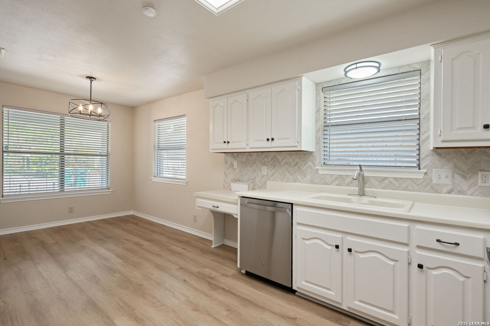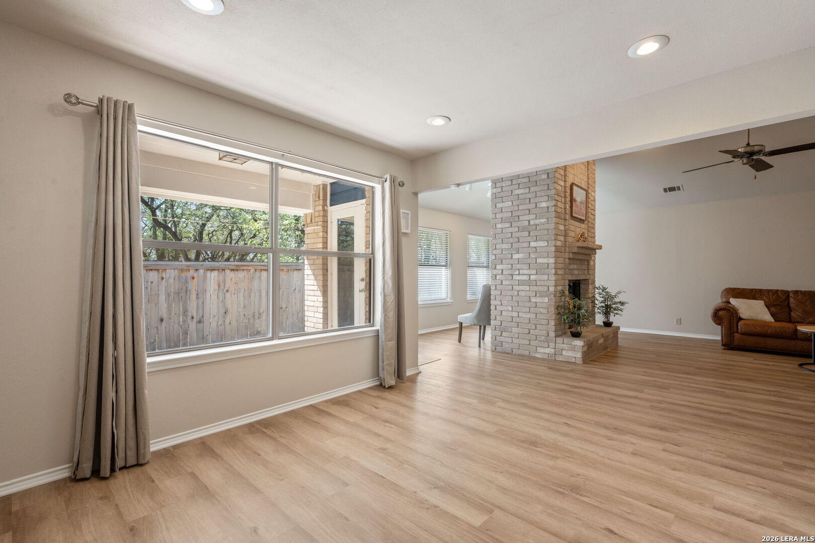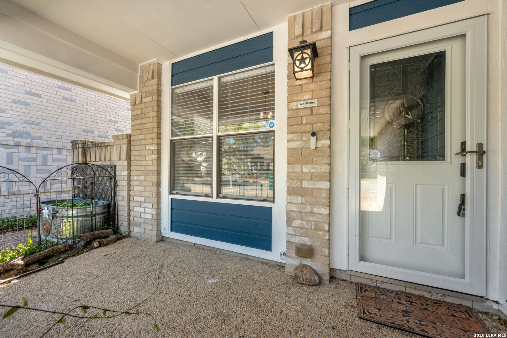 Well-maintained one-story 2-bedroom, 2-bath 4-sides brick garden home located on a cul-de-sac in Universal City. The open living area features a vaulted ceiling, floor-to-ceiling fireplace, wet bar, and a flexible nook overlooking the backyard. The kitchen offers ample cabinetry, counter space, and a bright breakfast area. All kitchen appliances, plus washer and dryer, convey. Recent updates include roof and skylights (2025), cordless blinds, exterior and interior paint, updated lighting, hardware, and new stove, dishwasher, and microwave (2026). The primary suite includes a double vanity, multiple closets, and a private bath. The secondary bedroom offers flexibility and access to a private patio. Fenced backyard backs to a green space for added privacy. Covered front and back patios, two-car garage, and additional parking pads. Conveniently located near Randolph Air Force Base, shopping, dining, and major highways. No HOA.