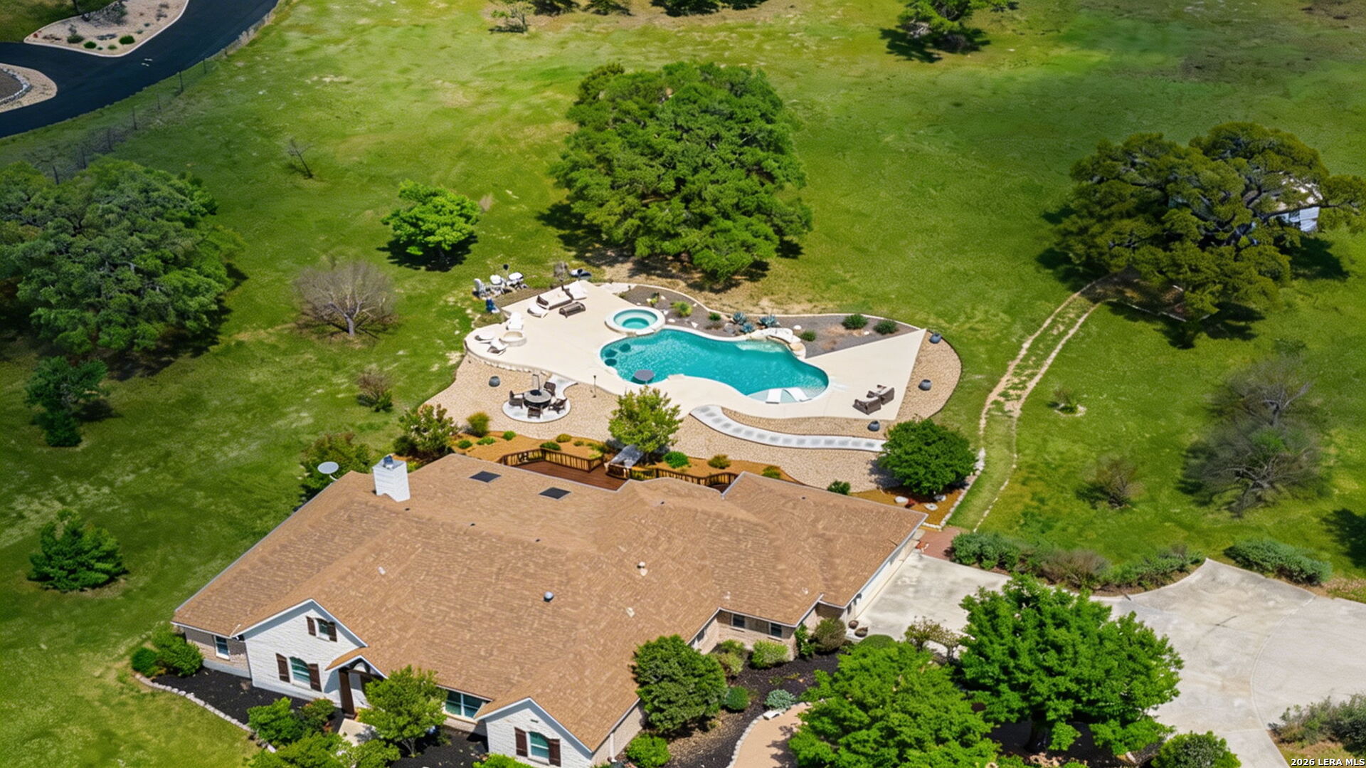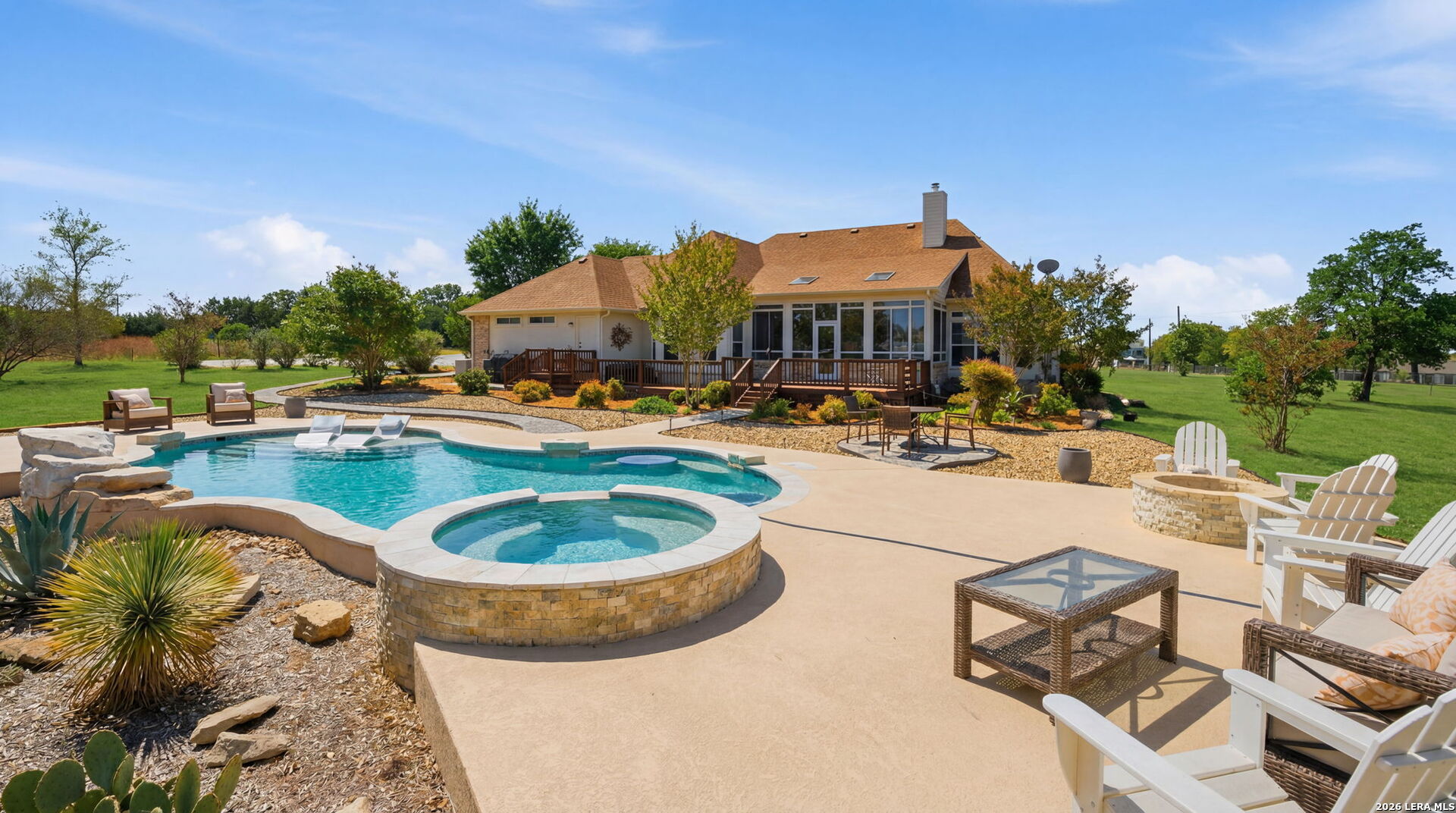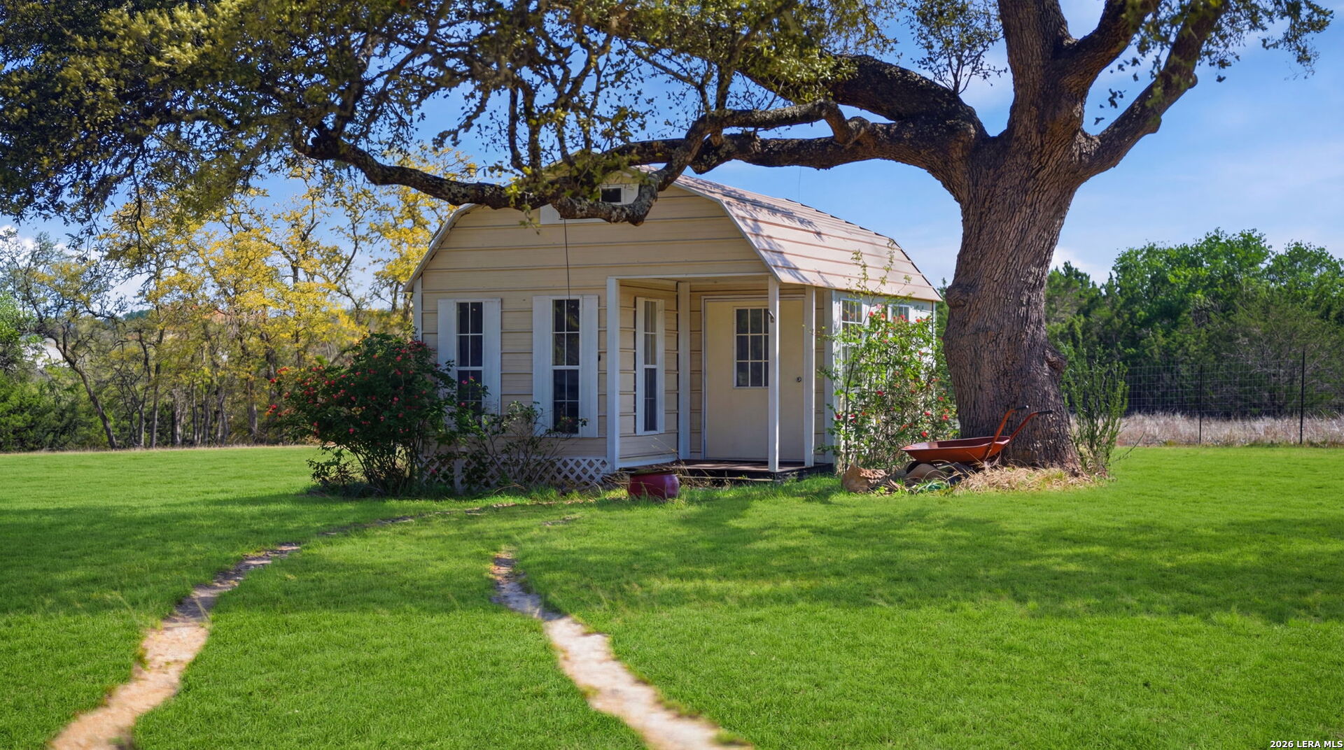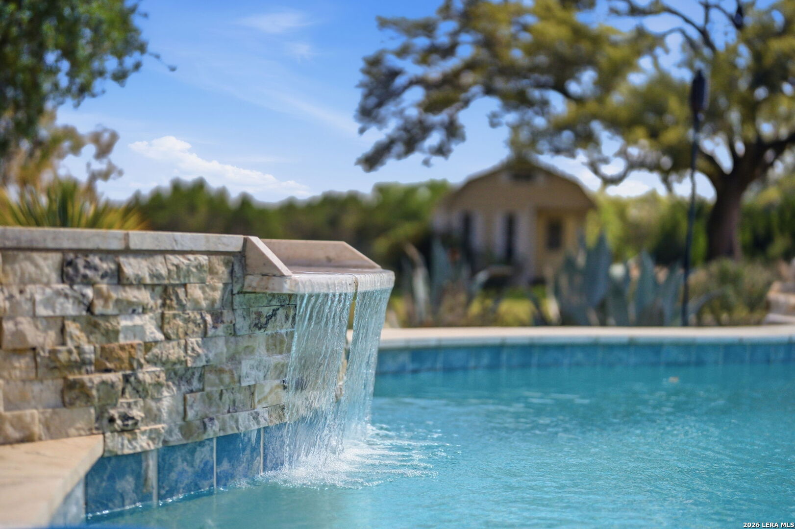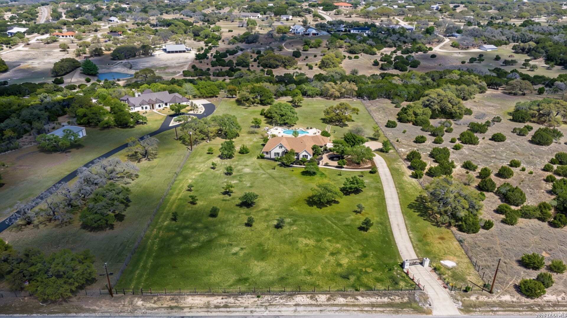Peaceful and secluded Hill Country retreat situated on 5 oak-studded acres, offering a true private country setting with gated entry and full perimeter fencing. This beautifully landscaped property features a one-story brick and rock home surrounded by mature trees, long-range views, and inviting outdoor spaces including an expansive wood deck, pool, hot tub, and multiple areas to relax and unwind. Inside, the home offers an open living area with hardwood floors, built-ins, and a floor-to-ceiling rock fireplace with wood-burning stove. The chef's kitchen includes stainless steel appliances, double ovens, a center island, and breakfast bar, flowing seamlessly into a bright dining area. The private primary suite features outdoor access and a European-style bath, while the split floorplan offers spacious secondary bedrooms and a dedicated study with flexibility for formal dining. A glass-enclosed patio provides year-round enjoyment of the scenic surroundings. Additional highlights include an artist studio or cottage with A/C, tool shed, oversized garage, and ample storage. This property offers the perfect blend of comfort, privacy, and Hill Country charm.