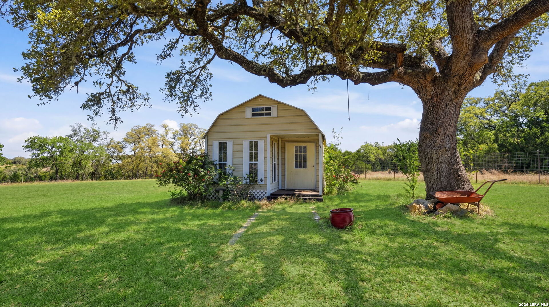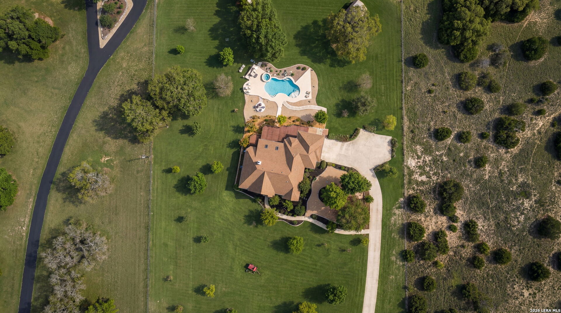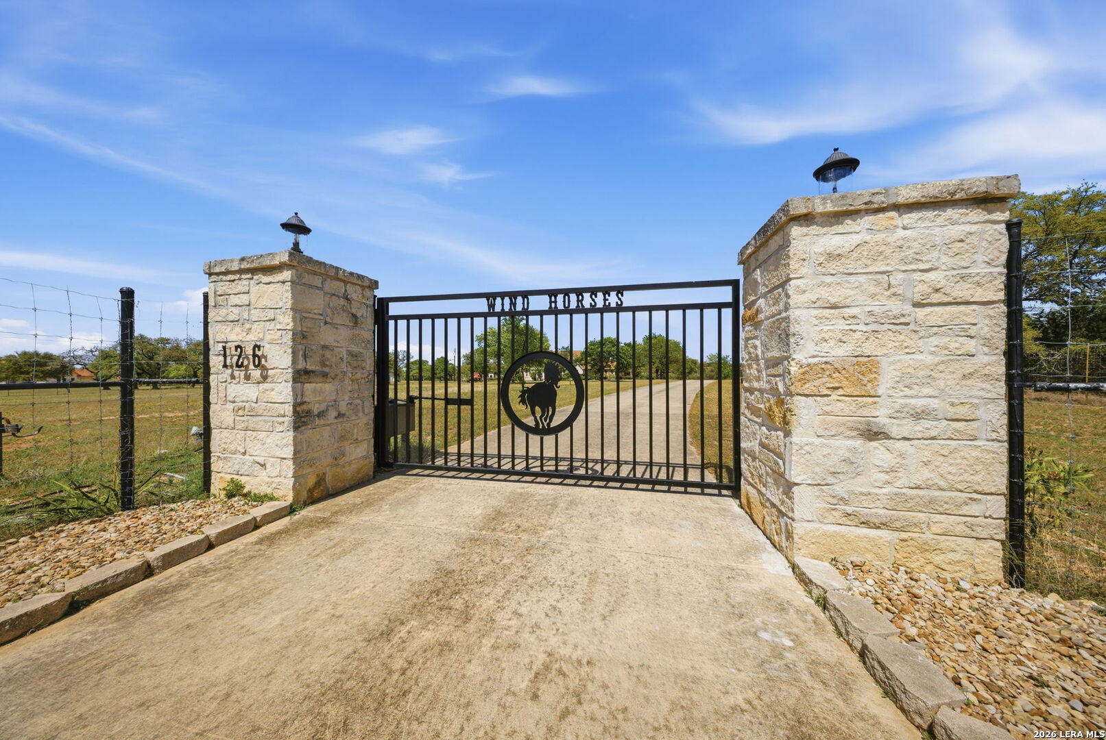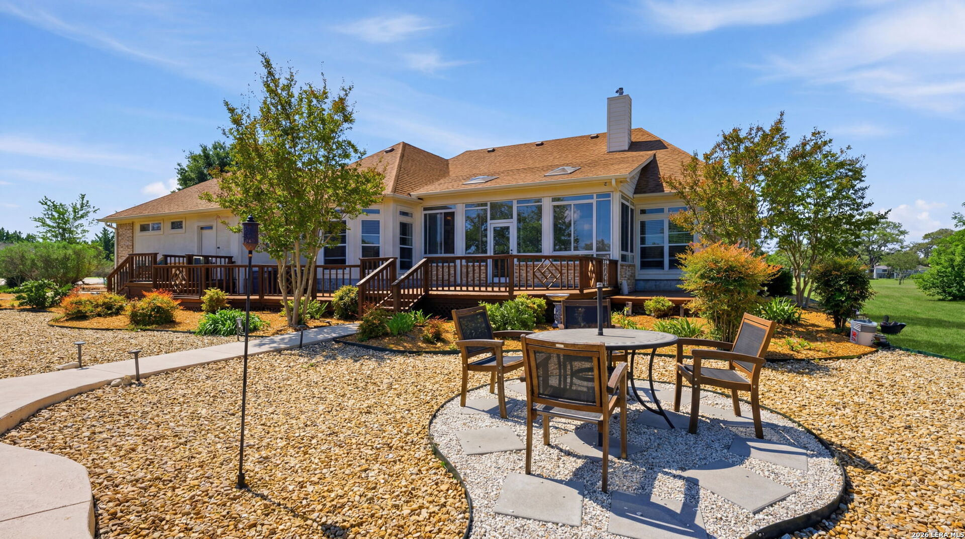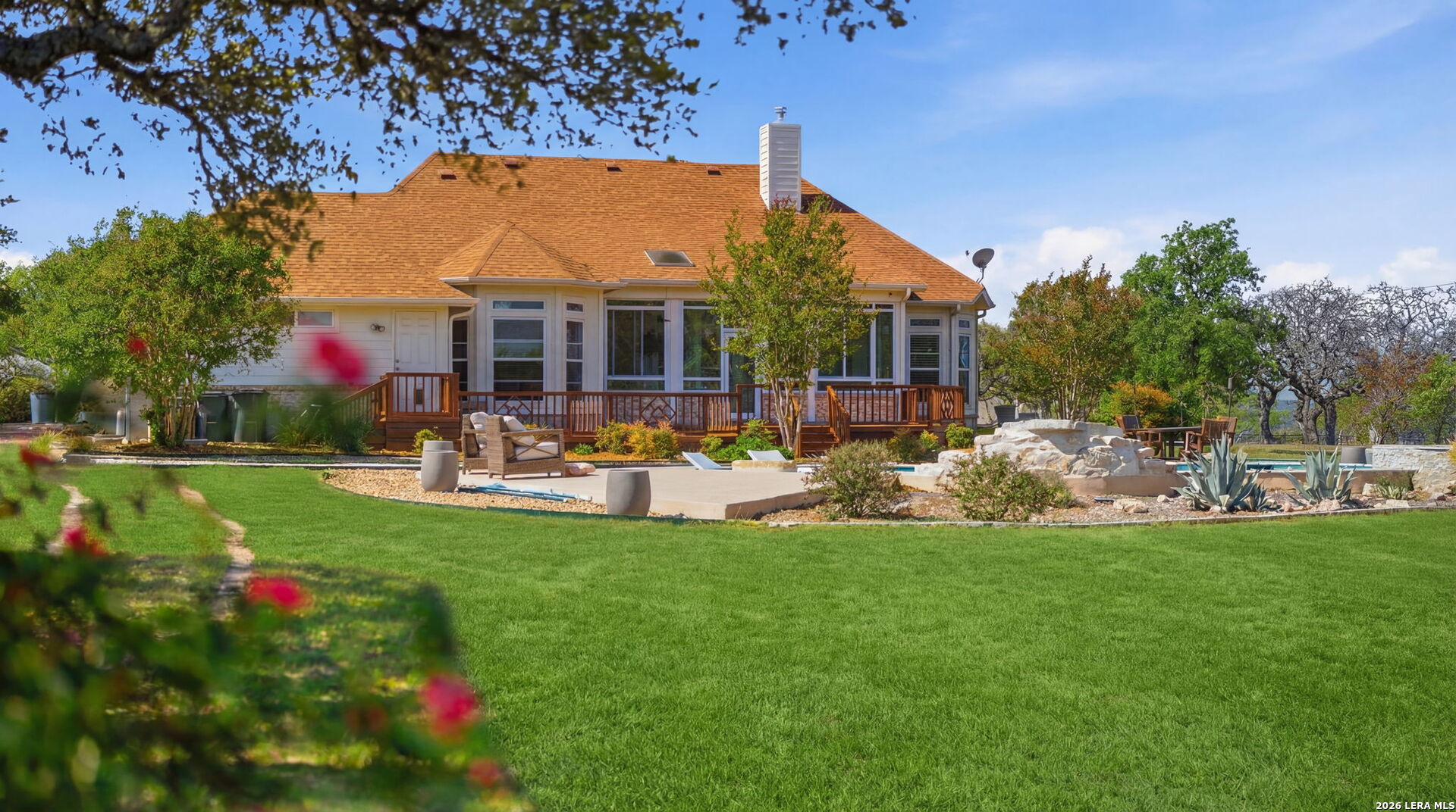 Peaceful and secluded Hill Country retreat situated on 5 oak-studded acres, offering a true private country setting with gated entry and full perimeter fencing. This beautifully landscaped property features a one-story brick and rock home surrounded by mature trees, long-range views, and inviting outdoor spaces including an expansive wood deck, pool, hot tub, and multiple areas to relax and unwind. Inside, the home offers an open living area with hardwood floors, built-ins, and a floor-to-ceiling rock fireplace with wood-burning stove. The chef's kitchen includes stainless steel appliances, double ovens, a center island, and breakfast bar, flowing seamlessly into a bright dining area. The private primary suite features outdoor access and a European-style bath, while the split floorplan offers spacious secondary bedrooms and a dedicated study with flexibility for formal dining. A glass-enclosed patio provides year-round enjoyment of the scenic surroundings. Additional highlights include an artist studio or cottage with A/C, tool shed, oversized garage, and ample storage. This property offers the perfect blend of comfort, privacy, and Hill Country charm.