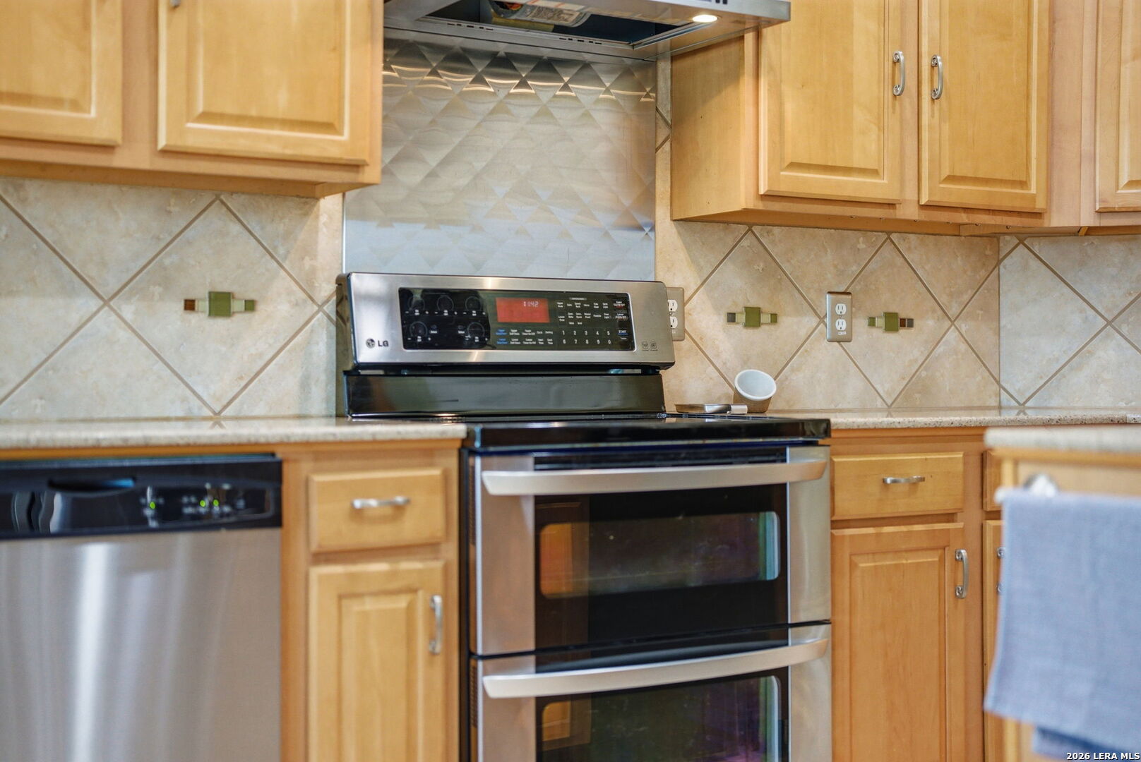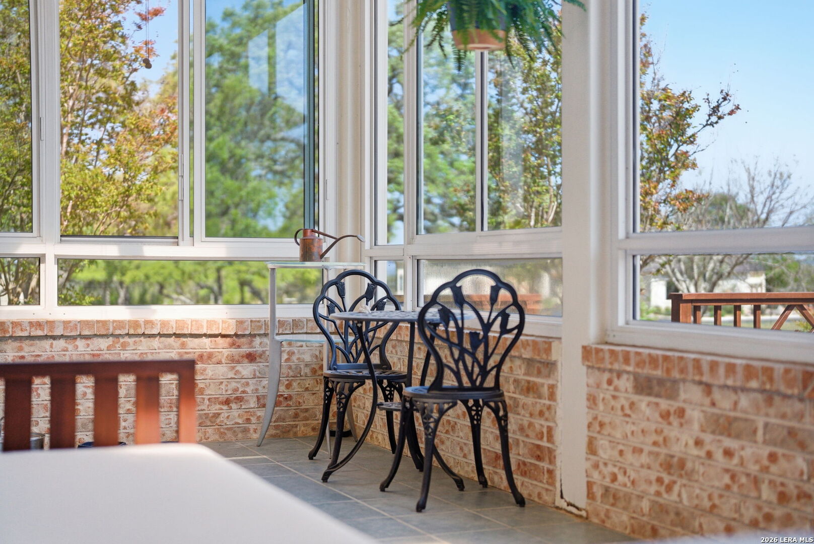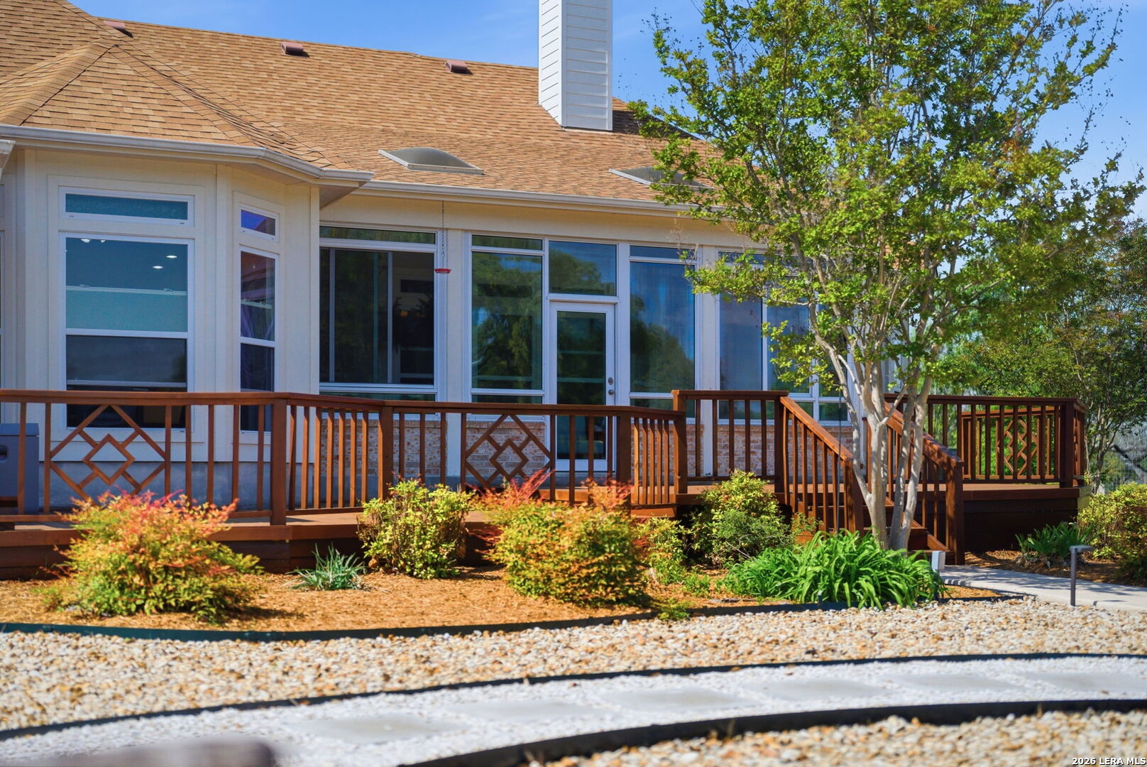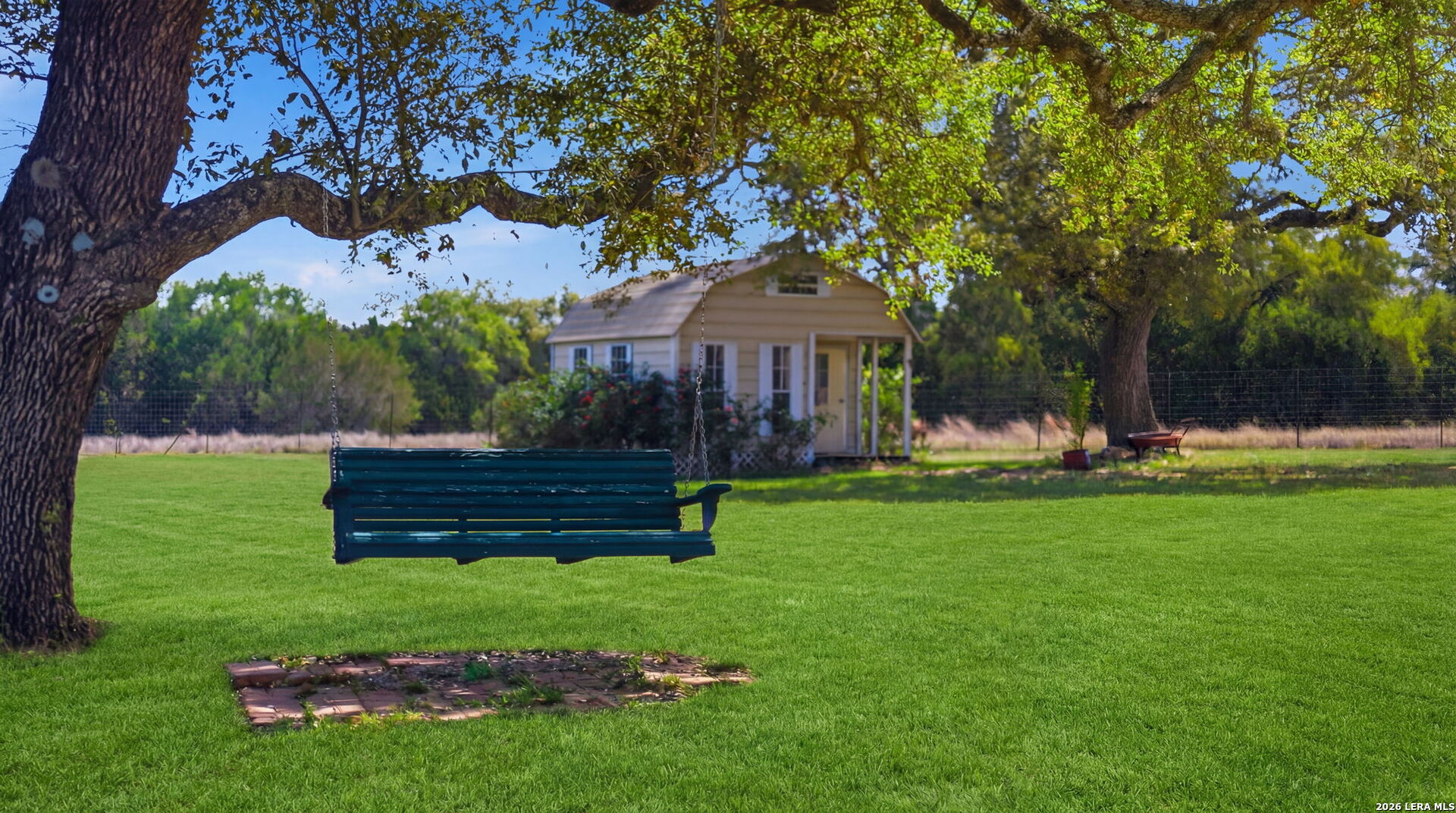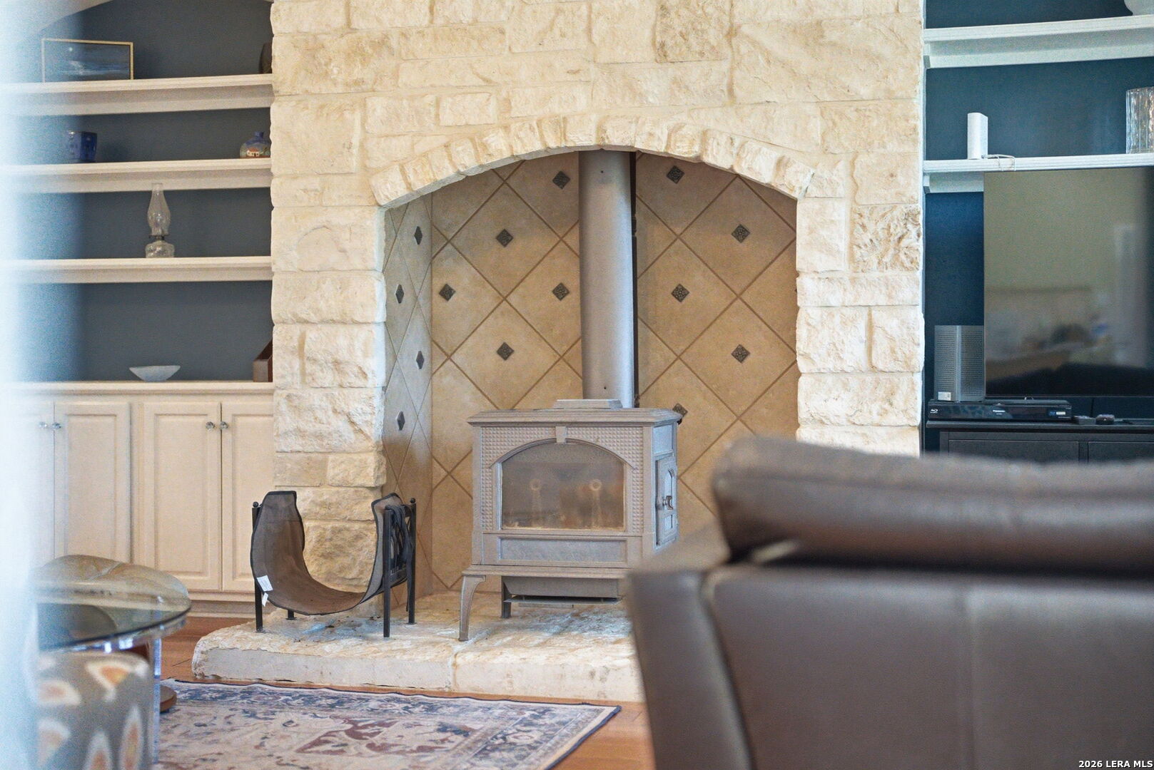 Peaceful and secluded Hill Country retreat situated on 5 oak-studded acres, offering a true private country setting with gated entry and full perimeter fencing. This beautifully landscaped property features a one-story brick and rock home surrounded by mature trees, long-range views, and inviting outdoor spaces including an expansive wood deck, pool, hot tub, and multiple areas to relax and unwind. Inside, the home offers an open living area with hardwood floors, built-ins, and a floor-to-ceiling rock fireplace with wood-burning stove. The chef's kitchen includes stainless steel appliances, double ovens, a center island, and breakfast bar, flowing seamlessly into a bright dining area. The private primary suite features outdoor access and a European-style bath, while the split floorplan offers spacious secondary bedrooms and a dedicated study with flexibility for formal dining. A glass-enclosed patio provides year-round enjoyment of the scenic surroundings. Additional highlights include an artist studio or cottage with A/C, tool shed, oversized garage, and ample storage. This property offers the perfect blend of comfort, privacy, and Hill Country charm.