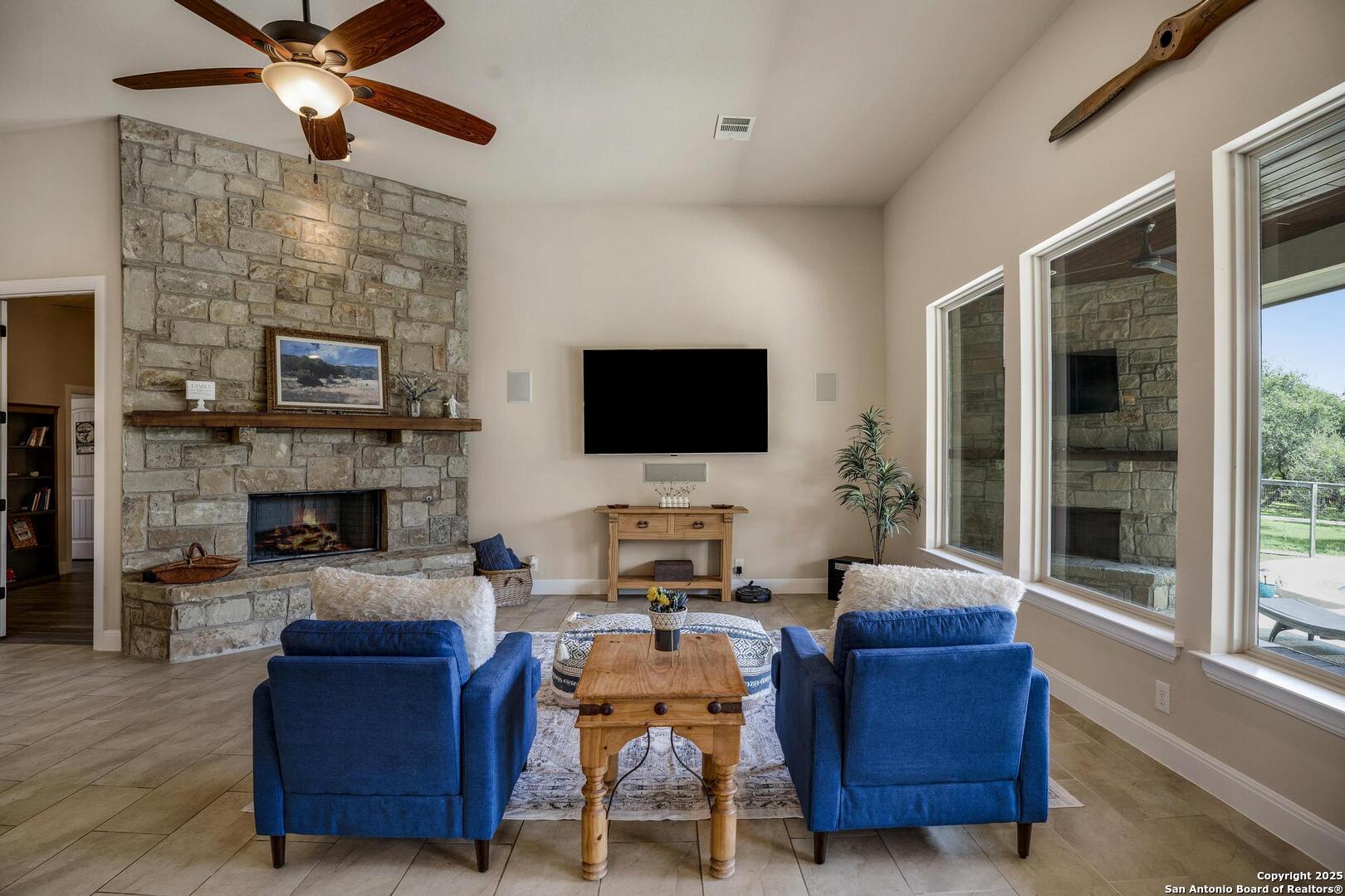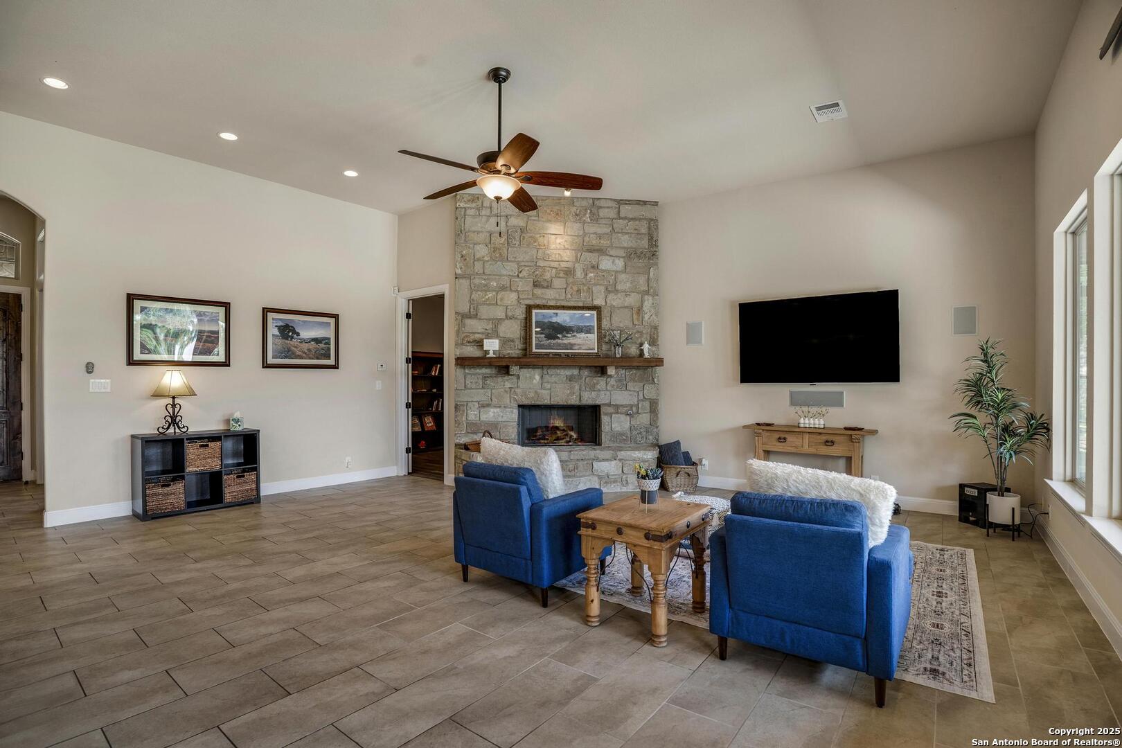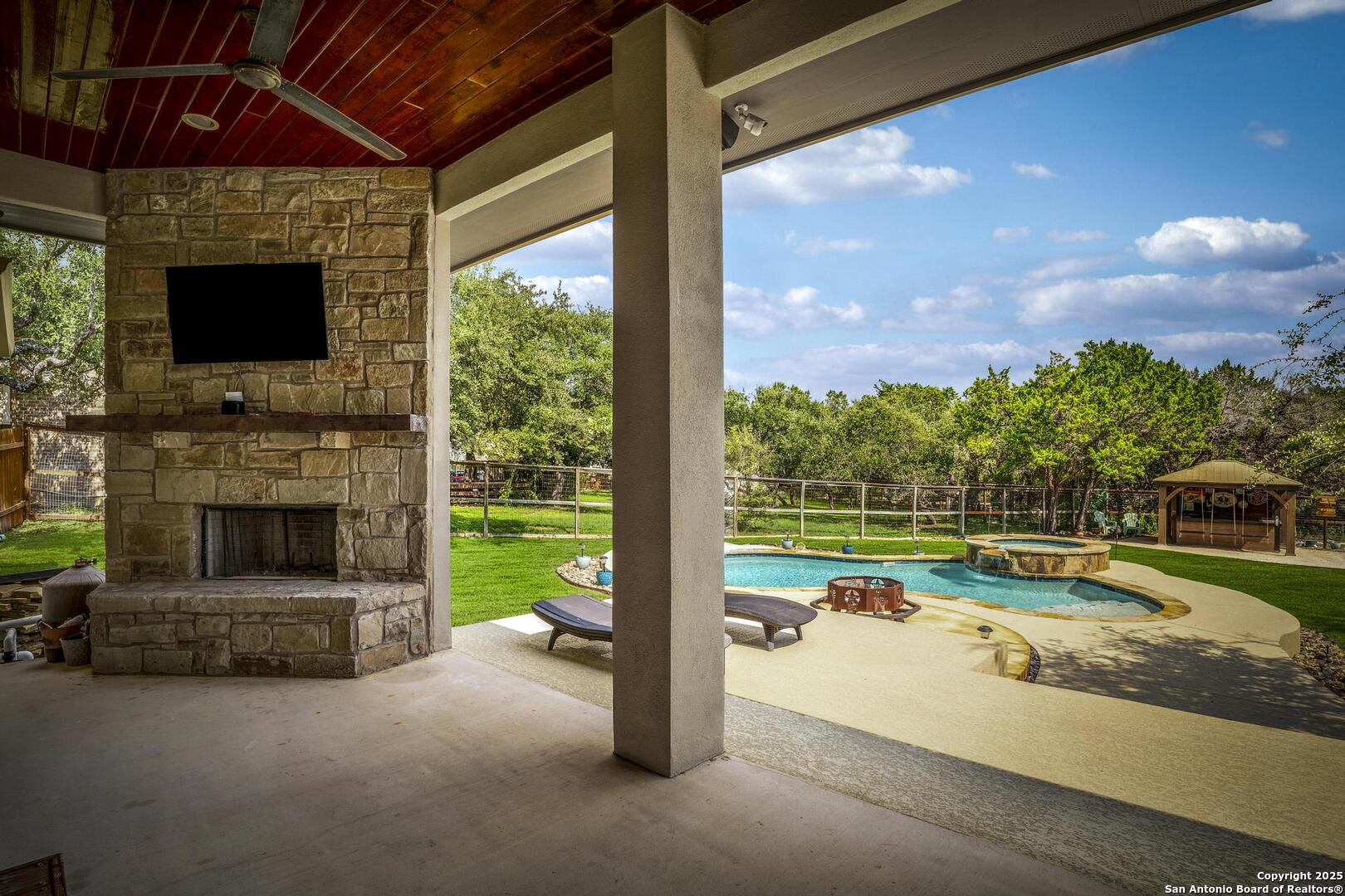 Welcome to 126 Mountain Echo. This gorgeous custom home is located in the coveted neighborhood of Timberwood Park and it has a contemporary Hillcountry style. It features mostly first floor living with the media room upstairs. As you walk in you will notice the high ceilings and the expansive great room with the adjacent chefs kitchen and butler's pantry. The main bedroom features a spa like bathroom with a soaking tub, and large walk in closet. As you step outside you will be received by resort like vibes from the beautiful pool to the well manicured lawn. If you keep walking back you will encounter the Tiki bar, complete with sand and all. Truly an entertainers paradise