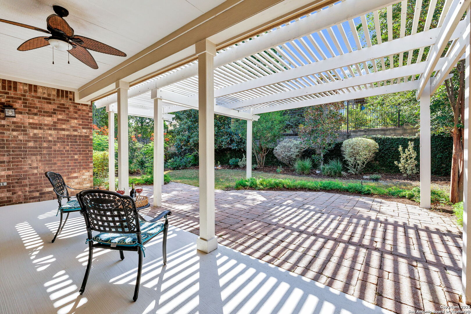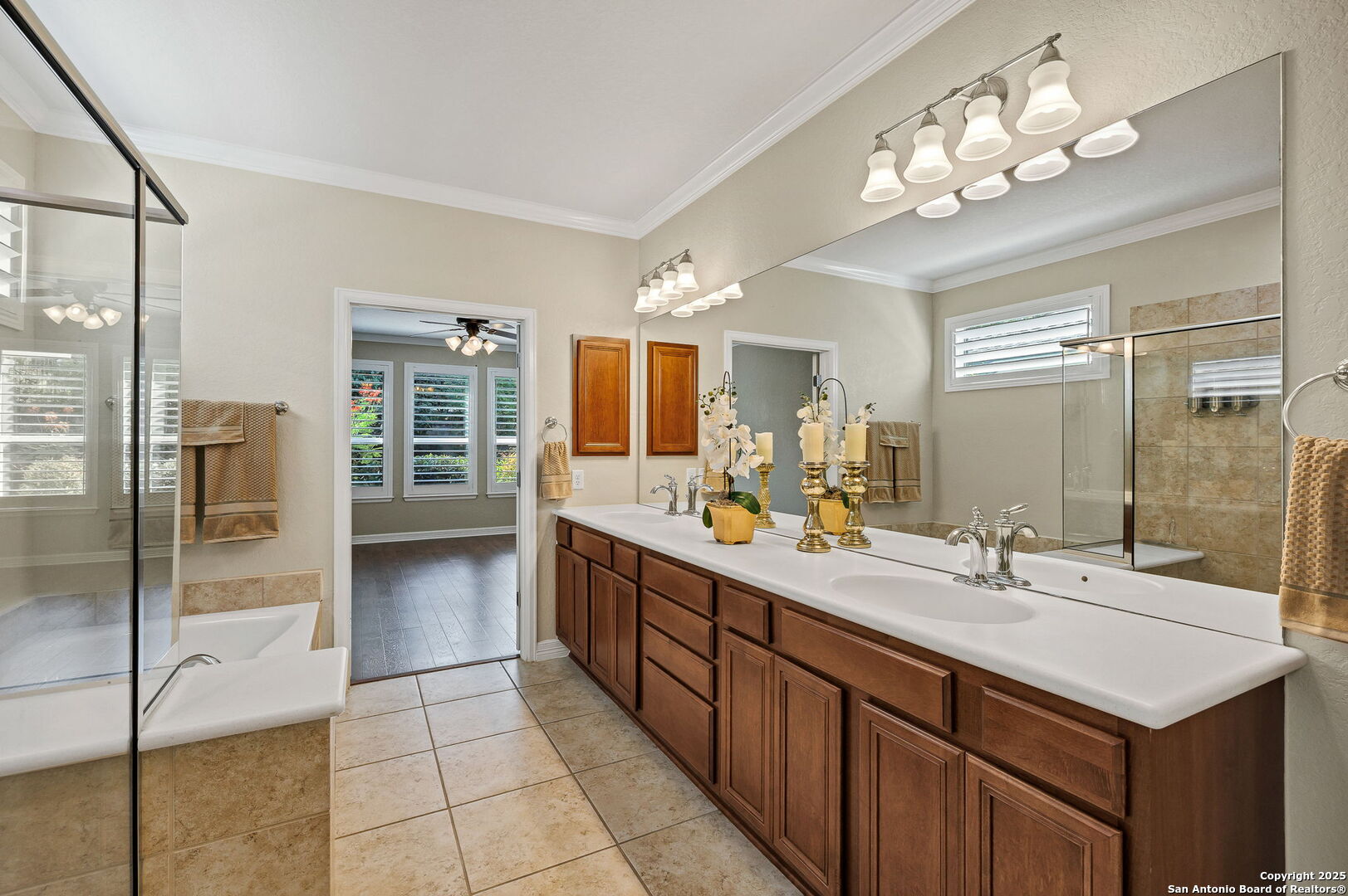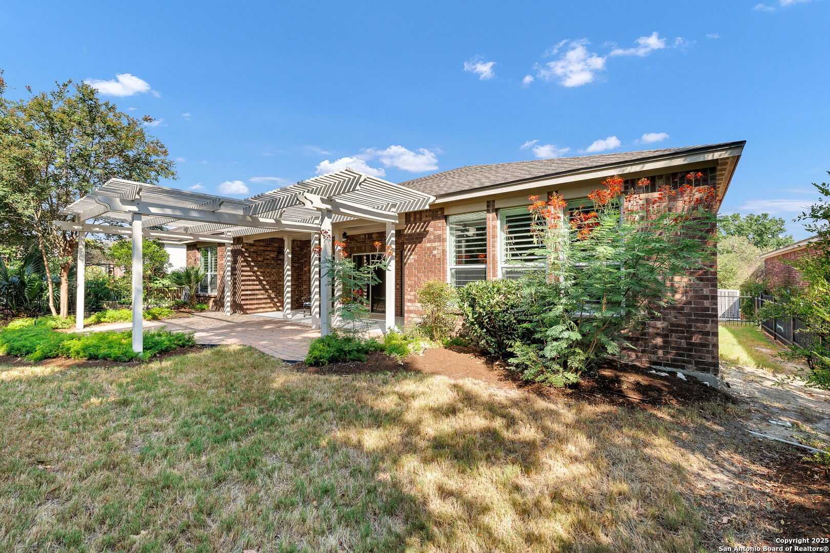 OPEN HOUSE SUNDAY NOVEMBER 9, 1-3 PM. IMPECCABLY MAINTAINED HOME IN PRESTIGIOUS DEL WEBB 55+ PREMIER ADULT COMMUNITY. THIS 2678 SQ/FT HOME BOASTS 3 BEDROOMS EACH WITH ITS OWN ON-SUITE BATH; AND ADDITIONAL 1/2 BATH. ELEGANT LARGE TILE FLOORS IN LIVING AREAS, LAMINATE IN BEDROOMS AND DEN, NO CARPET HERE! ELEGANT PLANTATION SHUTTERS THROUGHOUT. SPACIOUS CHEF'S DELIGHT KITCHEN WITH CENTER ISLAND, GRANITE COUNTERS AND AN AMAZING WALK IN PANTRY. NESTLED ON SPRAWLING PRIVATE LOT ON PEACEFUL STREET. OVERSIZED GARAGE, MOVE-IN READY! ROOF AND HVAC REPLACED IN 2021. THE COMMUNITY RESORT CENTER FEATURES BALLROOM, MEETING ROOMS, LIBRARY, STATE OF THE ART GYM, INDOOR POOL AND SPA, 2 OUTDOOR POOLS, PICKLE BALL AND MUCH MORE! IT'S TIME TO PACK YOUR BAGS AND GET READY TO ENJOY THE GOOD LIFE AT DEL WEBB SAN ANTONIO HILL COUNTRY RETREAT!
