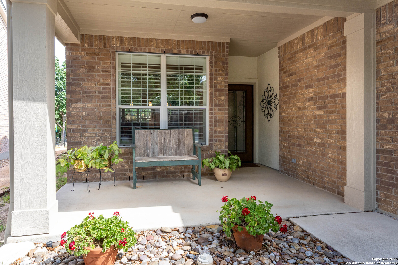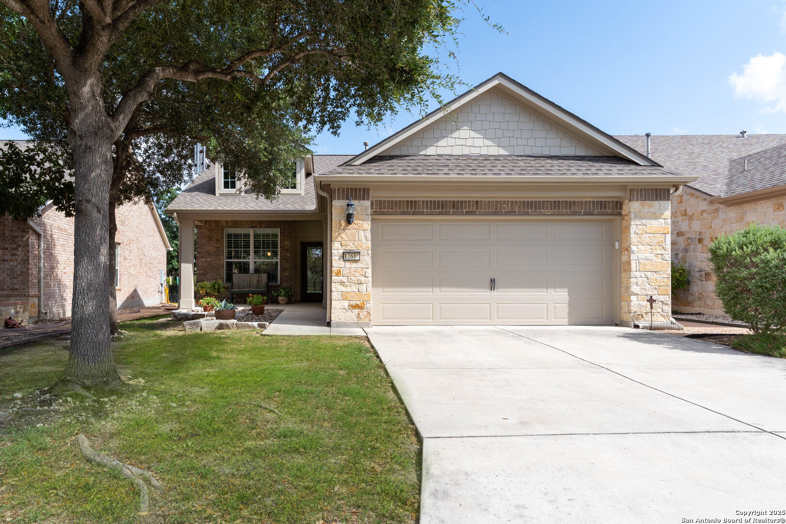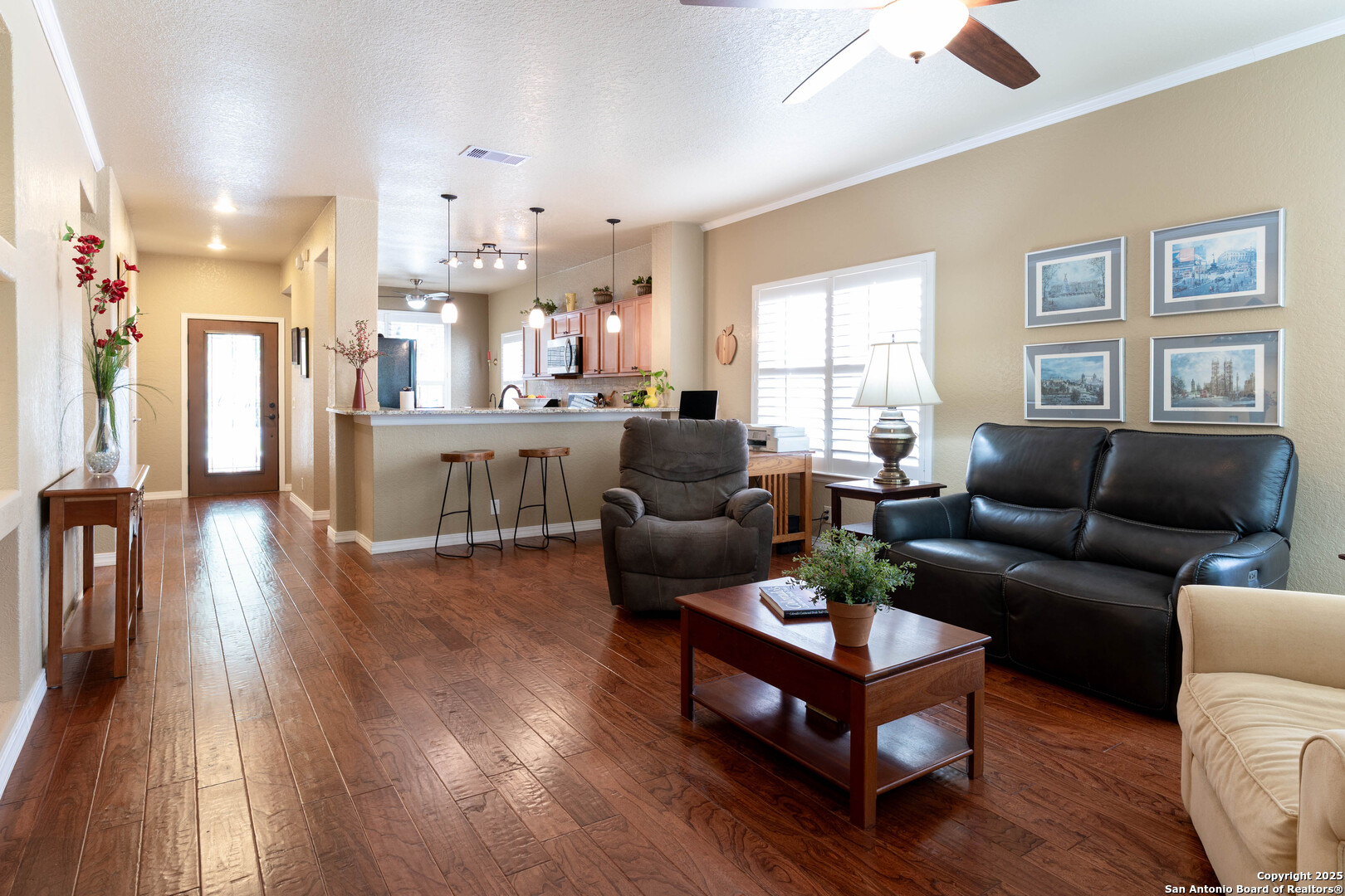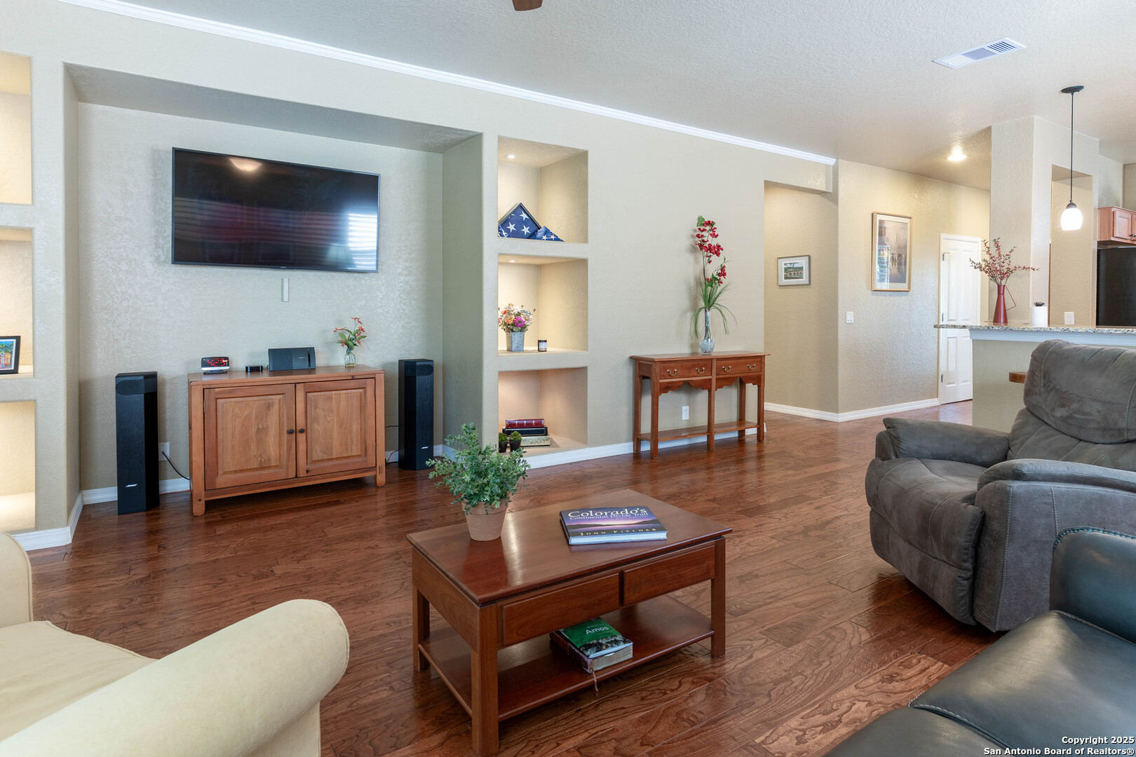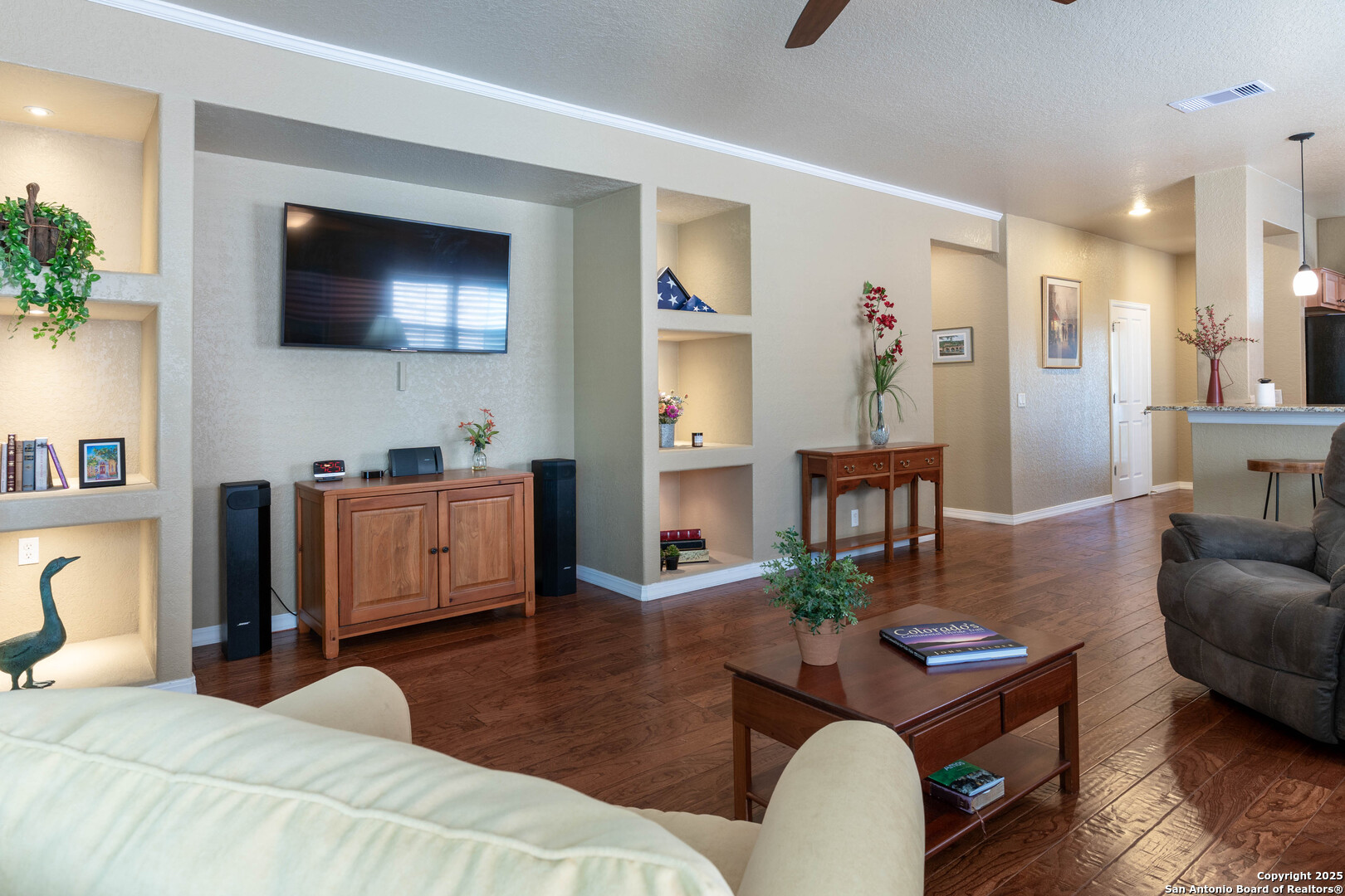STUNNING SINGLE STORY ON CUL-DE-SAC!! Welcome to easy living in this beautifully maintained, move-in ready home located in the desirable Del Webb 55+ Hill Country Retreat community. Designed for comfort and style, this home features high ceilings, stunning wood floors, plantation shutters, and a neutral color palette throughout. The open floor plan is filled with natural light and includes a sun-kissed breakfast nook and a granite island kitchen with gas cooking and refrigerator included. The spacious living area showcases elegant built-in lighted display niches, adding warmth and character to the space. The well-sized primary enjoys numerous windows and elegant wood flooring while the ensuite offers an upgraded vanity and mirrors, a beautifully tiled walk-in shower with ramp access and custom closet updates. A secondary bedroom and second full bath provide added flexibility. Enjoy quiet afternoons on the screened-in porch surrounded by mature oak trees. Recent updates include a new water heater (2025), HVAC (2023), roof (2021) with transferrable warranty, and fresh exterior paint (2024). Additional highlights include upgraded ceiling fans and lighting, gutters, and an oversized garage with storage. Community amenities include indoor and two outdoor pools, a state-of-the-art gym, and vibrant social activities.