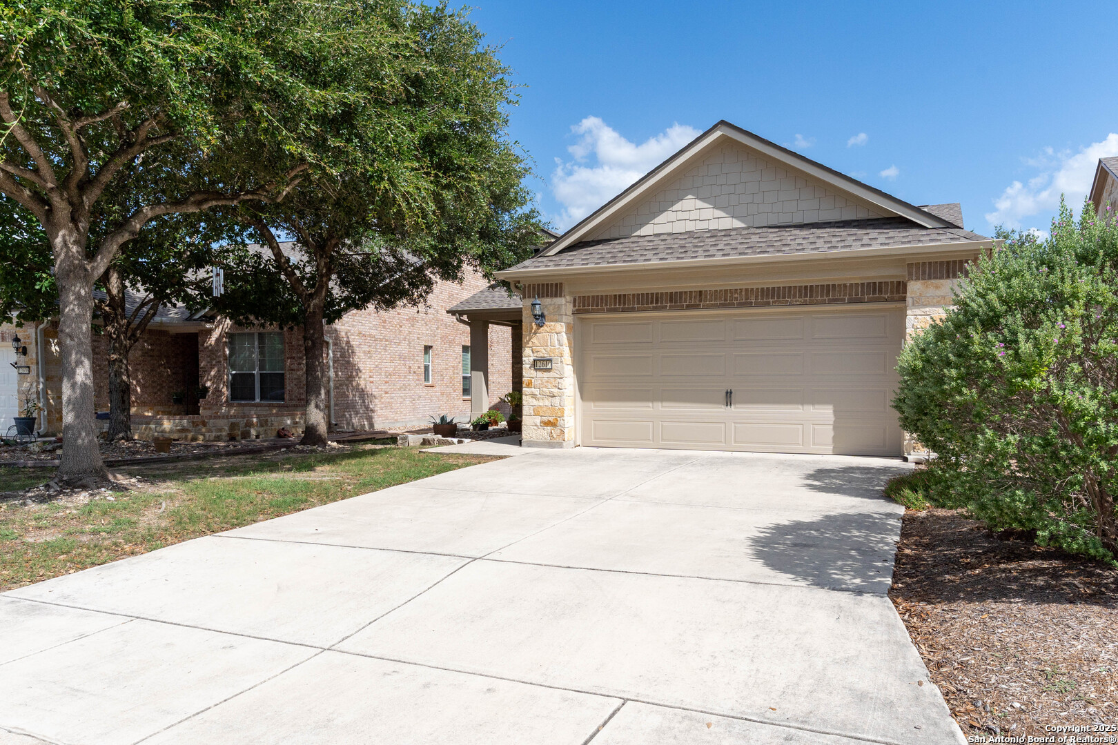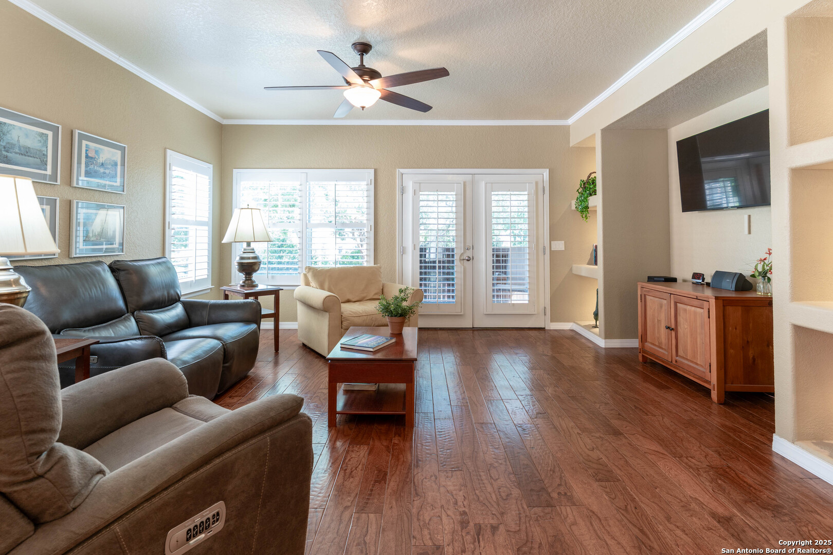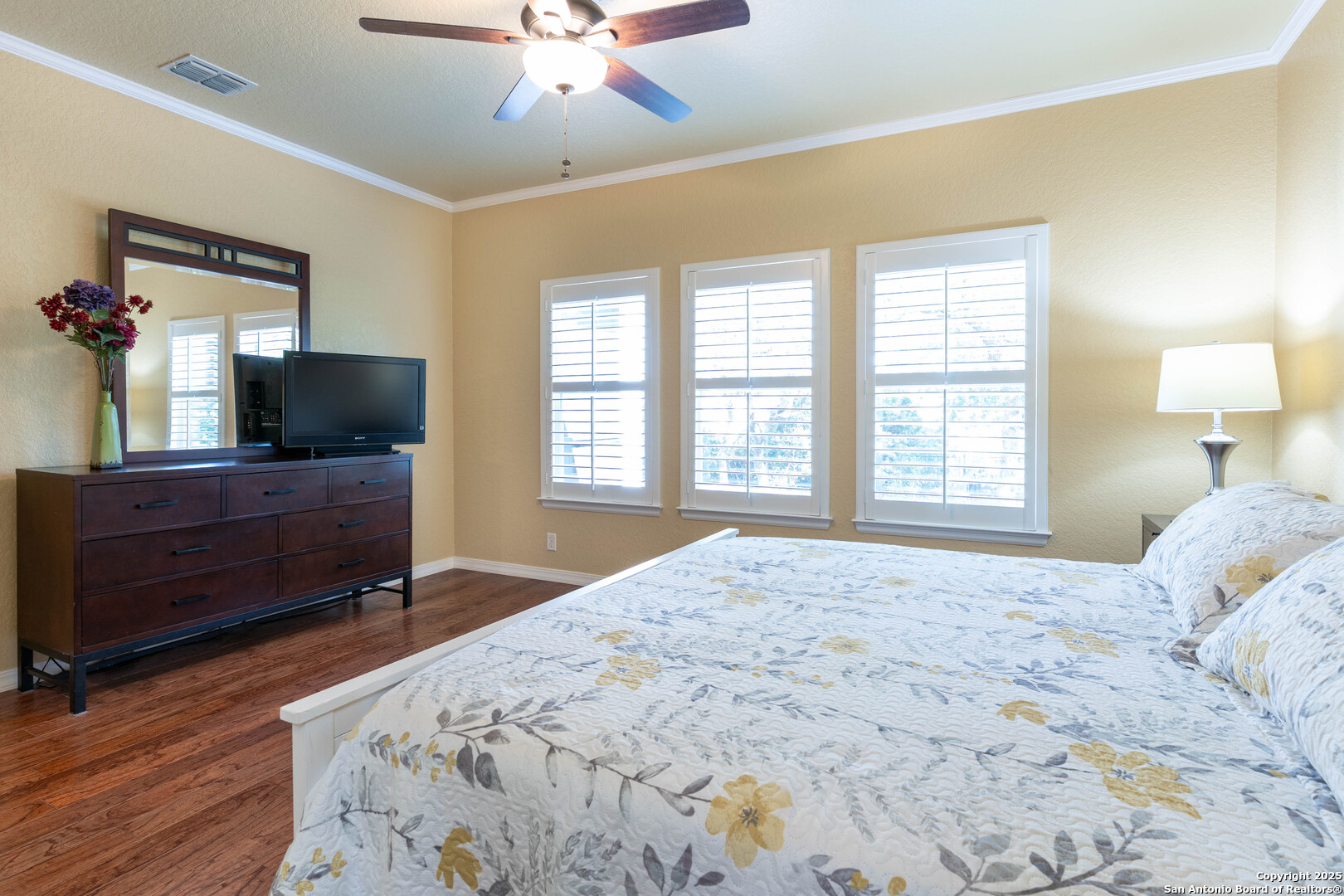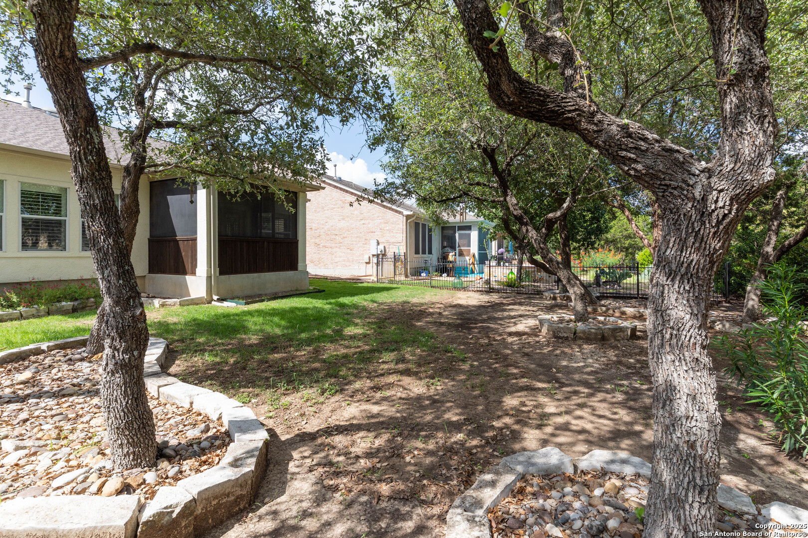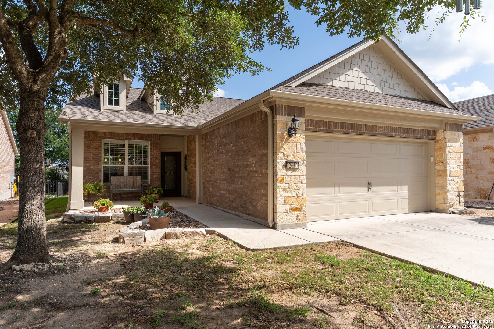 STUNNING SINGLE STORY ON CUL-DE-SAC!! Welcome to easy living in this beautifully maintained, move-in ready home located in the desirable Del Webb 55+ Hill Country Retreat community. Designed for comfort and style, this home features high ceilings, stunning wood floors, plantation shutters, and a neutral color palette throughout. The open floor plan is filled with natural light and includes a sun-kissed breakfast nook and a granite island kitchen with gas cooking and refrigerator included. The spacious living area showcases elegant built-in lighted display niches, adding warmth and character to the space. The well-sized primary enjoys numerous windows and elegant wood flooring while the ensuite offers an upgraded vanity and mirrors, a beautifully tiled walk-in shower with ramp access and custom closet updates. A secondary bedroom and second full bath provide added flexibility. Enjoy quiet afternoons on the screened-in porch surrounded by mature oak trees. Recent updates include a new water heater (2025), HVAC (2023), roof (2021) with transferrable warranty, and fresh exterior paint (2024). Additional highlights include upgraded ceiling fans and lighting, gutters, and an oversized garage with storage. Community amenities include indoor and two outdoor pools, a state-of-the-art gym, and vibrant social activities.