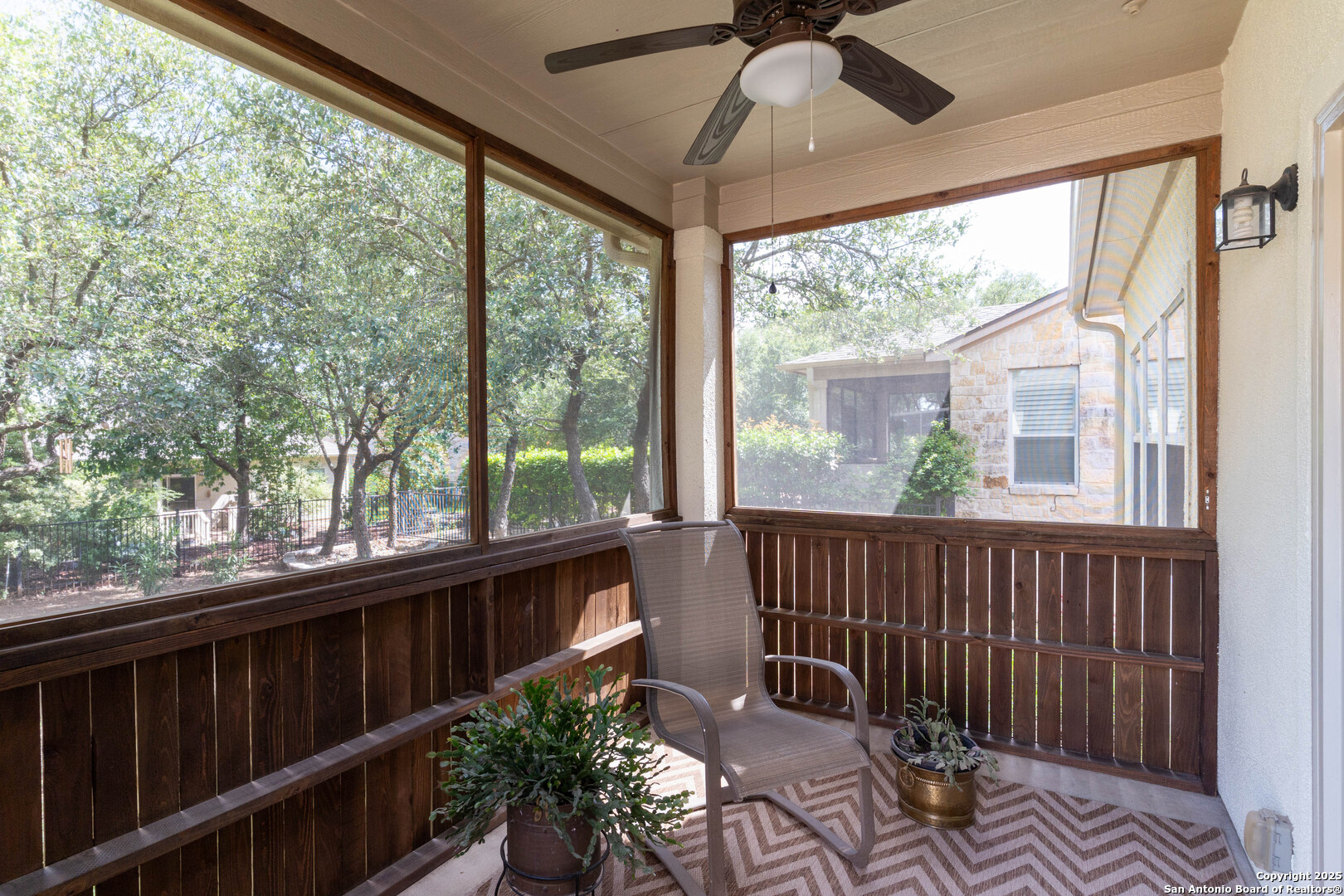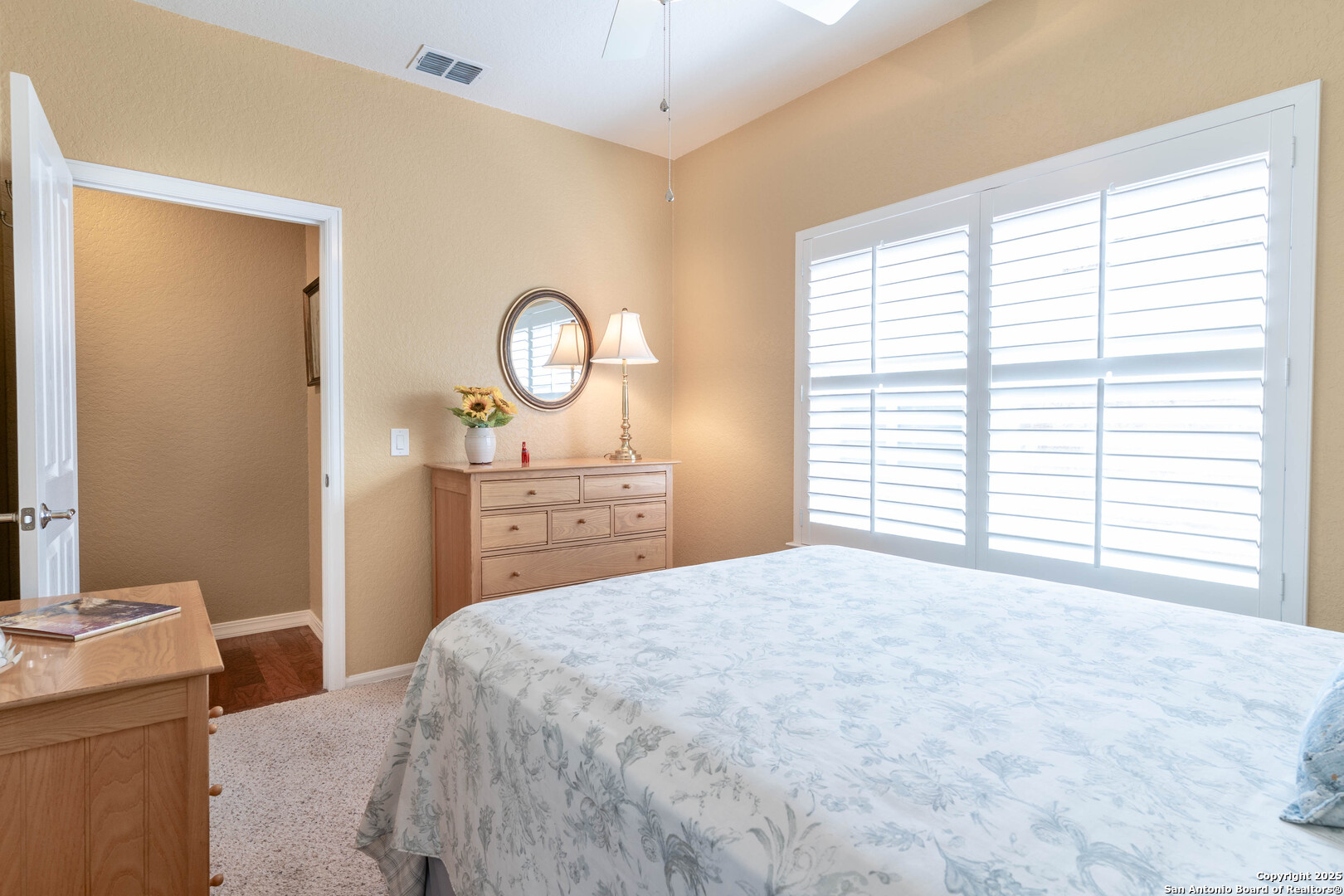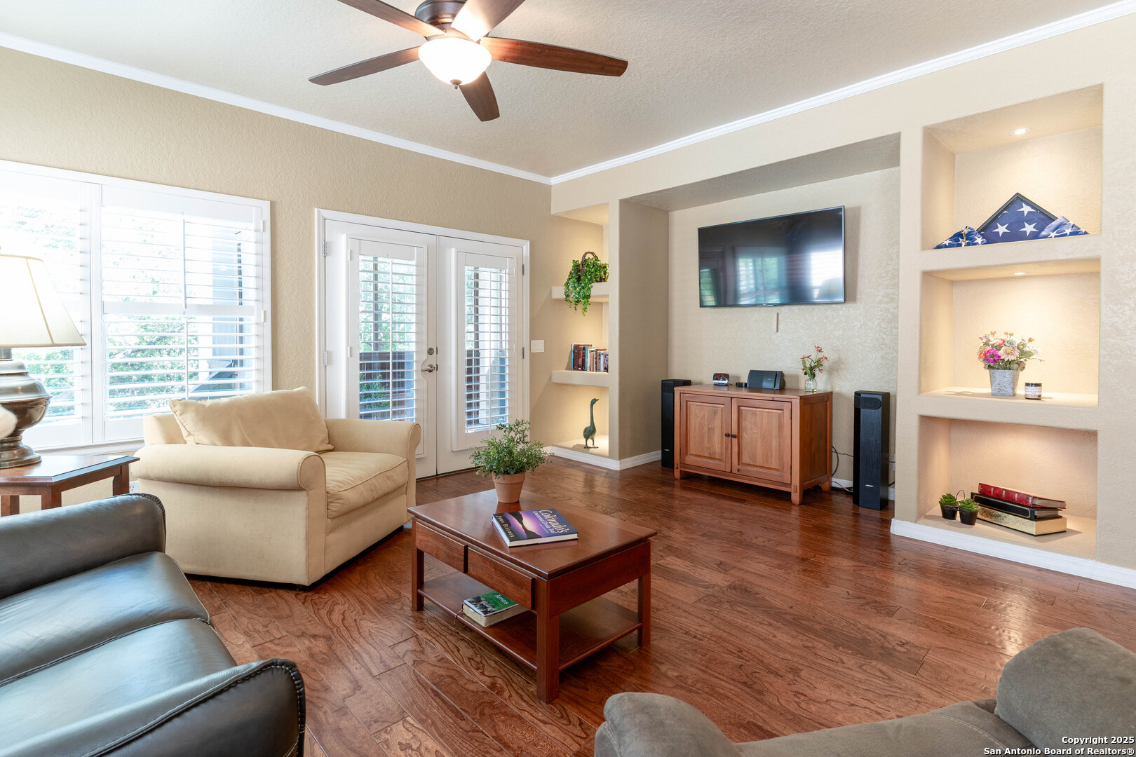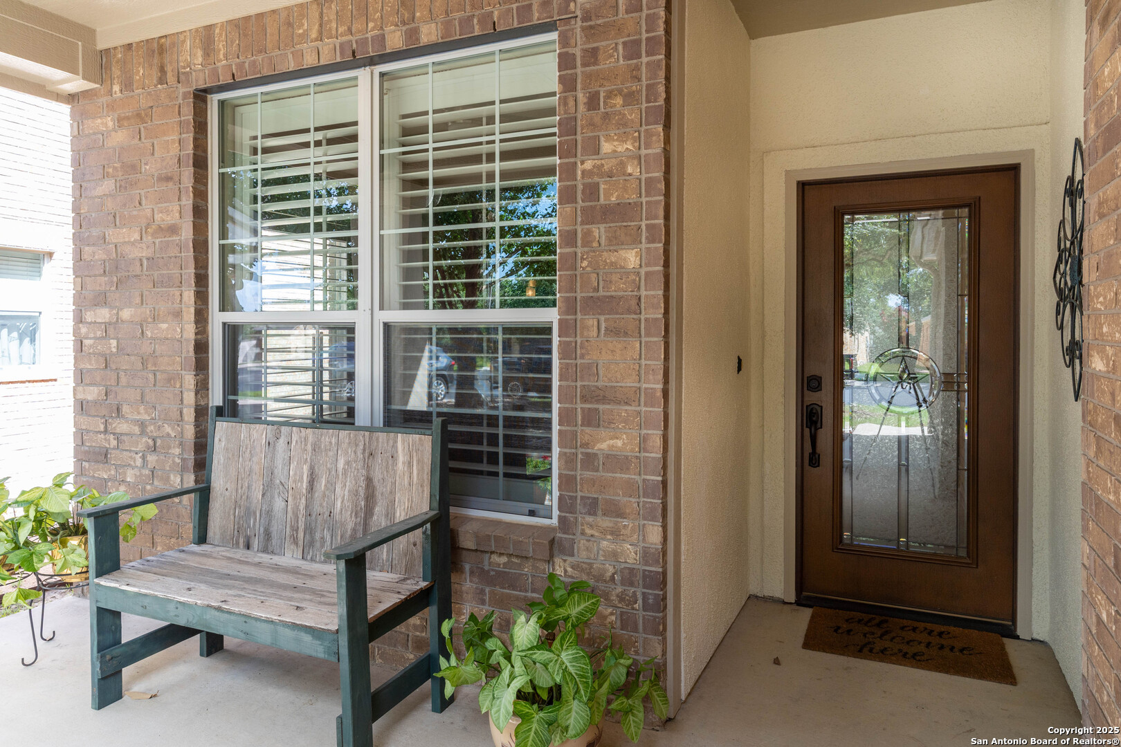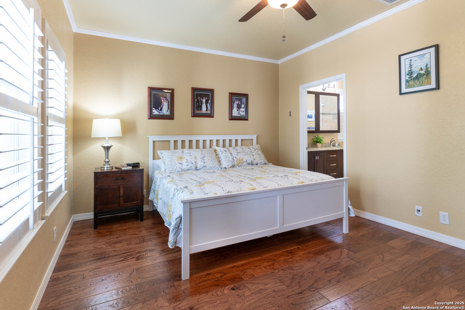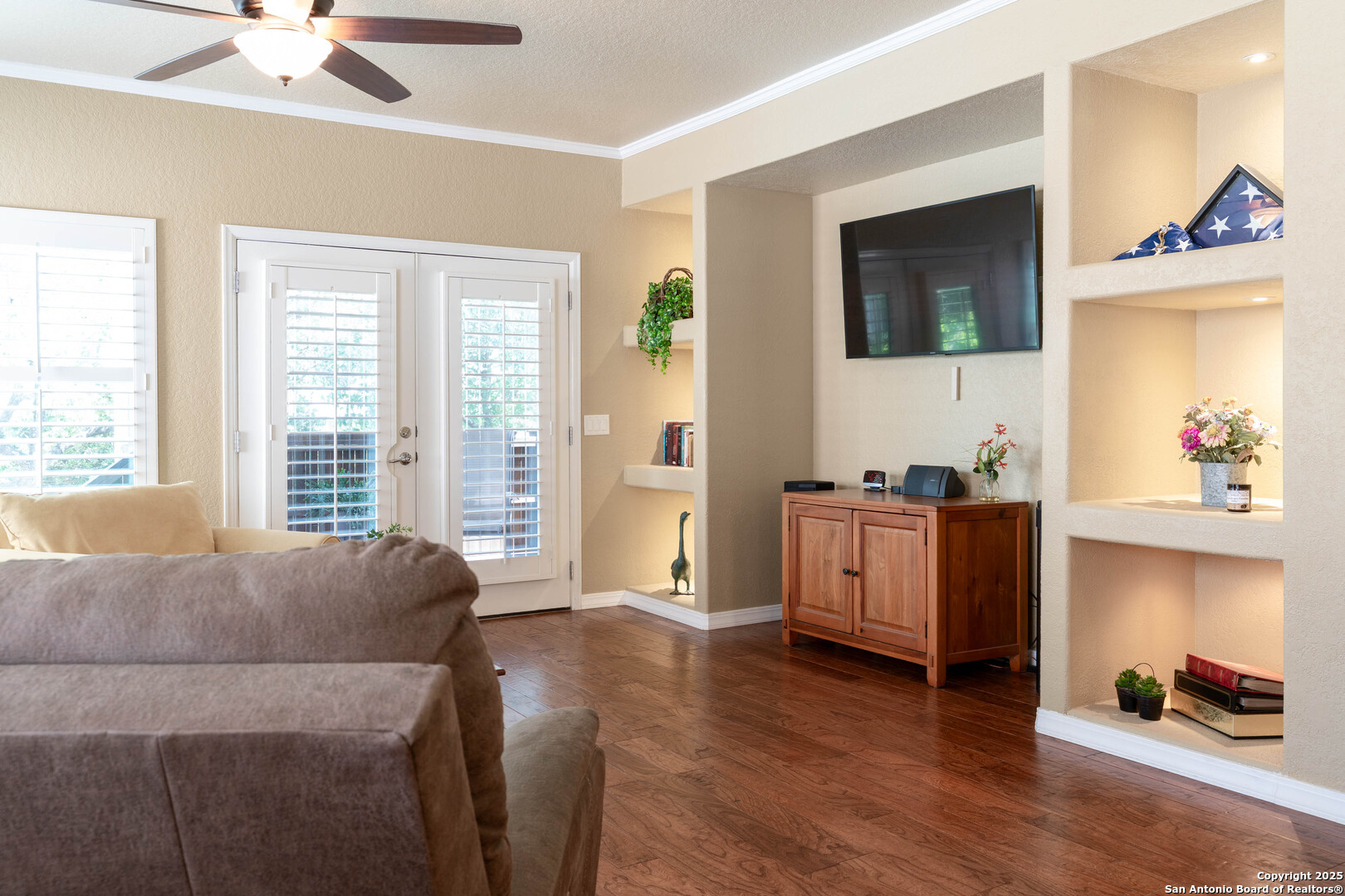 STUNNING SINGLE STORY ON CUL-DE-SAC!! Welcome to easy living in this beautifully maintained, move-in ready home located in the desirable Del Webb 55+ Hill Country Retreat community. Designed for comfort and style, this home features high ceilings, stunning wood floors, plantation shutters, and a neutral color palette throughout. The open floor plan is filled with natural light and includes a sun-kissed breakfast nook and a granite island kitchen with gas cooking and refrigerator included. The spacious living area showcases elegant built-in lighted display niches, adding warmth and character to the space. The well-sized primary enjoys numerous windows and elegant wood flooring while the ensuite offers an upgraded vanity and mirrors, a beautifully tiled walk-in shower with ramp access and custom closet updates. A secondary bedroom and second full bath provide added flexibility. Enjoy quiet afternoons on the screened-in porch surrounded by mature oak trees. Recent updates include a new water heater (2025), HVAC (2023), roof (2021) with transferrable warranty, and fresh exterior paint (2024). Additional highlights include upgraded ceiling fans and lighting, gutters, and an oversized garage with storage. Community amenities include indoor and two outdoor pools, a state-of-the-art gym, and vibrant social activities.