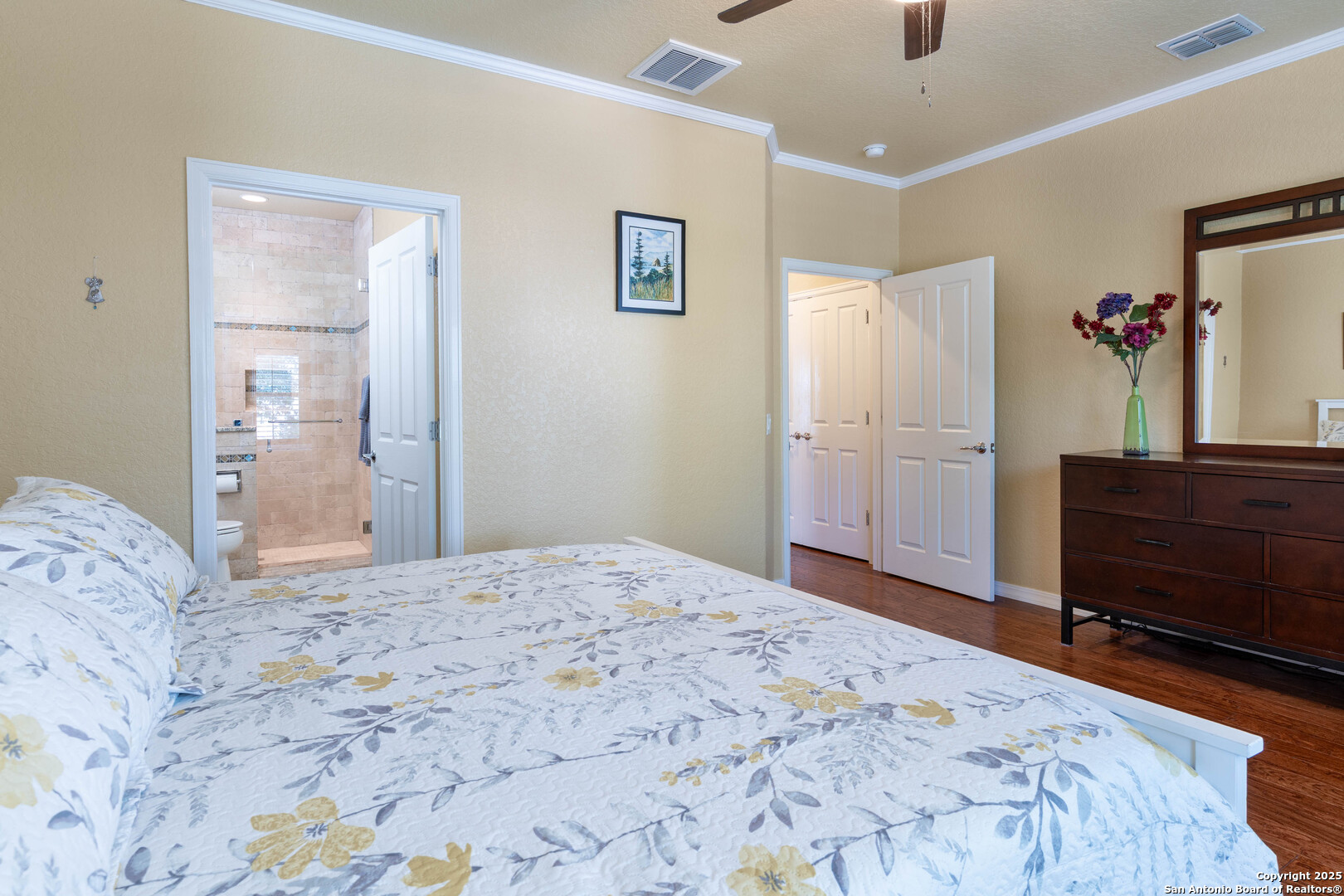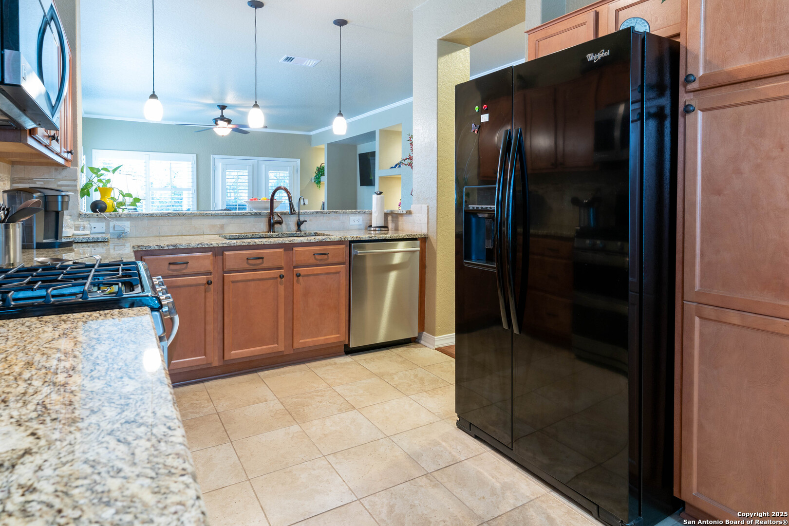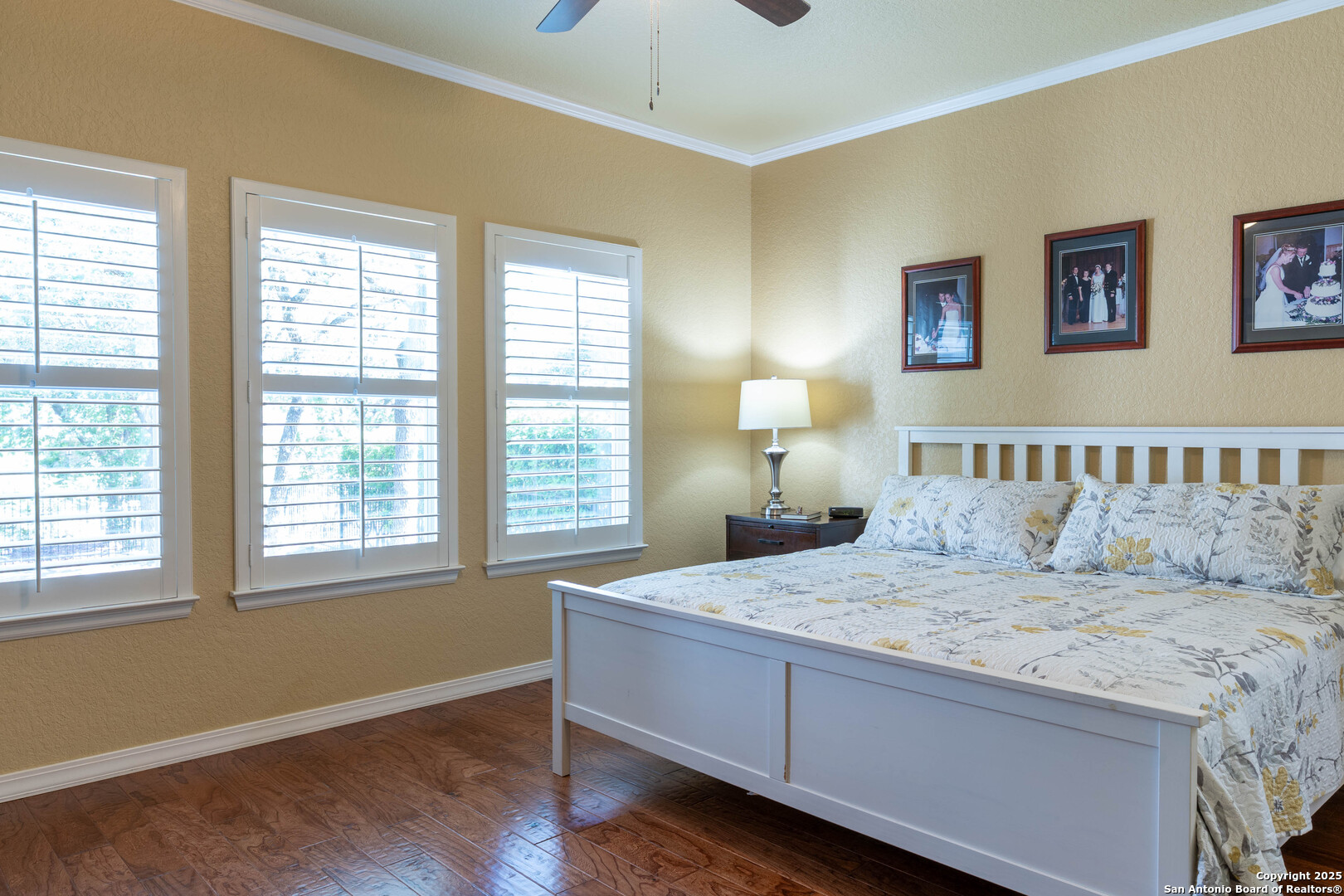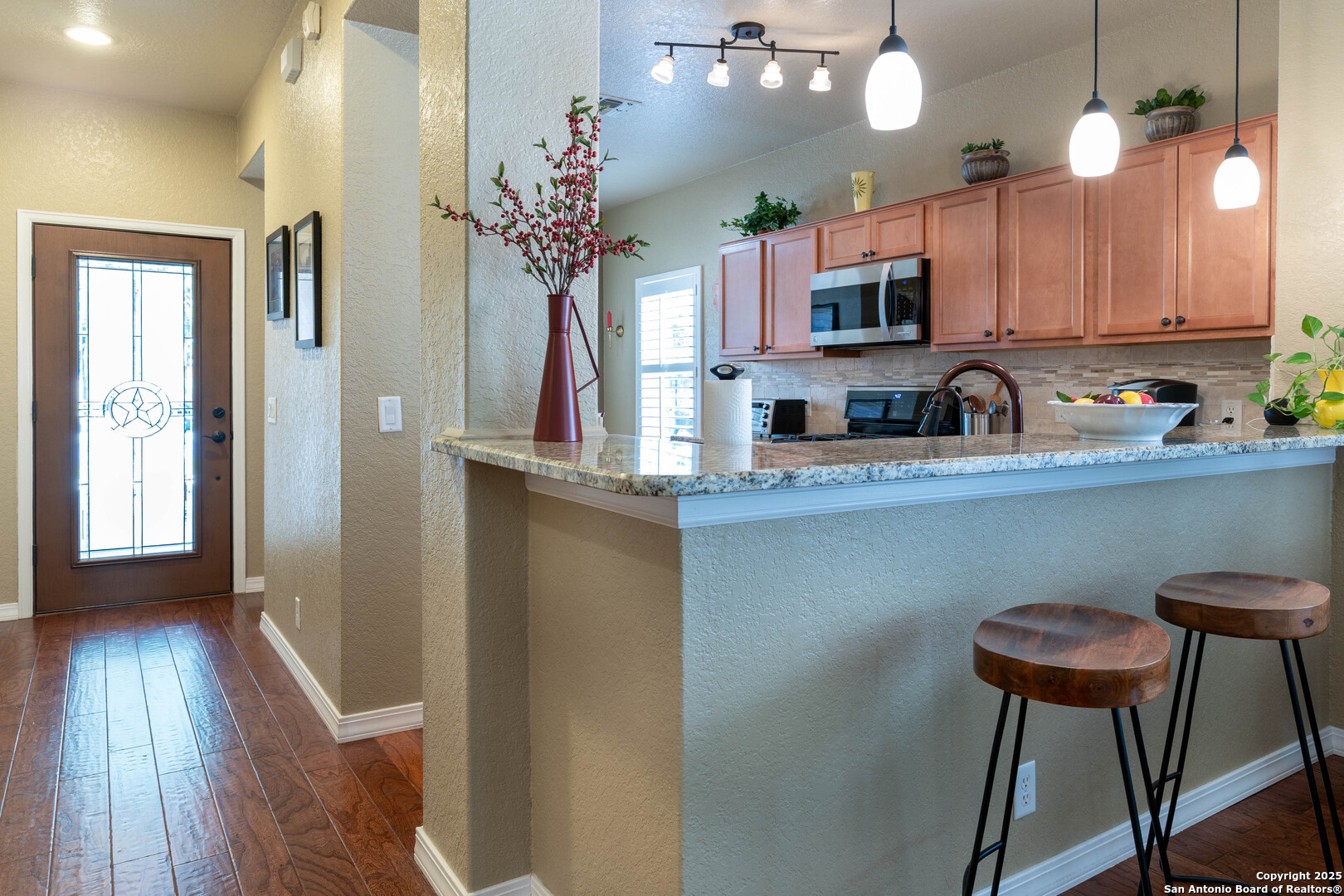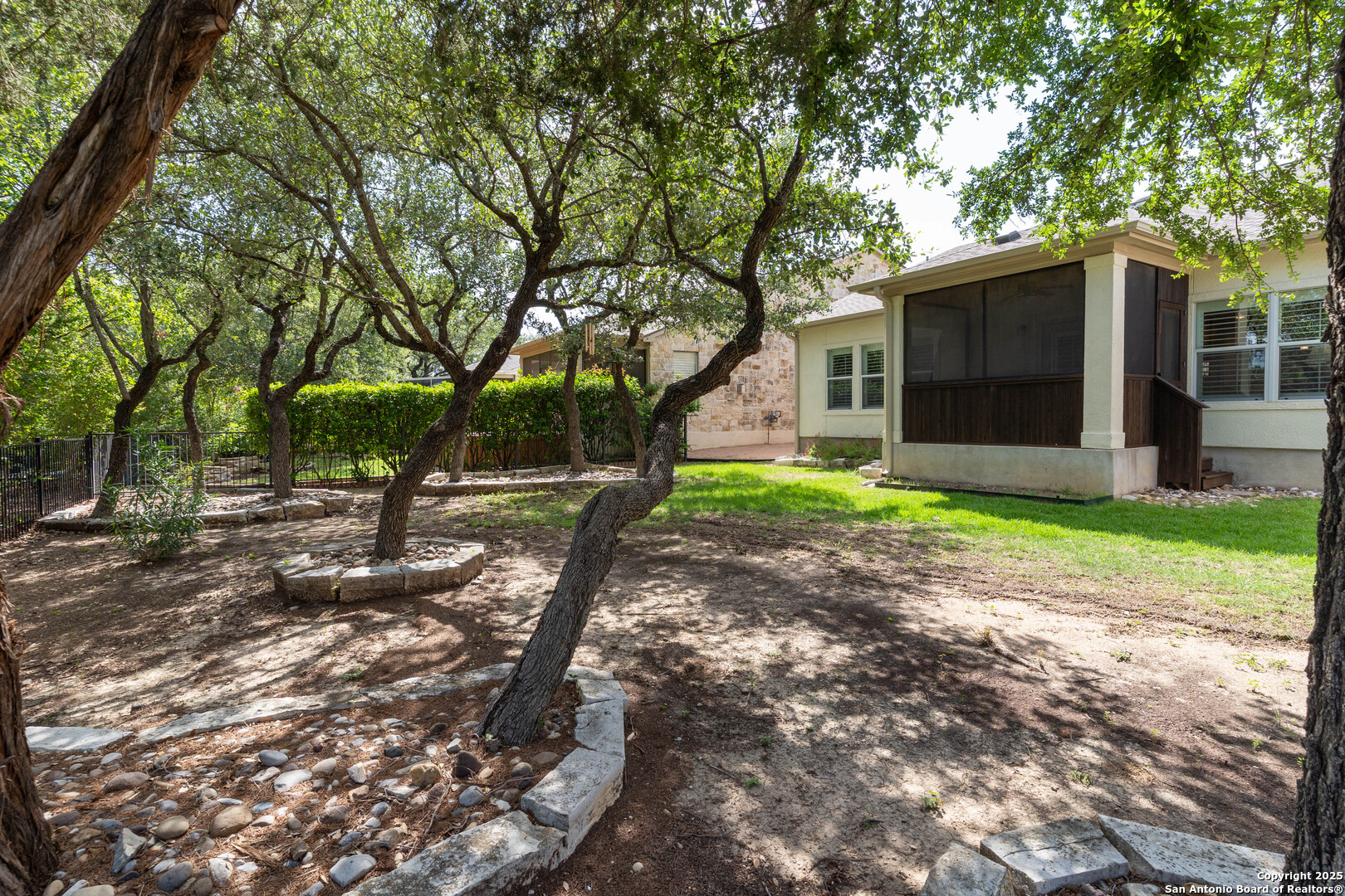 STUNNING SINGLE STORY ON CUL-DE-SAC!! Welcome to easy living in this beautifully maintained, move-in ready home located in the desirable Del Webb 55+ Hill Country Retreat community. Designed for comfort and style, this home features high ceilings, stunning wood floors, plantation shutters, and a neutral color palette throughout. The open floor plan is filled with natural light and includes a sun-kissed breakfast nook and a granite island kitchen with gas cooking and refrigerator included. The spacious living area showcases elegant built-in lighted display niches, adding warmth and character to the space. The well-sized primary enjoys numerous windows and elegant wood flooring while the ensuite offers an upgraded vanity and mirrors, a beautifully tiled walk-in shower with ramp access and custom closet updates. A secondary bedroom and second full bath provide added flexibility. Enjoy quiet afternoons on the screened-in porch surrounded by mature oak trees. Recent updates include a new water heater (2025), HVAC (2023), roof (2021) with transferrable warranty, and fresh exterior paint (2024). Additional highlights include upgraded ceiling fans and lighting, gutters, and an oversized garage with storage. Community amenities include indoor and two outdoor pools, a state-of-the-art gym, and vibrant social activities.