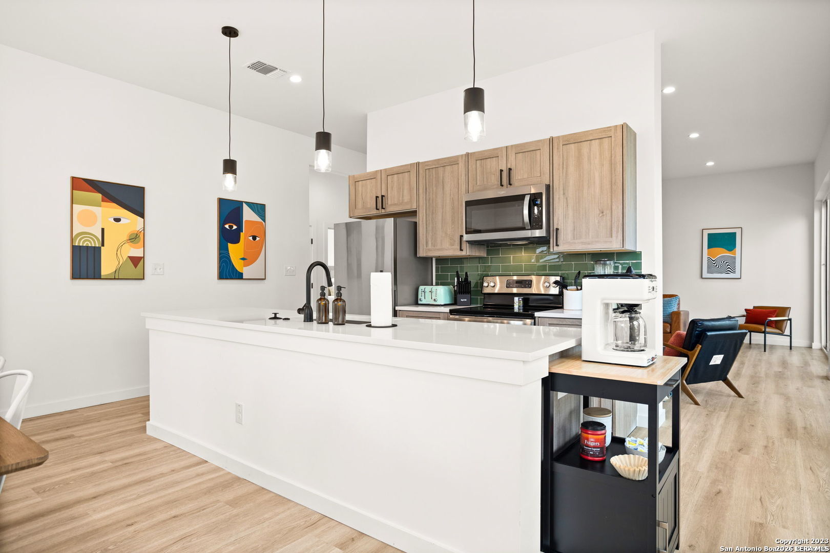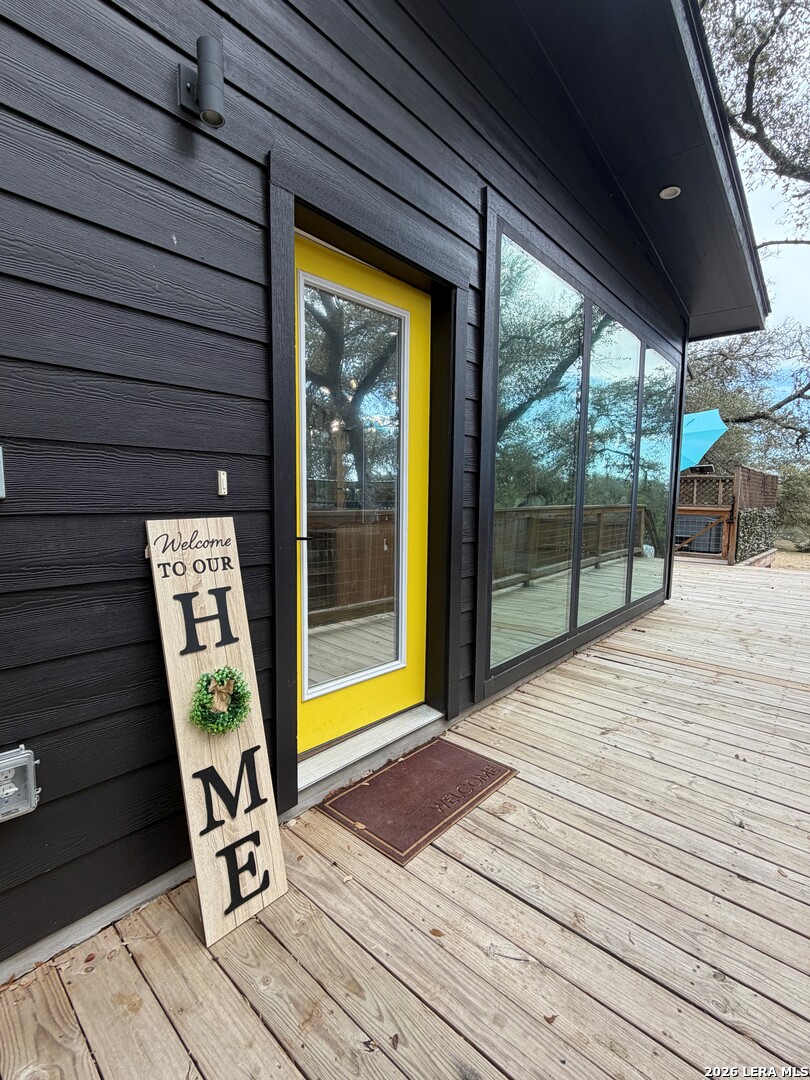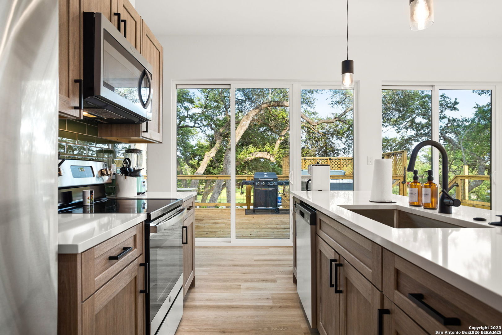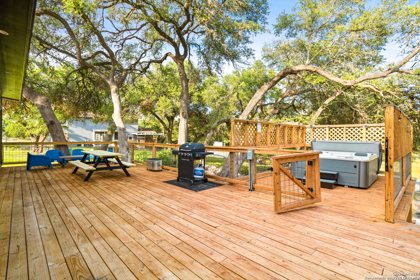 Welcome to 1277 Timberlane Dr. in the beautiful Hill Country in Canyon Lake, located in the Canyon Lake Hills subdivision within Comal ISD. This Mid-Century modern home, built in 2023, blends contemporary architecture with a serene Hill Country setting located walking distance to the lake. 1,800 sqf of living space. Featuring 3 bedrooms and 3 baths. The flexible floor plan includes two bedrooms and two baths on the main level, with a private upstairs suite ideal for guests, multigenerational living, or maximazing a short-term rental potential. 10 ft ceilings through out the house. Open concept, spacious dinning room that oversees a contemporary kitchen with custom cabinetry as well as quartz countertops, Moen fixtures. Spa-inspired bathrooms feature designer tile work and modern backlit LED mirrors. Expansive windows and sliding tinted glass doors, flood the home with natural light and open to a spacious wood deck surrounding by mature trees, creating a peaceful private space. This can be an excellent investment opportunity or a luxury getaway! HOT TUB, WASHER, DRYER, FRIDGE DO NOT CONVEY