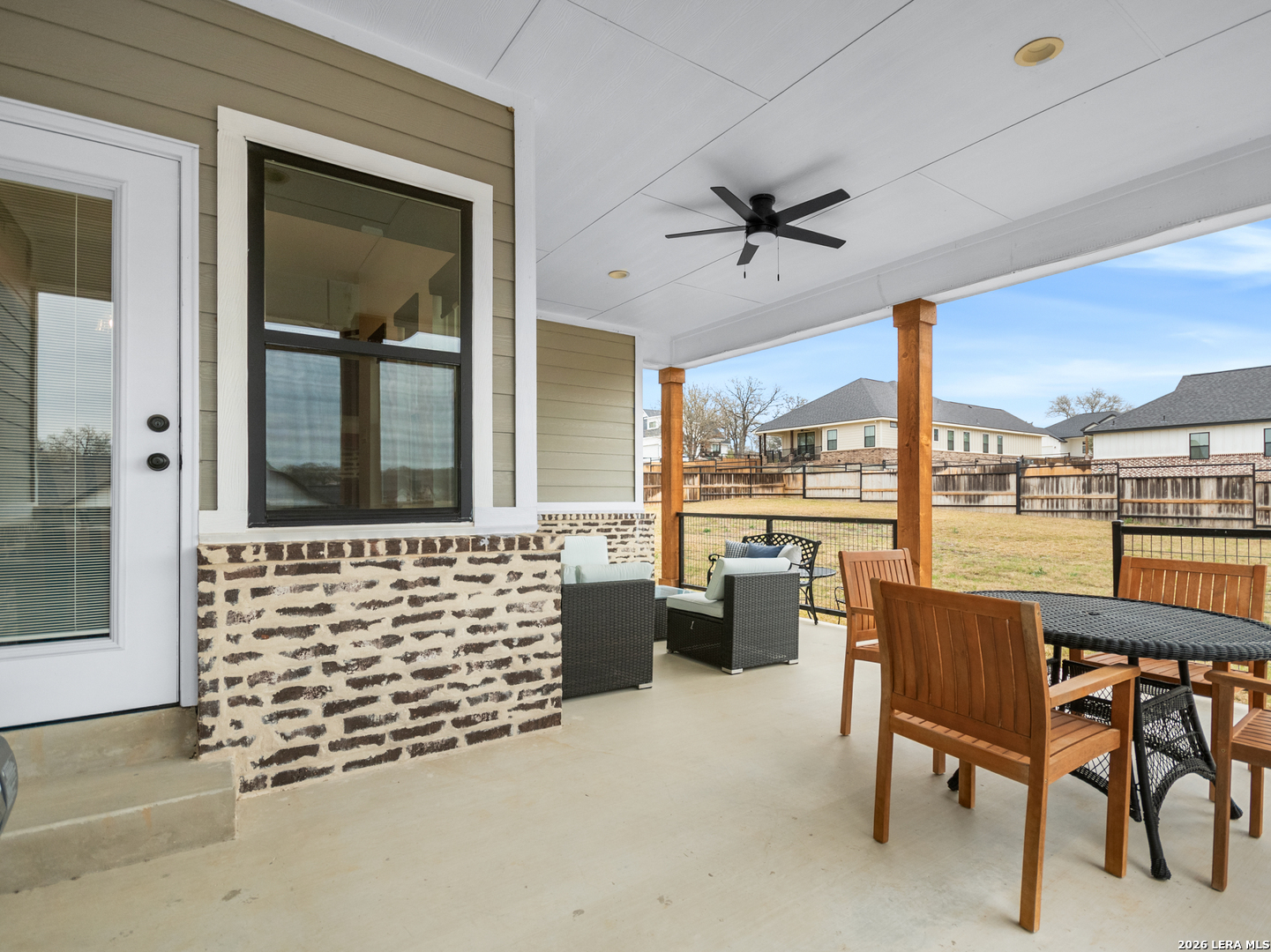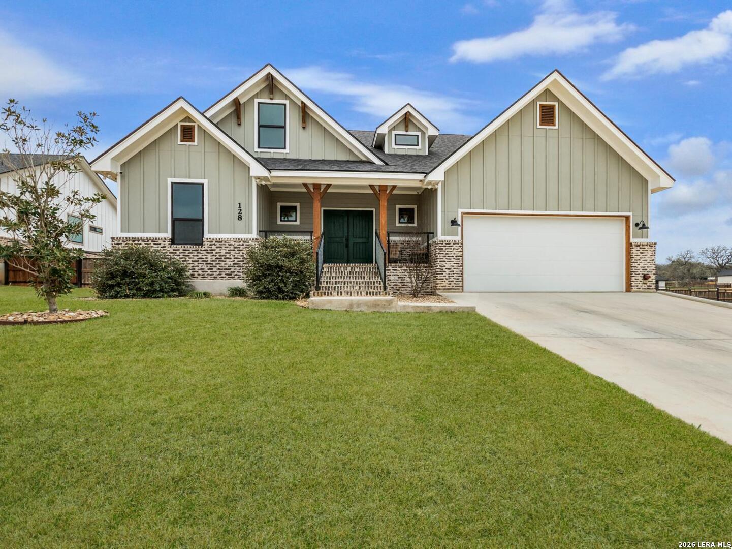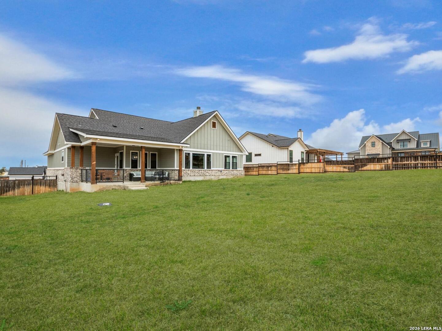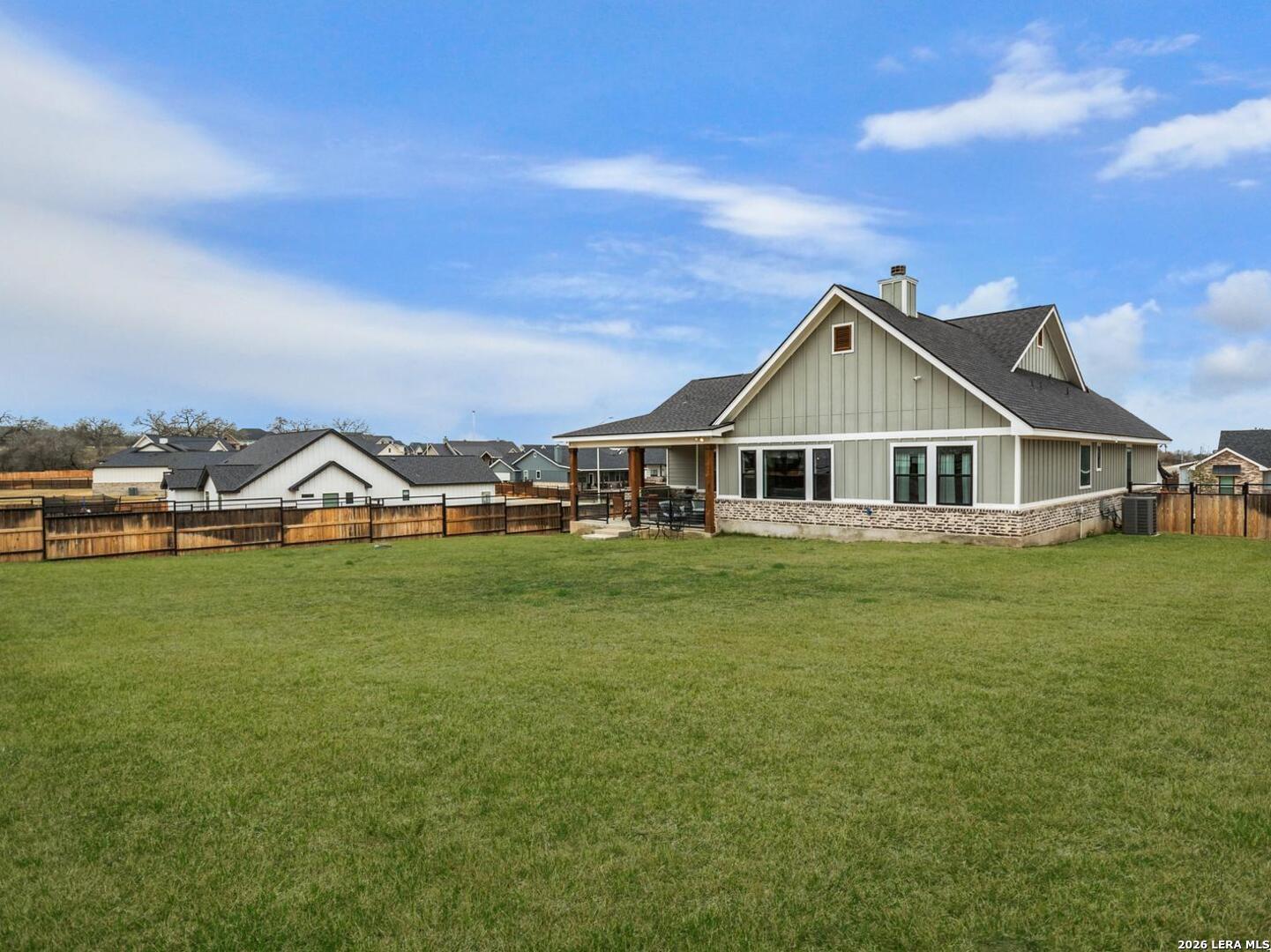 Located in the desirable Woodbridge Farms community of La Vernia, this custom residence by D&D Custom Homes offers a thoughtful blend of quality construction, functional design, and modern finishes. The heart of the home features an exquisite custom kitchen open to the living and dining areas, highlighted by soaring ceilings, a wood-burning fireplace with German-smeared brick hearth, custom-milled cabinetry that extends to the ceiling for added storage and visual impact, quartz countertops, and sleek, low-maintenance tile flooring throughout the main living spaces. A dedicated main-level study provides an ideal home office or quiet workspace. Designed for effortless everyday living, all secondary bedrooms and the primary suite are located on the main level. Above the kitchen, a spacious flex room offers exceptional versatility and comfort, complete with a wet bar and its own mini-split air conditioning system, which is perfect for a game room, media room, or additional living area. The home is CAT-6 wired throughout and includes a Reolink camera system for enhanced connectivity and security, along with a whole-house water filtration system and lawn sprinkler system for added convenience and efficiency. Outdoor living is equally inviting with a covered back patio already equipped with a propane gas line for a future custom outdoor kitchen. Additional highlights include an oversized two-car garage and a partially finished walk-in attic providing valuable storage or future expansion potential. Enjoy the balance of country surroundings and a well-appointed interior in a residence that pairs thoughtful upgrades with enduring design in one of La Vernia's most desirable settings.