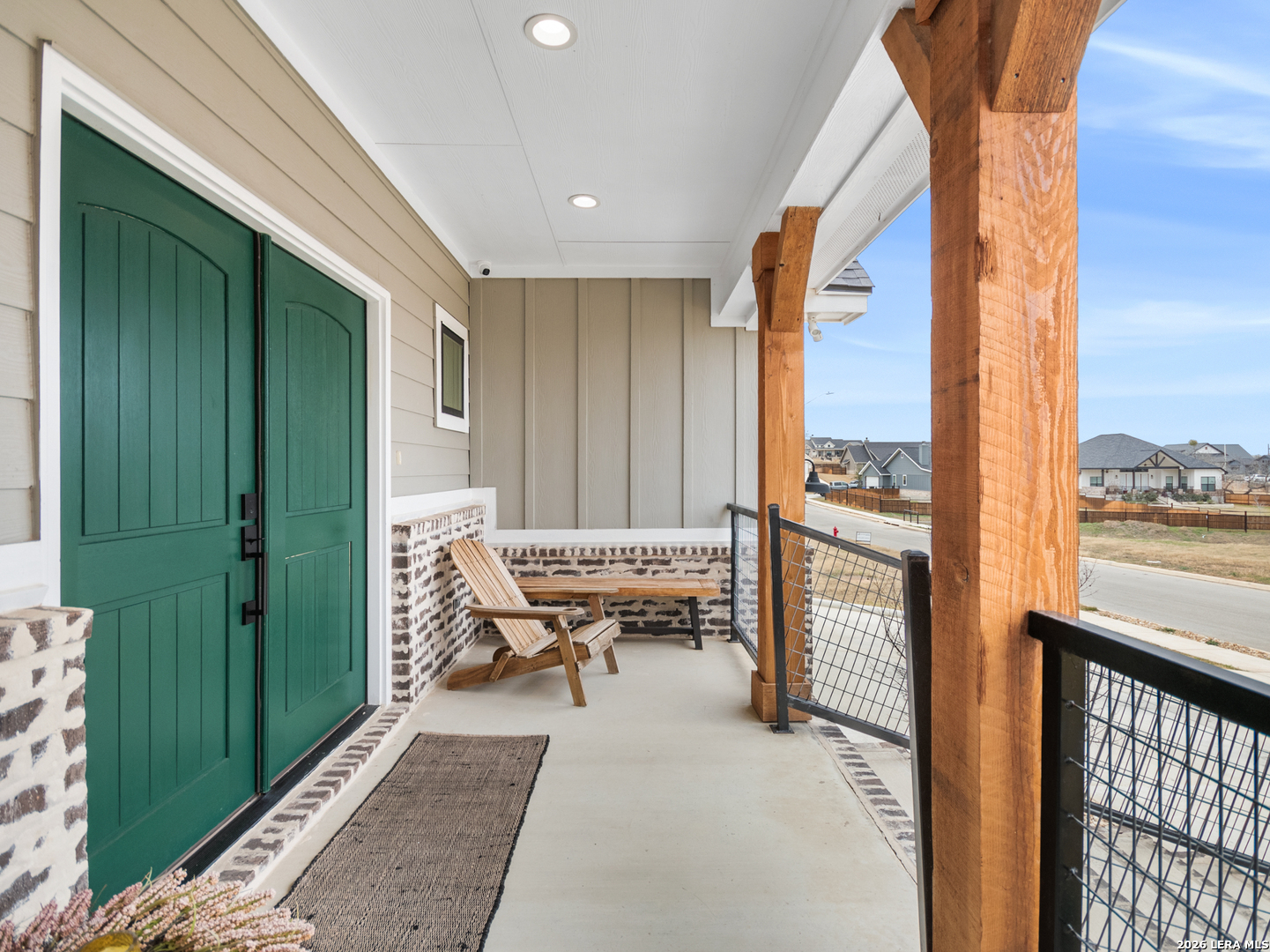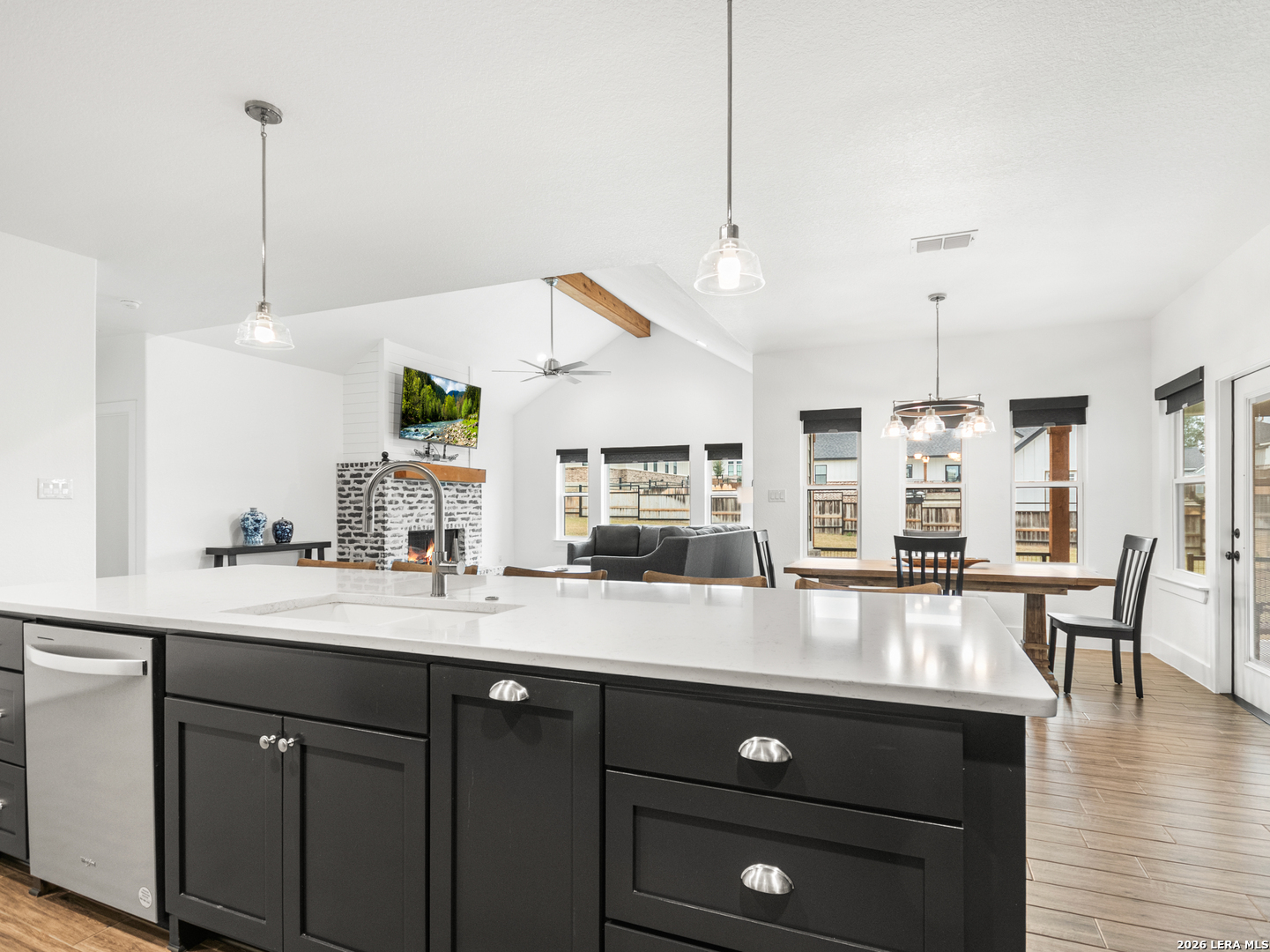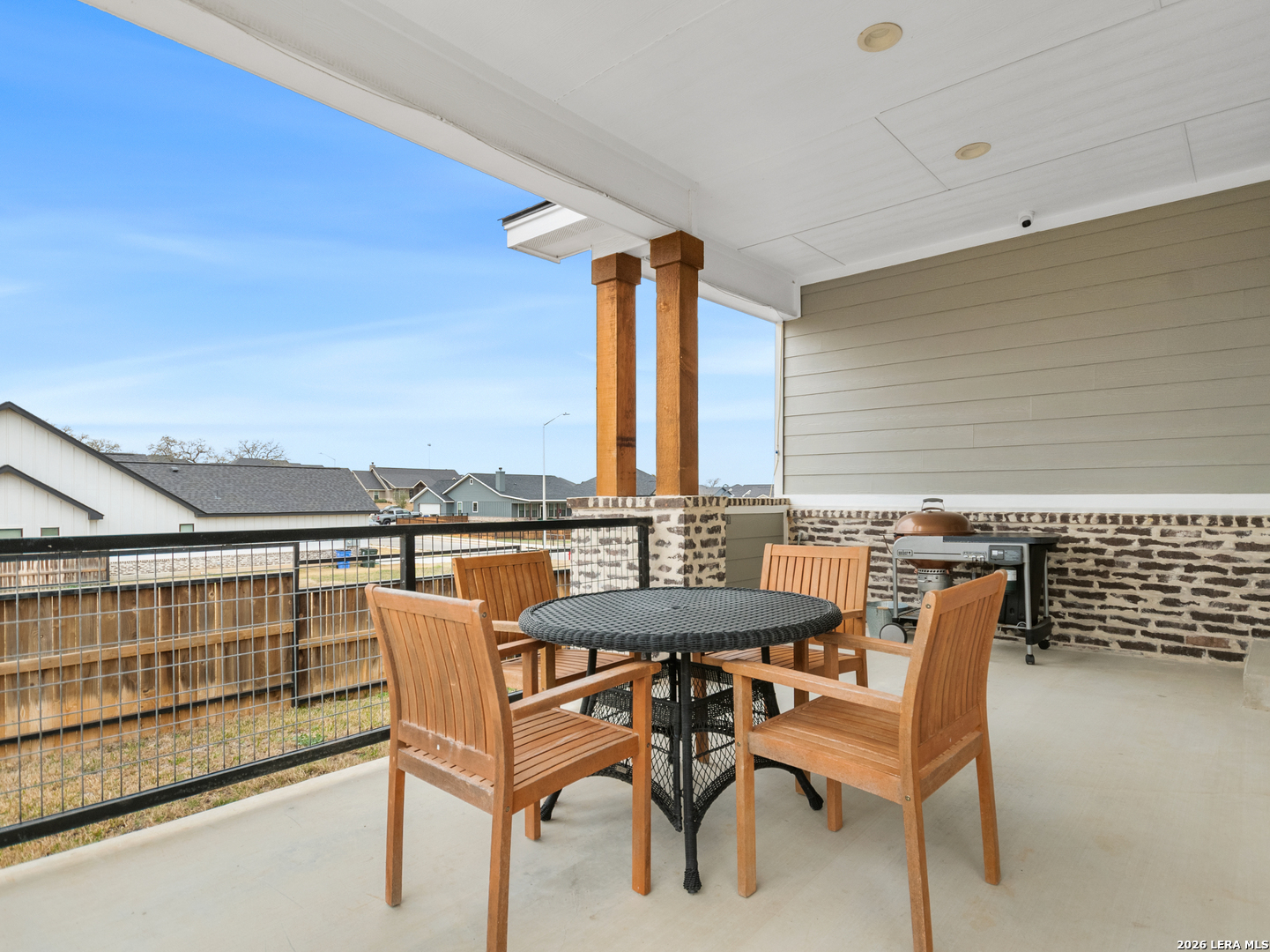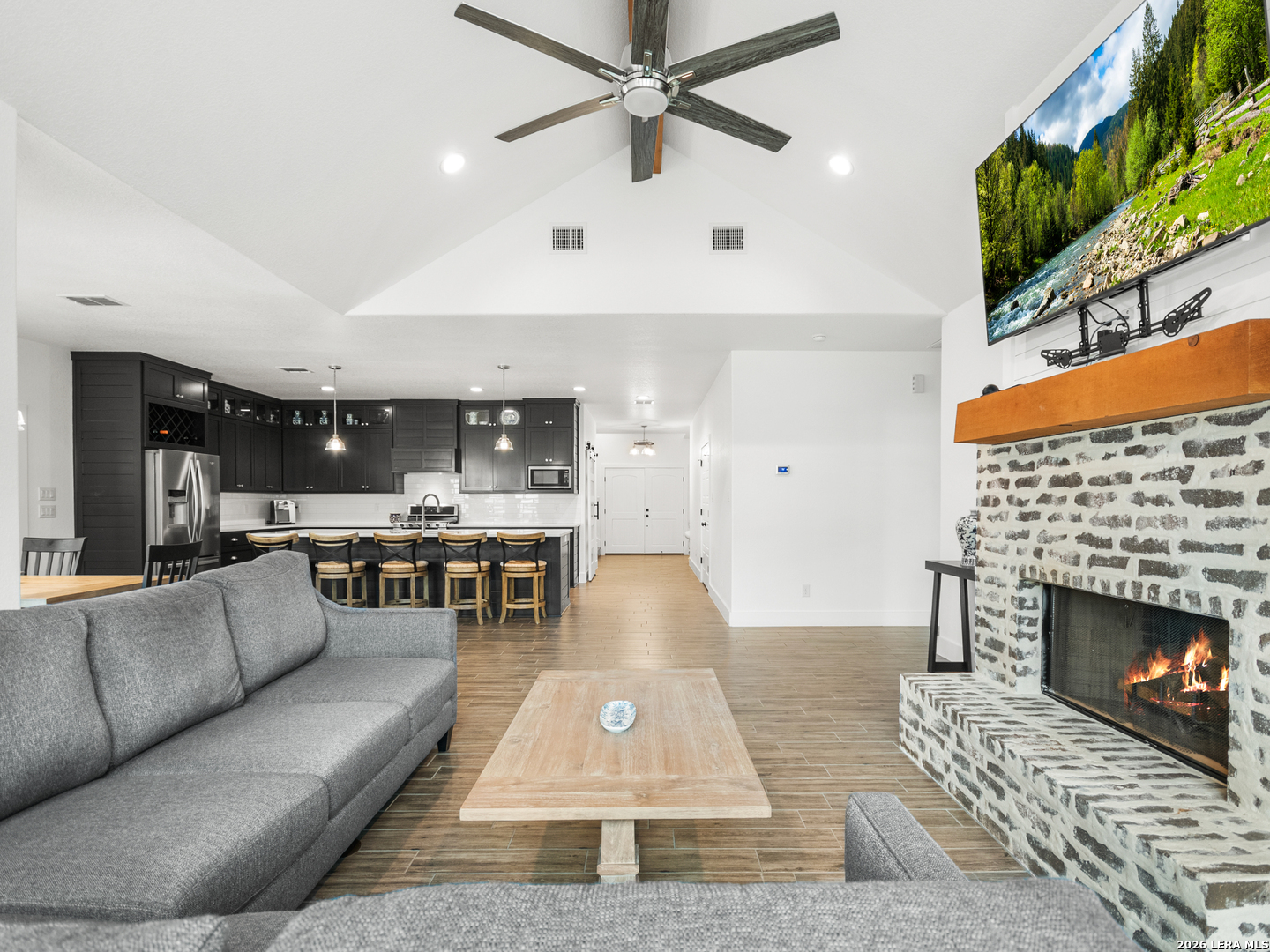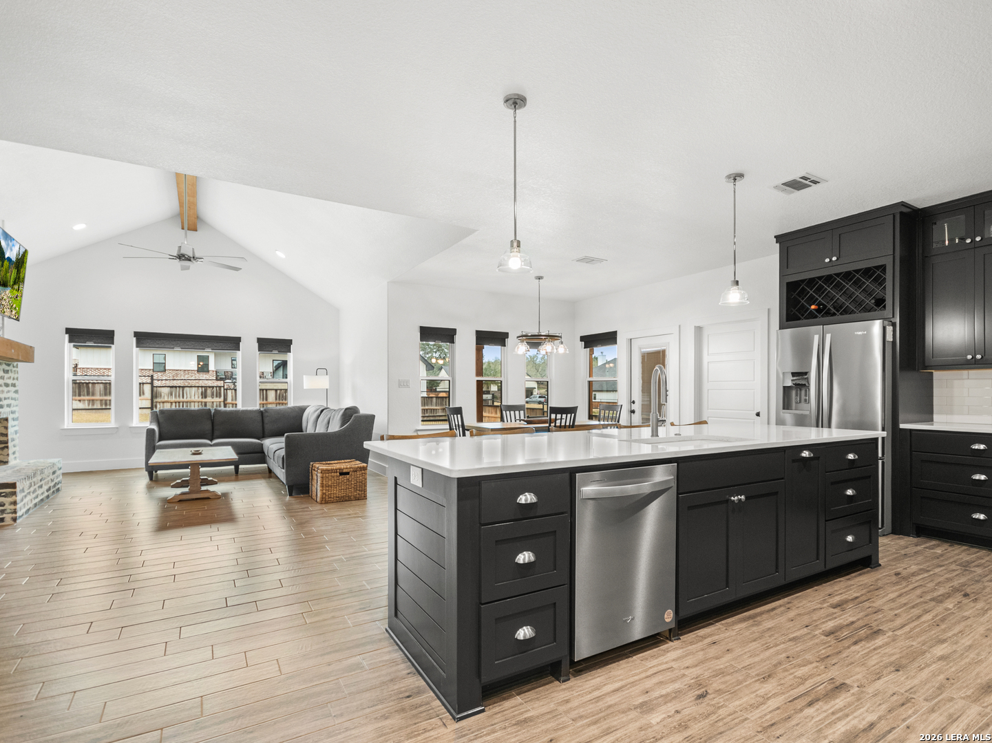 Located in the desirable Woodbridge Farms community of La Vernia, this custom residence by D&D Custom Homes offers a thoughtful blend of quality construction, functional design, and modern finishes. The heart of the home features an exquisite custom kitchen open to the living and dining areas, highlighted by soaring ceilings, a wood-burning fireplace with German-smeared brick hearth, custom-milled cabinetry that extends to the ceiling for added storage and visual impact, quartz countertops, and sleek, low-maintenance tile flooring throughout the main living spaces. A dedicated main-level study provides an ideal home office or quiet workspace. Designed for effortless everyday living, all secondary bedrooms and the primary suite are located on the main level. Above the kitchen, a spacious flex room offers exceptional versatility and comfort, complete with a wet bar and its own mini-split air conditioning system, which is perfect for a game room, media room, or additional living area. The home is CAT-6 wired throughout and includes a Reolink camera system for enhanced connectivity and security, along with a whole-house water filtration system and lawn sprinkler system for added convenience and efficiency. Outdoor living is equally inviting with a covered back patio already equipped with a propane gas line for a future custom outdoor kitchen. Additional highlights include an oversized two-car garage and a partially finished walk-in attic providing valuable storage or future expansion potential. Enjoy the balance of country surroundings and a well-appointed interior in a residence that pairs thoughtful upgrades with enduring design in one of La Vernia's most desirable settings.